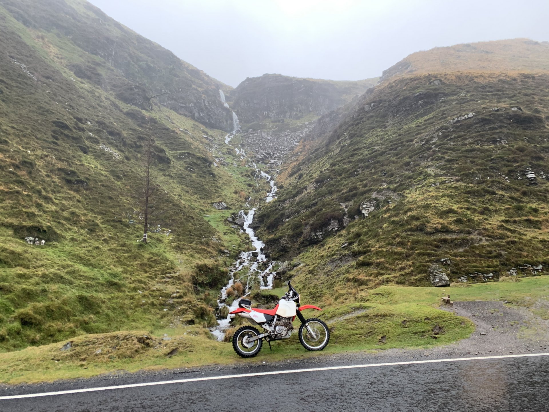 I had a message from blunder road (thunder road) motorcycles to say the brake pads for the XR were in, so decided to take the dog via the little country roads to Bridgend to pick them up, when i get there they sure lived up to their nick name they ordered me rear pads instead of the fronts I'd asked for? so i bought them to keep in the spares box. That means another visit next week, ahh well it got me out on the bike and i stayed out for another couple of hours, it was wet and windy but the waterproofs kept me dry quite enjoyed it. only took a couple of photos twas a little wet you see The road to the bike shop is not the best or it is the best depending on how you look at it ? Heading up over the Bwlch mountain road And heading home1 point