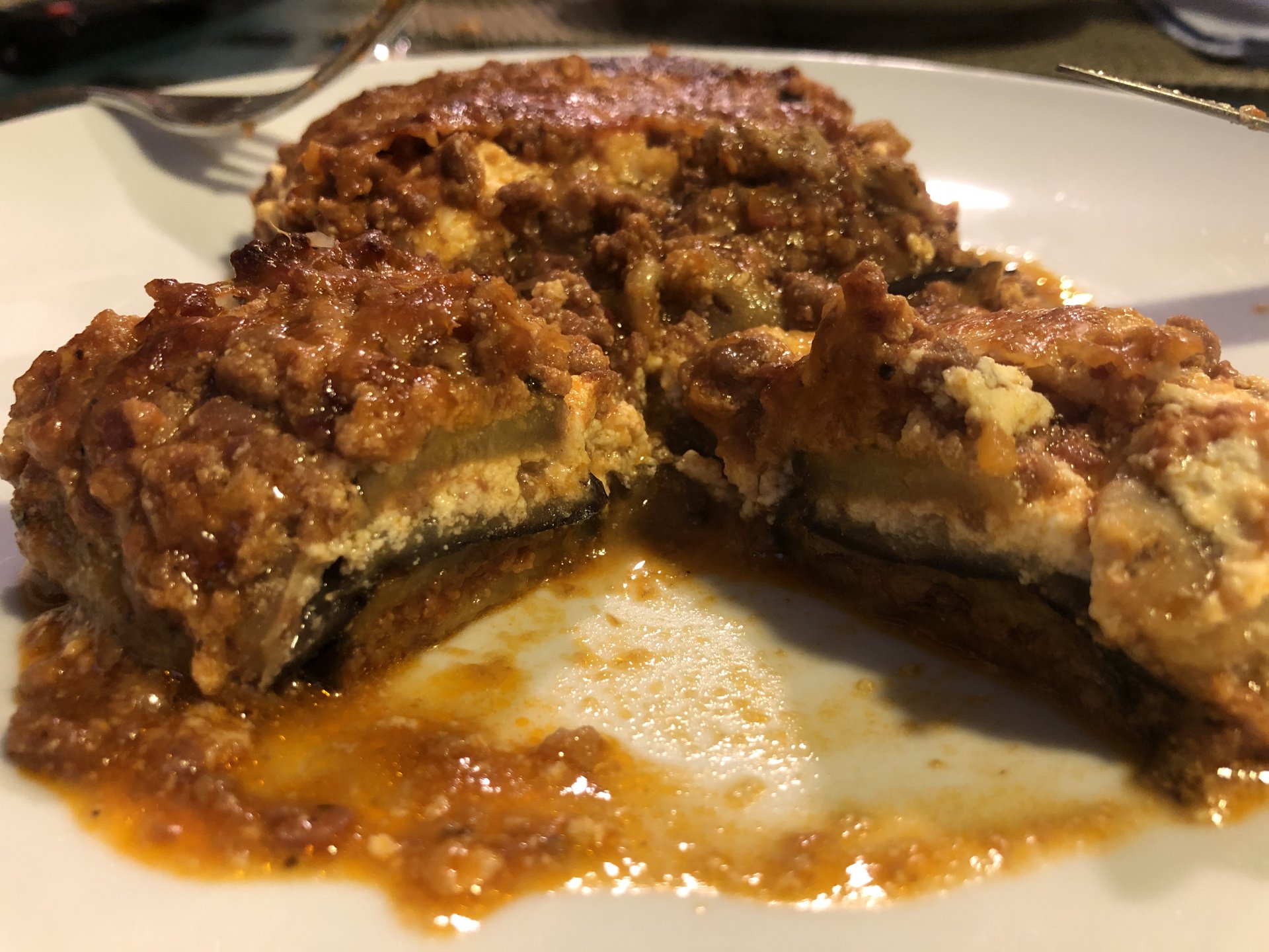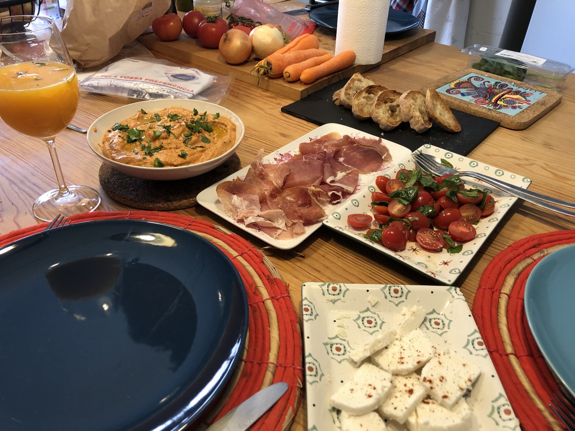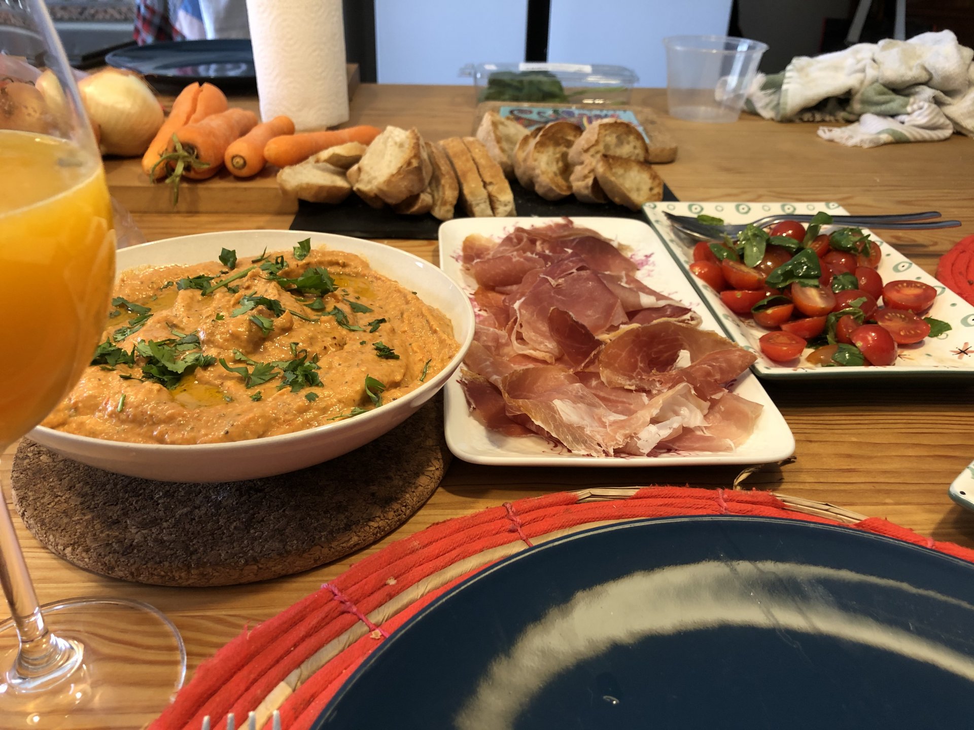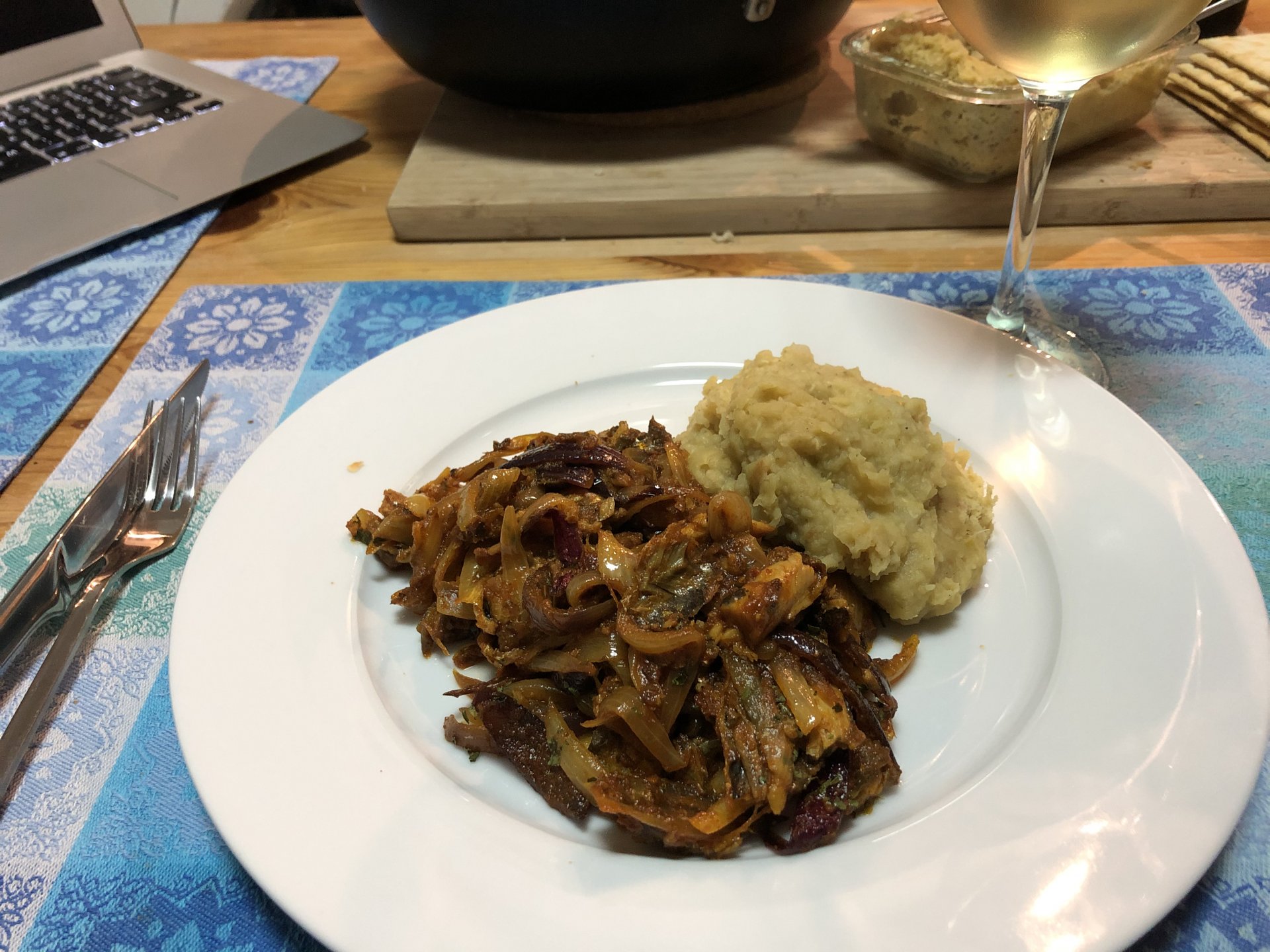 Perfecting my eggplant lasagna: No cooking, just a healthy lunch with some cheese for taste: Sofia's rib, spinach and dahl: Again, Sofia's amazing oven roasted aubergine and pepper dip, some cured ham, cherry tomatoes, and goat's cheese for lunch. An entree of cured black pig, some bread and local wine, simple flavours in my untamable garden My spicy onions and canned sardines dish with leftover dahl, a nice mix: Spaghetti and portobello mushrooms: Costa, watching me have some olives and white wine. Not looking too pleased but he had just finished his own dinner.2 points