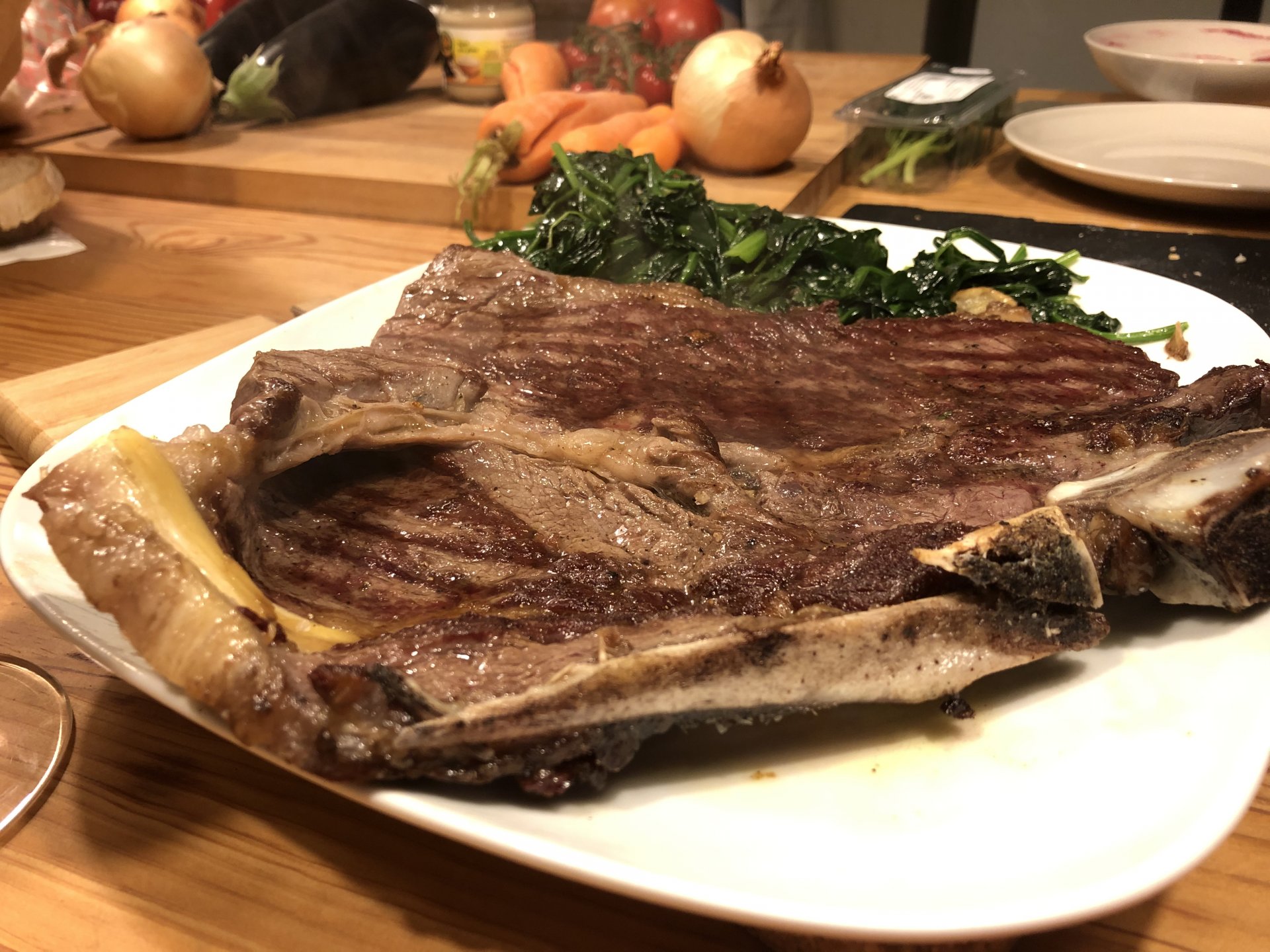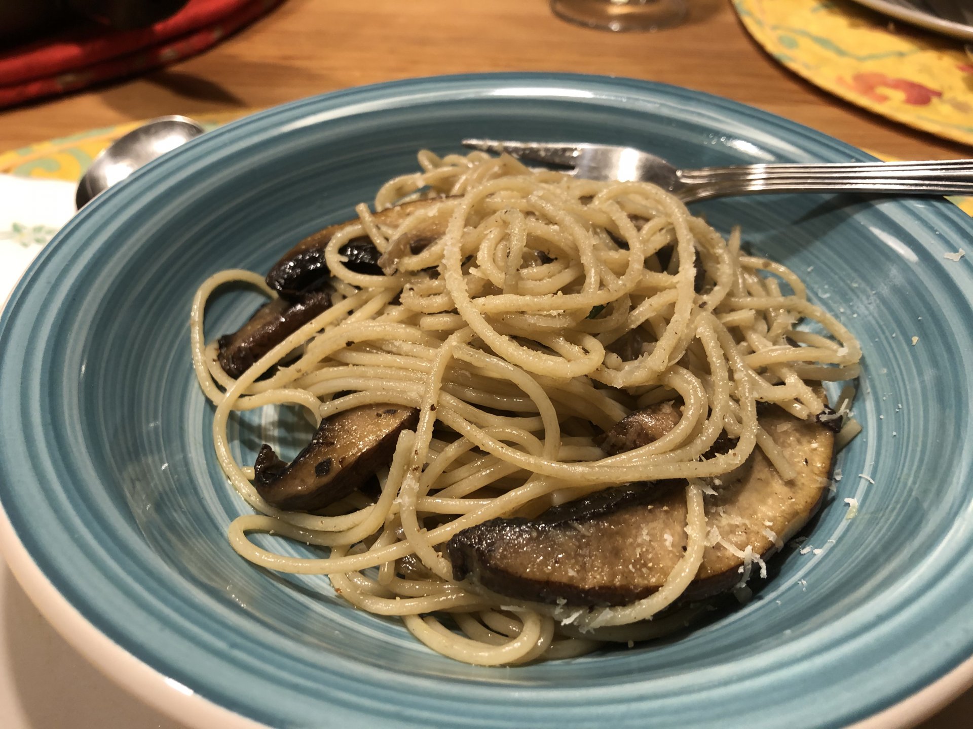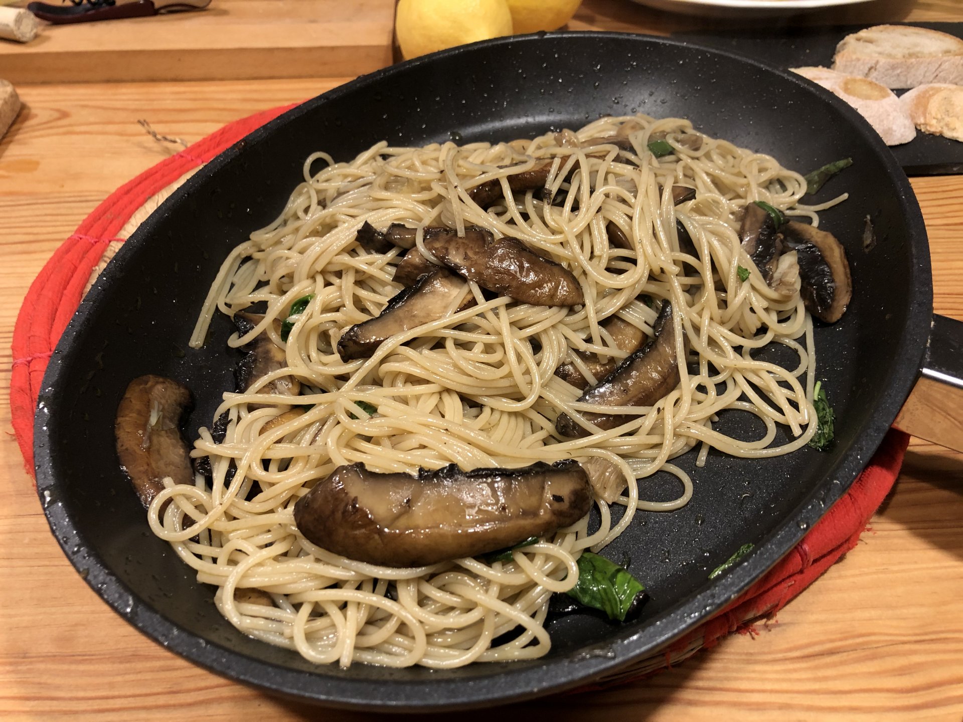 Perfecting my eggplant lasagna: No cooking, just a healthy lunch with some cheese for taste: Sofia's rib, spinach and dahl: Again, Sofia's amazing oven roasted aubergine and pepper dip, some cured ham, cherry tomatoes, and goat's cheese for lunch. An entree of cured black pig, some bread and local wine, simple flavours in my untamable garden My spicy onions and canned sardines dish with leftover dahl, a nice mix: Spaghetti and portobello mushrooms: Costa, watching me have some olives and white wine. Not looking too pleased but he had just finished his own dinner.2 points