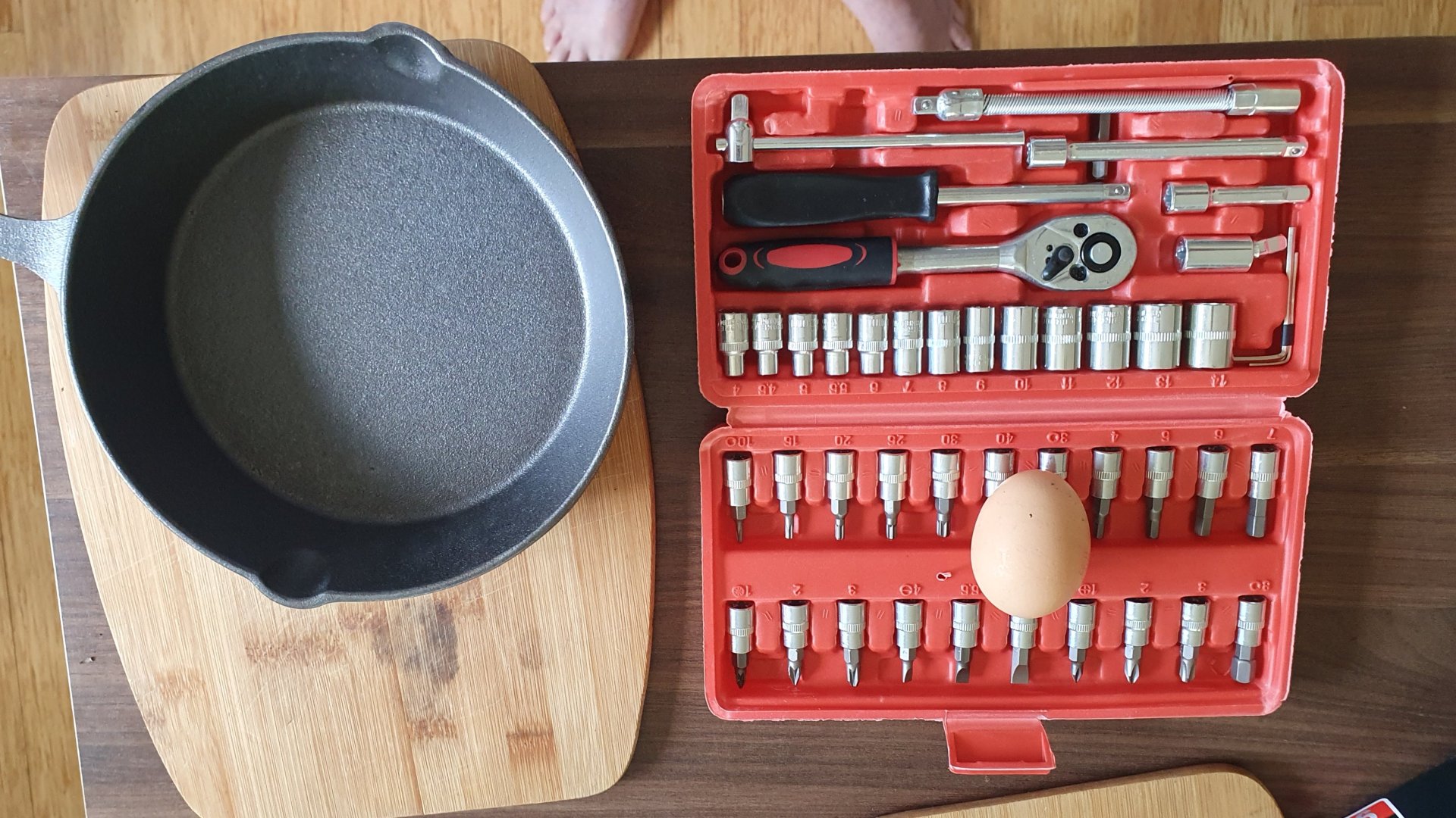 Got my new 1/4" drive socket set, cost me $2.37 but I had to buy something to bring the total up to $15 to get free postage so I chose a 20cm cast iron skillet, it's ideal for two eggs, a steak (not T bone) or a hamburger with caramelized onion, got the calipers soaking in kerosene as my pal doesn't like using compressed air if it can be avoided.