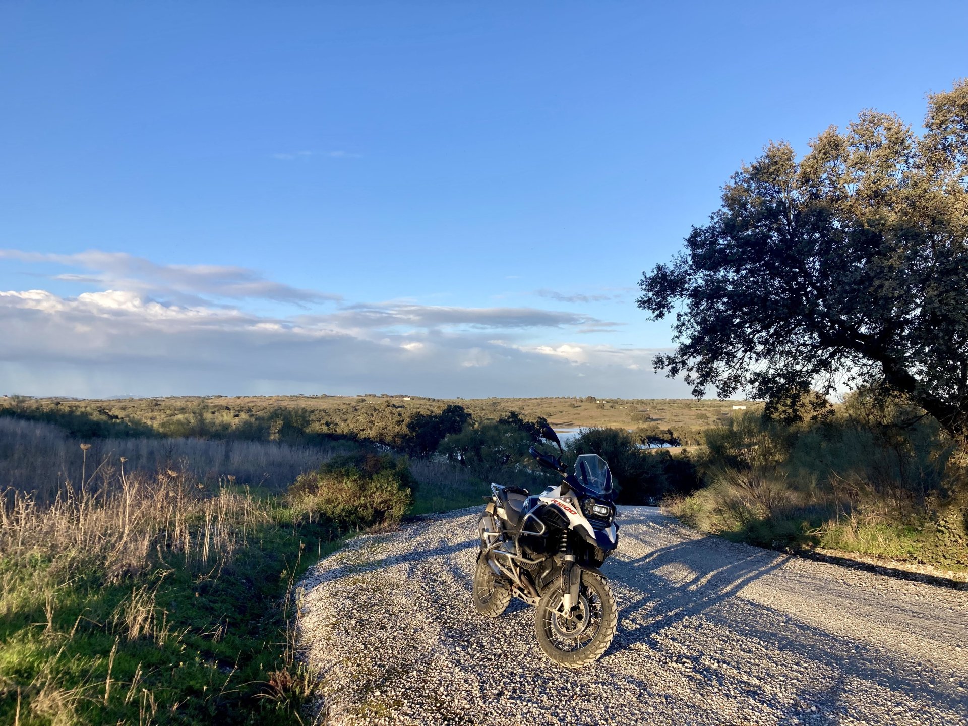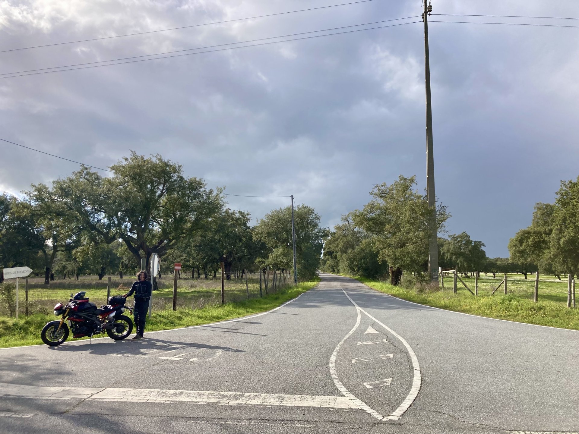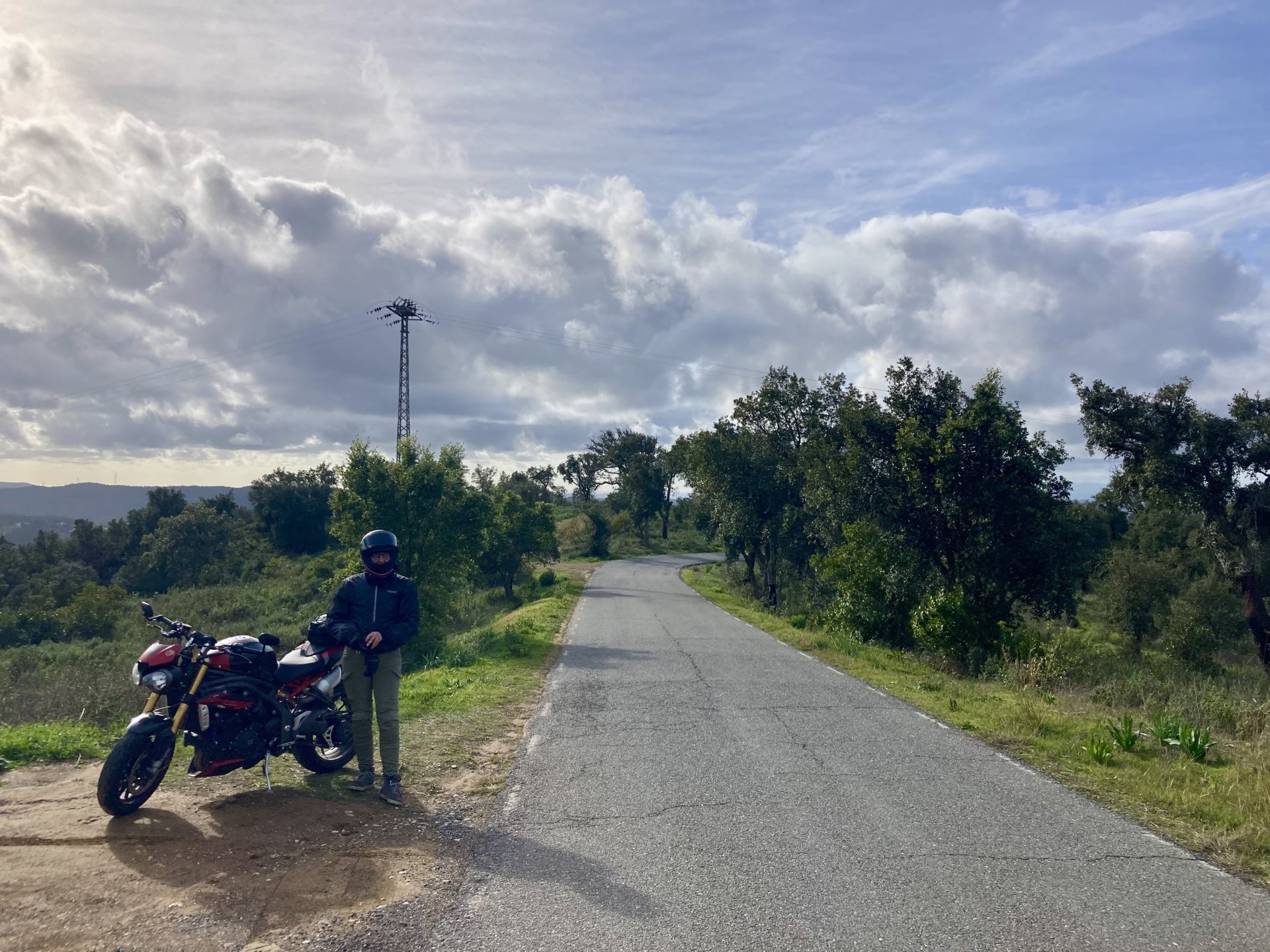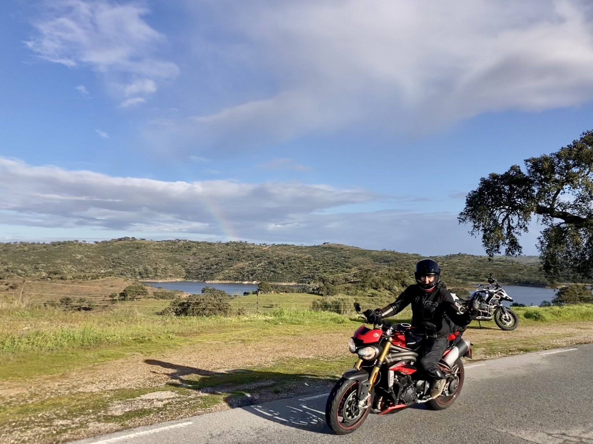 @Sofia was in need of a lazy holiday in the sunshine, even if warmth would be too much of an ask in January. A friend kindly let her use a holiday home in the Algarve for a few days so a plan was made to head south, stop by the Portimão track to visit our friend Niel who was there for a trackday, and then hang around the Algarve. She didn't really know the seaside that well, and that gave us a chance to take a few little trips on the bikes. I headed out of my place by myself to then meet up with Sofia, had a couple of hours to kill so took the long way there, with a little exploring detour. The previous days' rain caused the compacted dirt roads to be a little soft, and eventually came across some mud, I took the chance but it got worse after that and I don´t fancy mud on my bike, more so when it's fully loaded. Turned back, crossed the inicial mud bit, and stopped for a picture. The hunt for Bike Of The Month picture started Back on the road, and cruised happily on nice tarmac. Not for long, after a little bit took another short dirt road detour, this one I knew and it's a safe mud free one. Stopped as the dark cloud above turned into heavy rain, but before putting my phone away took another picture: Sadly that pristine dirt road is not longer than a few kms, got back on tarmac and rode out from under a heavy downpour, left the dark rain clouds behind and I stop again, now for a phone call. The view around was typical north Alentejo, I love entering this area of the country. The rain was now gone and the skies were blue, quite cold though. Sofia was on the motorway on her way to our usual meeting point and I waited. Half frozen, she arrives: Unfreezing over a hot late and some chicken pies. These are similar to the pies you have in the UK, but tiny and chicken inside. After transferring her big bag onto my bike , as someone likes her Speed Triple nice and nimble, we head out for a short hour or two heading to our final destination for the night. It was getting really cold and maybe about to rain farther ahead, so we stopped so Sofia could put her overalls on and heat up a little. After some more rain a great rainbow appeared. First stop to try and get it on a picture, big fail, but the rain was doing wonders for the green fields around. However, a little farther ahead and I get my chance: By 4, we made it to our home for the night. Sofia went for a warm up shower and relax by the fire, I took the last hour of daylight and went out searching for dirt roads around the lake. Didn't take many pictures as the day was quickly ending, found a few choice nice alternatives to tarmac but they all ended in a private property closed gate Last stop to put on navigation and find my way back to the hotel before night. Sunset here increases the chance of deer and wild boar crossing the road substantially. In fact I spotted a deer coming back, made it just in time for dark. Next day, Portimão.