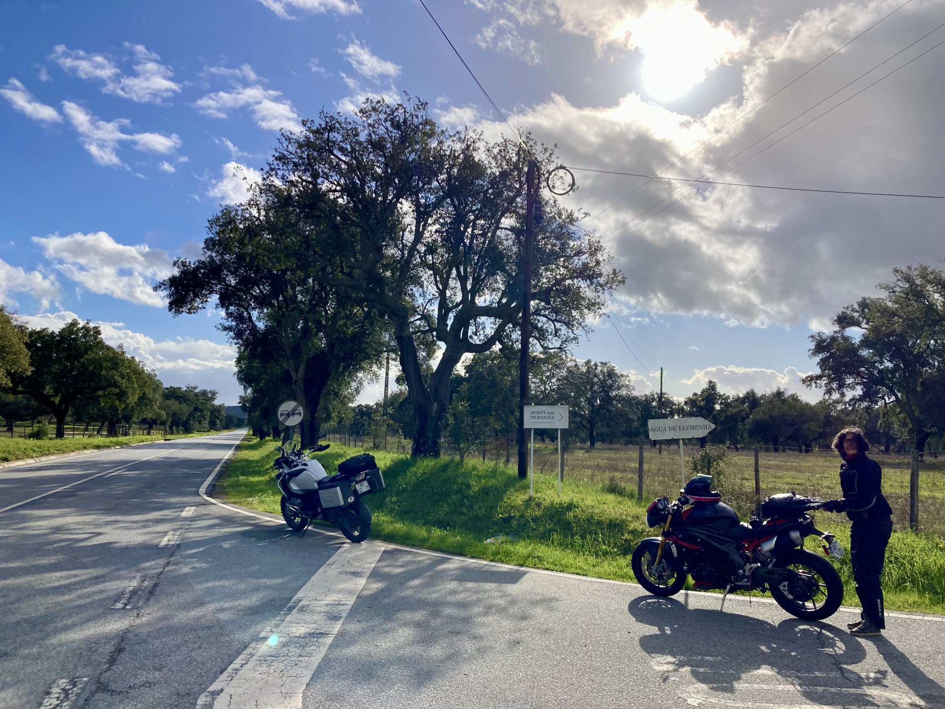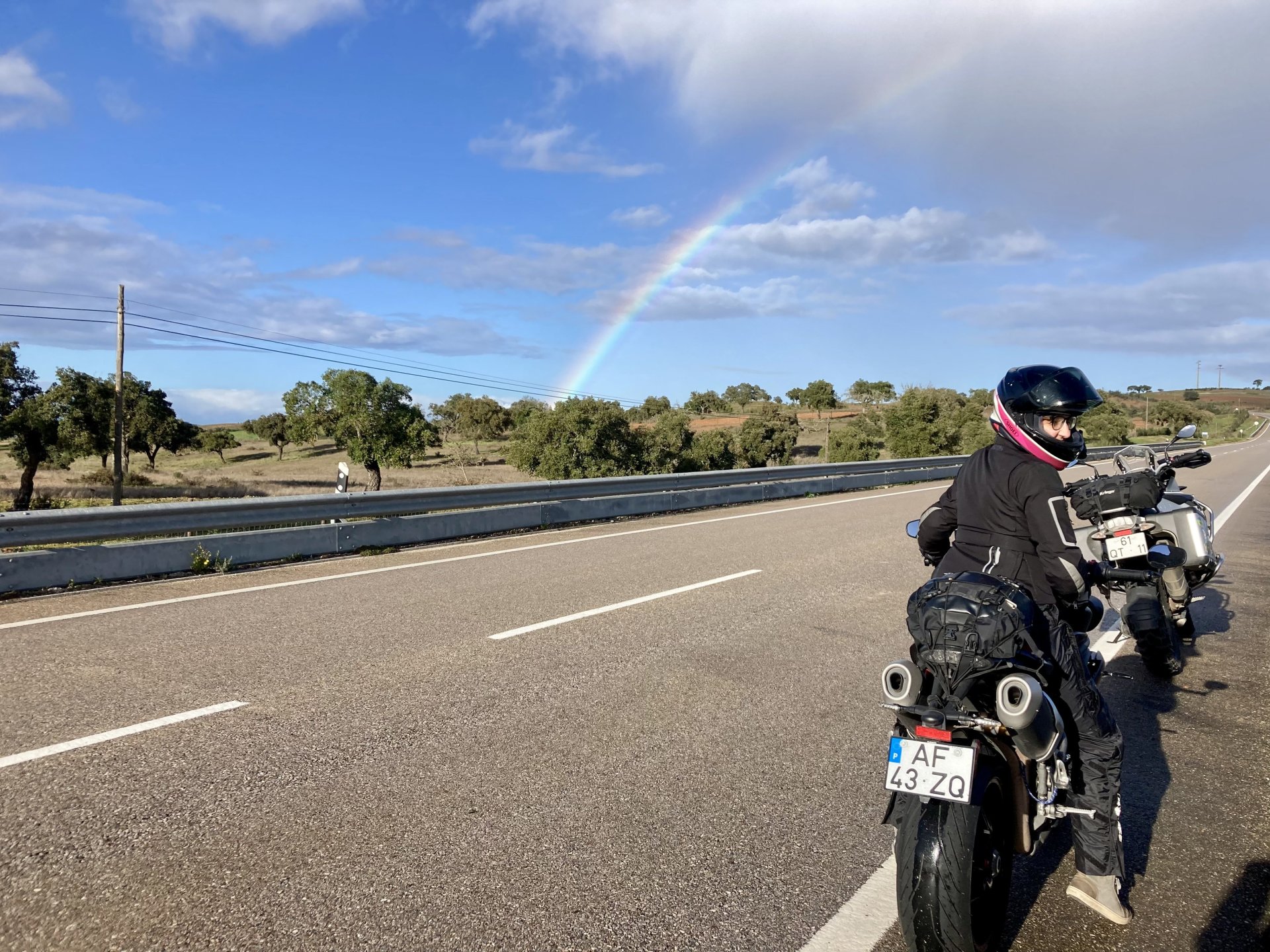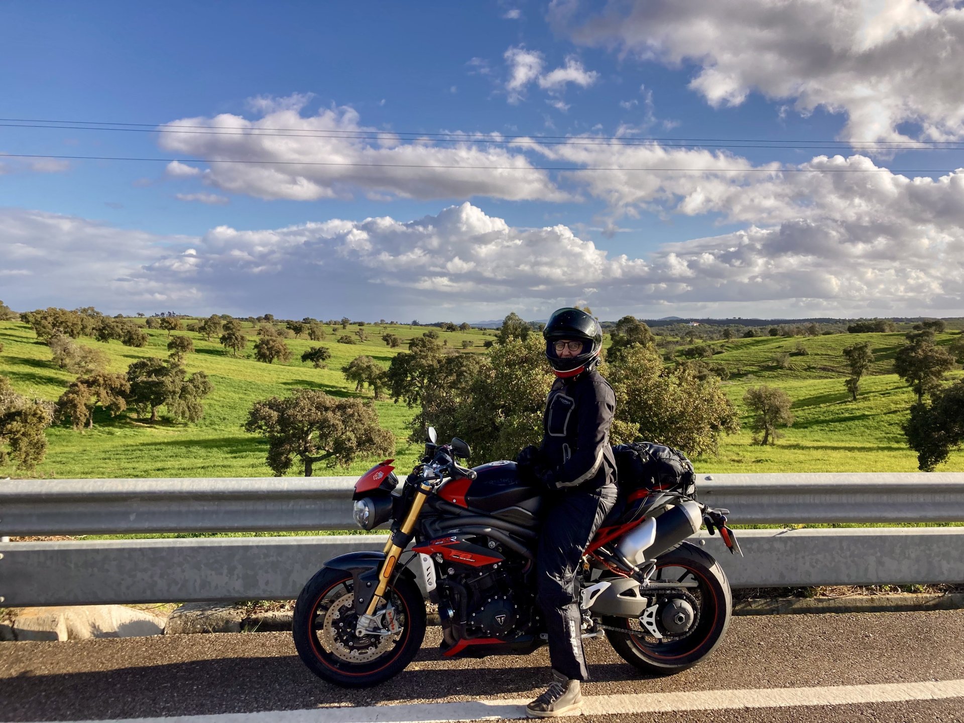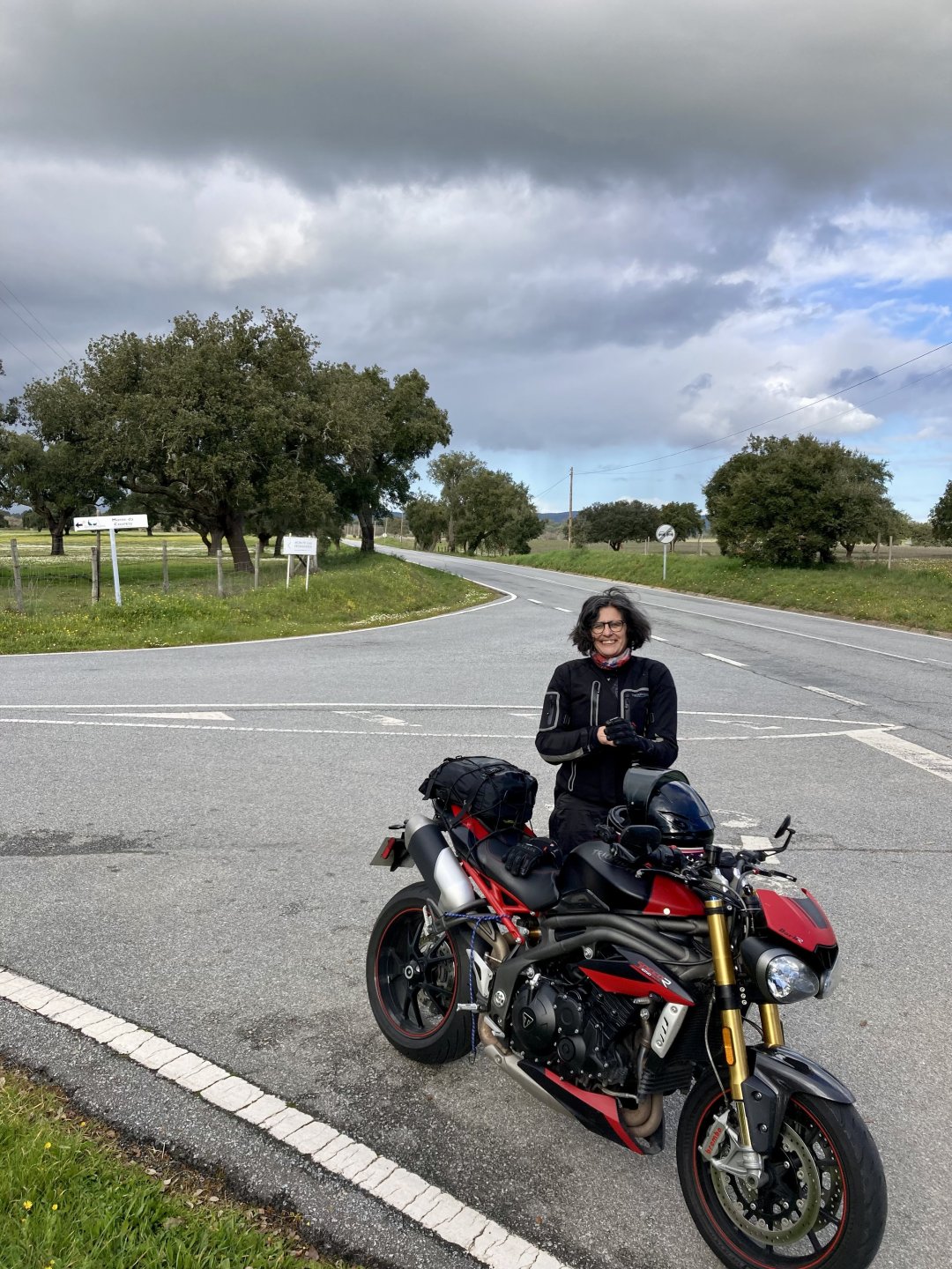 @Sofia was in need of a lazy holiday in the sunshine, even if warmth would be too much of an ask in January. A friend kindly let her use a holiday home in the Algarve for a few days so a plan was made to head south, stop by the Portimão track to visit our friend Niel who was there for a trackday, and then hang around the Algarve. She didn't really know the seaside that well, and that gave us a chance to take a few little trips on the bikes. I headed out of my place by myself to then meet up with Sofia, had a couple of hours to kill so took the long way there, with a little exploring detour. The previous days' rain caused the compacted dirt roads to be a little soft, and eventually came across some mud, I took the chance but it got worse after that and I don´t fancy mud on my bike, more so when it's fully loaded. Turned back, crossed the inicial mud bit, and stopped for a picture. The hunt for Bike Of The Month picture started Back on the road, and cruised happily on nice tarmac. Not for long, after a little bit took another short dirt road detour, this one I knew and it's a safe mud free one. Stopped as the dark cloud above turned into heavy rain, but before putting my phone away took another picture: Sadly that pristine dirt road is not longer than a few kms, got back on tarmac and rode out from under a heavy downpour, left the dark rain clouds behind and I stop again, now for a phone call. The view around was typical north Alentejo, I love entering this area of the country. The rain was now gone and the skies were blue, quite cold though. Sofia was on the motorway on her way to our usual meeting point and I waited. Half frozen, she arrives: Unfreezing over a hot late and some chicken pies. These are similar to the pies you have in the UK, but tiny and chicken inside. After transferring her big bag onto my bike , as someone likes her Speed Triple nice and nimble, we head out for a short hour or two heading to our final destination for the night. It was getting really cold and maybe about to rain farther ahead, so we stopped so Sofia could put her overalls on and heat up a little. After some more rain a great rainbow appeared. First stop to try and get it on a picture, big fail, but the rain was doing wonders for the green fields around. However, a little farther ahead and I get my chance: By 4, we made it to our home for the night. Sofia went for a warm up shower and relax by the fire, I took the last hour of daylight and went out searching for dirt roads around the lake. Didn't take many pictures as the day was quickly ending, found a few choice nice alternatives to tarmac but they all ended in a private property closed gate Last stop to put on navigation and find my way back to the hotel before night. Sunset here increases the chance of deer and wild boar crossing the road substantially. In fact I spotted a deer coming back, made it just in time for dark. Next day, Portimão.