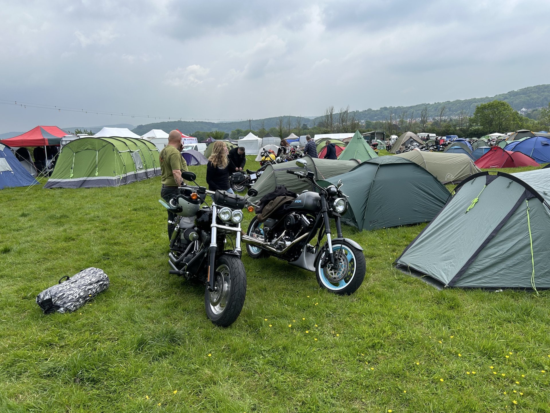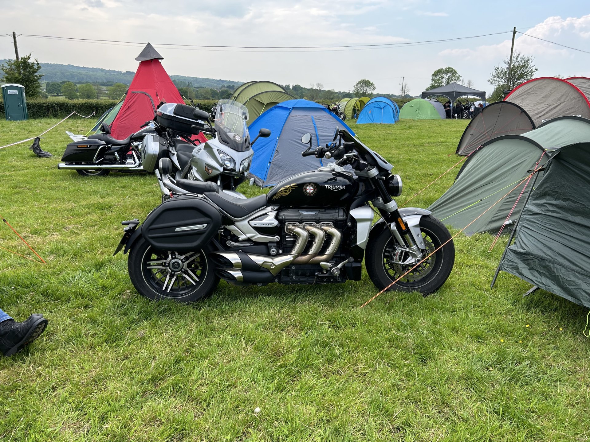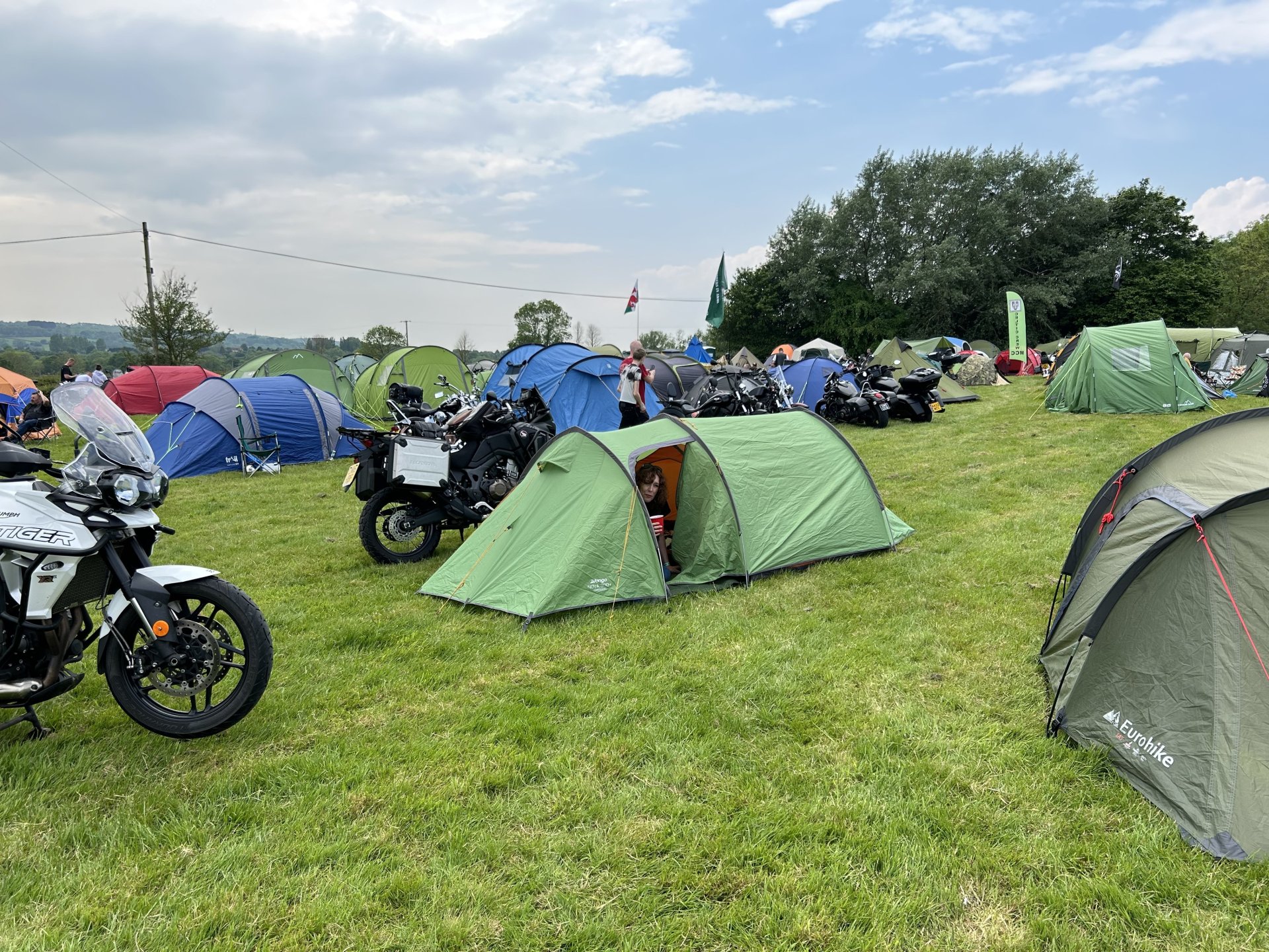 Left for the rally around 10 with thunderstorms forecast on route so I put the waterproofs on as it was all motorway there and nowhere to stop if it started to rain arrived with no rain and everyone enjoying the sun we looked a bit stupid dressed for rain anyhow tent is up and I’ve blown the froth off a couple here’s a few photos I took on the way to the outside bar