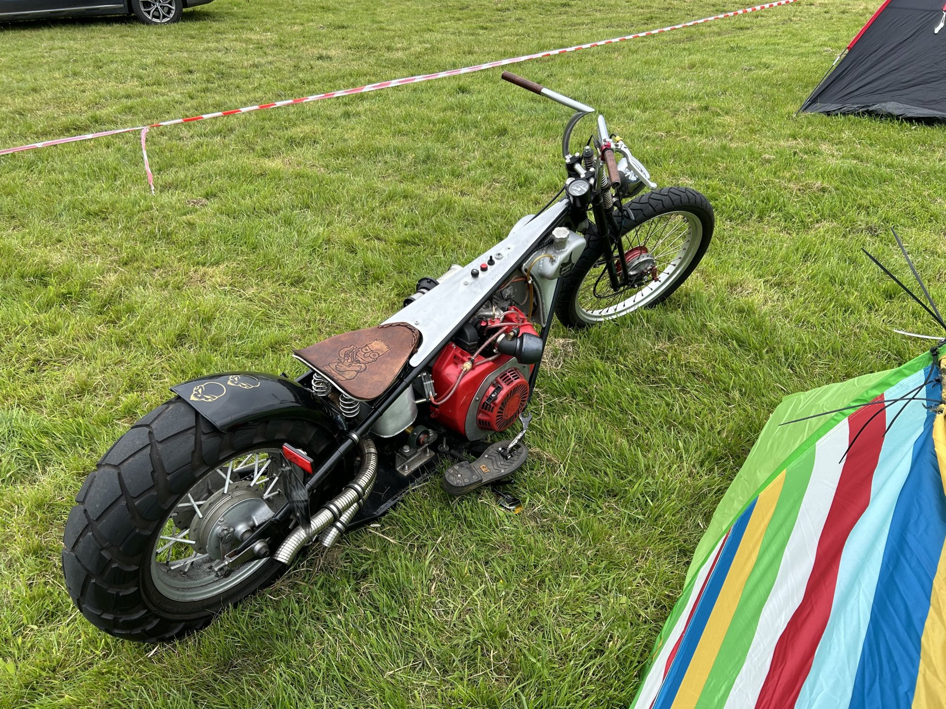 I was talking to the owner interesting guy from Bristol. He used a 650cc V twin Honda plant engine. No gearbox just a vario belt drive off the crank