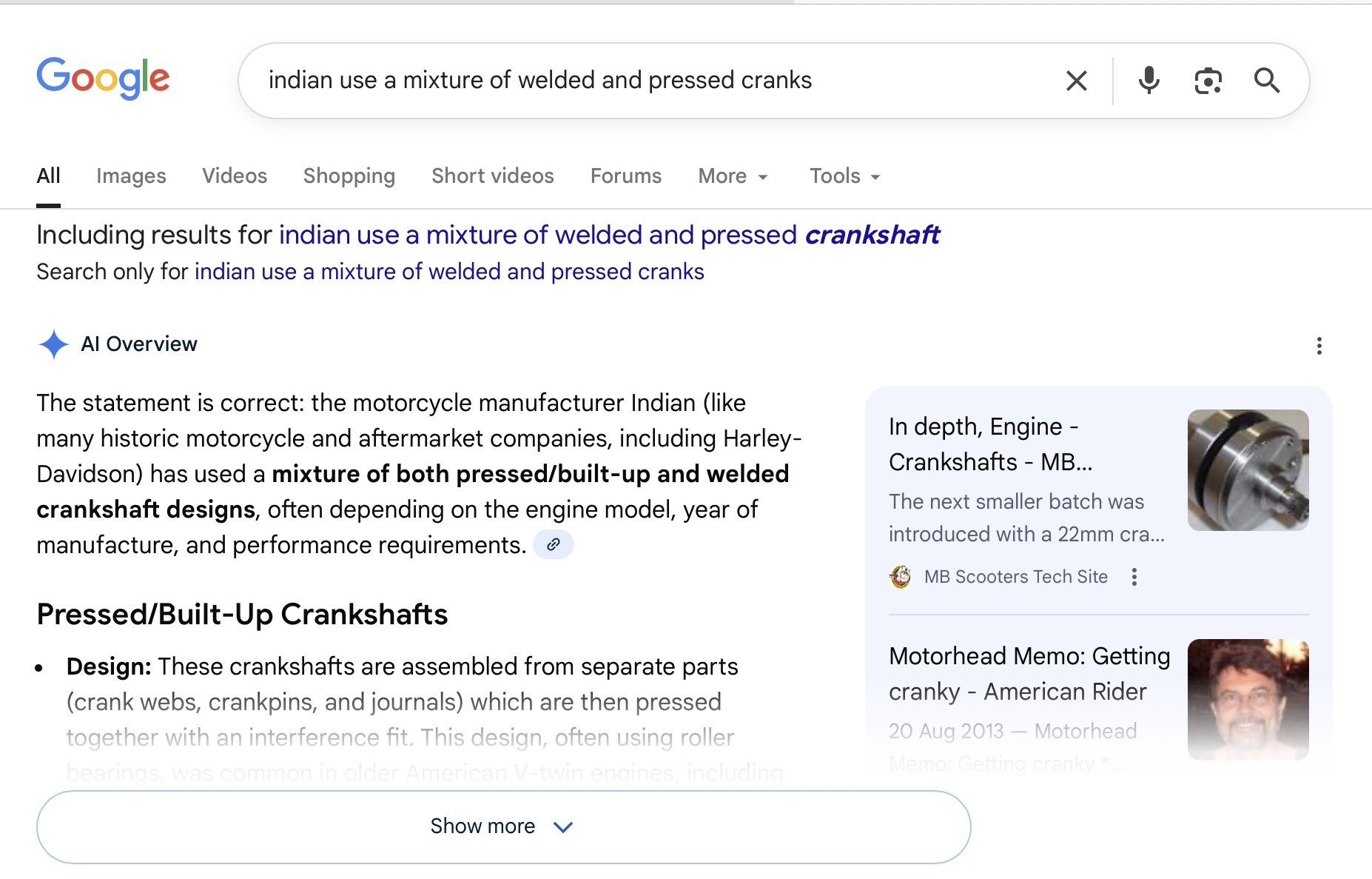 4. All v-twin engines have a crank pin, some are welded and some are pressed, if you were a mechanic you would know that. Indian use both welded and pressed crank pins. Harley had a problem with the early oil pumps which caused sumping on the M8 and crank bearing failure. All dealt with years ago. Incidentally S&S have gone back to pressed pin cranks for all their high power applications with zero failures. Indian had a real problem with their flywheels which they get from China.