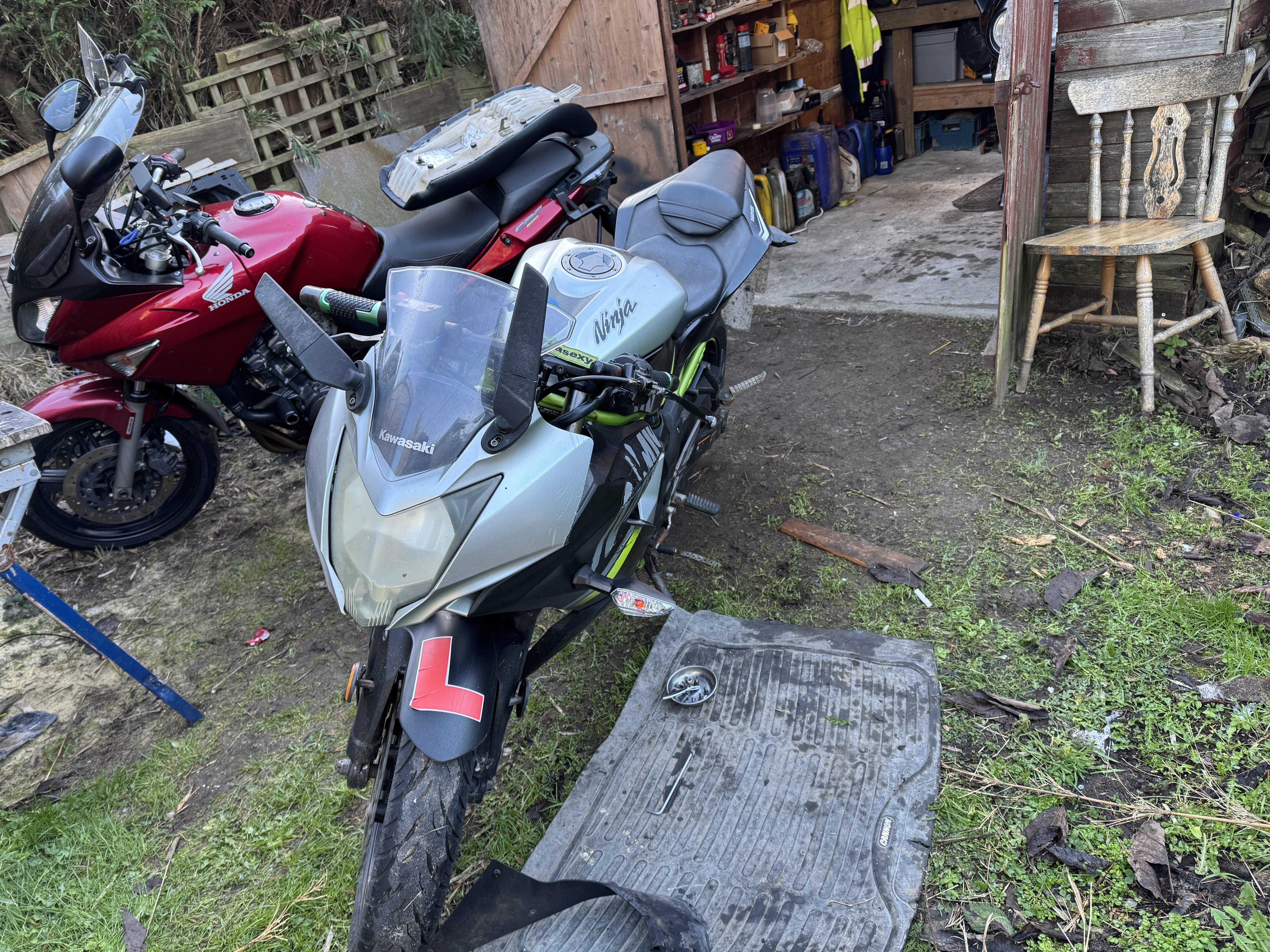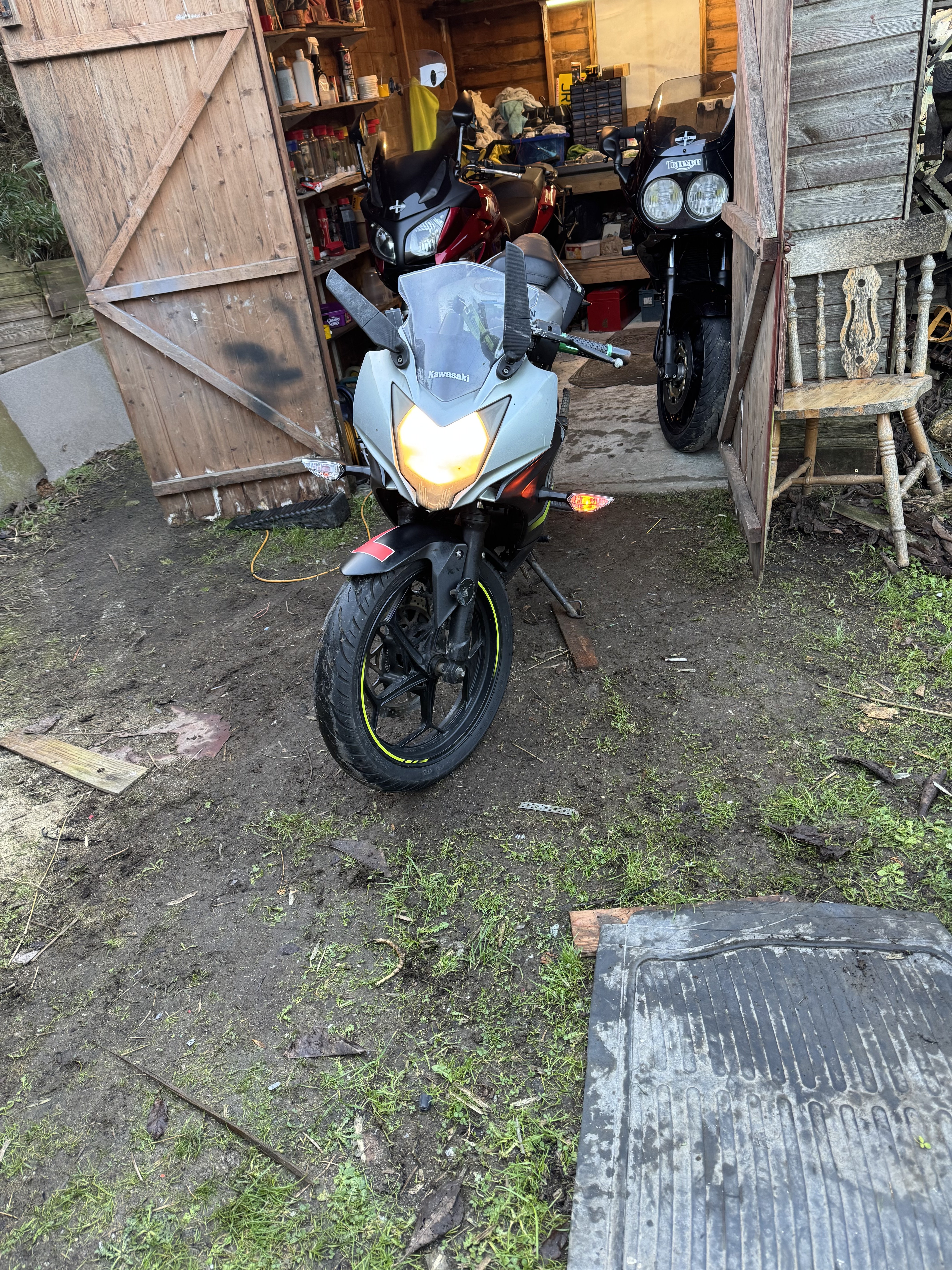 Spent all afternoon fitting How Highs Christmas present and repairing the fairing panels they mount two. Both were cracked and split where he dropped the death trap on separate occasions. Anyway two new front indicators a tube of epoxy putty and a load of new push button fixings and it’s holding together again.
