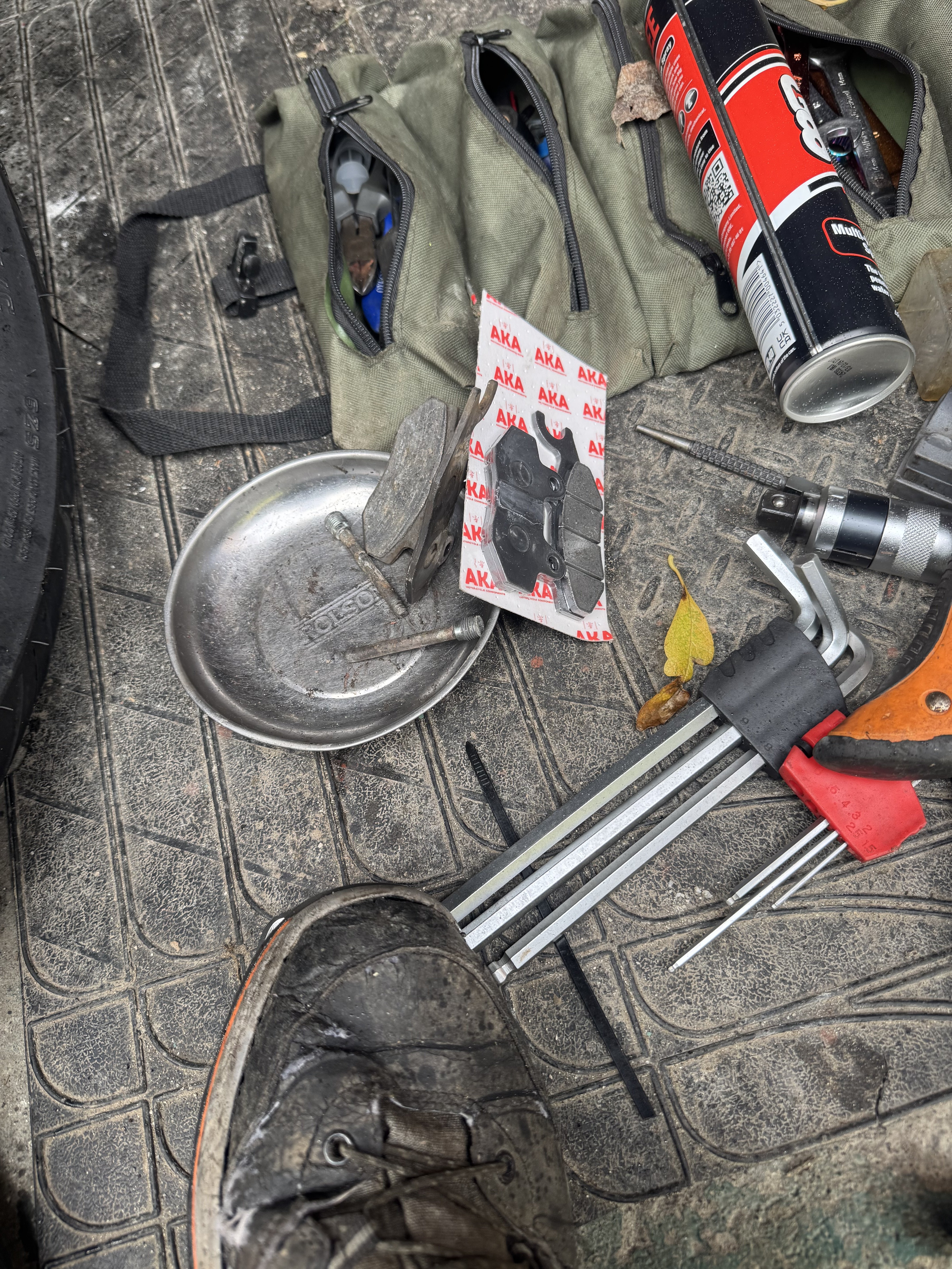 On a roll today I cleaned and fitted new rear pads to How Highs bike. All dry as a bone and less than 1mm of life left on the old pads. All sorted and back together.