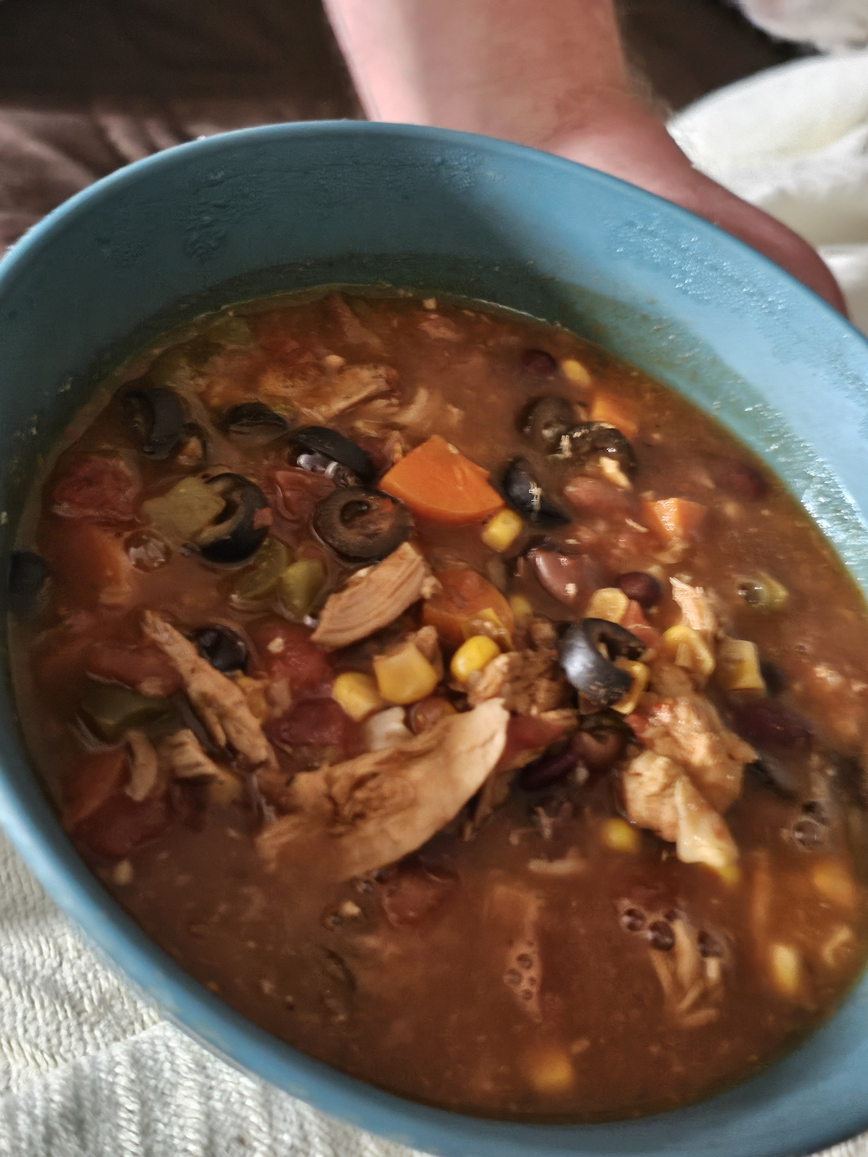 Mrs. Hook's infamous Taco Soup....plenty of habaneros, jalapenos, beans, corn, black olives, carrots & bbq'd chicken. Definitely will clear your sinus'....good for what ale's ya! Best part is there's still 2 gallons of it out in the garage freezer...