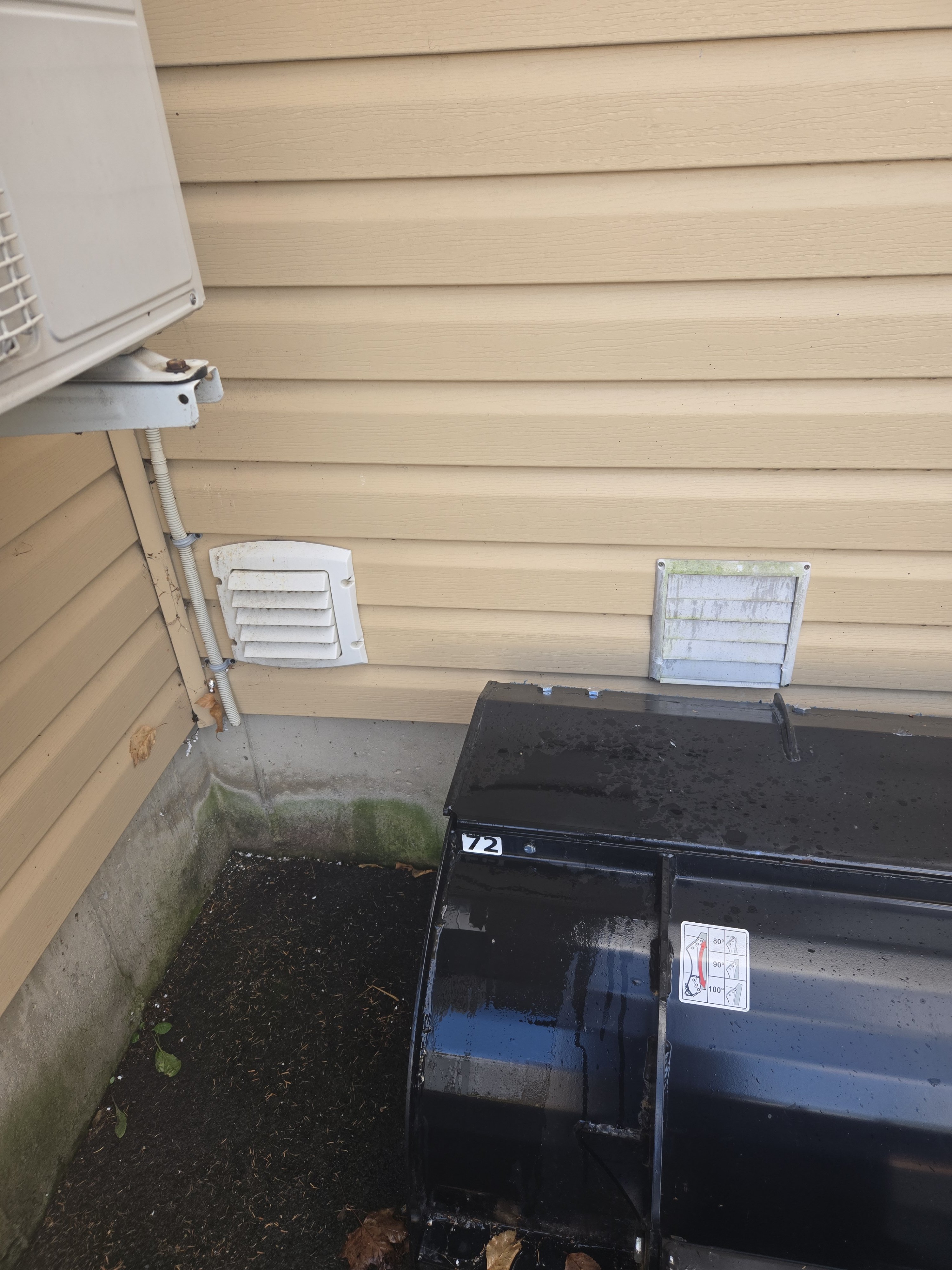 4. Not much to it actually....when it was originally installed the exaust or stail air would exit directly outside about 3 feet away from the intake...not only it would probably sucking back in the old air , their is something like a heat exchanger but still would be loosing heat...so I moved the exaust venting in the garage..what ever heat coming out it stays into the garage... Intake on left...I just left the old trap door in place instead of messing around with the siding...seal it up with spray foam ..