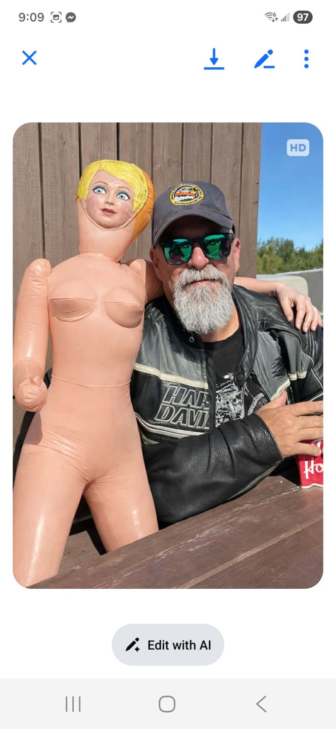 Anyway this guy Mike in the picture went out and bought a sex doll with lube and placed it on his porch on valentines day...wyll he was at work...everyone in the Mc club knows...and we haven't heard anything from him...not a word...lol. Anyway this Saturday, on a group chatt on messenger...Mike is going to post a AI picture of him sitting at his favorite coffee hang out with the doll...lol....to see his reaction...lol....this is going to be epic...lol.