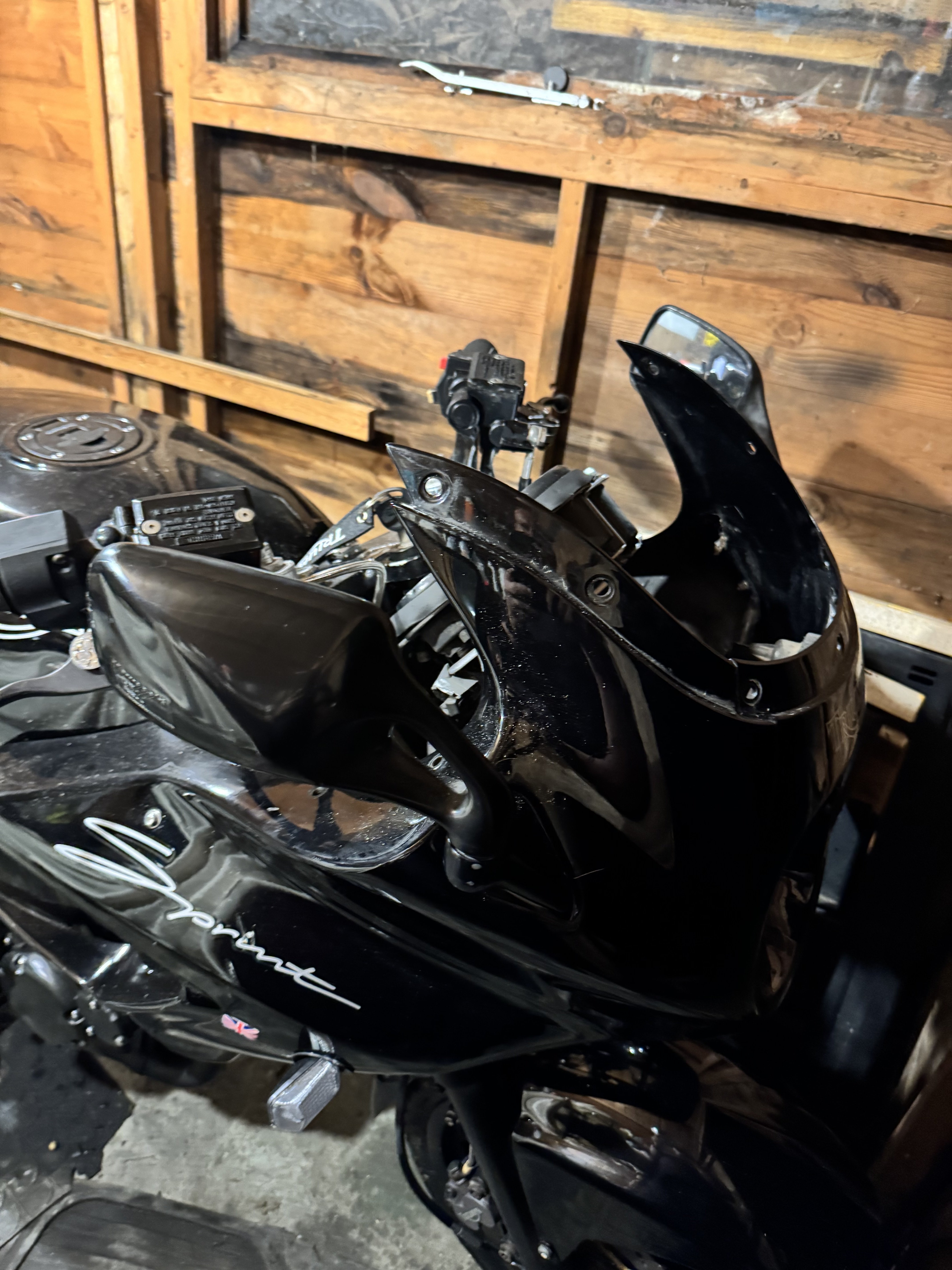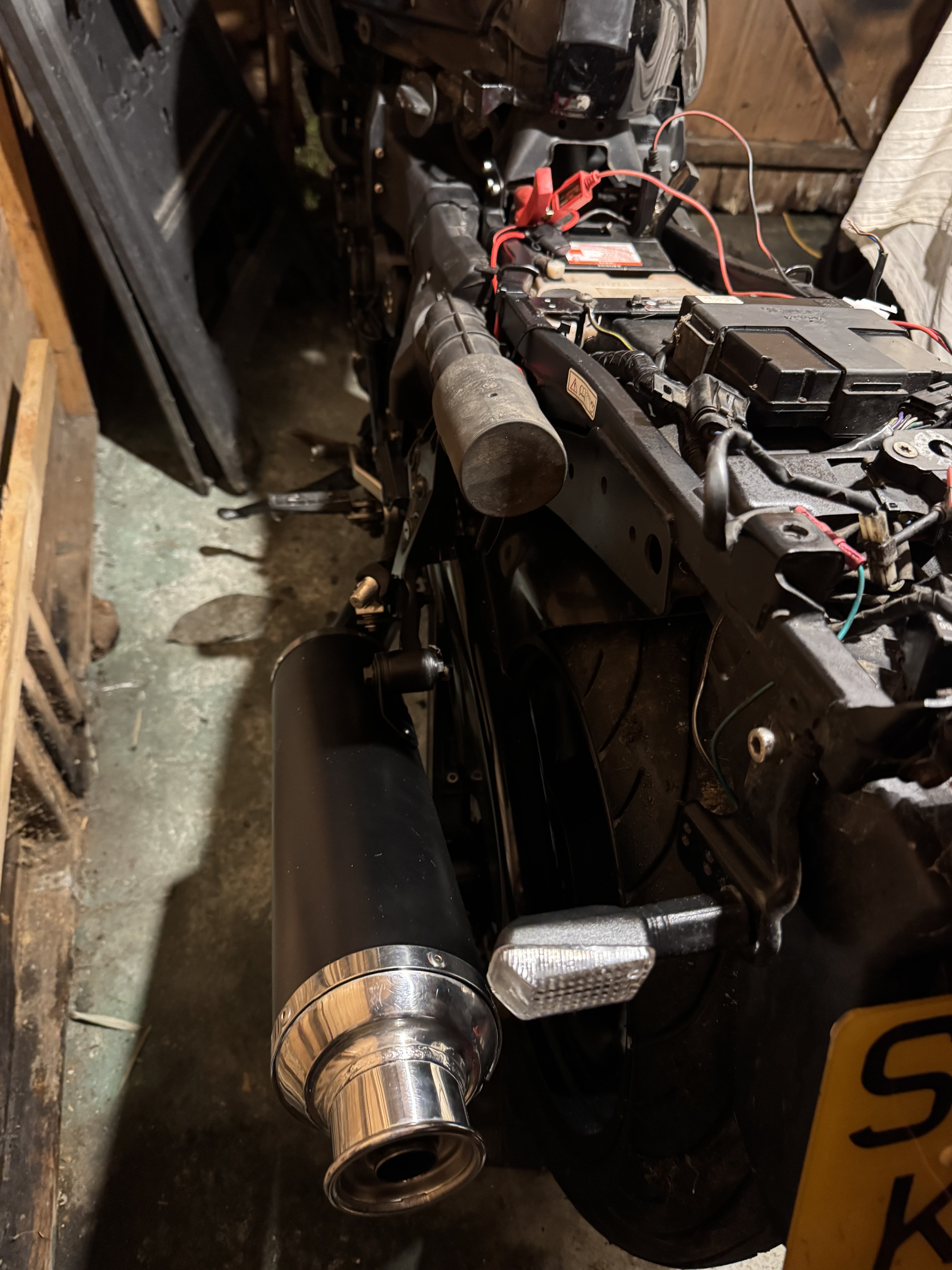 Made some progress today. Got the silencers back on and fitted a new rear brake switch. Got a fair bit of cleaning done and started stripping the from fairing. I have a new screen to fit, plus I want to paint the mirrors and replace the Kawasaki mirror that is fitted with a Triumph one. Also fitted LED bulbs to the Headlights, I have ordered some LED side light bulbs as I didn’t have the right ones.