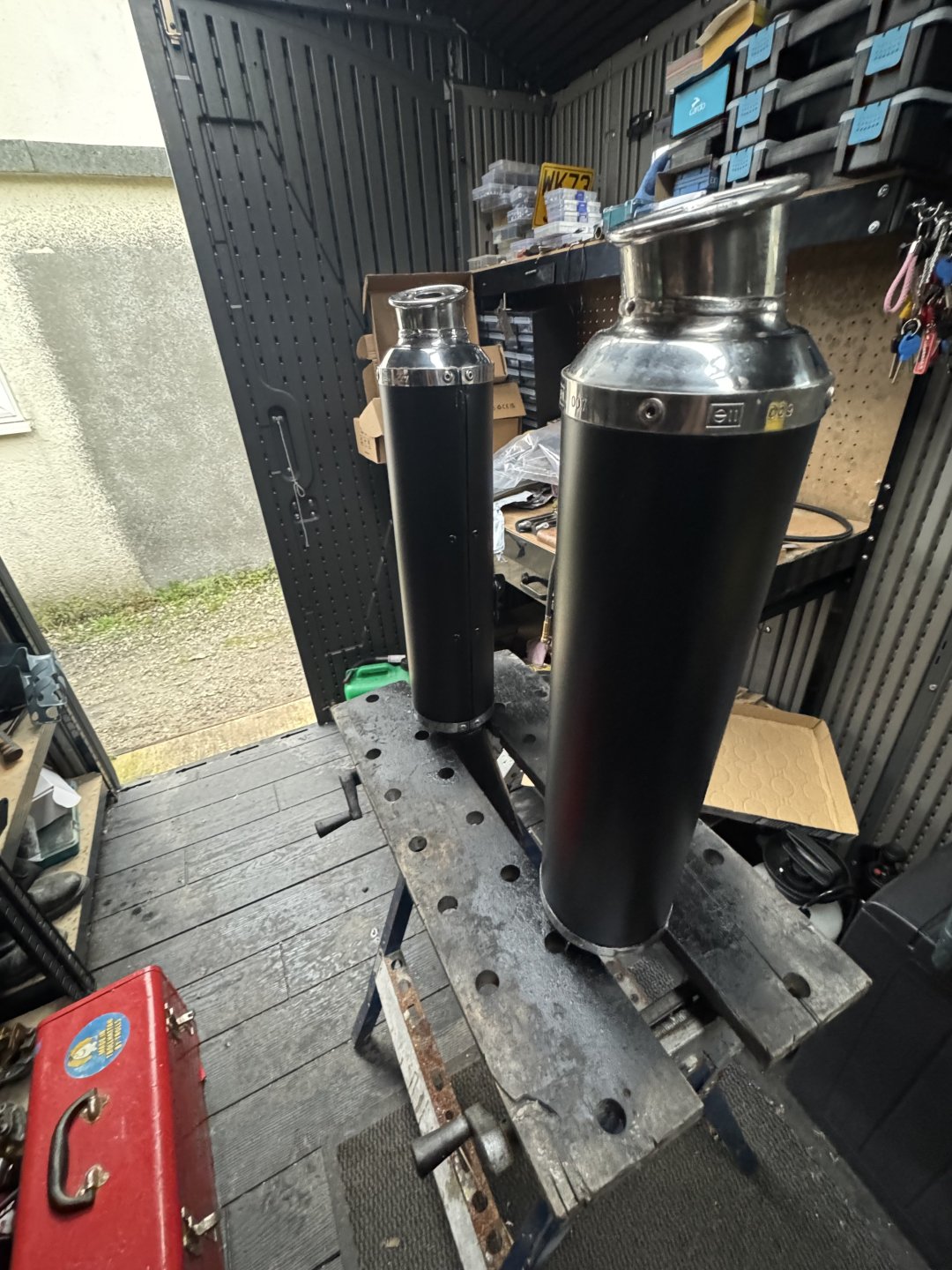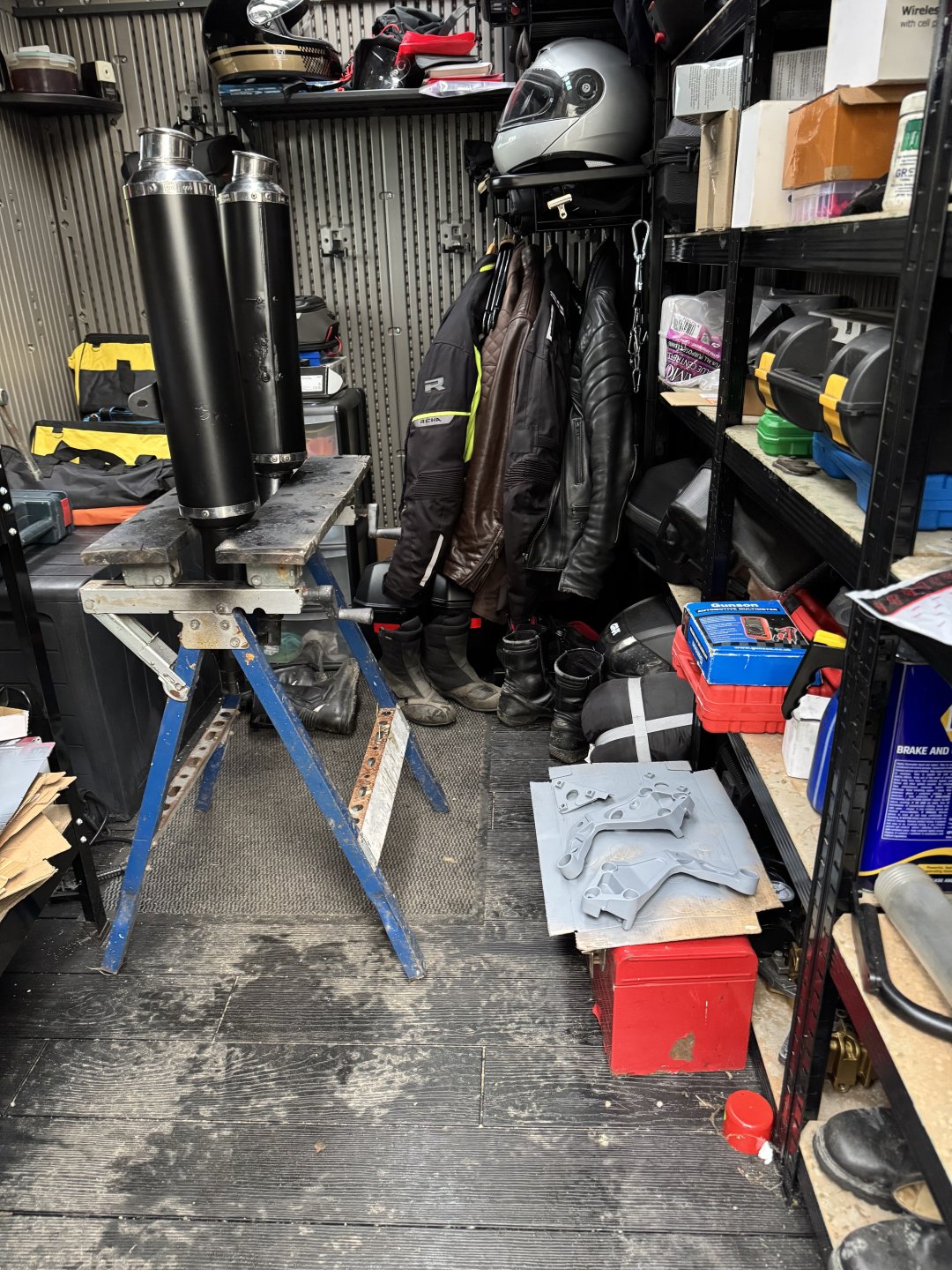 Spent a few hours repainting the tailpipes and hangers. Gave the tailpipes 3 coats of satin enamel. The hangers were pretty corroded so took a lot of cleaning up. Will get them painted tomorrow. Patchy old paint probable due to being touched in several times. Corroded hangers. Waiting for the paint to cure before refitting Yes I know the shed is a mess