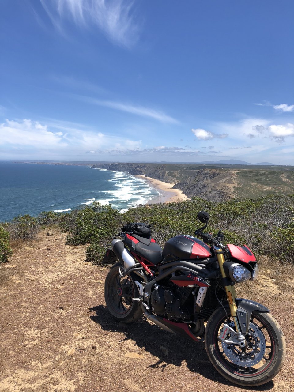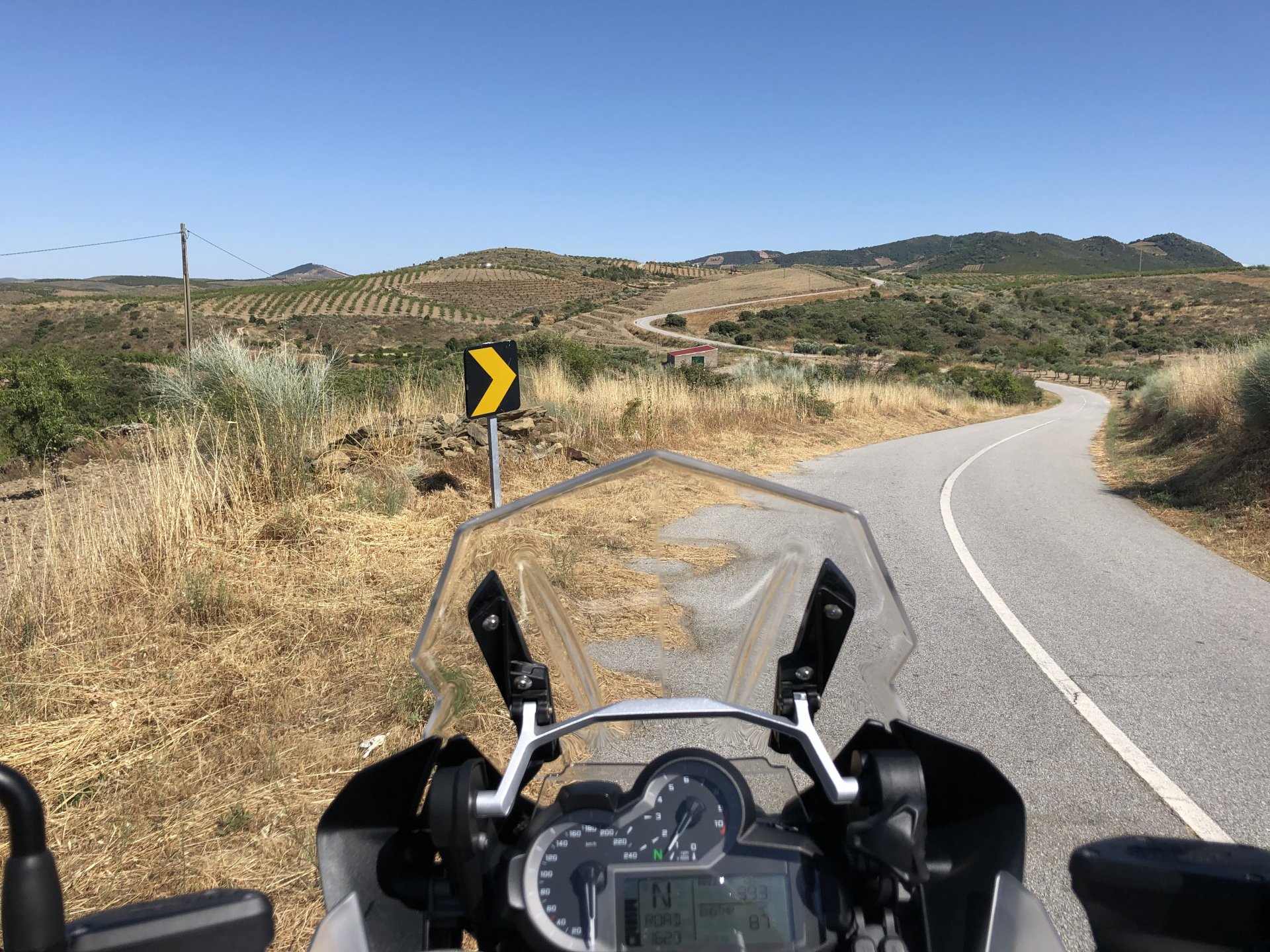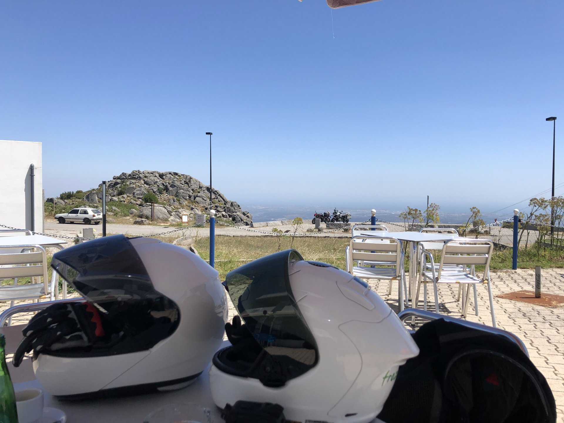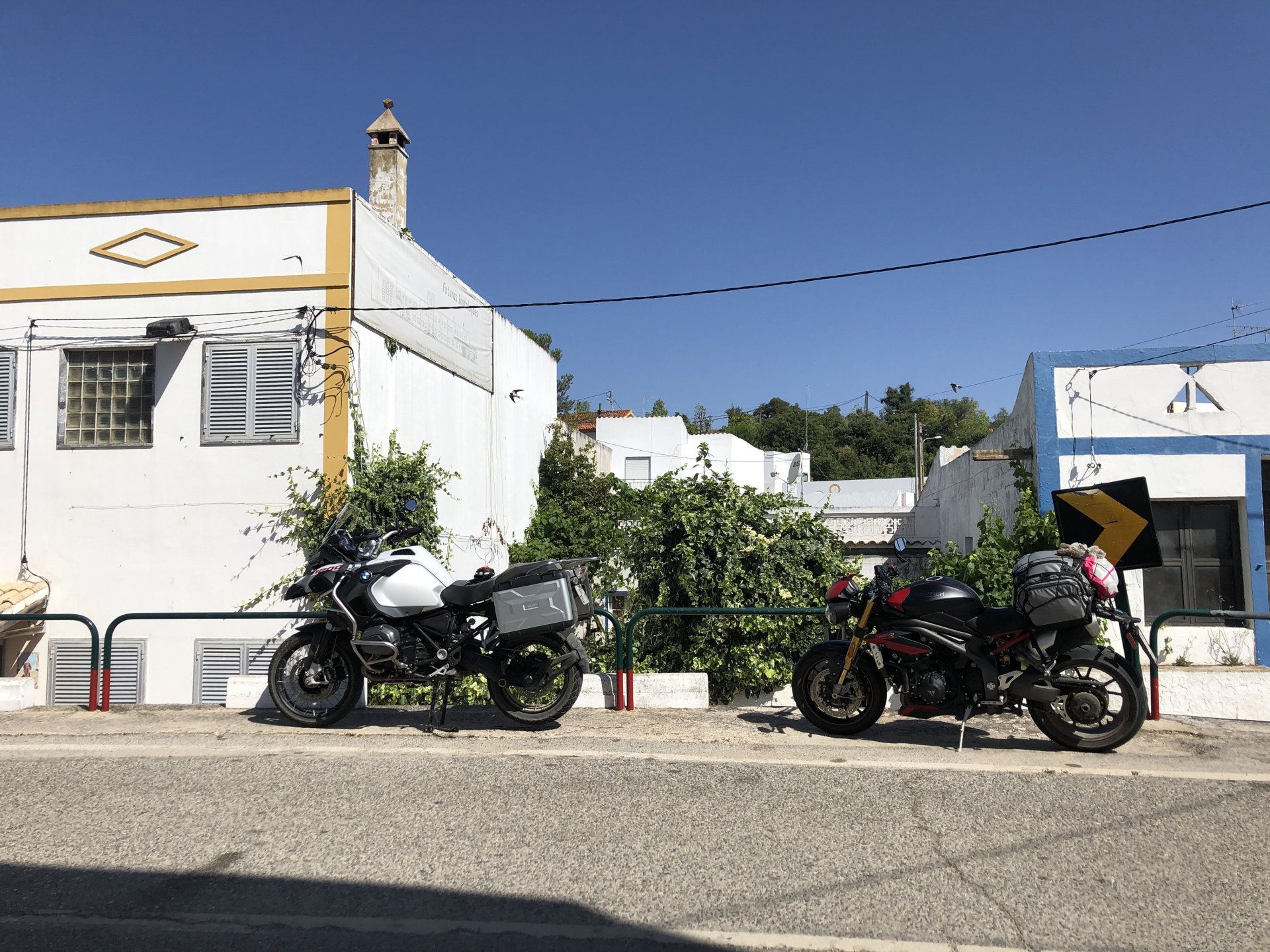 So last two to three days: Leaving Alcoutim we only have a very short ride to get to the sea, but instead I decide to cross the Algarve via inland hills to Sagres, check google maps where it is, as it's a special place for most Portuguese. First, we had a lot of nice mountain roads, I love riding on the hills in the Algarve We try to stop for fuel, get to the station and there is a sign saying "back by 10:00", it was 10 already so we went for an expresso at the local little cafe, run by a cool but loud old lady. Took the chance to buy a ham sandwich to have for lunch later. 15 minutes later, finishing our coffee and getting our sandwiches the fuel station guy comes to let us know he's going back to work, rural Portugal! And thus, we make our way to Monchique, getting used to nice roads now, Sofia was not happy to have roadworks and a detour via 4 or 5km of dusty track, made a mess out of her Triumph, here looking like a rally bike. Climbing high to get to Monchique, Algarve's highest point, we stop for lunch. I'm sure there is nothing wrong with a butter and ham sandwich, even to people with such weird tastes like you guys. Proceeded up the hill and had another expresso at what is arguably one of the best cafe vistas in Portugal. Didn't feel like riding away from the cool weather, plus I knew a great restaurant to go for dinner here, so booked into an old mountain hotel, quite rundown but friendly, and with a great swimming pool. Had a dip, and soaked up before going to dinner, getting the previous days' extreme heat out of my memory. My favourite thing after a ride in summertime, a cool glass of white wine at the end of the day Dinner was a great cress and orange salad, and some kind of pork cut I can't explain, deliciously cooked with fresh coriander, and mint rice. I had a blast, and drank WAY too much, so by the time I got to bed lights went out quite easily. We had such a great dinner, and enjoyed the mountain so much that it was decided to visit Sagres and come back for another night. Sofia took great joy in this as the Triumph isn't at all elegant with the big bag in the rear. Making our way past Odiaxere dam: Now the thing with Sagres is that it is the southwestern most point in Portugal, and Europe as well, this is where we used to have the school that trained master navigators and pilots that would venture around the world on boats, you need only to have a little bit of romance in your heart to feel a sense of adventure coming to this place. To help you, listen to this while you see the pictures, words won't mean anything to you, but this is probably the most portuguese of songs, about sailors missing home when out on sea. It's all about feeling, and that I'm pretty sure you can get from this: Entrance to the Sagres fortification, the tip of Portugal is behind it: Next visit was only 2 or 3km away, and probably my favourite building, it's the lighthouse at Cape Saint Vincent, pretty amazing place. Going back to Monchique, I decided to show Sofia a spot with some great ocean views, takes a little dust to get there though: And again, another cafe picture since that all I do, back in Monchique: Riding back to the hotel, I take a little offroad detour to take a picture of my bike higher than windmills, as it's not that common you can do that: Back in the pool. Let me tell you, a swimming pool or a dip in the ocean is something amazing after a bike ride in the summertime. Dinner that night was octopus and sweet potatoes, slowly fried in garlic and olive oil Day after, Sofia and I parted ways, she goes back home to work and I'll stay in the Algarve a few more days, in Faro to get some sun and salt water on my skin. Thing is, before going to Faro I needed to visit Sagres again. Sagres was my first trip with Maria when I first got the 1150GS, we came to the Algarve for my birthday, and rode down the coast in June. That was the first time I visited this bit of Portugal, and have loved coming here since then as you really get a feeling of adventure and history. However, the feeling I get when coming here is a huge amount of loss and grief, along with a good remembering of those days. So, I needed to come here alone, and I did. I had a good cry sitting there by myself, and I think I needed it as it cleared my mind a little bit. Going away with Maria for a week on my birthday was the highlight of my year, and now these dates are specially painful. A copule of hours later, rode along the Algarve's south coast to Faro, to meet up with my dad. Quick ride to the beach for 2020 first ocean dip, and then dinner on a very warm evening. Dinner was little clams, we call them "conquilhas" but I don't know the word in English for them. Cooked in a little white wine and coriander, with plenty of garlic, taste of the Algarve this is. Then, just to revolt you guys, fish eggs salad. Delicious and fresh. And this morning, back to the beach: So, this is it, the end of my ride around Portugal report. I got to see a lot of new things over the last week, and am a little in love with riding in my own country and my bike, also it's always good for me to be on the bike and on the move in days like these, hope you enjoyed it too.2 points