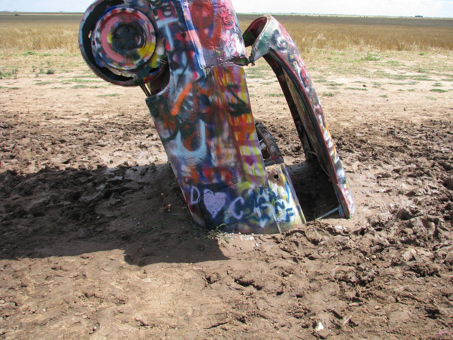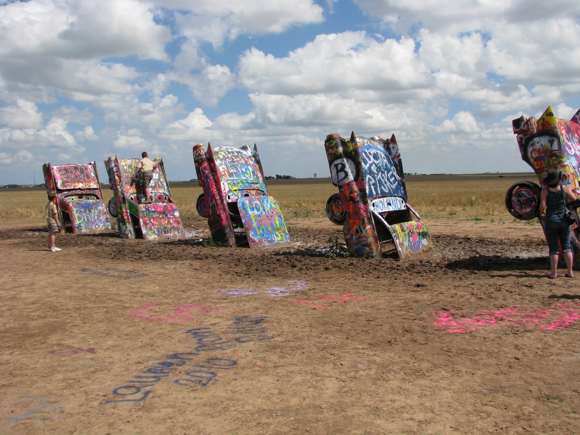 Some artist did it - dunno why. Also called Cadillac Ranch, see: https://en.wikipedia.org/wiki/Cadillac_Ranch There are usually a bunch of spray paint cans there in a box so you can paint the cars a bit yourself.1 point