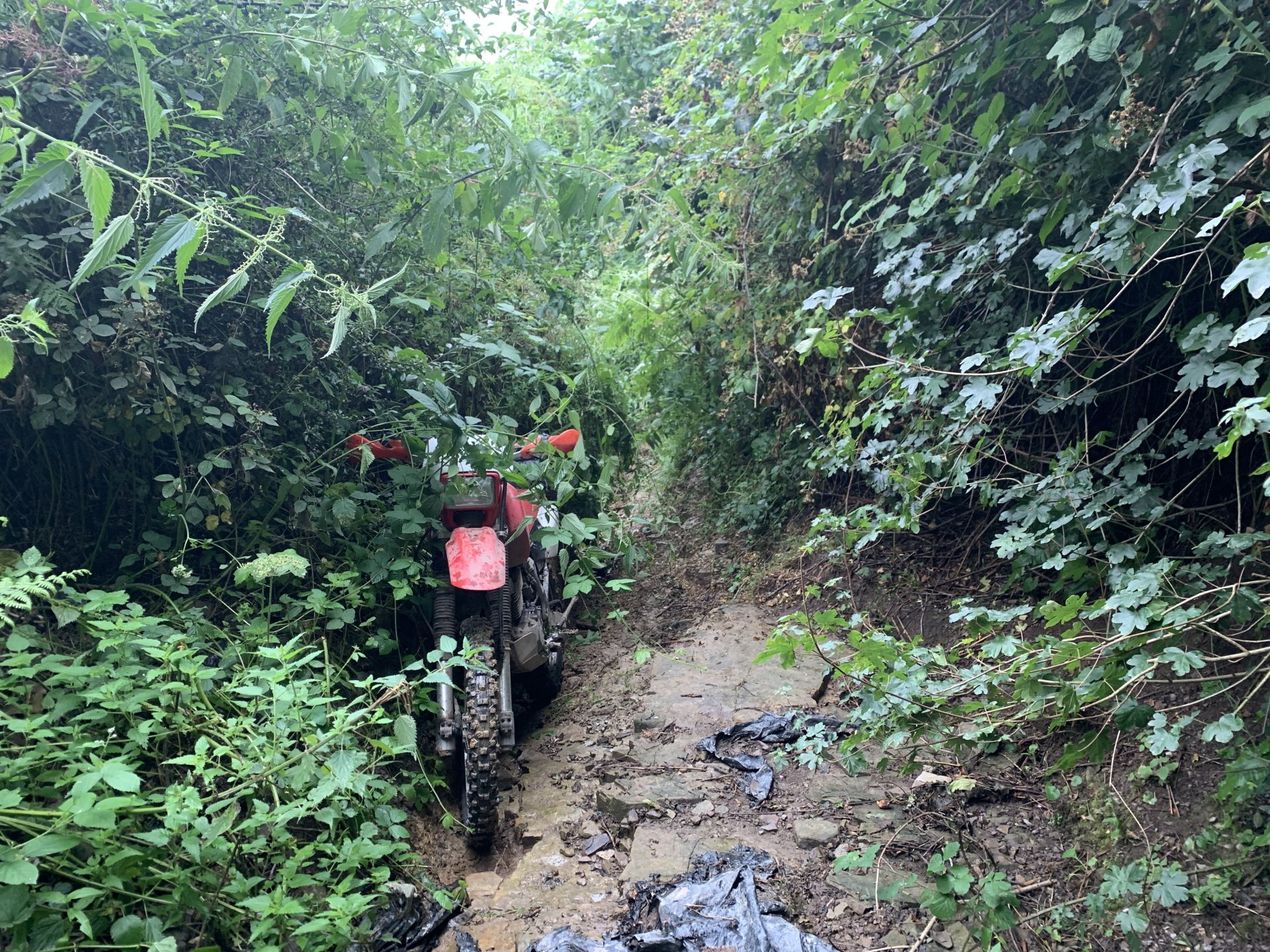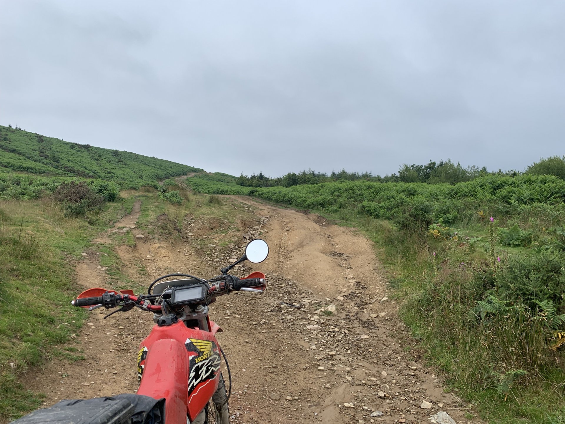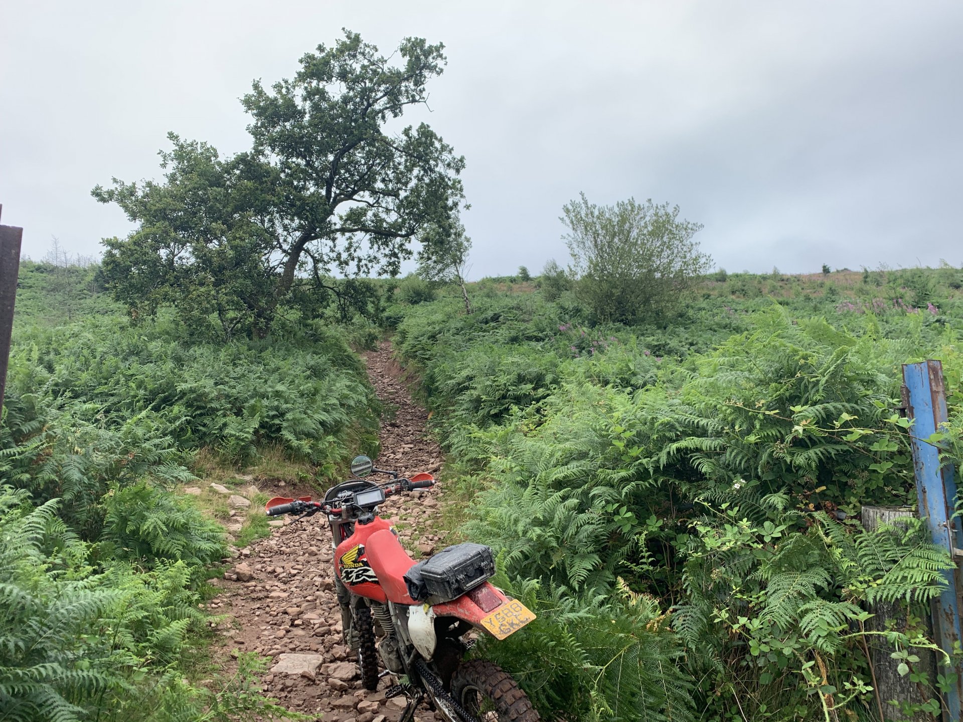 Wanted to have a couple of hours out today to check out two lanes out Llandegfedd way but it turned into an afternoon of trail riding and extreme exercise. The weather conditions and the ground after the rain last night were perfect for trail riding not too hot and loads of grip with no dust. No planned route just followed my nose taking in a few lanes on route there and back didn't take many photos on route This one is heading up to Twmbarlwm mountain stopped to open a gate a bit tricky starting off again on the loose ground This is the view in the opposite direction if it wasn't so murky you could see the Severn bridge from here i did give Bob a wave as he's in that direction Almost On the top This was the first lane i wanted to check out as i hadn't done it before, Its only a short one The thought i hadn't done it before disappeared here as i remembered this drop i had been on a ride not too long ago when we rode this but was following not leading so you don't know where your are or where you've been as a follower This was the other lane i wanted to check out i have done it before but couldn't remember it so wanted to do it again. its all up hill in this direction Just inside the gate was this sign for the ones not in the UK that means max speed of 60mph for us, i later discovered you needed to be doing 60 to get up here On the other side it had a 30mph sign to tell you to slow down as you enter the farmyard The track was a little washed out At this point i discovered a kickstart only bike was not a good idea in this lane i stalled it here and guess which side the kickstart is on. Ended up having to drag the bike to here so i could get a swing on the kickstart. Had to let the bike cool because it was suffering a bit which also gave me a chance to cool down i also trimmed some of the nettles and brambles to make it easier next time and then realised there wont be a next time dopey bastard I thought that was the last of the tough bits but there was more to come the slab rock was incredibly slippery and cambered to the right which is where the rear wheel went every time i touched the throttle, turning around wasn't an option as it was far too narrow and i'm too bloody stubborn so it was tough it out it was also overgrown When i eventually got out i had to adjust the clutch cable as i'd lost all the free play on it, never had to do that before. Another welcomed rest here waiting for these girls to exit the milking shed on their way back to the field I decided to head home from here as i was fooked took the road past Llandegfedd reservoir the water level looks low I did do a few lanes on the way back they were also overgrown reminding me why i normally ride this area in the winter time5 points