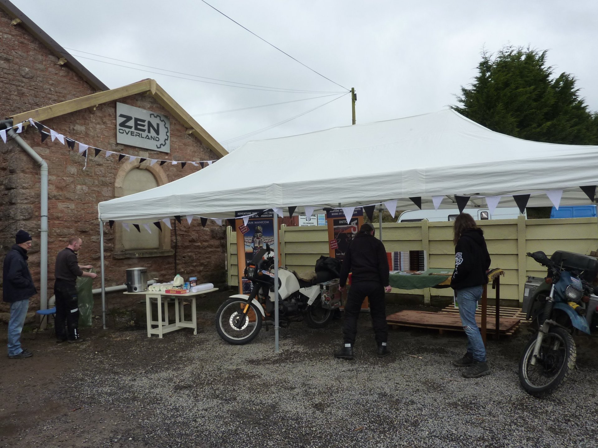 In 2013 I worked with Gabe who was going to open new premises for his fledgling company Zen Overland. He got an old railway goods shed and we spent 3 months doing it up . Here I am up on the forklift trying to sort out some electrics, not a lot of health & safety going on here .......... a and Gabe cleaning the flourescent lights........... Things are startting to take shape................. Gabes XR400 , his supermoto and my KTM950................... Gabe on the phone taking orders.................. and my personal tea mug ............... This was at the opening day, Sam Manicon and Graham Field have there backs to me as they set up their stalls..............5 points