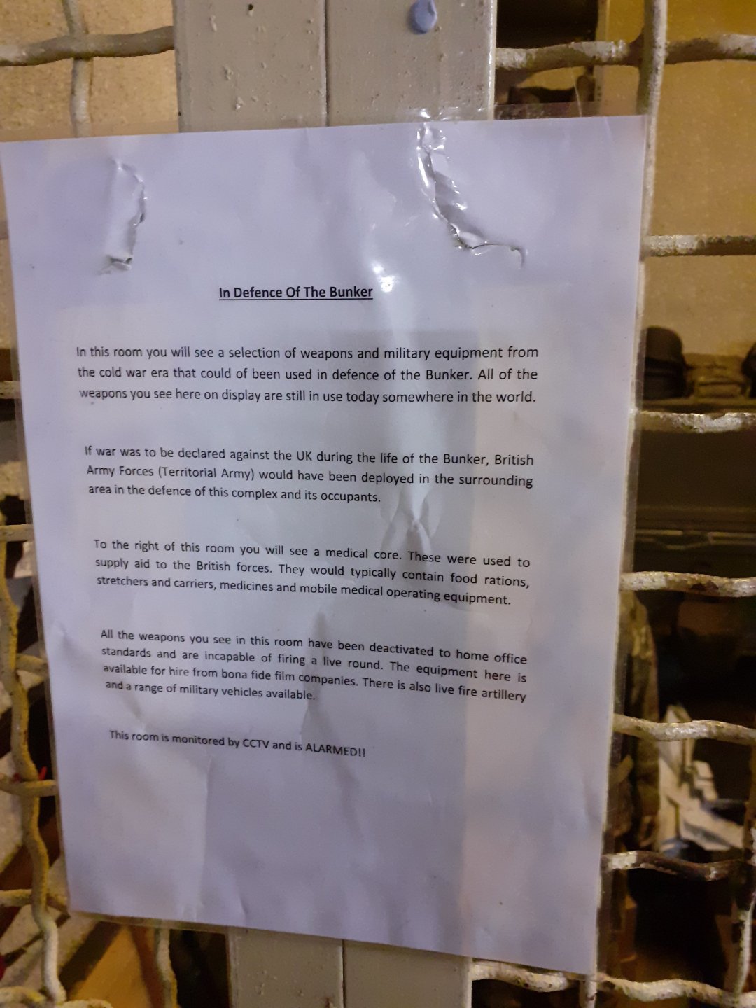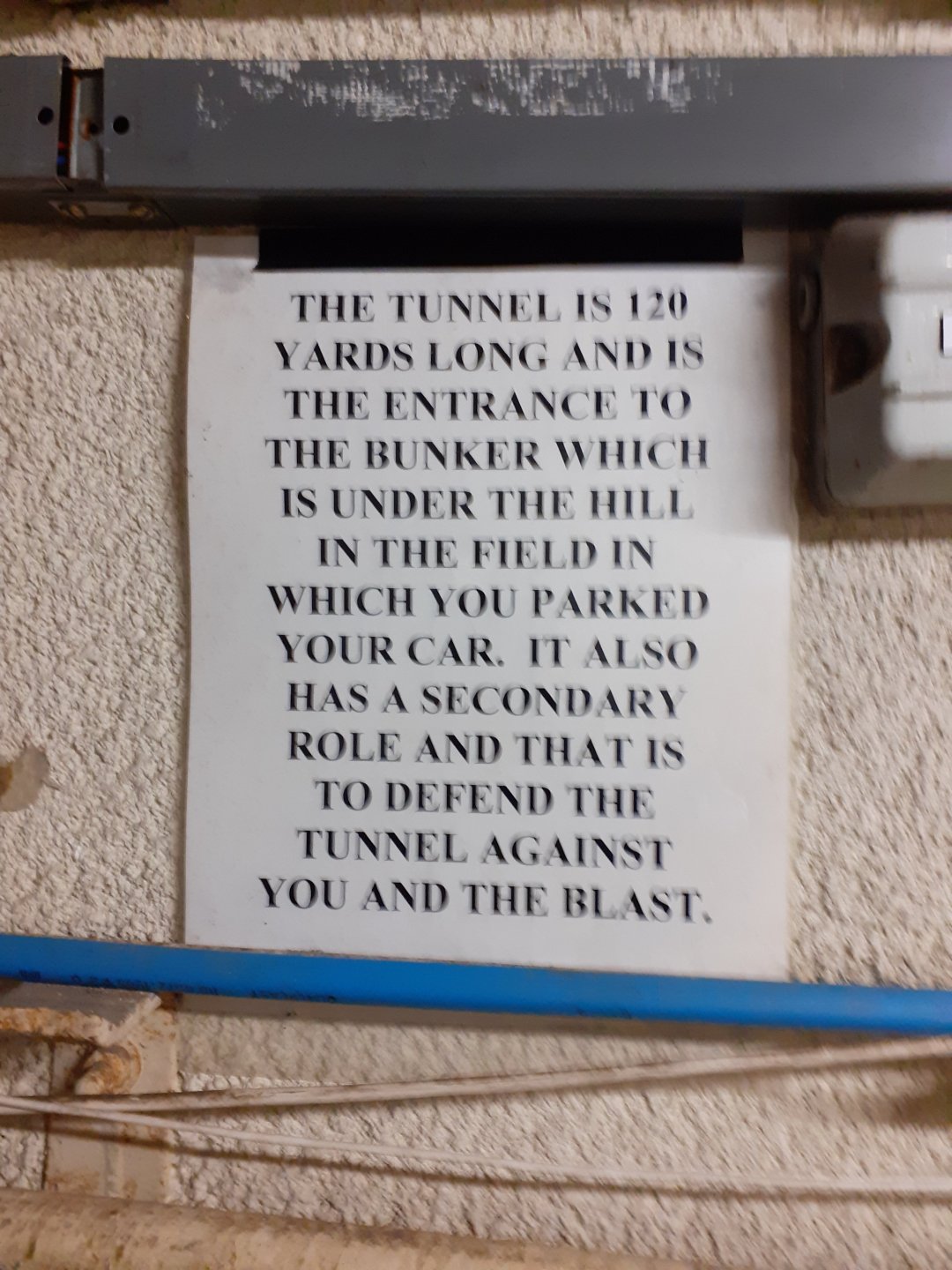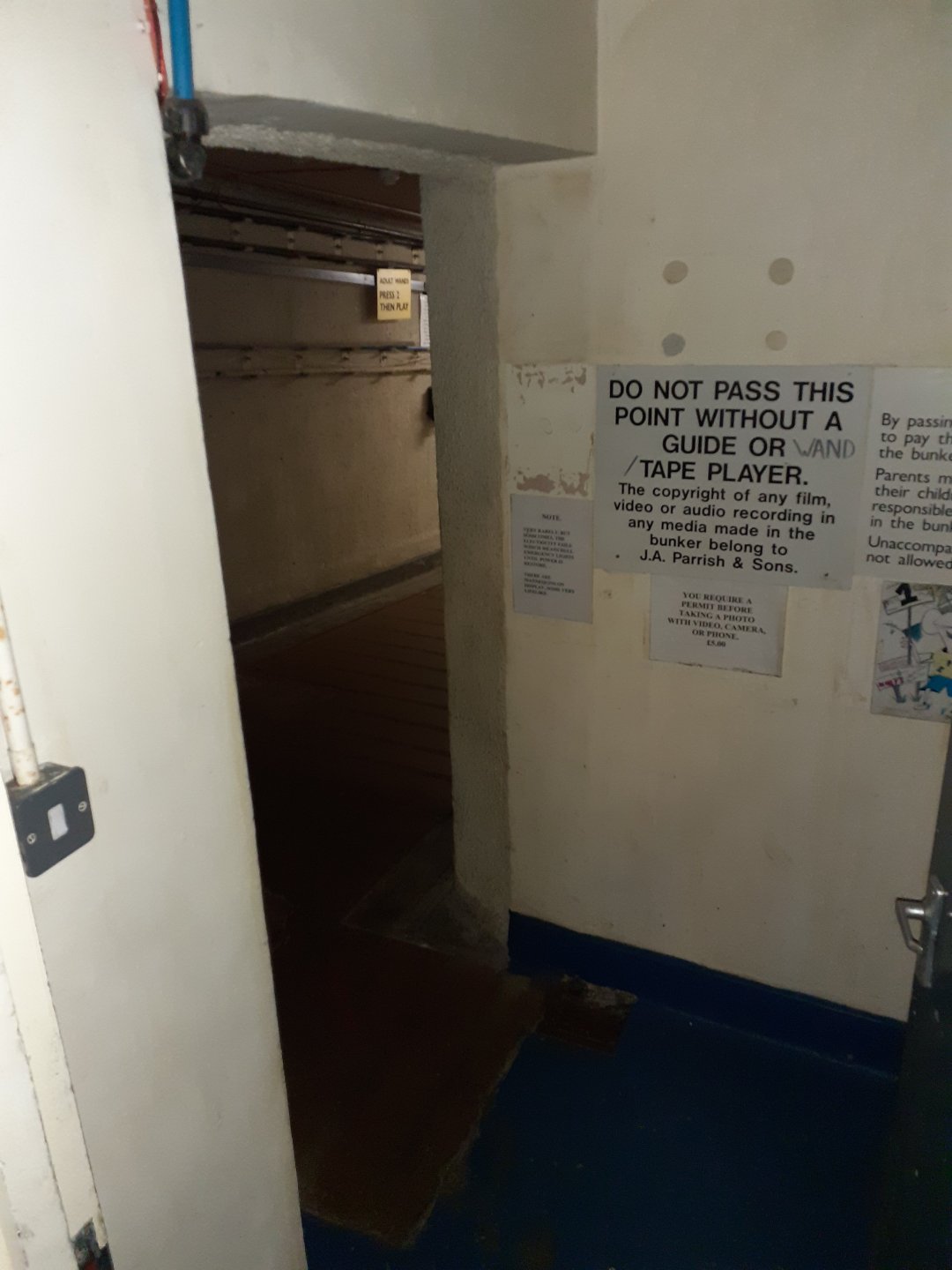 First of all apologies for so many blurry pictures. I deleted a few, but some, like the cardboard coffin or looking up one of the stairwells, I left in. Trying to take pictures on my particular phone with one hand meant I wobbled a bit taking some of them (the other had the guided tour doodah in it, the wand mentioned in the wall notices). The first picture of my bike is in the gravel car park which I later realised is on top of the complex itself. So, the secret nuclear bunker as it is now called, is in the Essex countryside not far from Brentwood. The land was bought off the present owner's grandfather by compulsory purchase in 1950. A local road was shut and screens raised to hide what the builders were doing. They removed a small hill and put down a few metres of gravel as a cushioning device before building the concrete bunker with carbon steel reinforcing then popped the hill back on top. They constructed the standard tacky cottage they liked to use to hide doors as one of two entrances. It's a big place. The entrance corridor is designed to make it difficult to move along whilst being shot at as well as a blast reducing measure. There were a few films running in some rooms. One comment that stuck was that when morphine ran out for the surviving population at large after a nuclear incident the police would be authorised to use firearms to put people out of their pain. This made me think of the Monty Python Bring Out Your Dead sketch where the not yet dead husband is claiming he's getting better as his wife tries to put him on the death cart. There is a huge amount of diesel stored there still (increasing in value as I type), plus large tanks of drinking water. All human waste would be stored in a giant tank until it could take no more, then pumps would push it out into the next door hollows dug in the surrounding fields and woods. It was still being maintained up until it was declared surplus to requirements and auctioned off, the same family managed to get it back. Apparently one of the generators was taken to pieces to be repaired when it was shut down and the thing is still sitting there in pieces. The final pictures show the communication aerial and air vent, plus a ropey looking tracked vehicle that was there back in 95 when myself and Strange Dave visited on our trail bikes before the visitor road in was built. It doesn't look as if any restoration work has taken place.5 points