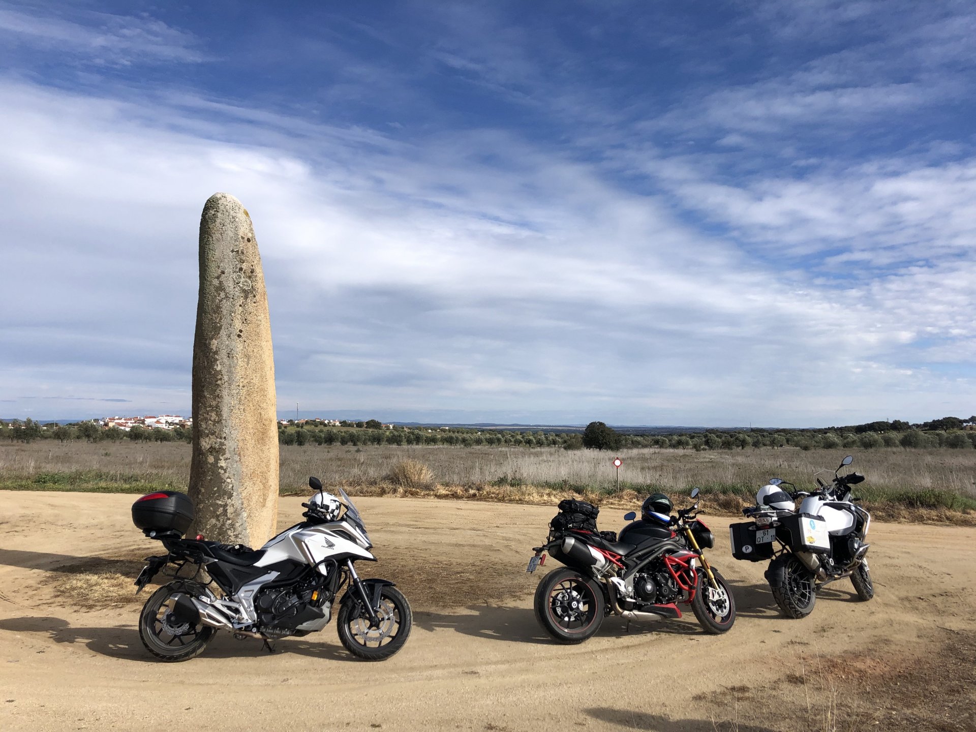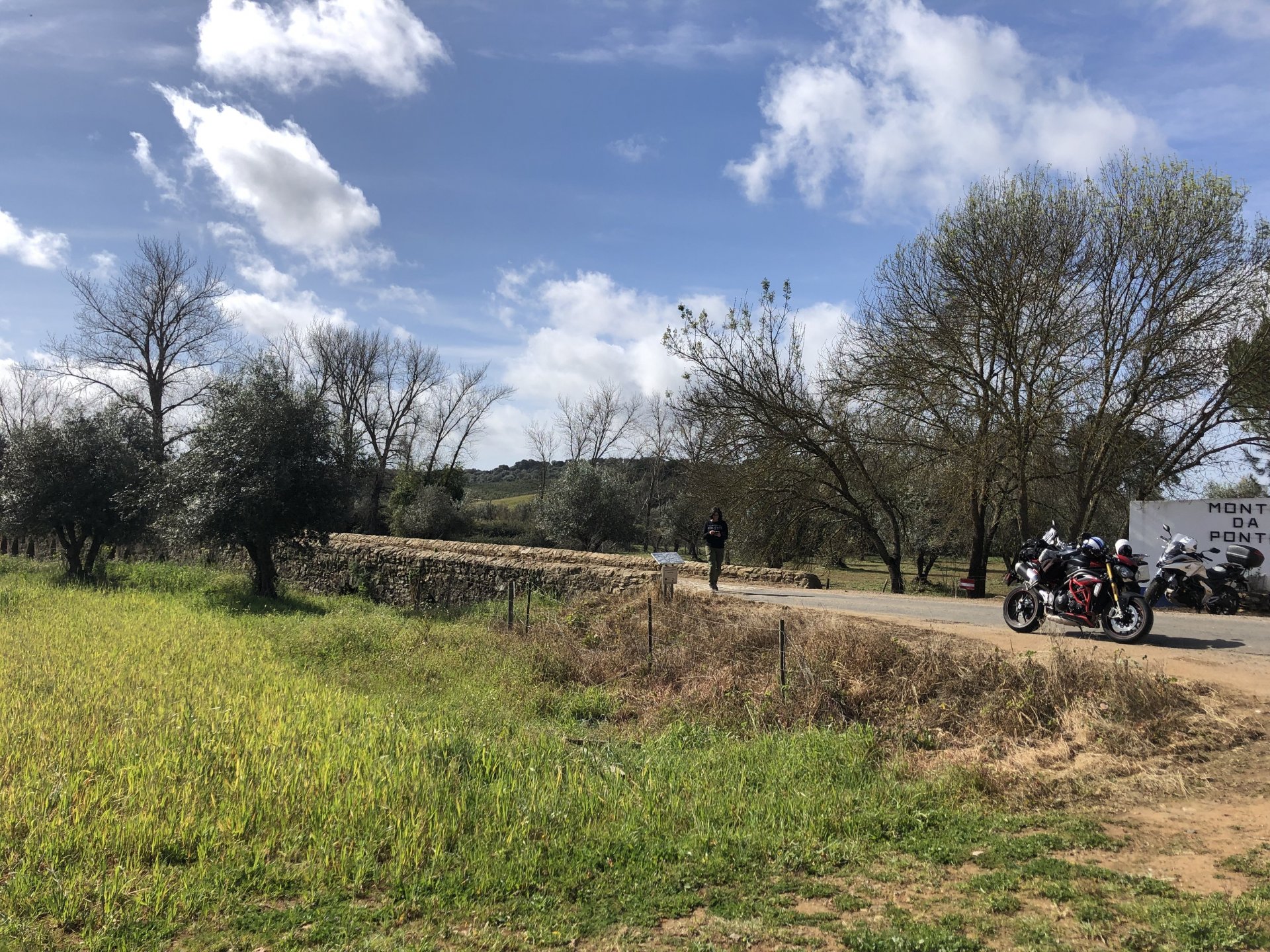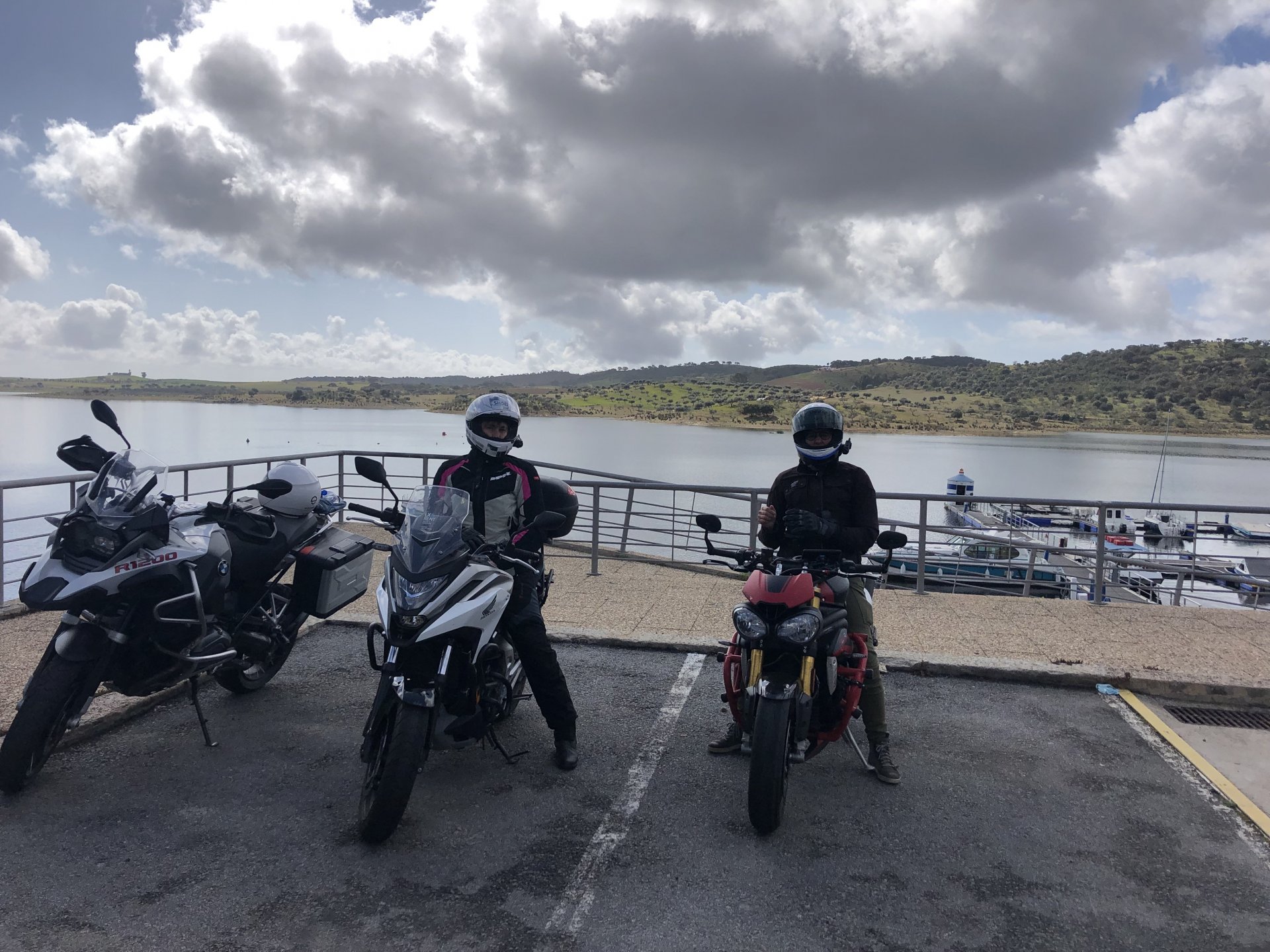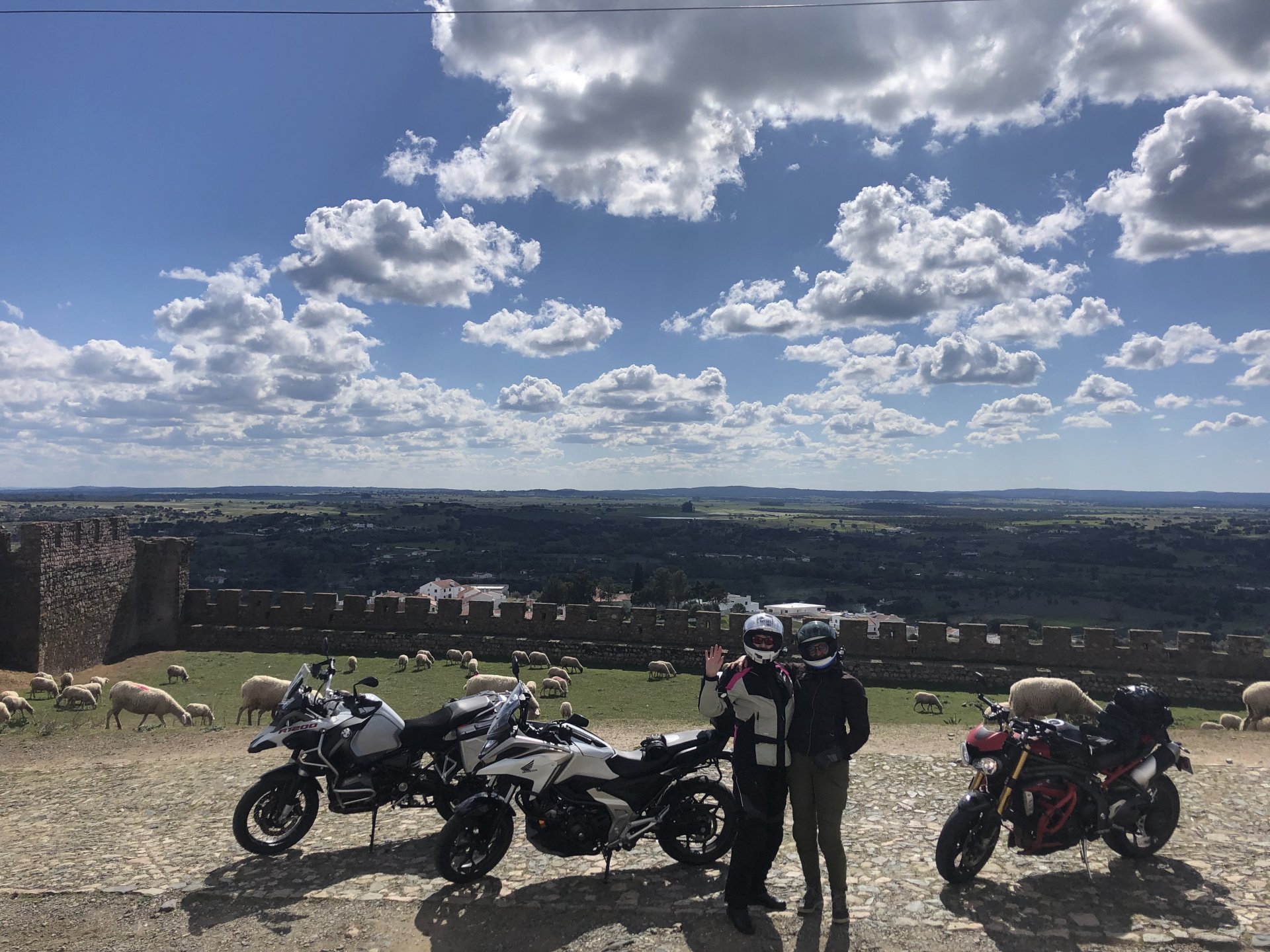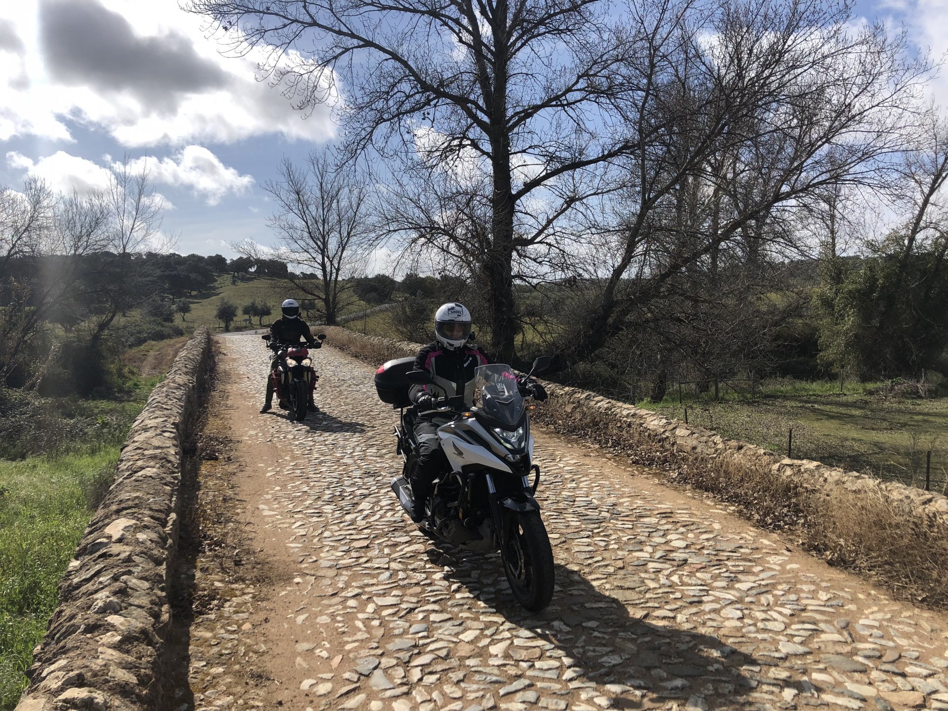 Sofia's very best friend came over from England to visit, and rented a bike for four days to go and see some of Southern Portugal. Sofia was going to take her on a short tour around Alentejo, there was warning of really bad weather, but still I decided to join for one day before going back up for work. Ended up aborting that plan and we spent a nice three days riding around. Screw work and long live motorcycles and good times! On a sunny but cold Sunday morning I set off from my place on my own, stopping for a breakfast expresso on my favourite place, Then rode into Alentejo on nice and empty roads, touring gently and enjoying the place, I had missed these more open spaces We were meeting up an hour's ride ahead, and I had some time to kill while the girls where picking up the rental bike and making their way to the meeting point, so I got off the main road and explored a little Found an amazing dirt road leading up to a small hotel and farm, I got a little excited and the day's top speed was certainly achieved on a straight dusty dirt road, that makes me quite happy These flowing corners made me wish for more aggressive tires, so that I could probably properly throw myself onto a tree playing Malcolm Smith Got to the agreed meeting point, had a snack consisting of a local typical chicken pastry and waited, and waited, and an hour later my company arrived: Barbara, used to Ducatis, quite enjoying the NC750's ease of ride and promptly declaring it the ideal rental bike for touring! I sat on it and think it's too low (as she does), it might have been a little lowered, I have no idea. After their midday snack, we rode off with the two best friends catching up ... on and on, relentlessly ... on the intercoms ... I took us to the castle at Arraiolos, which to me is one of the nicest views in the Alentejo region We then proceeded to Estremoz, our stay for the night, and I amused myself taking pictures of my rear view mirror, most of them out of focus but a couple of usable ones A stop to show Barbara a local winery, where a very small taste was had just before reaching the hotel A nice scenic road and we made it to the convent where we'd stay for the night The next day we had something to sort in Estremoz and that took all morning, which meant we left late. A stop for lunch near the Ducal Palace of Vila Viçosa was not avoided, though Quick stop by a famous dolmen... And then visiting the Castle of Monsaraz, which is nearby to where we'd stop for the day, didn't ride much at all that day but spirits were high: An aperitif was had at sunset while temperatures dropped, the cool fresh air had really opened my apetite. Showered and warm I fetched a little local cheese and wine, all they had in a period where tourists don't really pass here, and it was a result as we settled to see a cold Alentejo sunset before dinner We walked to a nice restaurant, converted from an old olive oil press room, and the food was amazing. I had (and shared) the octopus, it was declared unanimously delicious: The next day started with a cold morning. Stopping by a lookout of the Alqueva lake, here I am pondering my need to have brought proper touring pants as I was expecting lots of rain and cold, but happy for the sun. Quick stop in Mertola and I'm grinning at the prospect of the roads ahead of us. After the road crosses that river behind me in the picture it gets nice and fast, in my opinion you won't find a nicer 200km of tiny roads than what's ahead. Tarmac is dry, tires are good, sun is shining, prospect of being let lose on a nice road before a nice dinner and wines with a few laughs, etc... all that made for a happy Pedro I only stopped a couple of times, I have plenty of pictures of these roads from previous rides so only took a couple to catch the girls passing by. Barbara, being English and clearly used to a less brute civilization was pretty happy with the nice road surface, particularly the road markings (!!!), unlike my other favourite roads which lack these refinements and apparently are like farmers' track to a foreigner. Quick stop for water and deciding where to point our steeds for the night. A decision was made for Beja, trying to be within easy reach of Lisbon for the next early afternoon ... we did enjoy ourselves at dinner and Beja is a charming town to walk around searching for a restaurant. Sofia wanted to show off her favourite old bridge and again ride over something built more than 2000 years ago, so we did. It's still there and probably still will be long after electric motorcycles are finished when we'll all be riding martian plutonium powered bikes, those Romans and their slaves knew how to make a bridge: Here I am, acting as a guide and probably explaining the intricacies of roman ancient history and building bridges with rocks ... A german tourist was leaving just as we were arriving this place, and took our only group picture Couldn´t help but stop to check this out, someone converted an old dolmen and adapted it into the entrance of a chapel, I can't get mad at it although not the best conservationist effort ... Crossing the Ponte Vasco da Gama´s 12km length is a fine way to enter Lisbon, sadly, this meant returning the rental bike thus ending the trip. It had been a fun three days. After Barbara returned the Honda, I gave her a ride to Sofia's and proceeded to cook a nice dinner after going grocery shopping, it was a bit of a flop but out of sympathy and love they declared it a win. A lot of wine was consumed and a lot of reminiscing was done, I was amused with the realization of how small the world is when I spotted Barbara wearing a Luigi Moto jumper, isn't that where you work part time, @boboneleg? Earlier today I made my way north, by myself, and caught the only serious rain in the entire trip on the last 45 minutes before getting home. Here stopping to put winter gloves on in a rare moment of proficient motorcycling.4 points