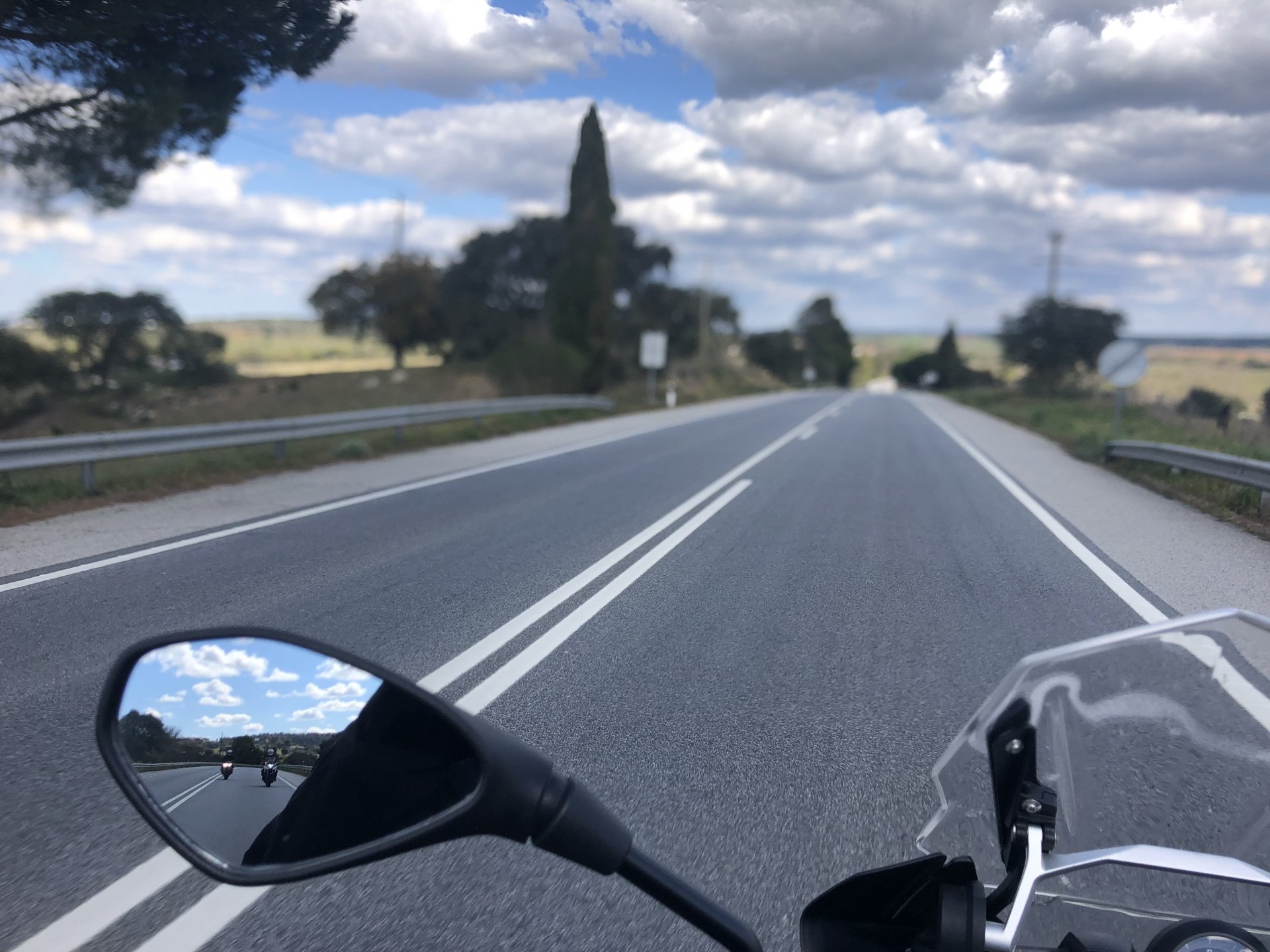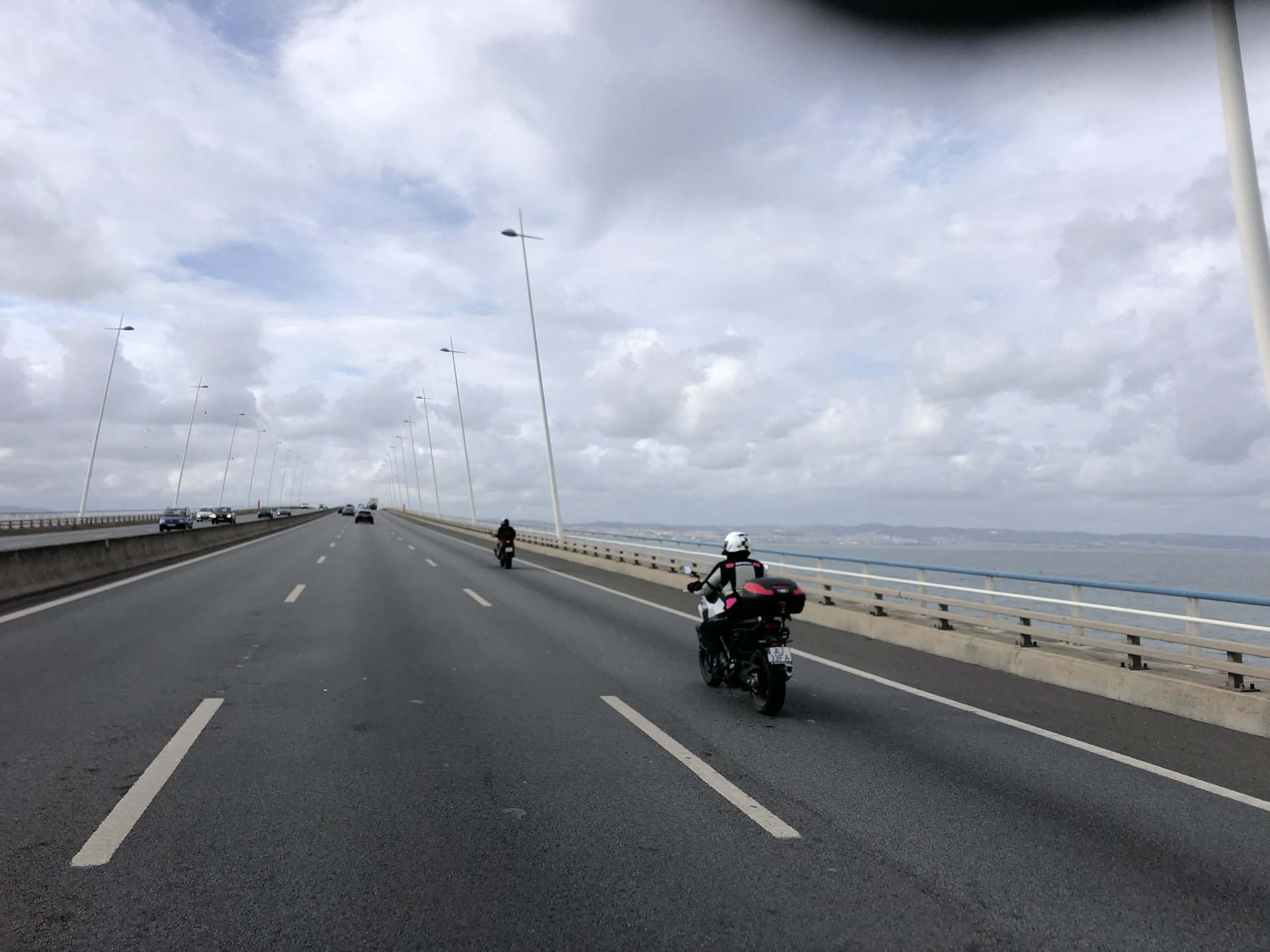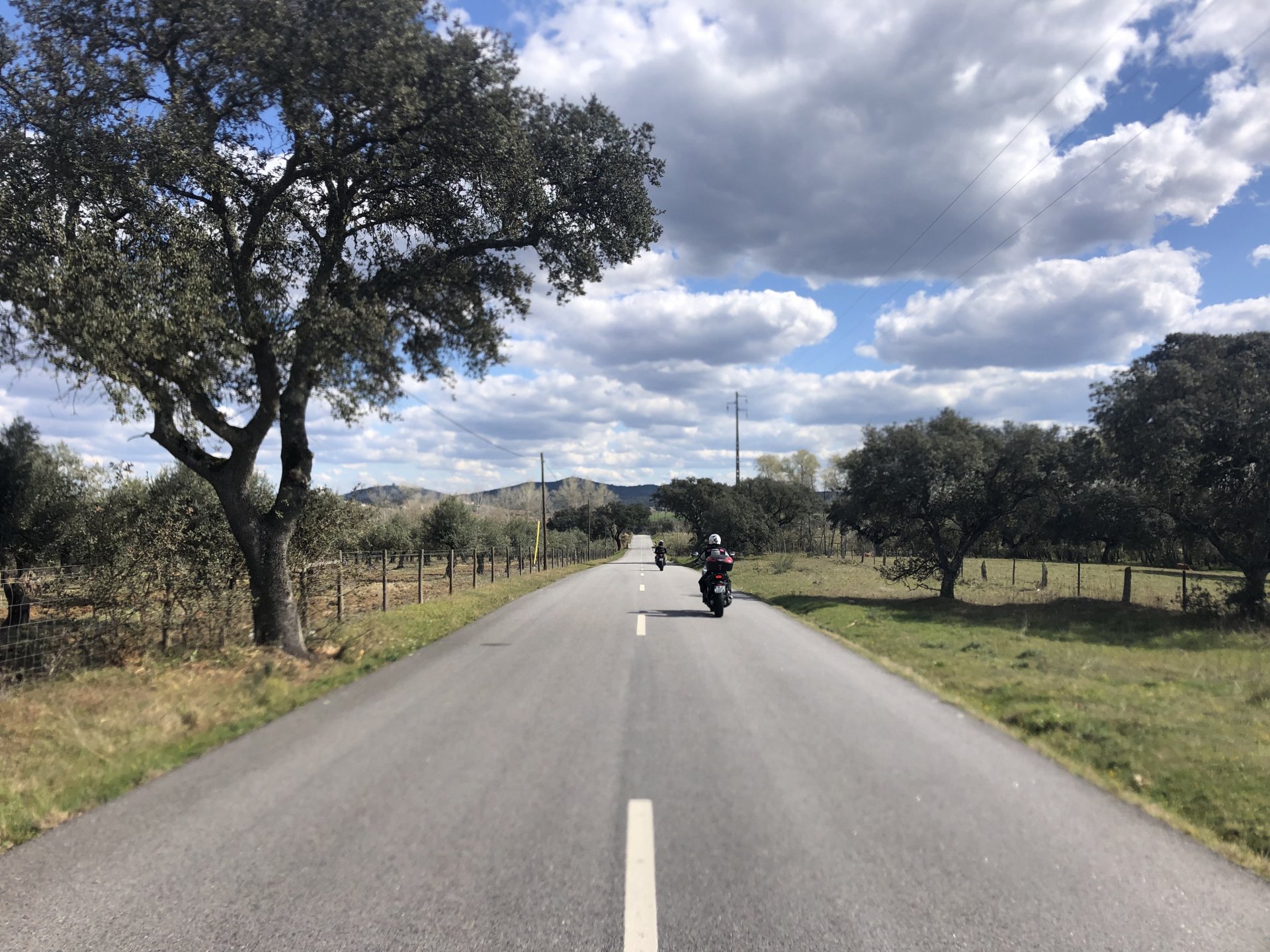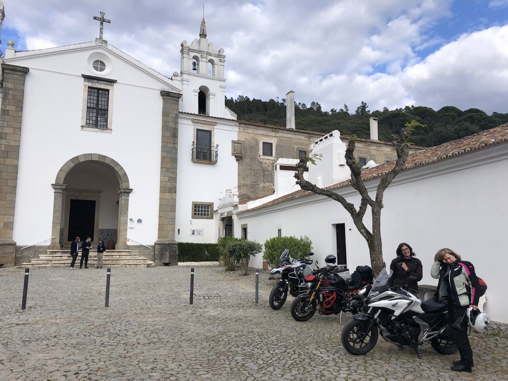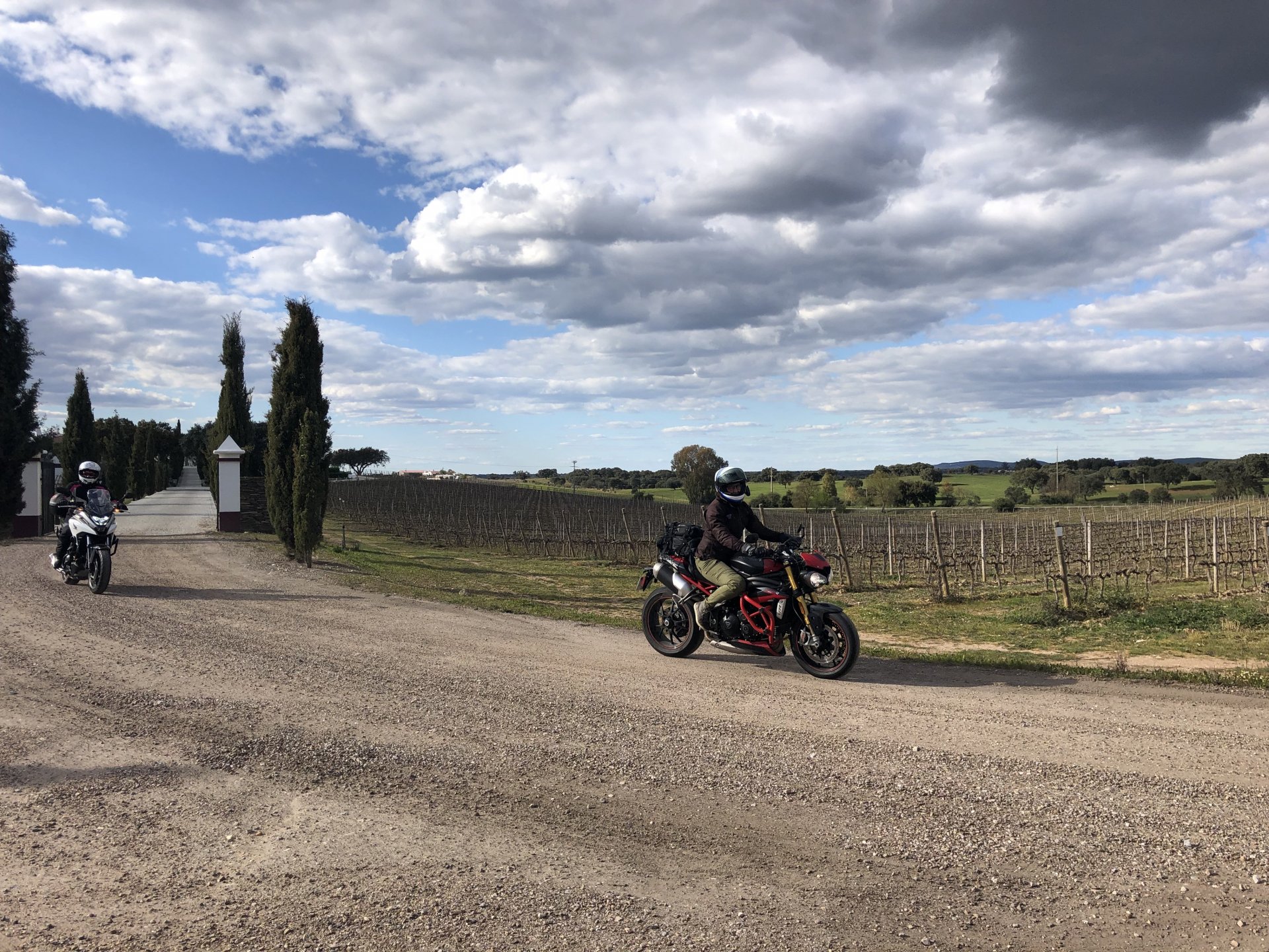 Sofia's very best friend came over from England to visit, and rented a bike for four days to go and see some of Southern Portugal. Sofia was going to take her on a short tour around Alentejo, there was warning of really bad weather, but still I decided to join for one day before going back up for work. Ended up aborting that plan and we spent a nice three days riding around. Screw work and long live motorcycles and good times! On a sunny but cold Sunday morning I set off from my place on my own, stopping for a breakfast expresso on my favourite place, Then rode into Alentejo on nice and empty roads, touring gently and enjoying the place, I had missed these more open spaces We were meeting up an hour's ride ahead, and I had some time to kill while the girls where picking up the rental bike and making their way to the meeting point, so I got off the main road and explored a little Found an amazing dirt road leading up to a small hotel and farm, I got a little excited and the day's top speed was certainly achieved on a straight dusty dirt road, that makes me quite happy These flowing corners made me wish for more aggressive tires, so that I could probably properly throw myself onto a tree playing Malcolm Smith Got to the agreed meeting point, had a snack consisting of a local typical chicken pastry and waited, and waited, and an hour later my company arrived: Barbara, used to Ducatis, quite enjoying the NC750's ease of ride and promptly declaring it the ideal rental bike for touring! I sat on it and think it's too low (as she does), it might have been a little lowered, I have no idea. After their midday snack, we rode off with the two best friends catching up ... on and on, relentlessly ... on the intercoms ... I took us to the castle at Arraiolos, which to me is one of the nicest views in the Alentejo region We then proceeded to Estremoz, our stay for the night, and I amused myself taking pictures of my rear view mirror, most of them out of focus but a couple of usable ones A stop to show Barbara a local winery, where a very small taste was had just before reaching the hotel A nice scenic road and we made it to the convent where we'd stay for the night The next day we had something to sort in Estremoz and that took all morning, which meant we left late. A stop for lunch near the Ducal Palace of Vila Viçosa was not avoided, though Quick stop by a famous dolmen... And then visiting the Castle of Monsaraz, which is nearby to where we'd stop for the day, didn't ride much at all that day but spirits were high: An aperitif was had at sunset while temperatures dropped, the cool fresh air had really opened my apetite. Showered and warm I fetched a little local cheese and wine, all they had in a period where tourists don't really pass here, and it was a result as we settled to see a cold Alentejo sunset before dinner We walked to a nice restaurant, converted from an old olive oil press room, and the food was amazing. I had (and shared) the octopus, it was declared unanimously delicious: The next day started with a cold morning. Stopping by a lookout of the Alqueva lake, here I am pondering my need to have brought proper touring pants as I was expecting lots of rain and cold, but happy for the sun. Quick stop in Mertola and I'm grinning at the prospect of the roads ahead of us. After the road crosses that river behind me in the picture it gets nice and fast, in my opinion you won't find a nicer 200km of tiny roads than what's ahead. Tarmac is dry, tires are good, sun is shining, prospect of being let lose on a nice road before a nice dinner and wines with a few laughs, etc... all that made for a happy Pedro I only stopped a couple of times, I have plenty of pictures of these roads from previous rides so only took a couple to catch the girls passing by. Barbara, being English and clearly used to a less brute civilization was pretty happy with the nice road surface, particularly the road markings (!!!), unlike my other favourite roads which lack these refinements and apparently are like farmers' track to a foreigner. Quick stop for water and deciding where to point our steeds for the night. A decision was made for Beja, trying to be within easy reach of Lisbon for the next early afternoon ... we did enjoy ourselves at dinner and Beja is a charming town to walk around searching for a restaurant. Sofia wanted to show off her favourite old bridge and again ride over something built more than 2000 years ago, so we did. It's still there and probably still will be long after electric motorcycles are finished when we'll all be riding martian plutonium powered bikes, those Romans and their slaves knew how to make a bridge: Here I am, acting as a guide and probably explaining the intricacies of roman ancient history and building bridges with rocks ... A german tourist was leaving just as we were arriving this place, and took our only group picture Couldn´t help but stop to check this out, someone converted an old dolmen and adapted it into the entrance of a chapel, I can't get mad at it although not the best conservationist effort ... Crossing the Ponte Vasco da Gama´s 12km length is a fine way to enter Lisbon, sadly, this meant returning the rental bike thus ending the trip. It had been a fun three days. After Barbara returned the Honda, I gave her a ride to Sofia's and proceeded to cook a nice dinner after going grocery shopping, it was a bit of a flop but out of sympathy and love they declared it a win. A lot of wine was consumed and a lot of reminiscing was done, I was amused with the realization of how small the world is when I spotted Barbara wearing a Luigi Moto jumper, isn't that where you work part time, @boboneleg? Earlier today I made my way north, by myself, and caught the only serious rain in the entire trip on the last 45 minutes before getting home. Here stopping to put winter gloves on in a rare moment of proficient motorcycling.4 points