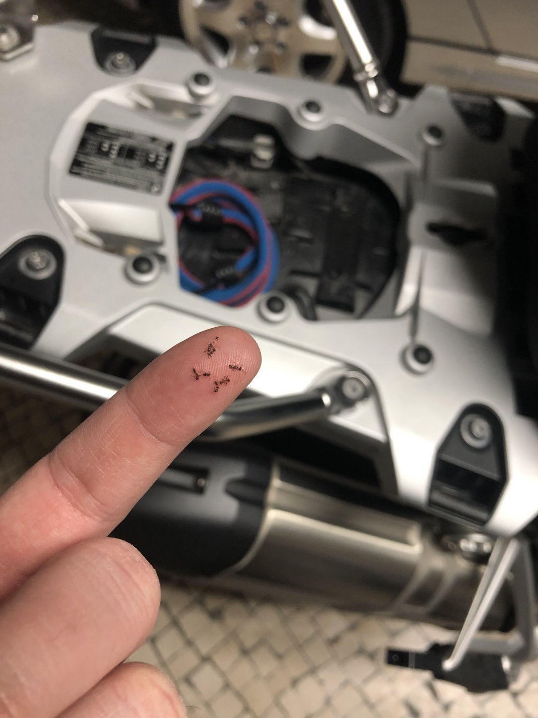 Really, I’ve looked everywhere around the engine and hidden places for a dead bird or something like that, and there’s none, there’s no ants around the bike, but still they keep popping up … What the fuck, is there a hidden ant colony on my bike? Stay tuned… I sprayed ant killer on the center stand, but that might just make them not want to leave1 point