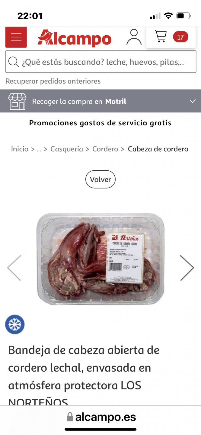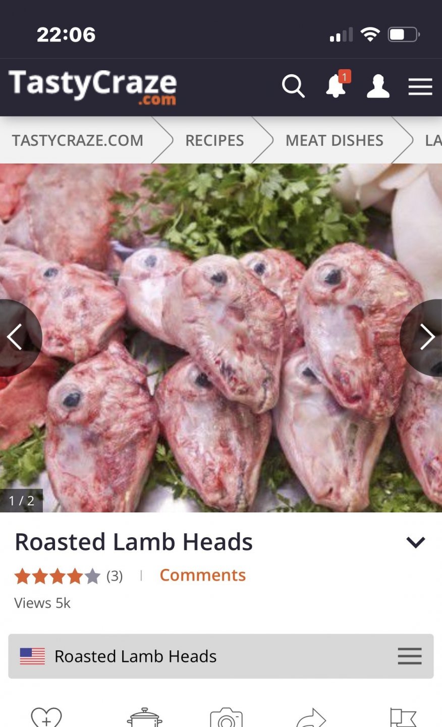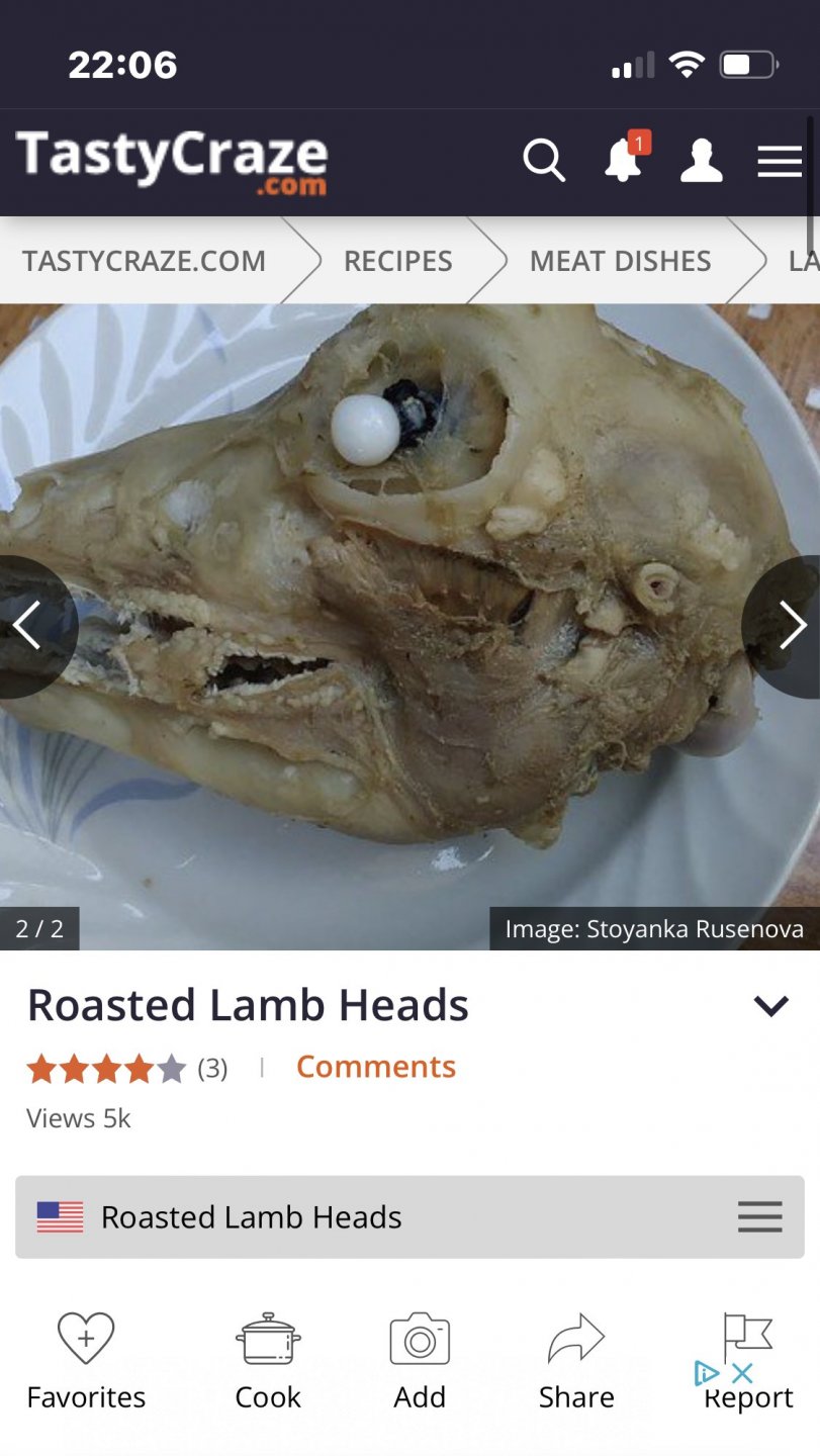 Have a gander at this grossness (content not compatible with vegetarians, vegans or people who think meat grows in vacuum packs in supermarket warehouses). I was preparing a supermarket shop and the Spanish are not squeamish on the food front, which I like (new things to try) but I’ve finally found something I won’t be buying. I’d try it if someone else served it up but yer it’s not for me. It’s suckling lambs head (ie it’s such a baby it’s not weaned and is only drinking it’s mothers milk - or it was You can see the brains hanging out the back. I then googled recipes for lambs head curious about how you’d cook the different textures at the same time squelchy brain, muscle, rubbery tongue, eyeballs and still get a good result. Mistake. The first recipe that springs up is this pic- Followed by this cooked version replete with burst eyeball. Yum yum. It’s cheap though £2.46 so as Petes going to be paying through the nose to keep his daughter in law in a style she does not wish to become accustomed to I thought it would make an excellent welcome dish for her arrival? Just a thought2 points