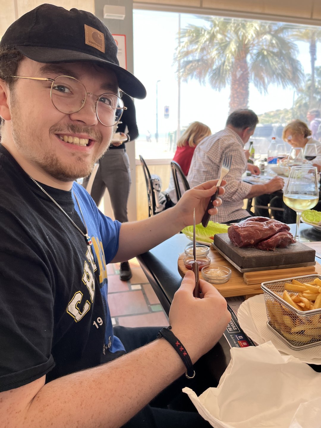 Yer its wall to wall sunshine and 21 degrees so a terrible bind but I’ll endure Had the best steak I’ve ever had today in a German steakhouse (run by Spanish folk) in an unlikely looking spot that’s only a five minute walk from my place. I could well start mooing by the time I get back home. Yes that’s left open for cow jokes, you’re welcome Of course both of my sons ordered the half a kilo fillet steak each but once you’ve said you can order anything you want you can’t really backtrack Superb wine, food, sea, sunshine and company. Great service too. Might have another drink to celebrate1 point