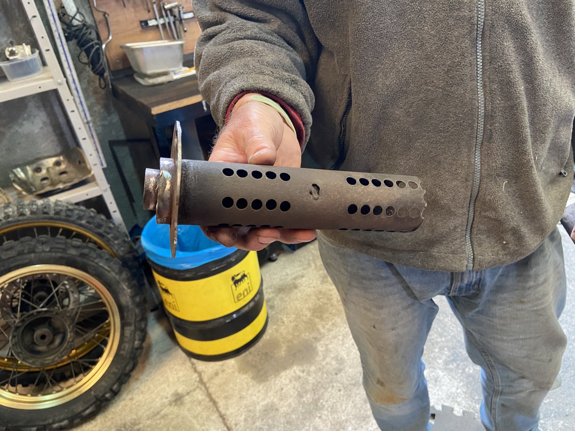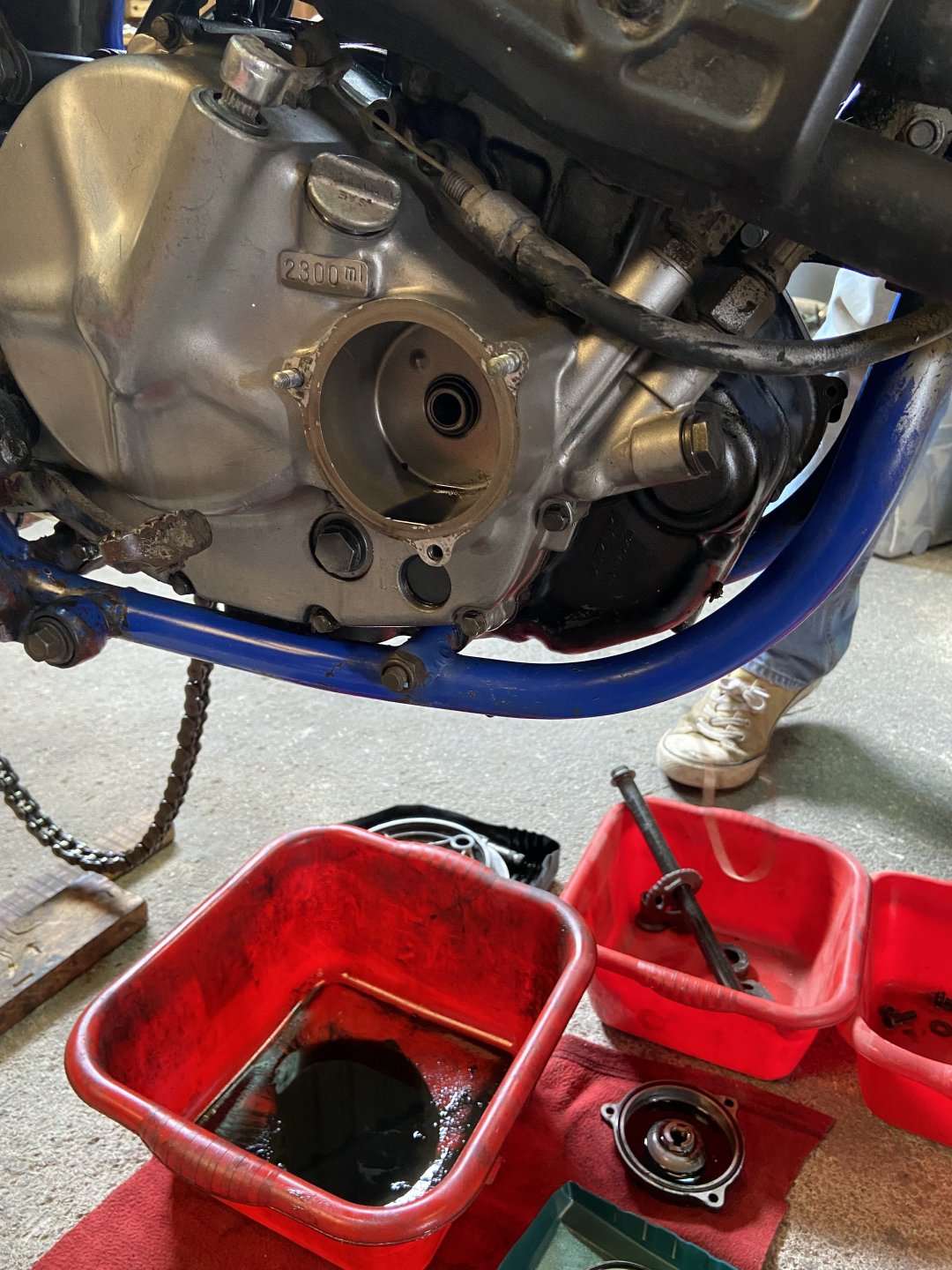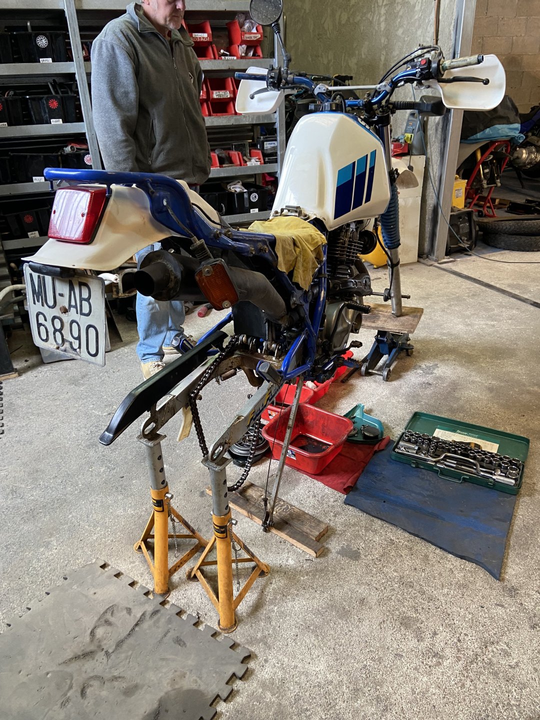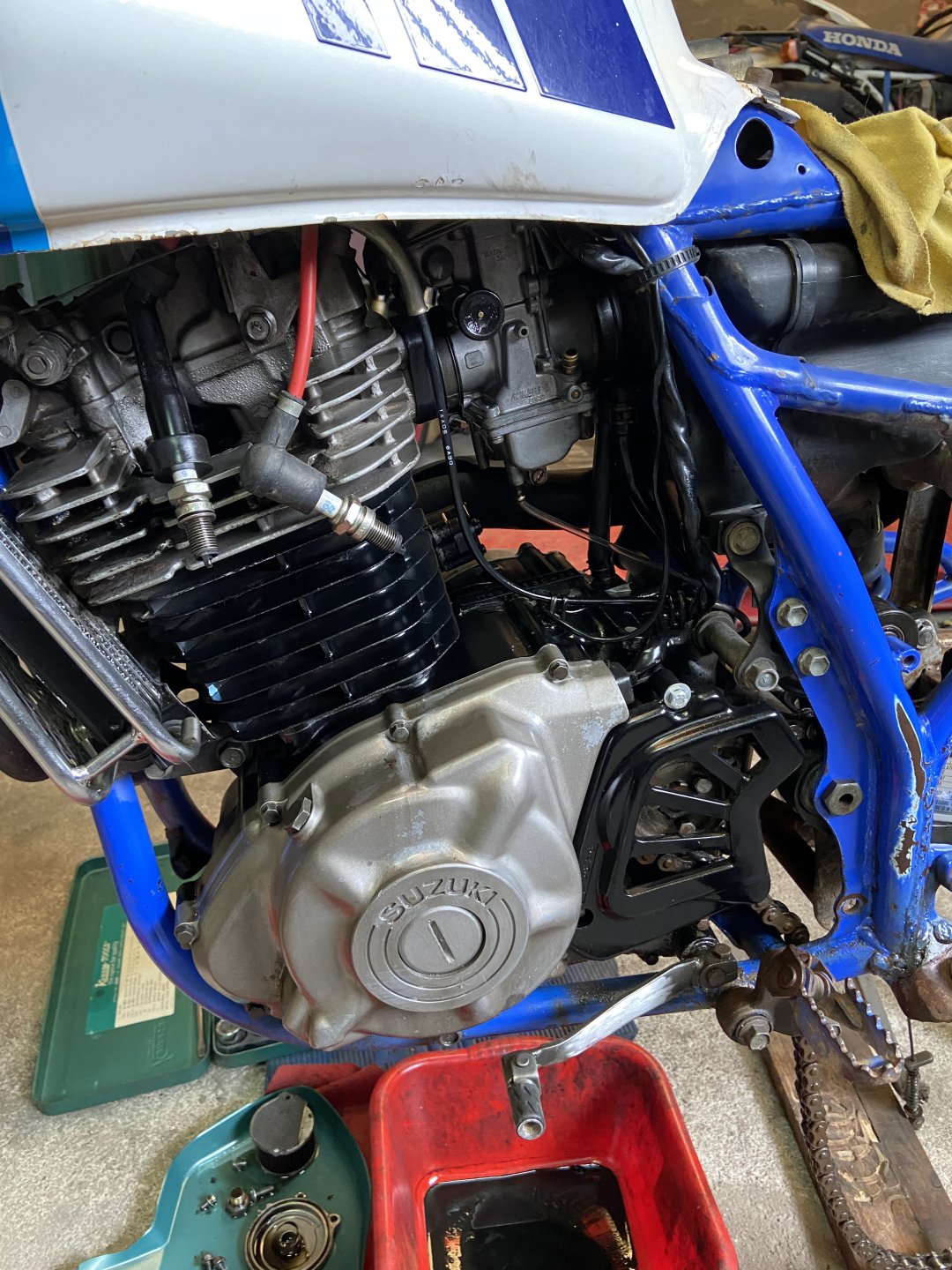 Now, it may not look like it but progress has been made on the DR…….firstly, there’s a big box of bits turned up containing everything from the essentials such as wheel bearings and calliper rebuild bits and bobs to the less essential but bling driven film-flam such blue grips and anodised blue in-line fuel filters. You can’t have enough bling. Wheels out, fluids drained, degreased, seat ready for recovering, baffle being fashioned from an arbitrary item and just propped up awaiting a few more bits which need to be ordered e.g. the third wheel bearing for the rear wheel as I stupidly thought there was only two………….mechanically-challenged me. It ain’t ever going to be pretty but it will start, go and stop properly and that’s good enough for me………which reminds me of a girl I once knew. I know you’ll all sleep better knowing progress is being made.5 points