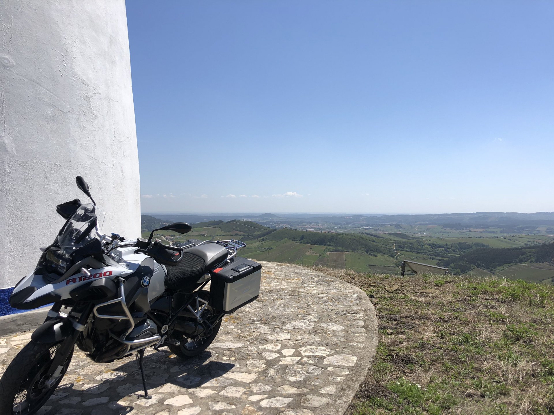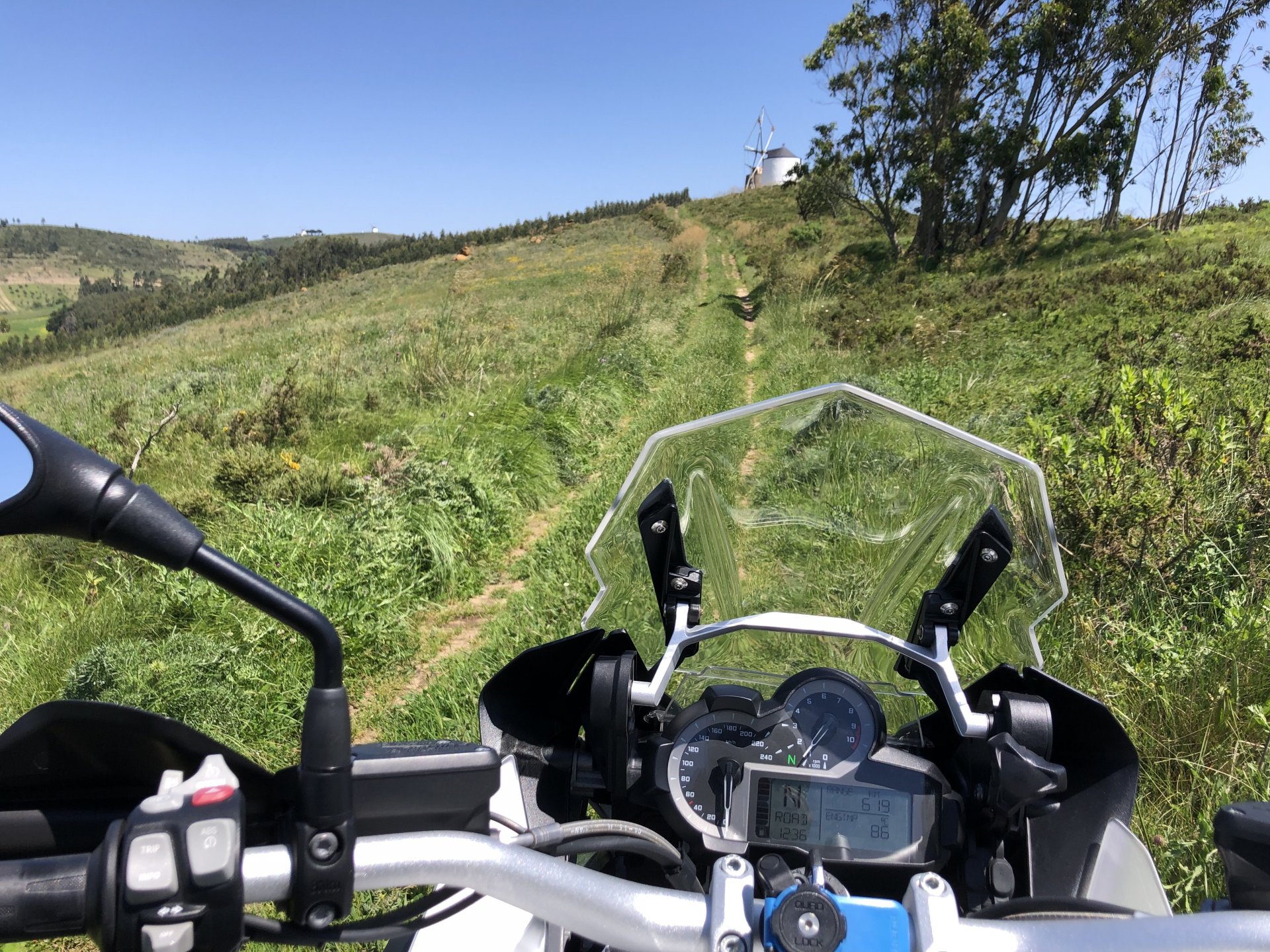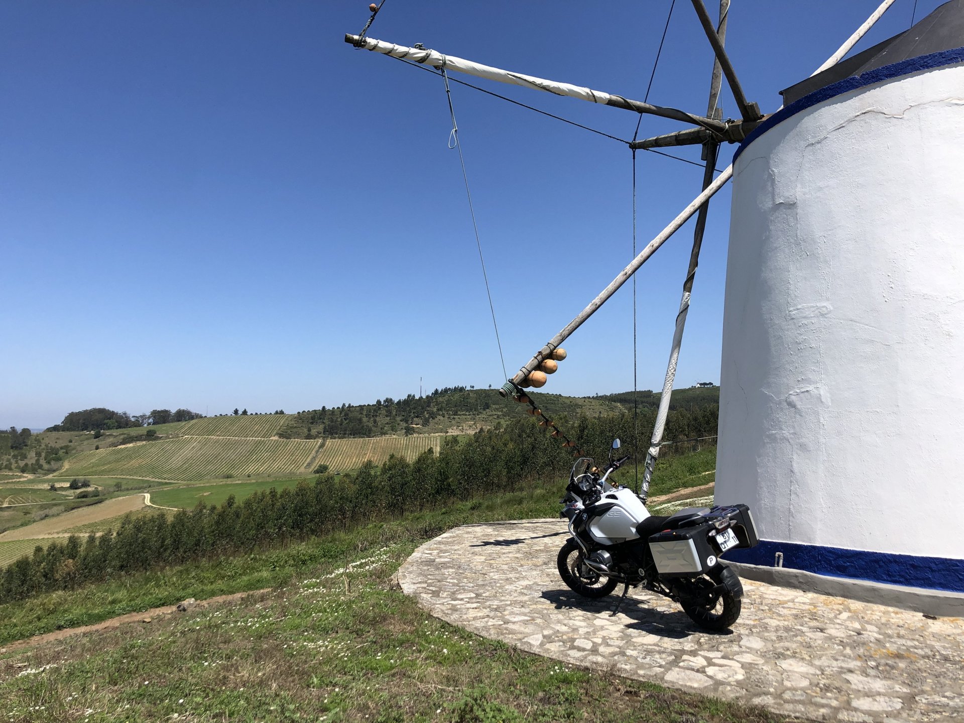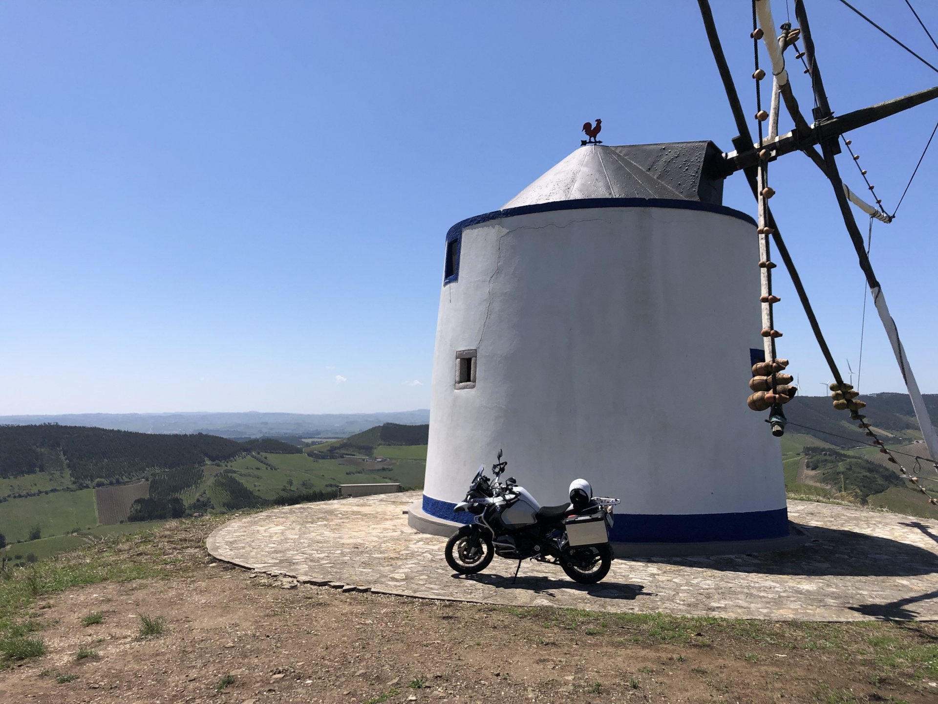Rode from beautiful and cool seaside Ericeira to my home today, where it's hot and summery. The plan was to ride straight over since I have work to do, but in the middle of it got distracted by a short dirt road near the Montejunto area and went to see some more windmills. Had a bit of a moment going uphill in a narrow rocky dirt road where things got a little too uphill and bumpy for my taste, front wheel briefly in the air in first gear had me wondering about how smart it was doing that in a fully fueled 30 liter GS with luggage on , so I stopped for a breather. As is the norm, looking at the picture of the way in it looks like you can drive a Ferrari up there ... 619km on the range indicator: My home somewhere in the distance there, behind the bike: A km or so after and got back to tarmac, in all it was only about 3 or 4 km offroad but were quite interesting. Temperatures increased as I got over the hills going inland and suddenly it's 28º Stopped by the supermarket for fruit and improvised a topcase Got home and made sure my peaches are doing well in the sunshine: And so are the almonds: And that the little birds have finished furnishing their home for this year and have hatched already, you can't really see them though:2 points