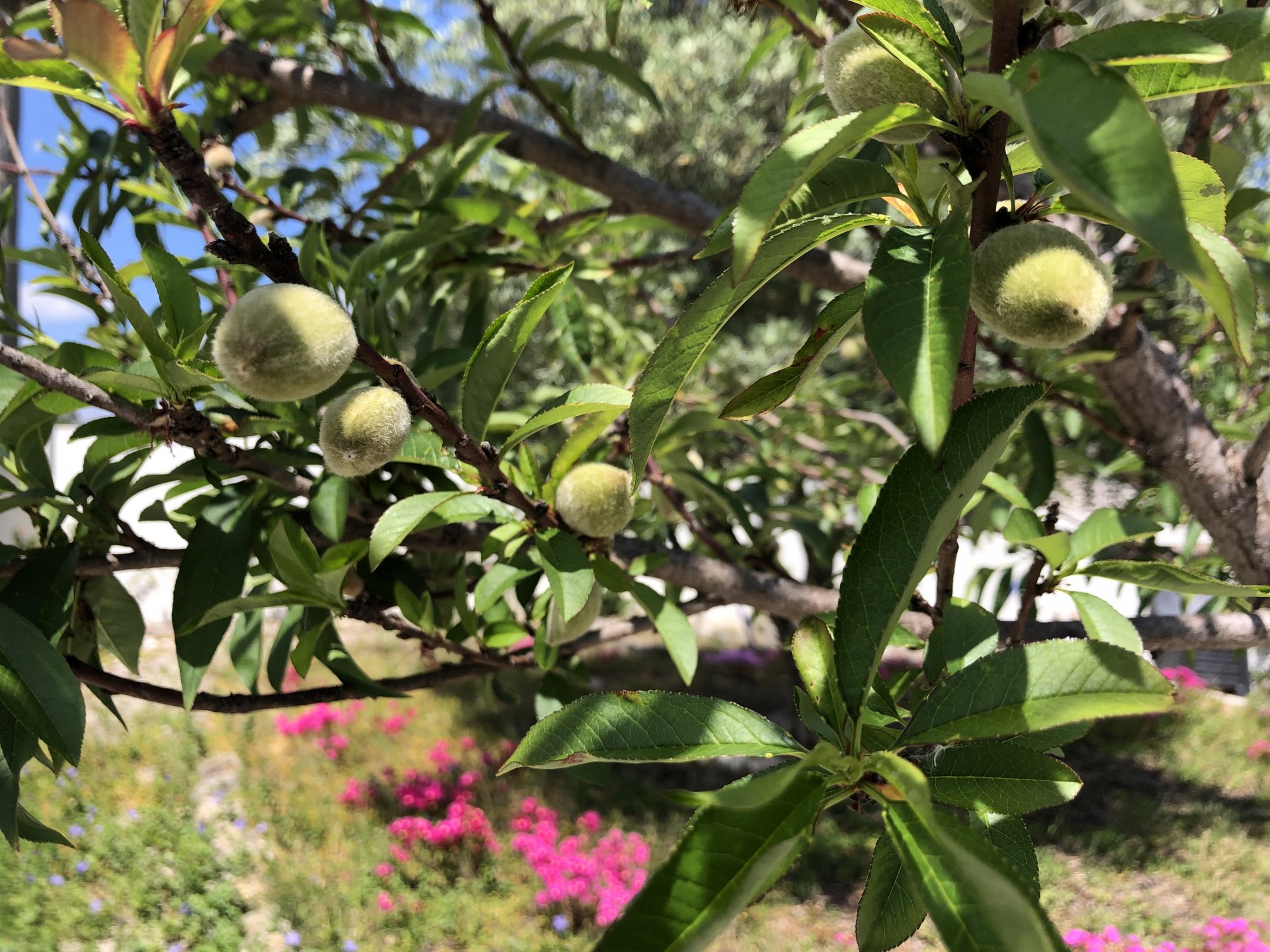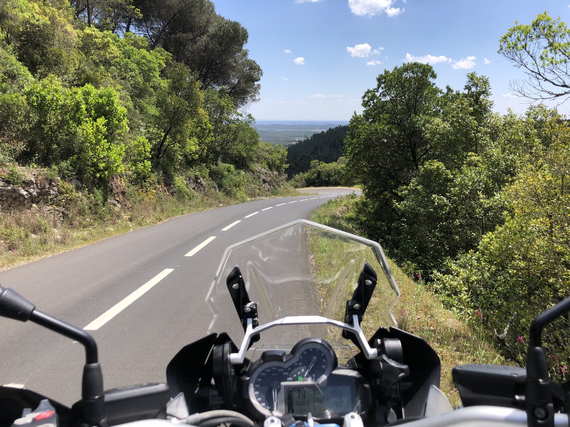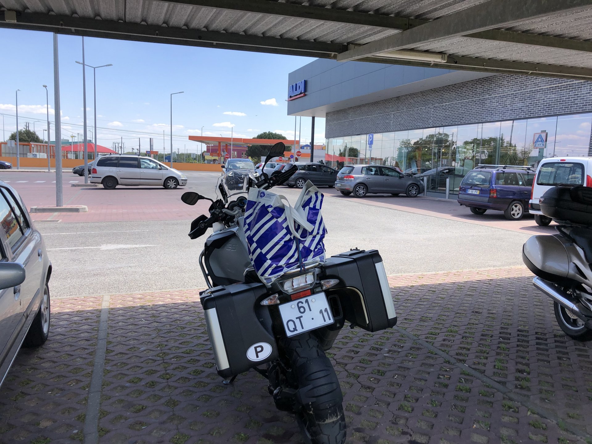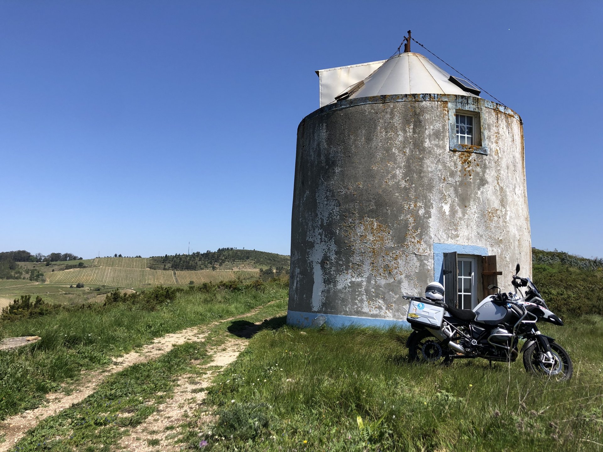 Rode from beautiful and cool seaside Ericeira to my home today, where it's hot and summery. The plan was to ride straight over since I have work to do, but in the middle of it got distracted by a short dirt road near the Montejunto area and went to see some more windmills. Had a bit of a moment going uphill in a narrow rocky dirt road where things got a little too uphill and bumpy for my taste, front wheel briefly in the air in first gear had me wondering about how smart it was doing that in a fully fueled 30 liter GS with luggage on , so I stopped for a breather. As is the norm, looking at the picture of the way in it looks like you can drive a Ferrari up there ... 619km on the range indicator: My home somewhere in the distance there, behind the bike: A km or so after and got back to tarmac, in all it was only about 3 or 4 km offroad but were quite interesting. Temperatures increased as I got over the hills going inland and suddenly it's 28º Stopped by the supermarket for fruit and improvised a topcase Got home and made sure my peaches are doing well in the sunshine: And so are the almonds: And that the little birds have finished furnishing their home for this year and have hatched already, you can't really see them though:2 points