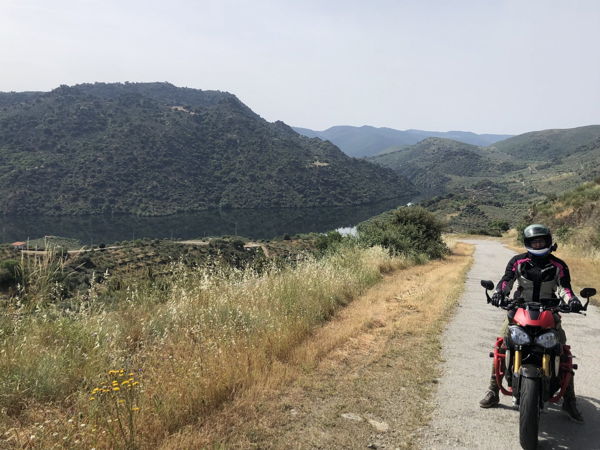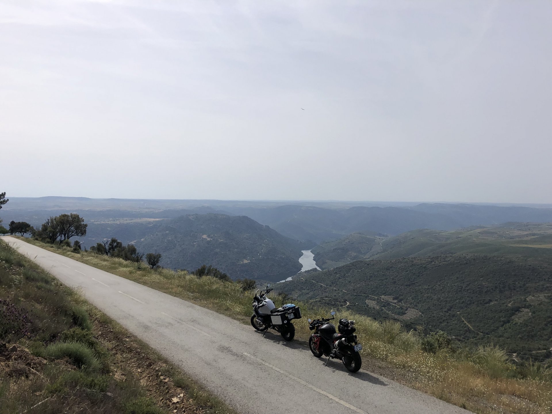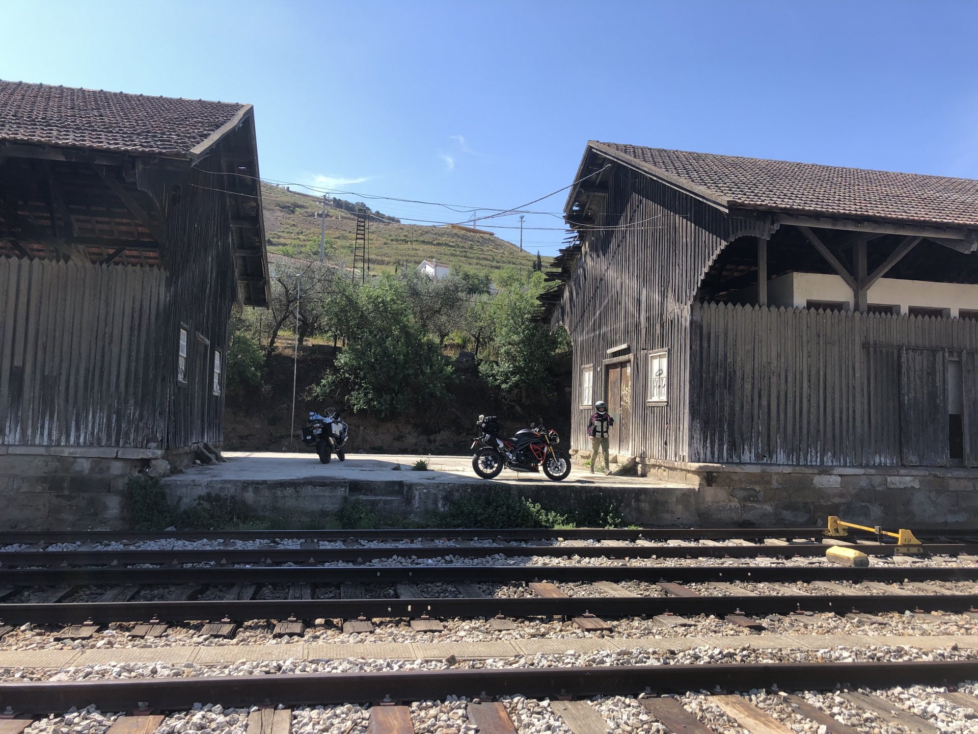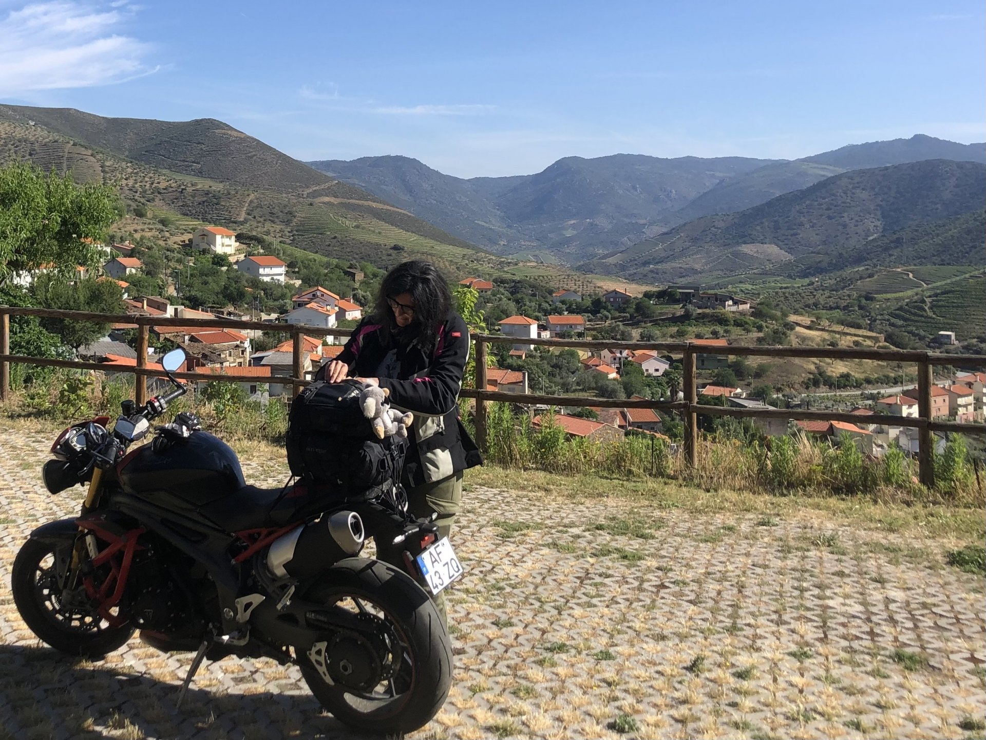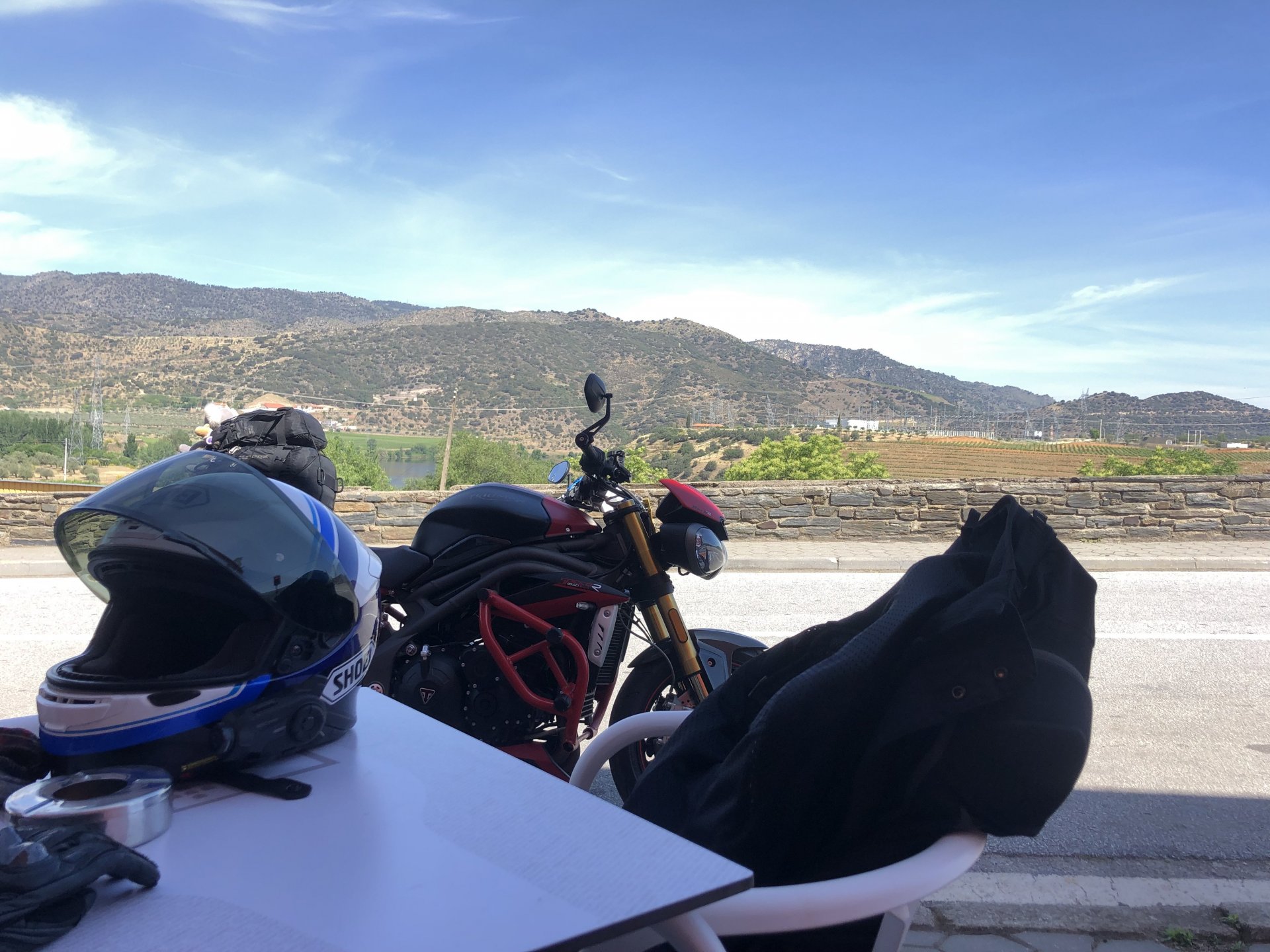 Waking up in Murça felt great, breakfast wasn't until 9AM so had plenty of time to get the stuff packed and cases on the bike like I like to do. Here is a little short clip of our balcony at 09:20, just before setting off, proper countryside soundtrack: Quick set off on the little N324 and we reached Mós quite quick, it's only a handful of kms till we saw the first viewpoint of the day at one of the many Saint Barbara Chapels, it was on top of a dirt road so instead of punishing the Speed Triple Sofia opted to ride on the back of my bike up there. Considering the terrain, it proved to be the right choice, too. The view from the top: A bush or tree growing on a split rock, I love stuff like this. We took our time there, I had an incredibly scenic piss and we carried on, took the M614 and shortly after we reached Pocinho. There was need for an expresso so the plan was to stop, but I got enchanted by the old train station and we took some pictures. The train still works using a more modern small building, but these two big wooden warehouses were from a time long gone when this region used to send most of its produce by train to Porto, mostly grapes and wine. They made for an interesting 20 minutes looking around Lots of flowers everywhere, you got to love the Douro! : So we stopped for a coffee with a view to the train station Half way through my cold water, I heard a diesel engine running on the line and ran over the street for a quick video, just for Pete, the train spotter: After Pocinho, I got on one of my favourite stretches of road, basically you go on a map and find find Poucinho or Vila Nova de Foz Coa, and get on the road following the river inwards into the general direction of Freixo de Espada à Cinta. We rode for a few kms before another stop, Sofia started getting a surge of calls and decided to stop in the shade to answer them. I kept myself occupied with taking a few pictures of a small High Douro village, "Peredo dos Castelhanos": Below, typical village scene, a 50kg Serra da Estrela shepherd dog comes home for lunch after giving me a friendly but still intimidating sideways look: And again we rode on, we didn't stop much for pictures of the road since Sofia was having such fun and I had already documented it in a previous trip, we rode to Freixo de Espada à Cinta, heading straight to Penedo Durão viewpoint for a snack. Penedo Durão is my favourite view in the whole of Portugal except for Sagres, there's a 900 meter drop to the river, with the spanish altiplano on the other side. Spain clearly the least favoured side of the river, as in other things.... We had a nice leftover bbq sandwich while looking at the Vultures and the Griffons and the hawks, I can spend hours there: A black vulture can go almost to 2,5 meters wing span, you can see it in the crappy iPhone picture below, just open it in your browser and zoom a little, it's an awe inspiring sight: As far as picnic locations go, it's hard to beat: I got soft, after a light lunch I started looking at the vultures and other birds, it was a surprise heat wave and approaching 36 or 37º. We stopped at Freixo de Espada à Cinta (Ash with a Sword tied to the Waist, LOL) for Speed Triple fuel, these inferior bikes have to fuel up everyday while mine is like a camel and can hold fuel for over a day's riding, anyways... as Sofia was fueling up her bike I moaned about it being hot and feeling like a stop in our friend Manuela's Inn for a dip in the pool and a nice dinner. It didn't take much convincing and I called in, after 5 minutes we were stopped for the day, bikes parked in the shade and me beelining to the pool: Is this hardcore motorcycling? No! Is this serious motorcycling? No! We did about 65 or 75 km that day, if that! It was properly enjoying the day! Before dinner and after a cold bottle of water and some nice orange juice and a nice soaking in the pool overlooking the Douro, we had a shower and I convinced myself it would be good to go for a walk to build up an apetite. I regretted as it's a hilly area and it was properly hot, regardless, here's a couple of pictures from our walk in Freixo de Espada à Cinta... We came back early, downed a bottle of cold water, and then had a bottle of Manuela's own production white wine, which is amazing, alongwith a nice dinner: It was a very short distance ridden that day, but high enjoyment and content. The next day would see more distance and more "Portugal", will post that tomorrow, maybe...1 point