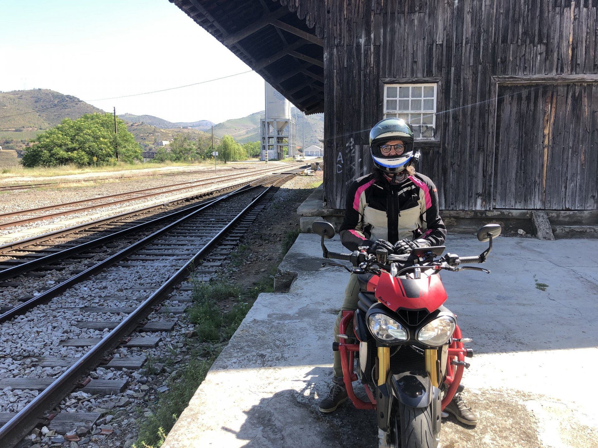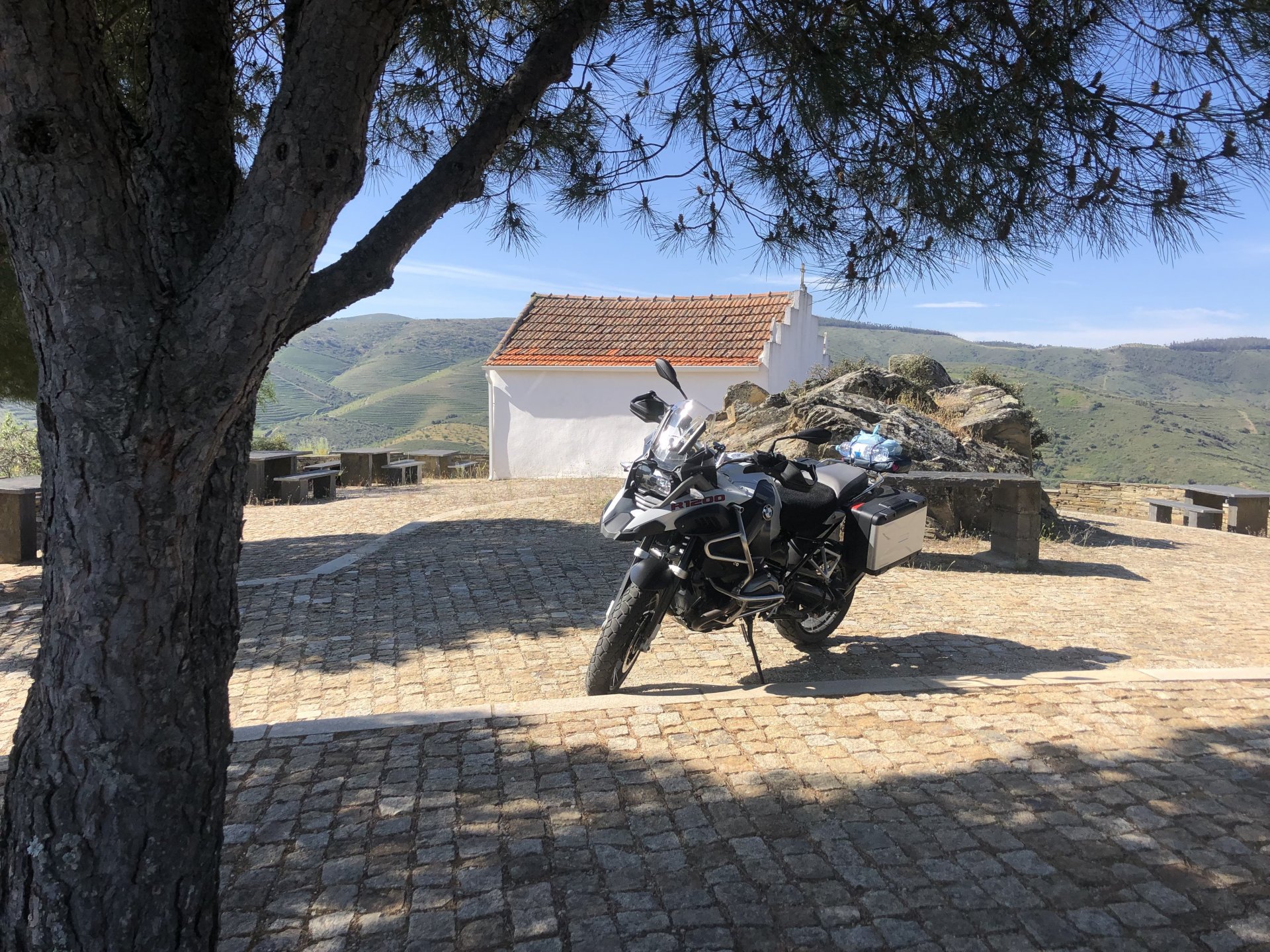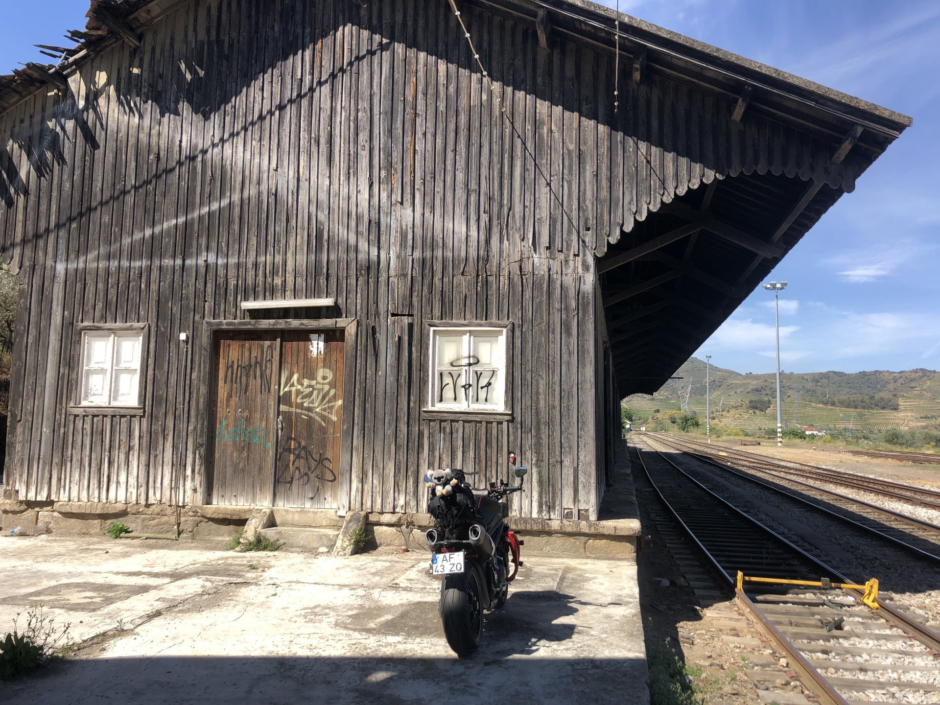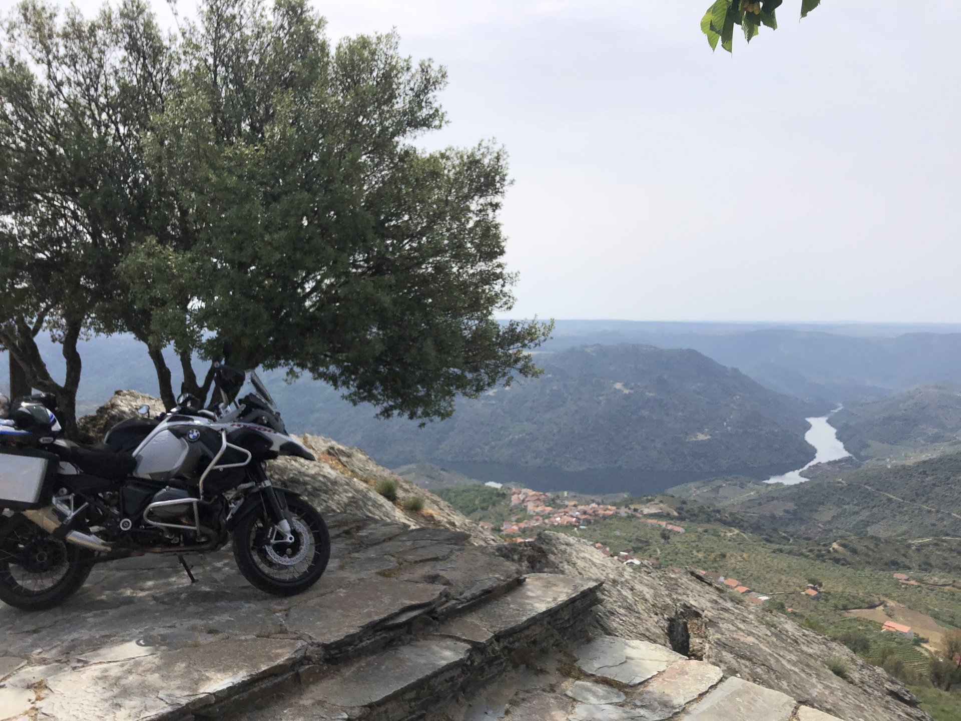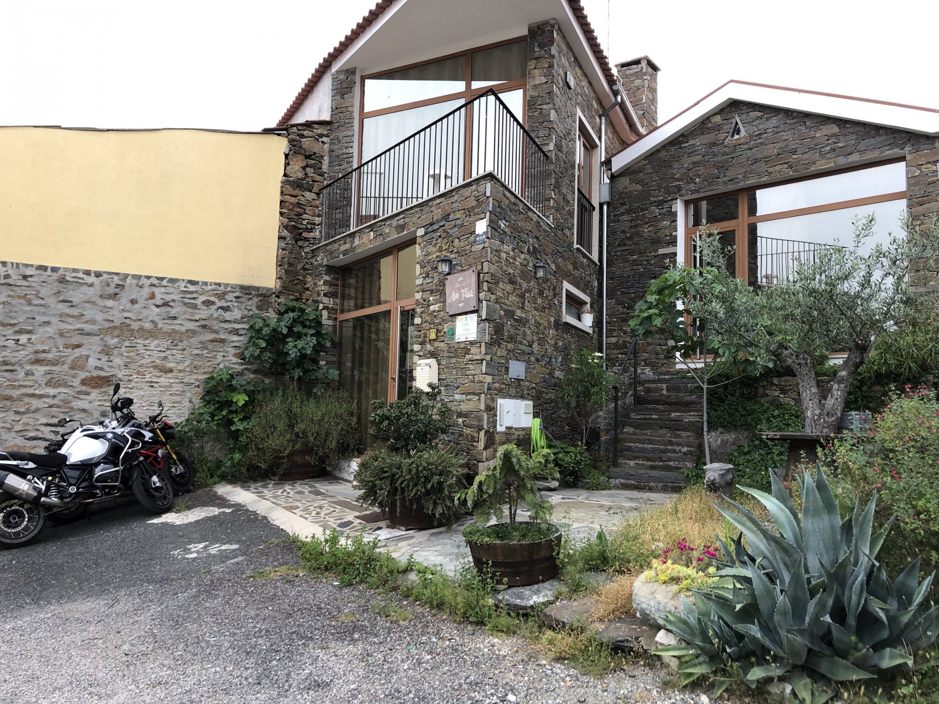 Waking up in Murça felt great, breakfast wasn't until 9AM so had plenty of time to get the stuff packed and cases on the bike like I like to do. Here is a little short clip of our balcony at 09:20, just before setting off, proper countryside soundtrack: Quick set off on the little N324 and we reached Mós quite quick, it's only a handful of kms till we saw the first viewpoint of the day at one of the many Saint Barbara Chapels, it was on top of a dirt road so instead of punishing the Speed Triple Sofia opted to ride on the back of my bike up there. Considering the terrain, it proved to be the right choice, too. The view from the top: A bush or tree growing on a split rock, I love stuff like this. We took our time there, I had an incredibly scenic piss and we carried on, took the M614 and shortly after we reached Pocinho. There was need for an expresso so the plan was to stop, but I got enchanted by the old train station and we took some pictures. The train still works using a more modern small building, but these two big wooden warehouses were from a time long gone when this region used to send most of its produce by train to Porto, mostly grapes and wine. They made for an interesting 20 minutes looking around Lots of flowers everywhere, you got to love the Douro! : So we stopped for a coffee with a view to the train station Half way through my cold water, I heard a diesel engine running on the line and ran over the street for a quick video, just for Pete, the train spotter: After Pocinho, I got on one of my favourite stretches of road, basically you go on a map and find find Poucinho or Vila Nova de Foz Coa, and get on the road following the river inwards into the general direction of Freixo de Espada à Cinta. We rode for a few kms before another stop, Sofia started getting a surge of calls and decided to stop in the shade to answer them. I kept myself occupied with taking a few pictures of a small High Douro village, "Peredo dos Castelhanos": Below, typical village scene, a 50kg Serra da Estrela shepherd dog comes home for lunch after giving me a friendly but still intimidating sideways look: And again we rode on, we didn't stop much for pictures of the road since Sofia was having such fun and I had already documented it in a previous trip, we rode to Freixo de Espada à Cinta, heading straight to Penedo Durão viewpoint for a snack. Penedo Durão is my favourite view in the whole of Portugal except for Sagres, there's a 900 meter drop to the river, with the spanish altiplano on the other side. Spain clearly the least favoured side of the river, as in other things.... We had a nice leftover bbq sandwich while looking at the Vultures and the Griffons and the hawks, I can spend hours there: A black vulture can go almost to 2,5 meters wing span, you can see it in the crappy iPhone picture below, just open it in your browser and zoom a little, it's an awe inspiring sight: As far as picnic locations go, it's hard to beat: I got soft, after a light lunch I started looking at the vultures and other birds, it was a surprise heat wave and approaching 36 or 37º. We stopped at Freixo de Espada à Cinta (Ash with a Sword tied to the Waist, LOL) for Speed Triple fuel, these inferior bikes have to fuel up everyday while mine is like a camel and can hold fuel for over a day's riding, anyways... as Sofia was fueling up her bike I moaned about it being hot and feeling like a stop in our friend Manuela's Inn for a dip in the pool and a nice dinner. It didn't take much convincing and I called in, after 5 minutes we were stopped for the day, bikes parked in the shade and me beelining to the pool: Is this hardcore motorcycling? No! Is this serious motorcycling? No! We did about 65 or 75 km that day, if that! It was properly enjoying the day! Before dinner and after a cold bottle of water and some nice orange juice and a nice soaking in the pool overlooking the Douro, we had a shower and I convinced myself it would be good to go for a walk to build up an apetite. I regretted as it's a hilly area and it was properly hot, regardless, here's a couple of pictures from our walk in Freixo de Espada à Cinta... We came back early, downed a bottle of cold water, and then had a bottle of Manuela's own production white wine, which is amazing, alongwith a nice dinner: It was a very short distance ridden that day, but high enjoyment and content. The next day would see more distance and more "Portugal", will post that tomorrow, maybe...1 point