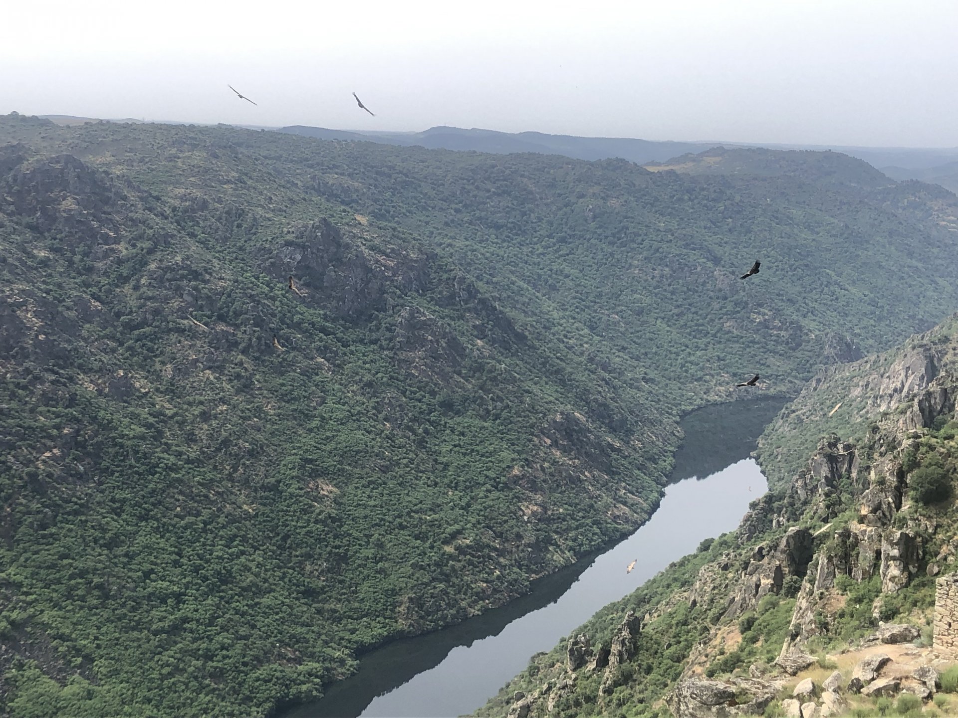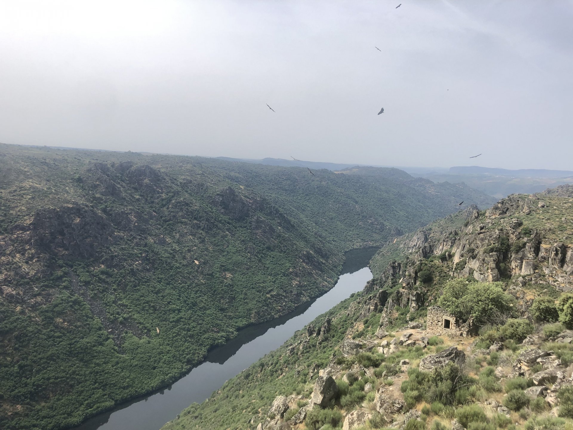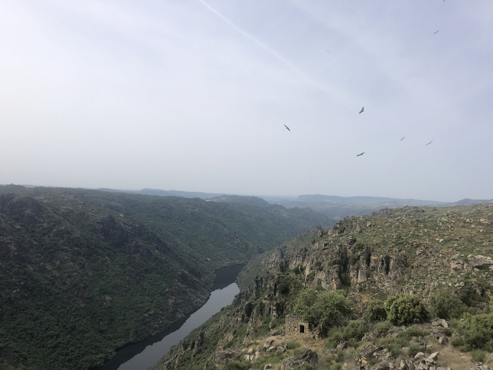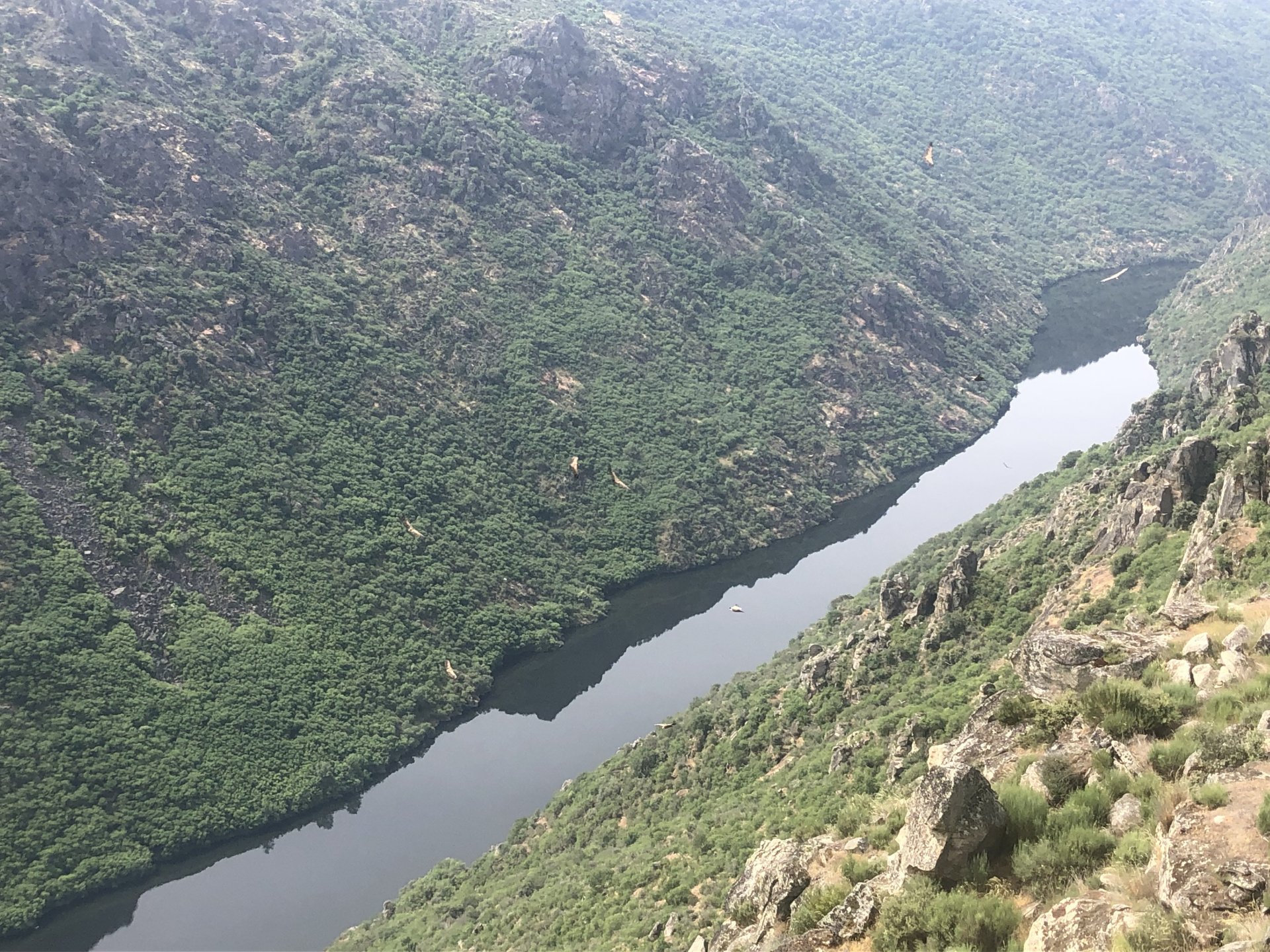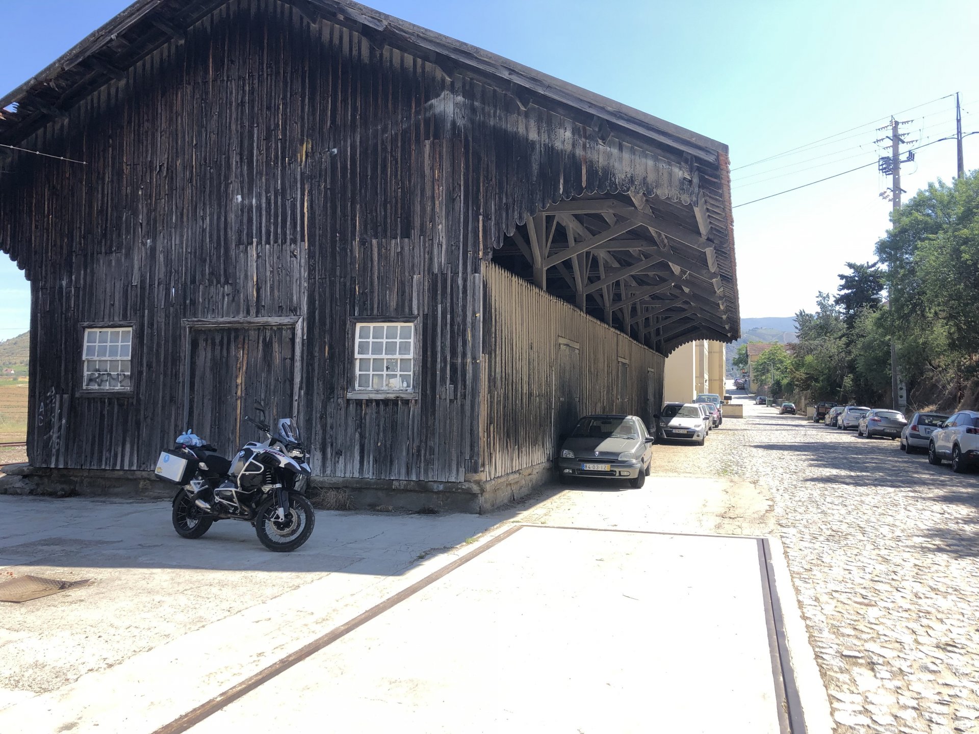 Waking up in Murça felt great, breakfast wasn't until 9AM so had plenty of time to get the stuff packed and cases on the bike like I like to do. Here is a little short clip of our balcony at 09:20, just before setting off, proper countryside soundtrack: Quick set off on the little N324 and we reached Mós quite quick, it's only a handful of kms till we saw the first viewpoint of the day at one of the many Saint Barbara Chapels, it was on top of a dirt road so instead of punishing the Speed Triple Sofia opted to ride on the back of my bike up there. Considering the terrain, it proved to be the right choice, too. The view from the top: A bush or tree growing on a split rock, I love stuff like this. We took our time there, I had an incredibly scenic piss and we carried on, took the M614 and shortly after we reached Pocinho. There was need for an expresso so the plan was to stop, but I got enchanted by the old train station and we took some pictures. The train still works using a more modern small building, but these two big wooden warehouses were from a time long gone when this region used to send most of its produce by train to Porto, mostly grapes and wine. They made for an interesting 20 minutes looking around Lots of flowers everywhere, you got to love the Douro! : So we stopped for a coffee with a view to the train station Half way through my cold water, I heard a diesel engine running on the line and ran over the street for a quick video, just for Pete, the train spotter: After Pocinho, I got on one of my favourite stretches of road, basically you go on a map and find find Poucinho or Vila Nova de Foz Coa, and get on the road following the river inwards into the general direction of Freixo de Espada à Cinta. We rode for a few kms before another stop, Sofia started getting a surge of calls and decided to stop in the shade to answer them. I kept myself occupied with taking a few pictures of a small High Douro village, "Peredo dos Castelhanos": Below, typical village scene, a 50kg Serra da Estrela shepherd dog comes home for lunch after giving me a friendly but still intimidating sideways look: And again we rode on, we didn't stop much for pictures of the road since Sofia was having such fun and I had already documented it in a previous trip, we rode to Freixo de Espada à Cinta, heading straight to Penedo Durão viewpoint for a snack. Penedo Durão is my favourite view in the whole of Portugal except for Sagres, there's a 900 meter drop to the river, with the spanish altiplano on the other side. Spain clearly the least favoured side of the river, as in other things.... We had a nice leftover bbq sandwich while looking at the Vultures and the Griffons and the hawks, I can spend hours there: A black vulture can go almost to 2,5 meters wing span, you can see it in the crappy iPhone picture below, just open it in your browser and zoom a little, it's an awe inspiring sight: As far as picnic locations go, it's hard to beat: I got soft, after a light lunch I started looking at the vultures and other birds, it was a surprise heat wave and approaching 36 or 37º. We stopped at Freixo de Espada à Cinta (Ash with a Sword tied to the Waist, LOL) for Speed Triple fuel, these inferior bikes have to fuel up everyday while mine is like a camel and can hold fuel for over a day's riding, anyways... as Sofia was fueling up her bike I moaned about it being hot and feeling like a stop in our friend Manuela's Inn for a dip in the pool and a nice dinner. It didn't take much convincing and I called in, after 5 minutes we were stopped for the day, bikes parked in the shade and me beelining to the pool: Is this hardcore motorcycling? No! Is this serious motorcycling? No! We did about 65 or 75 km that day, if that! It was properly enjoying the day! Before dinner and after a cold bottle of water and some nice orange juice and a nice soaking in the pool overlooking the Douro, we had a shower and I convinced myself it would be good to go for a walk to build up an apetite. I regretted as it's a hilly area and it was properly hot, regardless, here's a couple of pictures from our walk in Freixo de Espada à Cinta... We came back early, downed a bottle of cold water, and then had a bottle of Manuela's own production white wine, which is amazing, alongwith a nice dinner: It was a very short distance ridden that day, but high enjoyment and content. The next day would see more distance and more "Portugal", will post that tomorrow, maybe...1 point