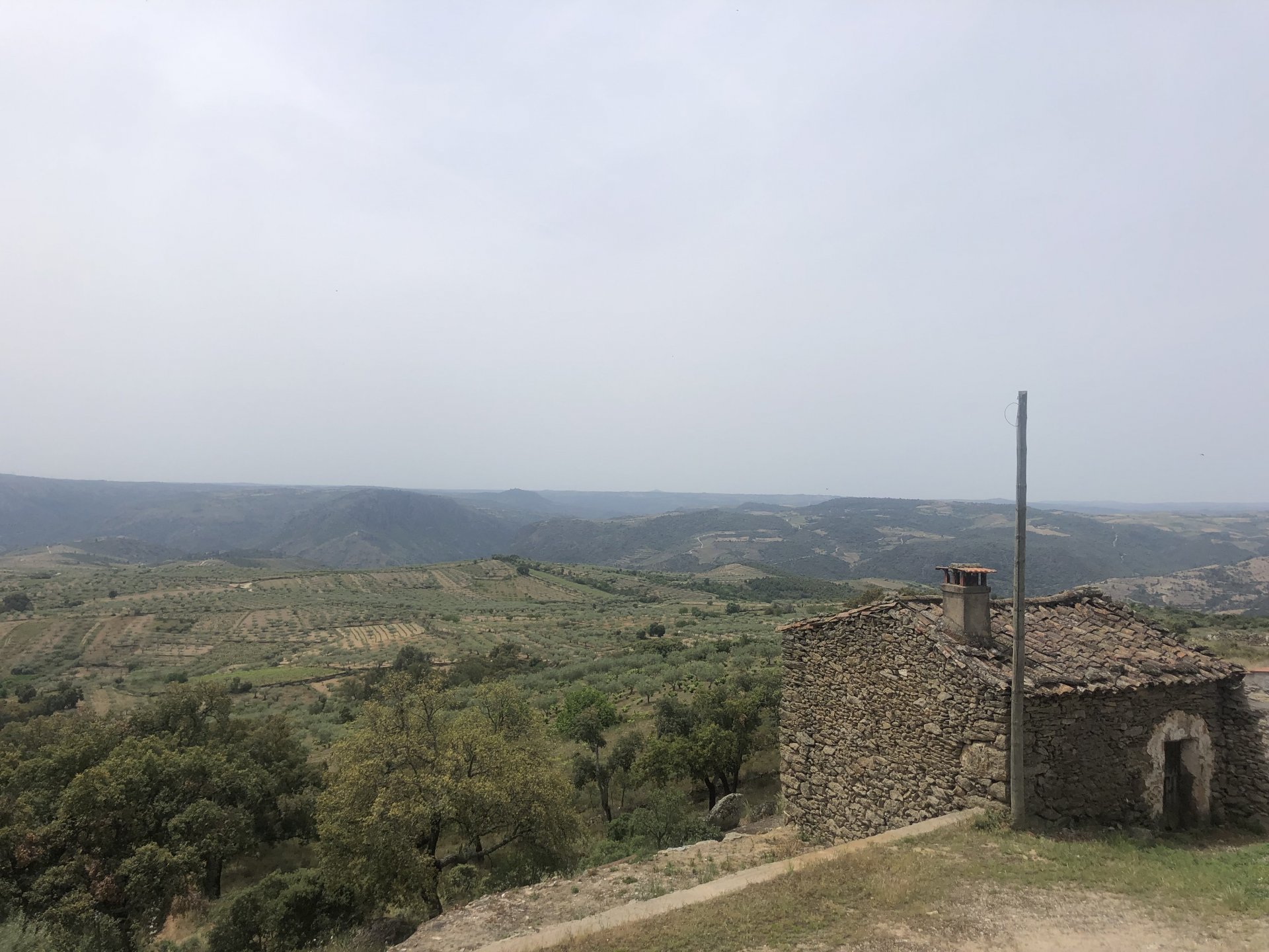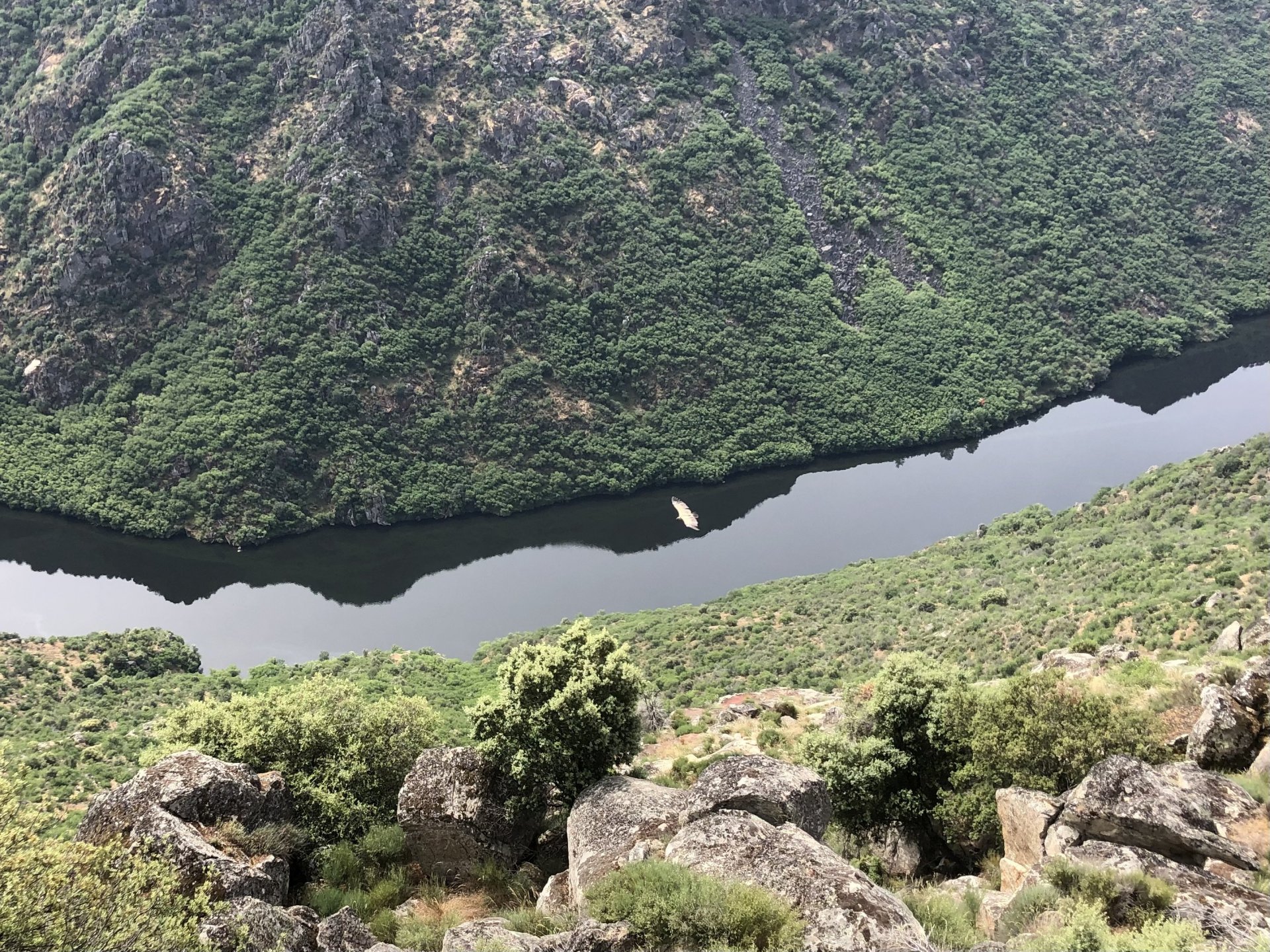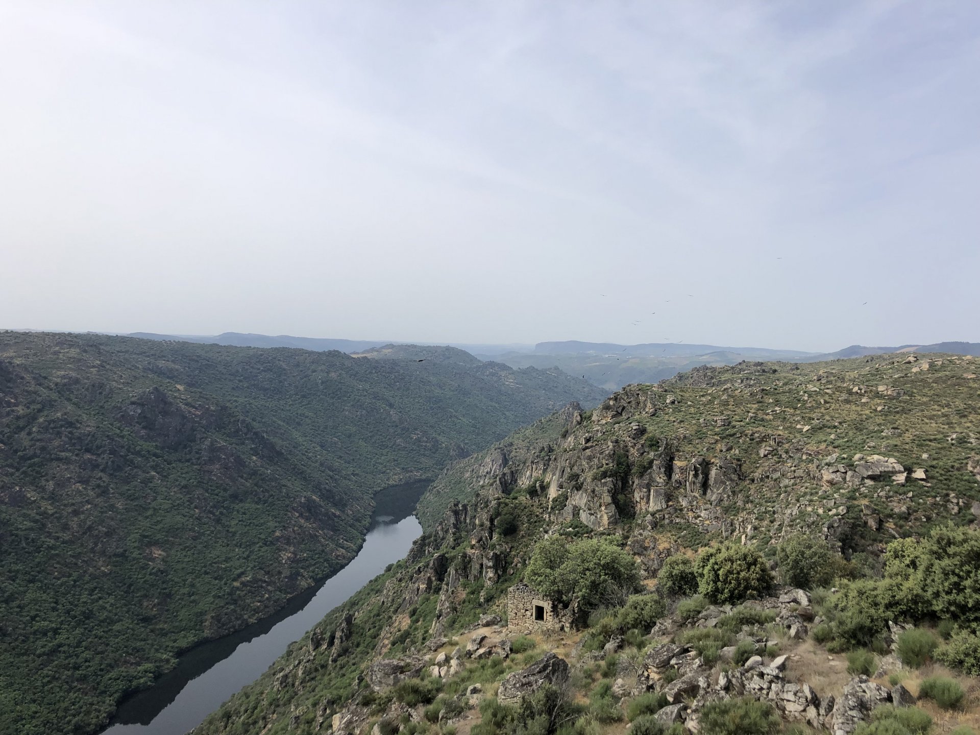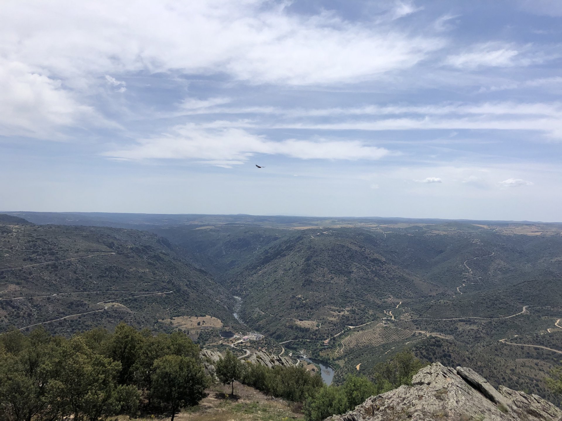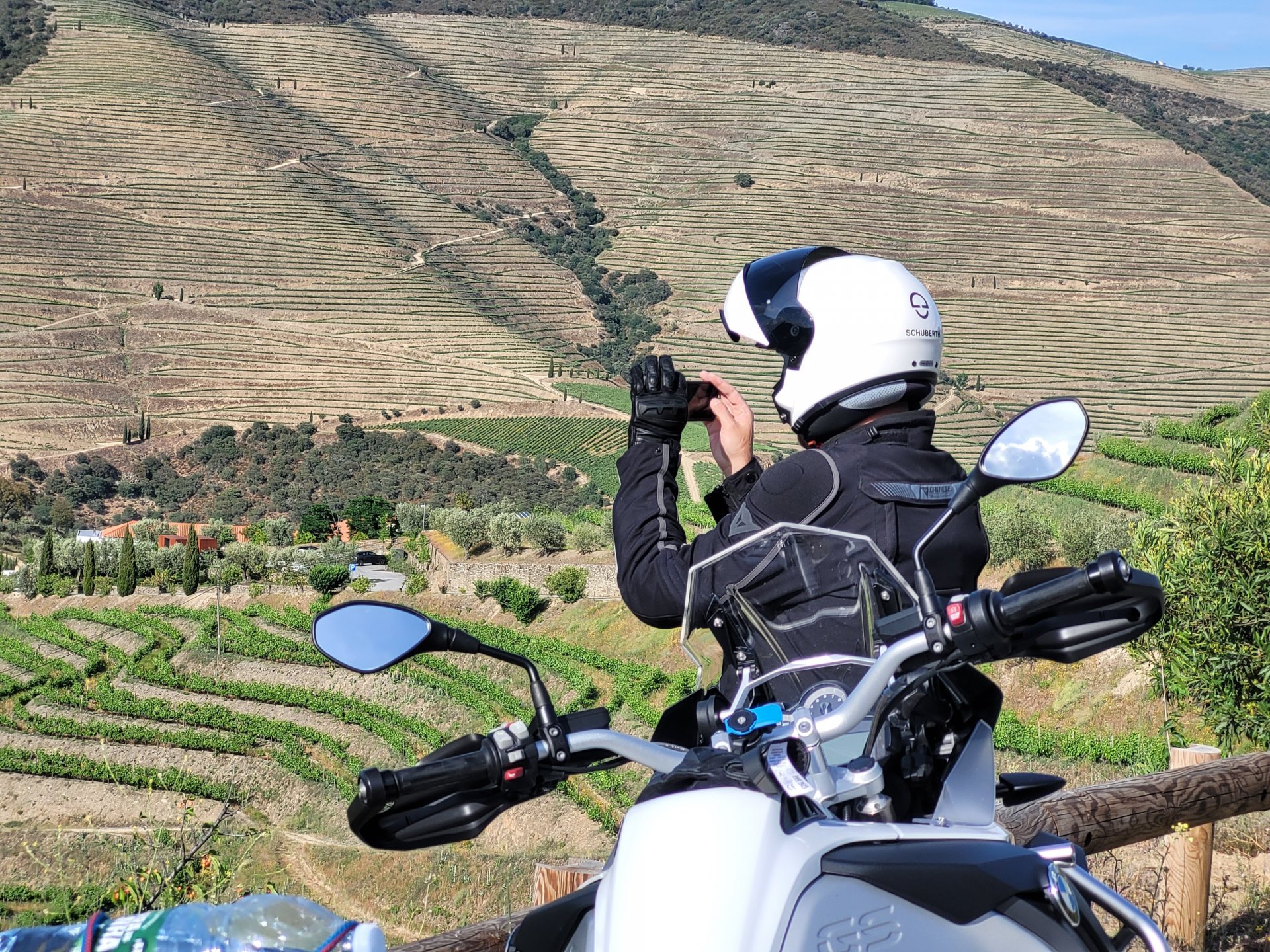 Waking up in Murça felt great, breakfast wasn't until 9AM so had plenty of time to get the stuff packed and cases on the bike like I like to do. Here is a little short clip of our balcony at 09:20, just before setting off, proper countryside soundtrack: Quick set off on the little N324 and we reached Mós quite quick, it's only a handful of kms till we saw the first viewpoint of the day at one of the many Saint Barbara Chapels, it was on top of a dirt road so instead of punishing the Speed Triple Sofia opted to ride on the back of my bike up there. Considering the terrain, it proved to be the right choice, too. The view from the top: A bush or tree growing on a split rock, I love stuff like this. We took our time there, I had an incredibly scenic piss and we carried on, took the M614 and shortly after we reached Pocinho. There was need for an expresso so the plan was to stop, but I got enchanted by the old train station and we took some pictures. The train still works using a more modern small building, but these two big wooden warehouses were from a time long gone when this region used to send most of its produce by train to Porto, mostly grapes and wine. They made for an interesting 20 minutes looking around Lots of flowers everywhere, you got to love the Douro! : So we stopped for a coffee with a view to the train station Half way through my cold water, I heard a diesel engine running on the line and ran over the street for a quick video, just for Pete, the train spotter: After Pocinho, I got on one of my favourite stretches of road, basically you go on a map and find find Poucinho or Vila Nova de Foz Coa, and get on the road following the river inwards into the general direction of Freixo de Espada à Cinta. We rode for a few kms before another stop, Sofia started getting a surge of calls and decided to stop in the shade to answer them. I kept myself occupied with taking a few pictures of a small High Douro village, "Peredo dos Castelhanos": Below, typical village scene, a 50kg Serra da Estrela shepherd dog comes home for lunch after giving me a friendly but still intimidating sideways look: And again we rode on, we didn't stop much for pictures of the road since Sofia was having such fun and I had already documented it in a previous trip, we rode to Freixo de Espada à Cinta, heading straight to Penedo Durão viewpoint for a snack. Penedo Durão is my favourite view in the whole of Portugal except for Sagres, there's a 900 meter drop to the river, with the spanish altiplano on the other side. Spain clearly the least favoured side of the river, as in other things.... We had a nice leftover bbq sandwich while looking at the Vultures and the Griffons and the hawks, I can spend hours there: A black vulture can go almost to 2,5 meters wing span, you can see it in the crappy iPhone picture below, just open it in your browser and zoom a little, it's an awe inspiring sight: As far as picnic locations go, it's hard to beat: I got soft, after a light lunch I started looking at the vultures and other birds, it was a surprise heat wave and approaching 36 or 37º. We stopped at Freixo de Espada à Cinta (Ash with a Sword tied to the Waist, LOL) for Speed Triple fuel, these inferior bikes have to fuel up everyday while mine is like a camel and can hold fuel for over a day's riding, anyways... as Sofia was fueling up her bike I moaned about it being hot and feeling like a stop in our friend Manuela's Inn for a dip in the pool and a nice dinner. It didn't take much convincing and I called in, after 5 minutes we were stopped for the day, bikes parked in the shade and me beelining to the pool: Is this hardcore motorcycling? No! Is this serious motorcycling? No! We did about 65 or 75 km that day, if that! It was properly enjoying the day! Before dinner and after a cold bottle of water and some nice orange juice and a nice soaking in the pool overlooking the Douro, we had a shower and I convinced myself it would be good to go for a walk to build up an apetite. I regretted as it's a hilly area and it was properly hot, regardless, here's a couple of pictures from our walk in Freixo de Espada à Cinta... We came back early, downed a bottle of cold water, and then had a bottle of Manuela's own production white wine, which is amazing, alongwith a nice dinner: It was a very short distance ridden that day, but high enjoyment and content. The next day would see more distance and more "Portugal", will post that tomorrow, maybe...1 point