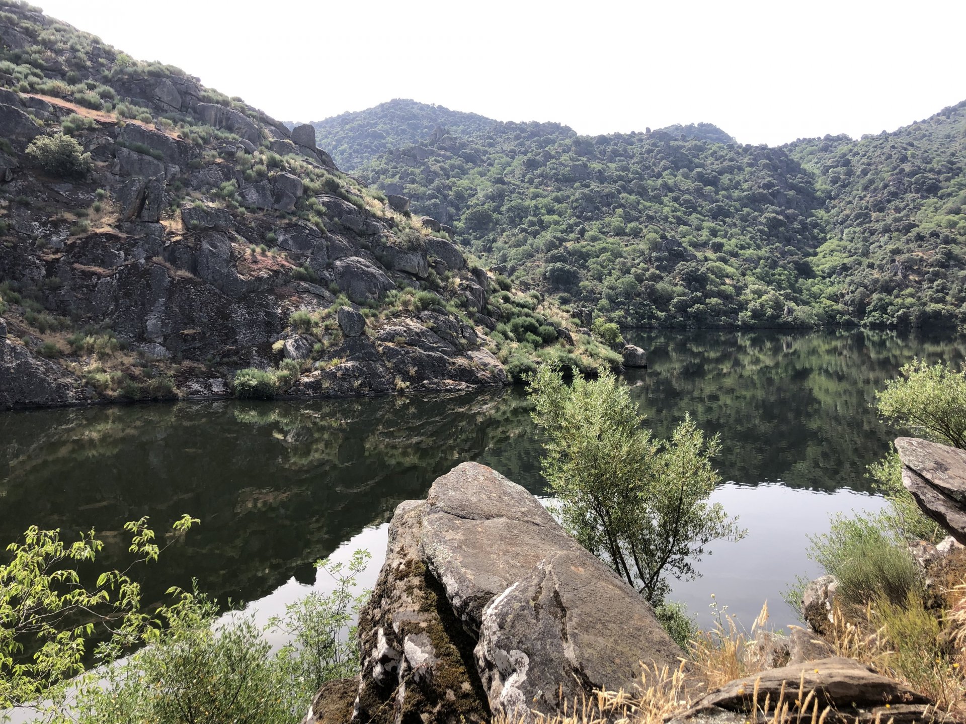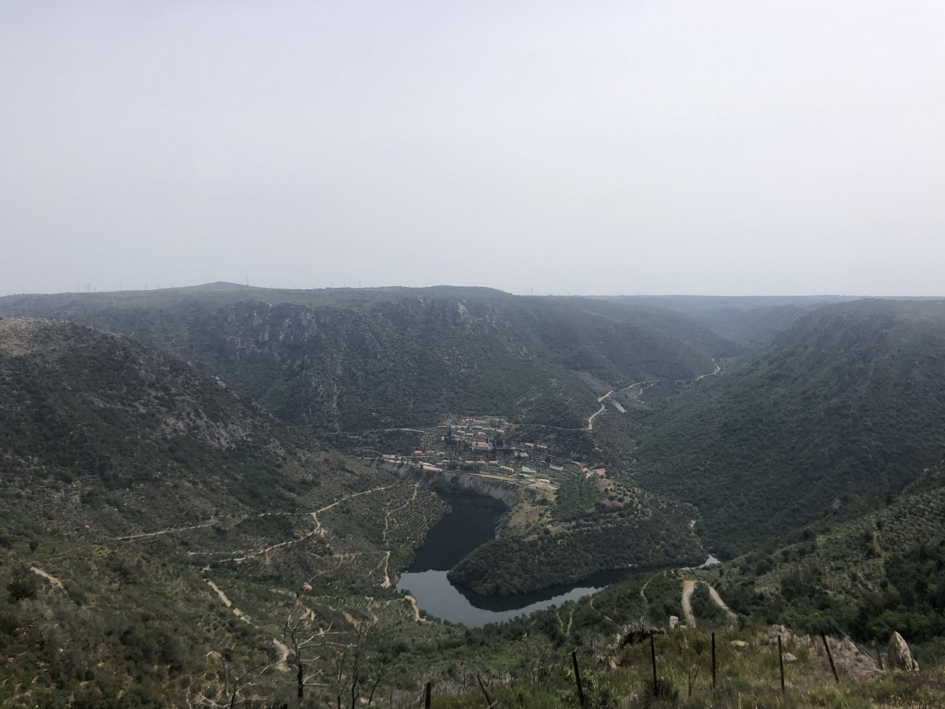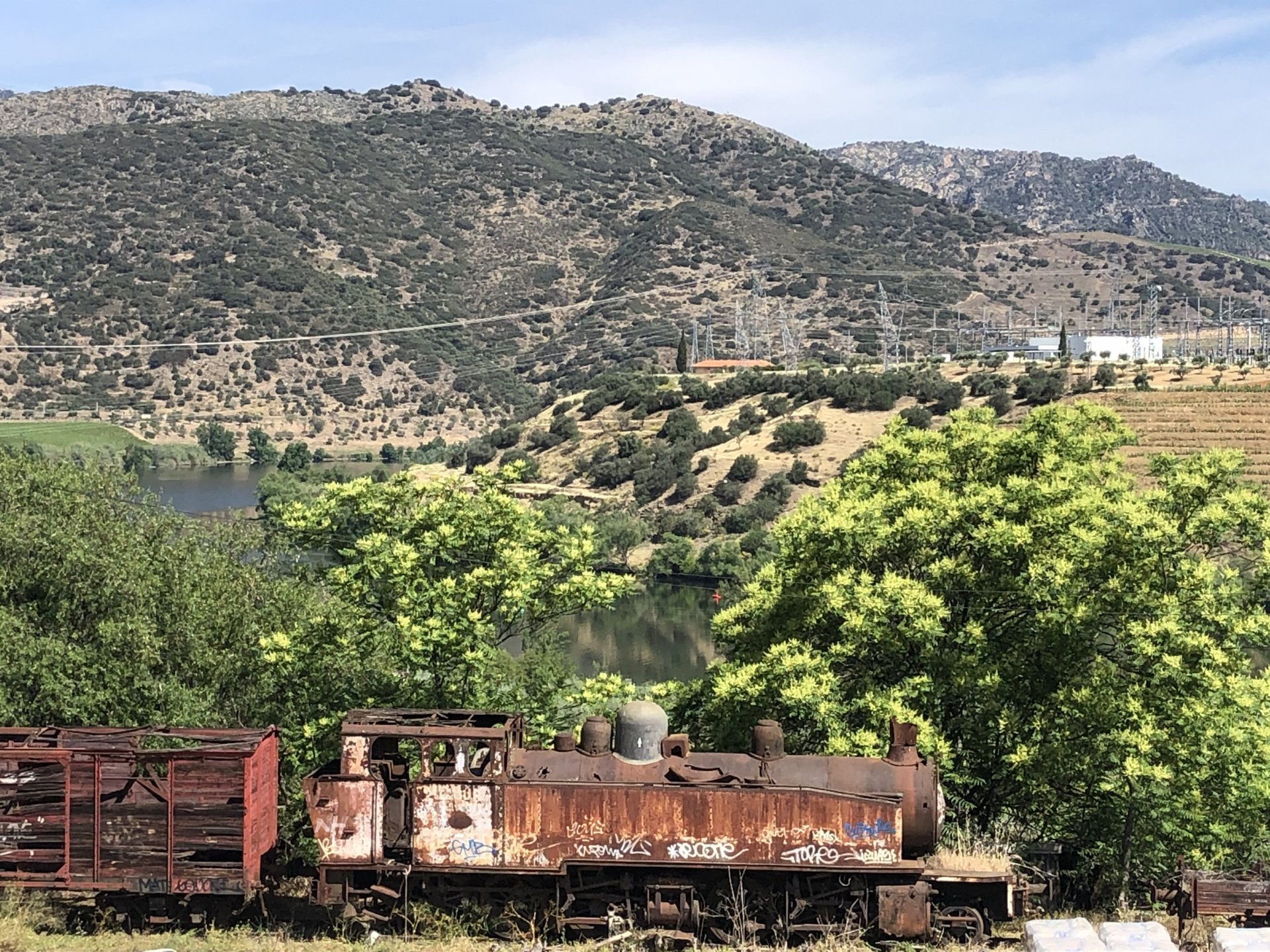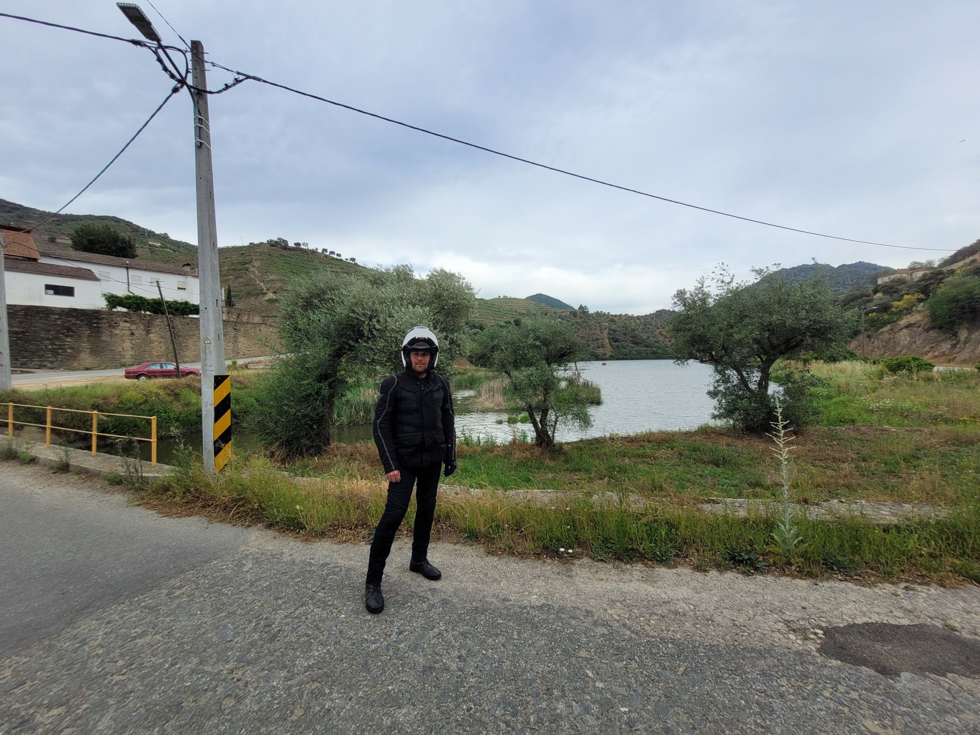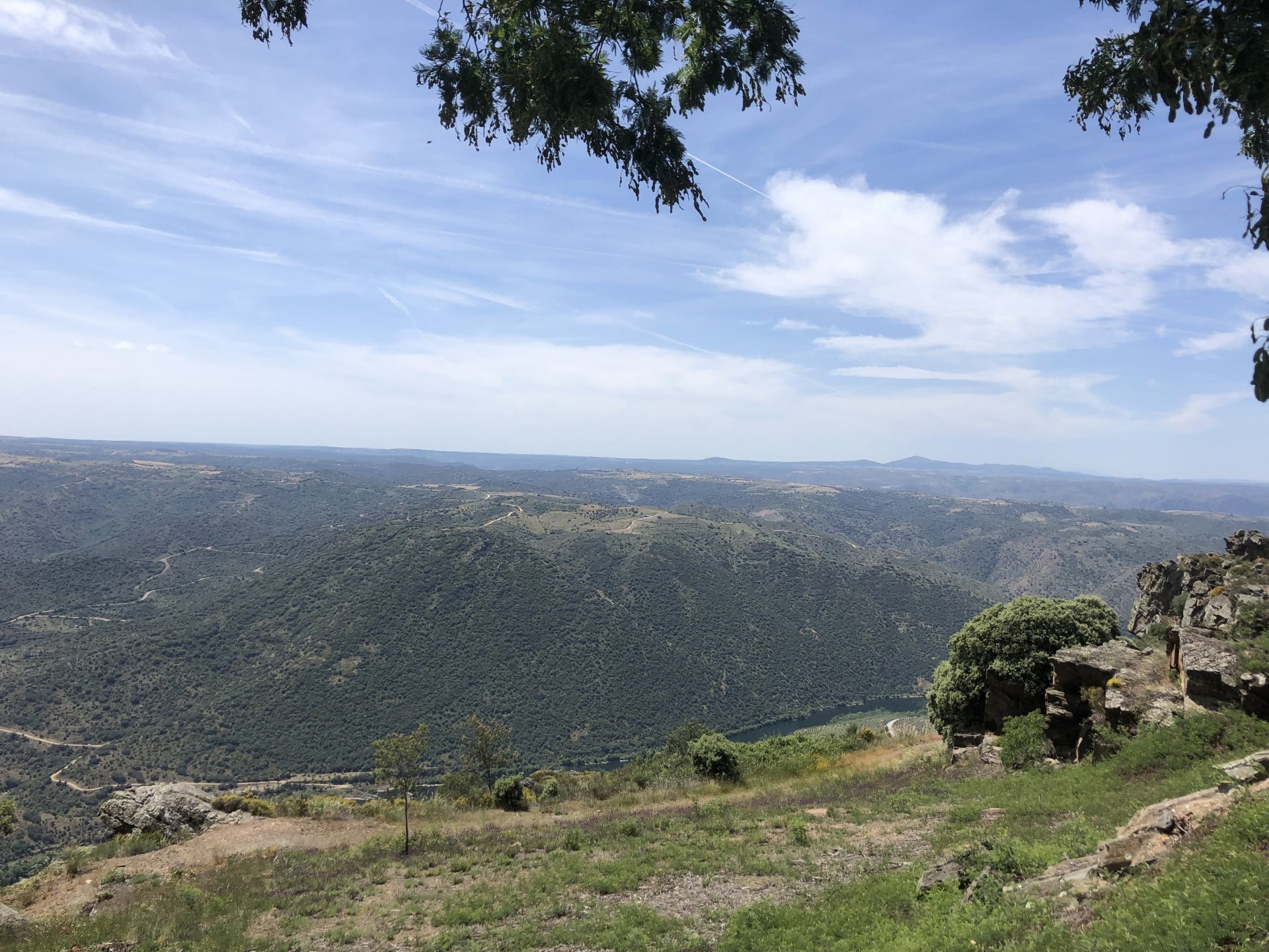 Waking up in Murça felt great, breakfast wasn't until 9AM so had plenty of time to get the stuff packed and cases on the bike like I like to do. Here is a little short clip of our balcony at 09:20, just before setting off, proper countryside soundtrack: Quick set off on the little N324 and we reached Mós quite quick, it's only a handful of kms till we saw the first viewpoint of the day at one of the many Saint Barbara Chapels, it was on top of a dirt road so instead of punishing the Speed Triple Sofia opted to ride on the back of my bike up there. Considering the terrain, it proved to be the right choice, too. The view from the top: A bush or tree growing on a split rock, I love stuff like this. We took our time there, I had an incredibly scenic piss and we carried on, took the M614 and shortly after we reached Pocinho. There was need for an expresso so the plan was to stop, but I got enchanted by the old train station and we took some pictures. The train still works using a more modern small building, but these two big wooden warehouses were from a time long gone when this region used to send most of its produce by train to Porto, mostly grapes and wine. They made for an interesting 20 minutes looking around Lots of flowers everywhere, you got to love the Douro! : So we stopped for a coffee with a view to the train station Half way through my cold water, I heard a diesel engine running on the line and ran over the street for a quick video, just for Pete, the train spotter: After Pocinho, I got on one of my favourite stretches of road, basically you go on a map and find find Poucinho or Vila Nova de Foz Coa, and get on the road following the river inwards into the general direction of Freixo de Espada à Cinta. We rode for a few kms before another stop, Sofia started getting a surge of calls and decided to stop in the shade to answer them. I kept myself occupied with taking a few pictures of a small High Douro village, "Peredo dos Castelhanos": Below, typical village scene, a 50kg Serra da Estrela shepherd dog comes home for lunch after giving me a friendly but still intimidating sideways look: And again we rode on, we didn't stop much for pictures of the road since Sofia was having such fun and I had already documented it in a previous trip, we rode to Freixo de Espada à Cinta, heading straight to Penedo Durão viewpoint for a snack. Penedo Durão is my favourite view in the whole of Portugal except for Sagres, there's a 900 meter drop to the river, with the spanish altiplano on the other side. Spain clearly the least favoured side of the river, as in other things.... We had a nice leftover bbq sandwich while looking at the Vultures and the Griffons and the hawks, I can spend hours there: A black vulture can go almost to 2,5 meters wing span, you can see it in the crappy iPhone picture below, just open it in your browser and zoom a little, it's an awe inspiring sight: As far as picnic locations go, it's hard to beat: I got soft, after a light lunch I started looking at the vultures and other birds, it was a surprise heat wave and approaching 36 or 37º. We stopped at Freixo de Espada à Cinta (Ash with a Sword tied to the Waist, LOL) for Speed Triple fuel, these inferior bikes have to fuel up everyday while mine is like a camel and can hold fuel for over a day's riding, anyways... as Sofia was fueling up her bike I moaned about it being hot and feeling like a stop in our friend Manuela's Inn for a dip in the pool and a nice dinner. It didn't take much convincing and I called in, after 5 minutes we were stopped for the day, bikes parked in the shade and me beelining to the pool: Is this hardcore motorcycling? No! Is this serious motorcycling? No! We did about 65 or 75 km that day, if that! It was properly enjoying the day! Before dinner and after a cold bottle of water and some nice orange juice and a nice soaking in the pool overlooking the Douro, we had a shower and I convinced myself it would be good to go for a walk to build up an apetite. I regretted as it's a hilly area and it was properly hot, regardless, here's a couple of pictures from our walk in Freixo de Espada à Cinta... We came back early, downed a bottle of cold water, and then had a bottle of Manuela's own production white wine, which is amazing, alongwith a nice dinner: It was a very short distance ridden that day, but high enjoyment and content. The next day would see more distance and more "Portugal", will post that tomorrow, maybe...1 point