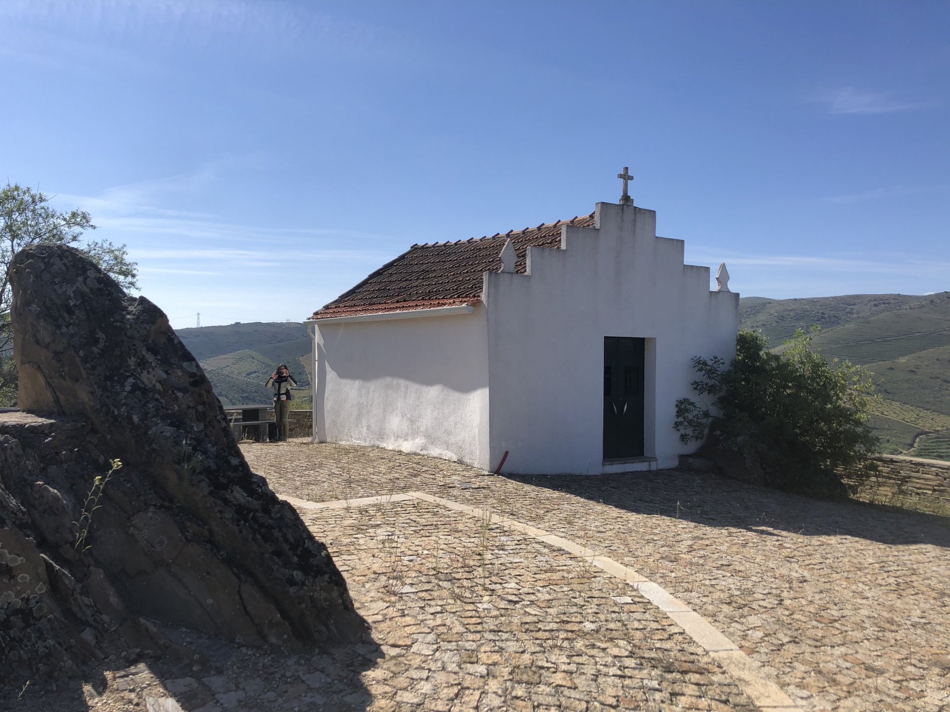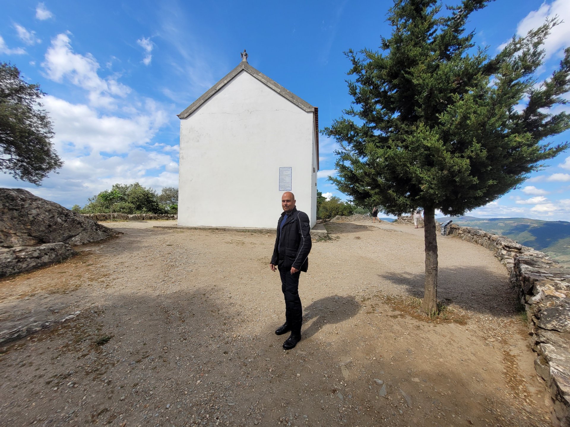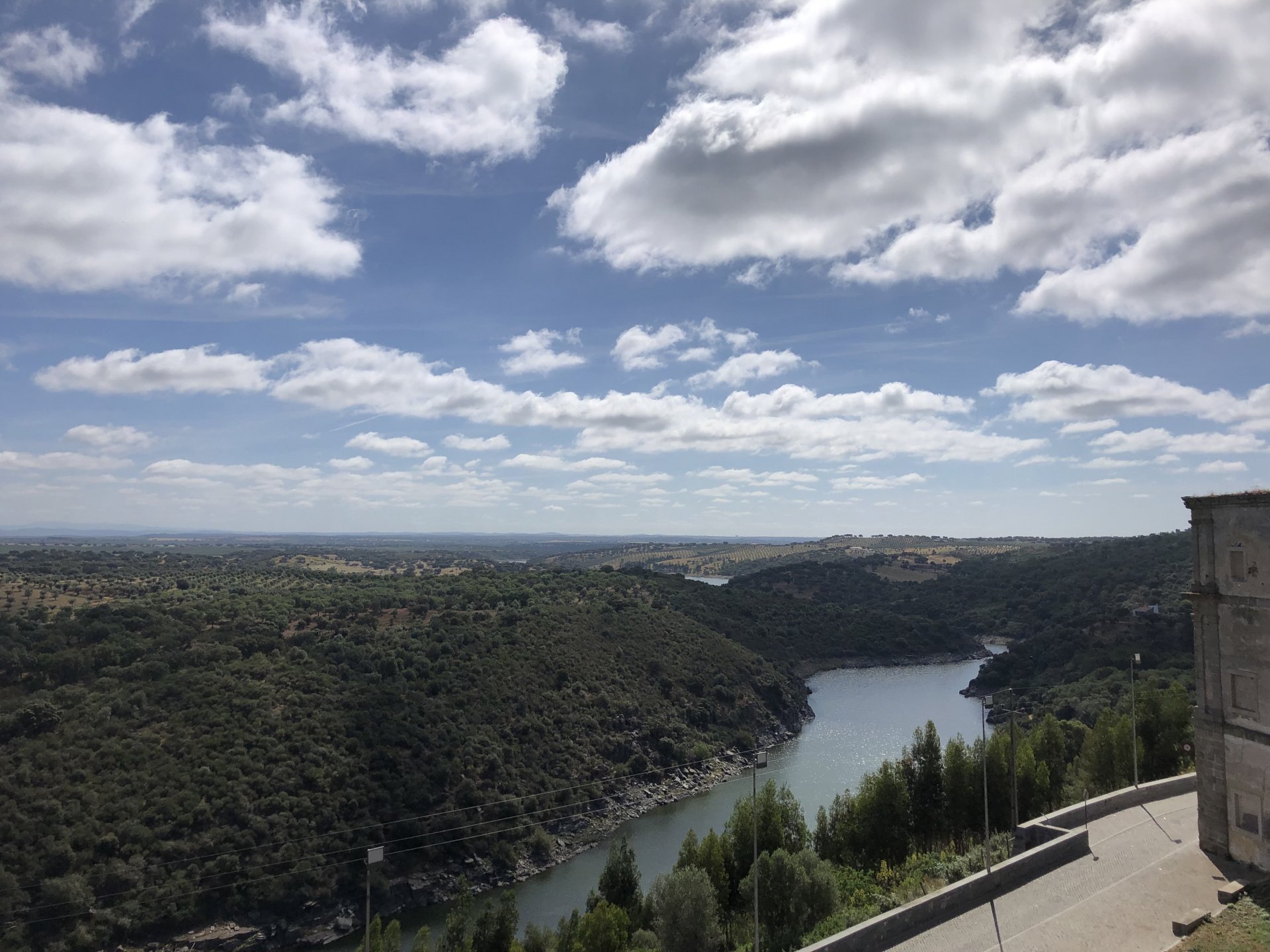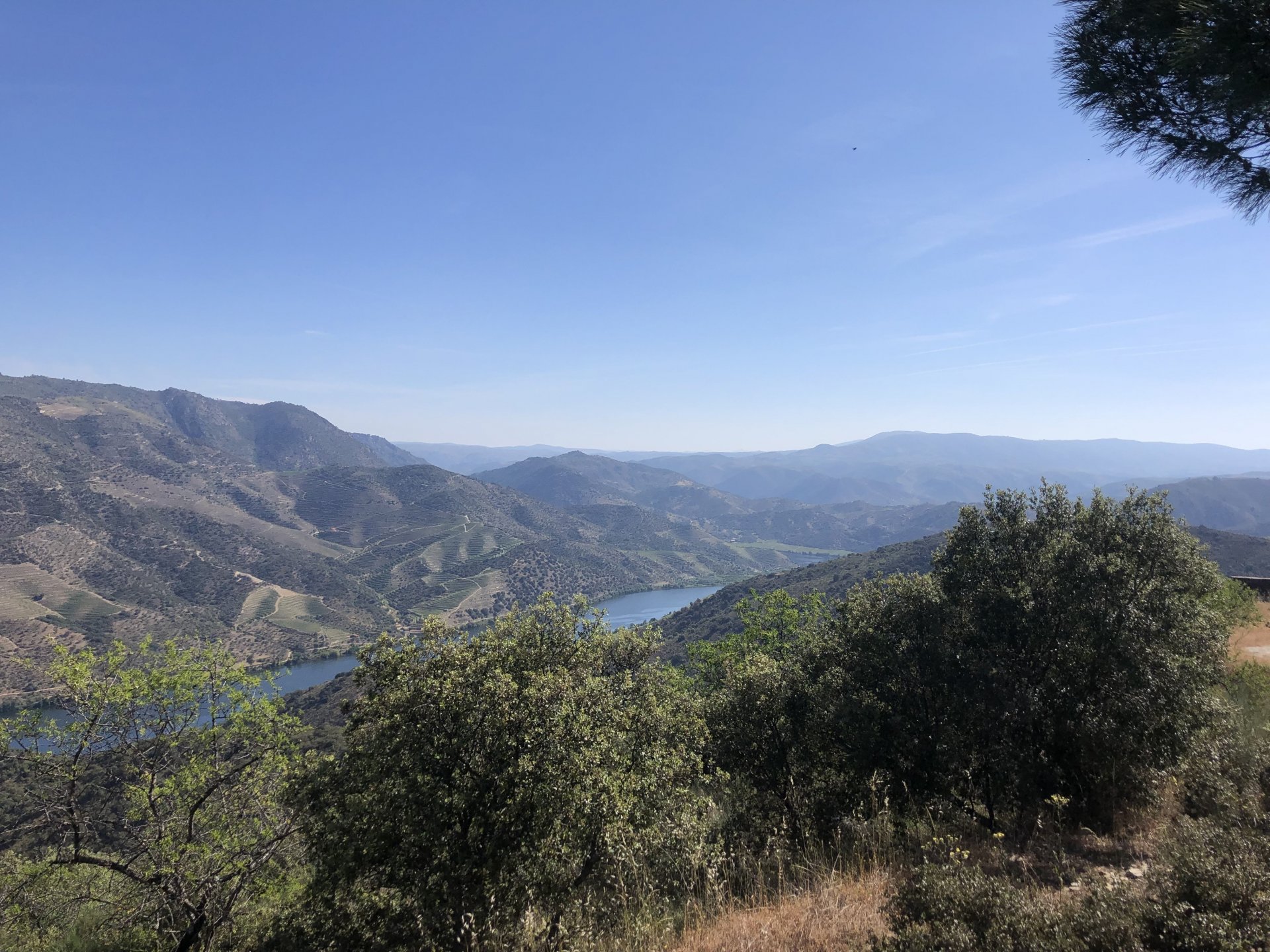 Waking up in Murça felt great, breakfast wasn't until 9AM so had plenty of time to get the stuff packed and cases on the bike like I like to do. Here is a little short clip of our balcony at 09:20, just before setting off, proper countryside soundtrack: Quick set off on the little N324 and we reached Mós quite quick, it's only a handful of kms till we saw the first viewpoint of the day at one of the many Saint Barbara Chapels, it was on top of a dirt road so instead of punishing the Speed Triple Sofia opted to ride on the back of my bike up there. Considering the terrain, it proved to be the right choice, too. The view from the top: A bush or tree growing on a split rock, I love stuff like this. We took our time there, I had an incredibly scenic piss and we carried on, took the M614 and shortly after we reached Pocinho. There was need for an expresso so the plan was to stop, but I got enchanted by the old train station and we took some pictures. The train still works using a more modern small building, but these two big wooden warehouses were from a time long gone when this region used to send most of its produce by train to Porto, mostly grapes and wine. They made for an interesting 20 minutes looking around Lots of flowers everywhere, you got to love the Douro! : So we stopped for a coffee with a view to the train station Half way through my cold water, I heard a diesel engine running on the line and ran over the street for a quick video, just for Pete, the train spotter: After Pocinho, I got on one of my favourite stretches of road, basically you go on a map and find find Poucinho or Vila Nova de Foz Coa, and get on the road following the river inwards into the general direction of Freixo de Espada à Cinta. We rode for a few kms before another stop, Sofia started getting a surge of calls and decided to stop in the shade to answer them. I kept myself occupied with taking a few pictures of a small High Douro village, "Peredo dos Castelhanos": Below, typical village scene, a 50kg Serra da Estrela shepherd dog comes home for lunch after giving me a friendly but still intimidating sideways look: And again we rode on, we didn't stop much for pictures of the road since Sofia was having such fun and I had already documented it in a previous trip, we rode to Freixo de Espada à Cinta, heading straight to Penedo Durão viewpoint for a snack. Penedo Durão is my favourite view in the whole of Portugal except for Sagres, there's a 900 meter drop to the river, with the spanish altiplano on the other side. Spain clearly the least favoured side of the river, as in other things.... We had a nice leftover bbq sandwich while looking at the Vultures and the Griffons and the hawks, I can spend hours there: A black vulture can go almost to 2,5 meters wing span, you can see it in the crappy iPhone picture below, just open it in your browser and zoom a little, it's an awe inspiring sight: As far as picnic locations go, it's hard to beat: I got soft, after a light lunch I started looking at the vultures and other birds, it was a surprise heat wave and approaching 36 or 37º. We stopped at Freixo de Espada à Cinta (Ash with a Sword tied to the Waist, LOL) for Speed Triple fuel, these inferior bikes have to fuel up everyday while mine is like a camel and can hold fuel for over a day's riding, anyways... as Sofia was fueling up her bike I moaned about it being hot and feeling like a stop in our friend Manuela's Inn for a dip in the pool and a nice dinner. It didn't take much convincing and I called in, after 5 minutes we were stopped for the day, bikes parked in the shade and me beelining to the pool: Is this hardcore motorcycling? No! Is this serious motorcycling? No! We did about 65 or 75 km that day, if that! It was properly enjoying the day! Before dinner and after a cold bottle of water and some nice orange juice and a nice soaking in the pool overlooking the Douro, we had a shower and I convinced myself it would be good to go for a walk to build up an apetite. I regretted as it's a hilly area and it was properly hot, regardless, here's a couple of pictures from our walk in Freixo de Espada à Cinta... We came back early, downed a bottle of cold water, and then had a bottle of Manuela's own production white wine, which is amazing, alongwith a nice dinner: It was a very short distance ridden that day, but high enjoyment and content. The next day would see more distance and more "Portugal", will post that tomorrow, maybe...1 point