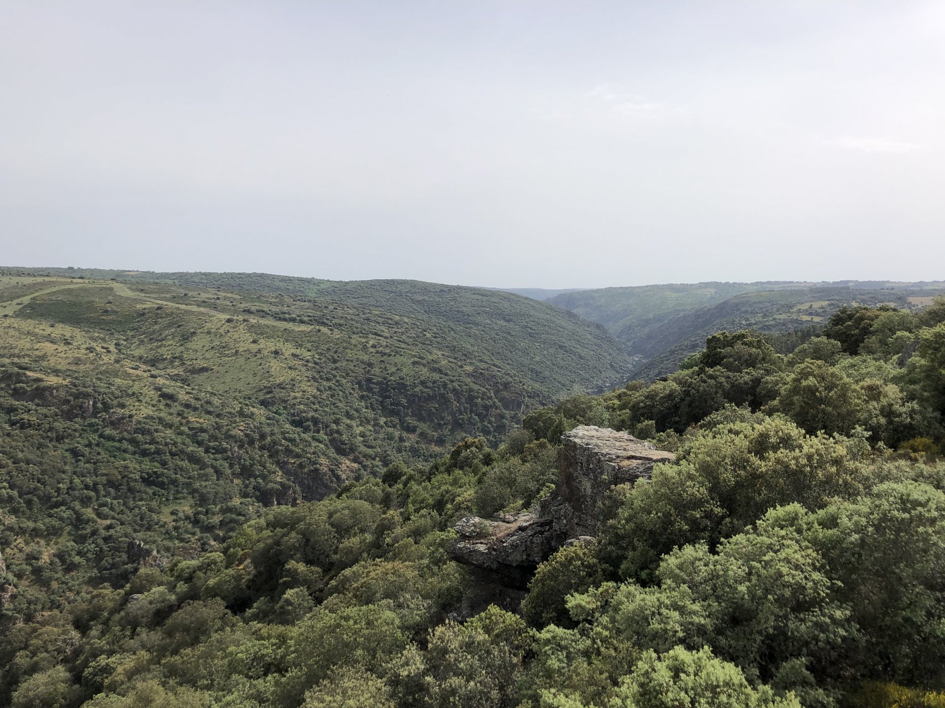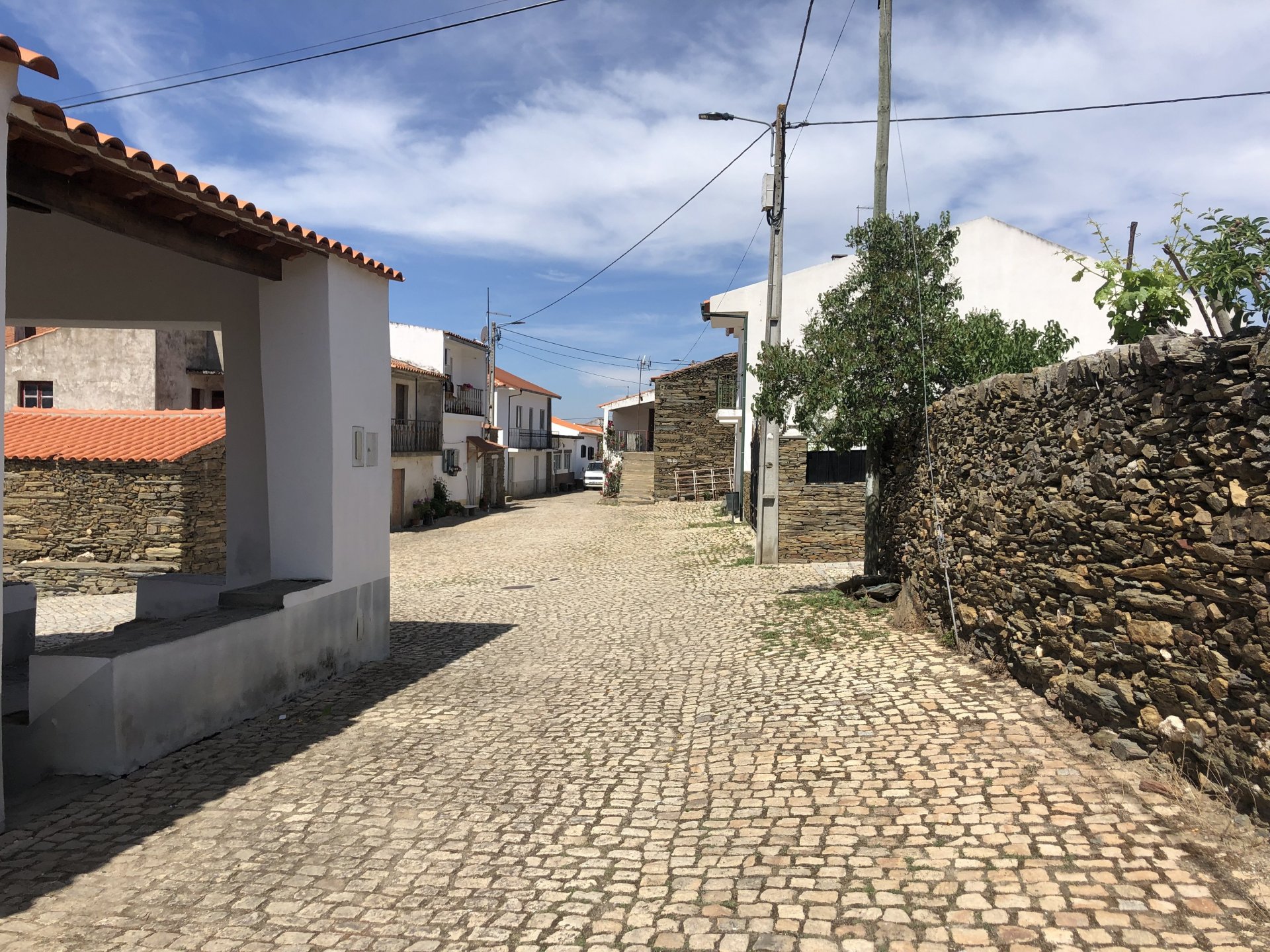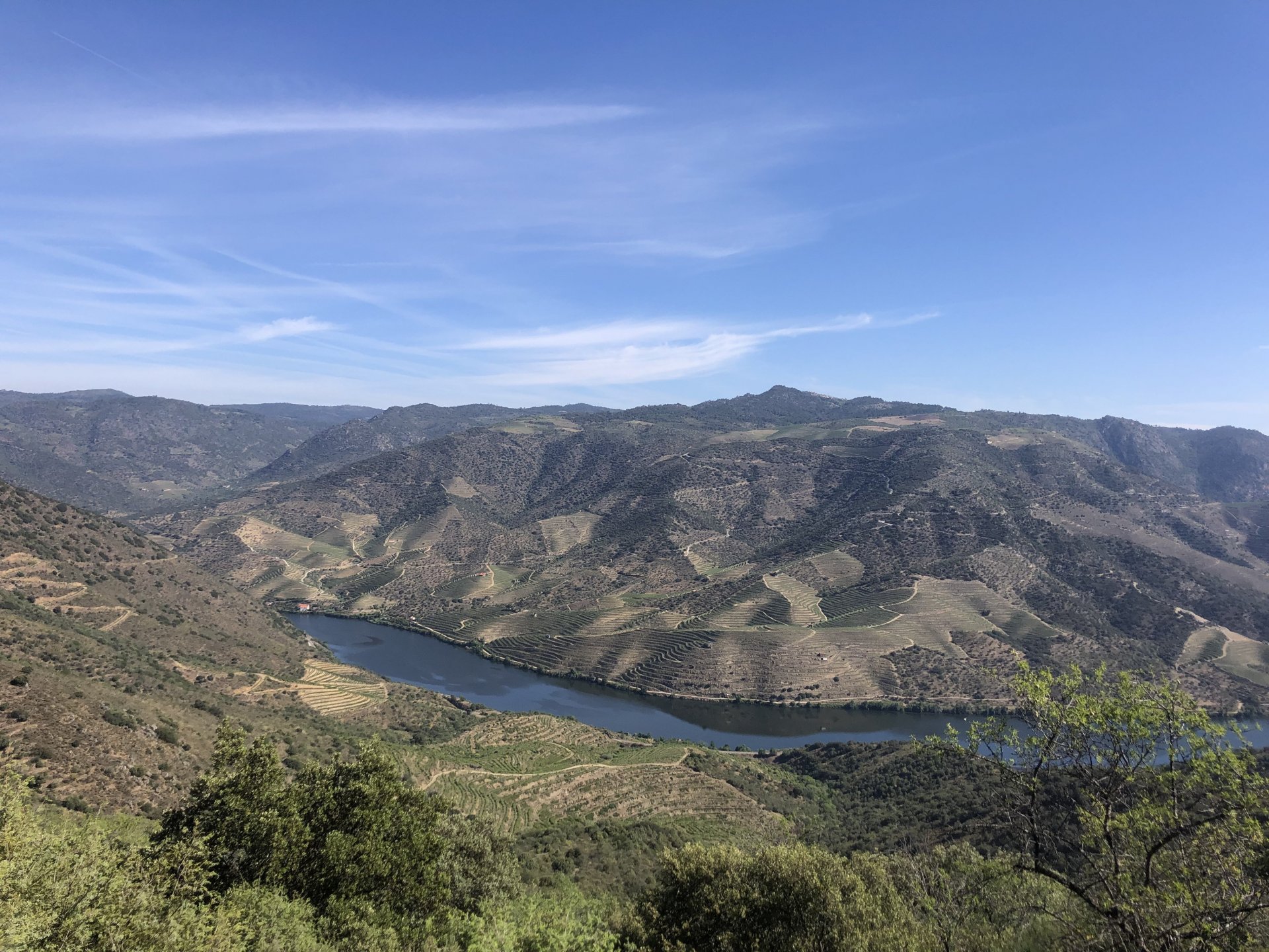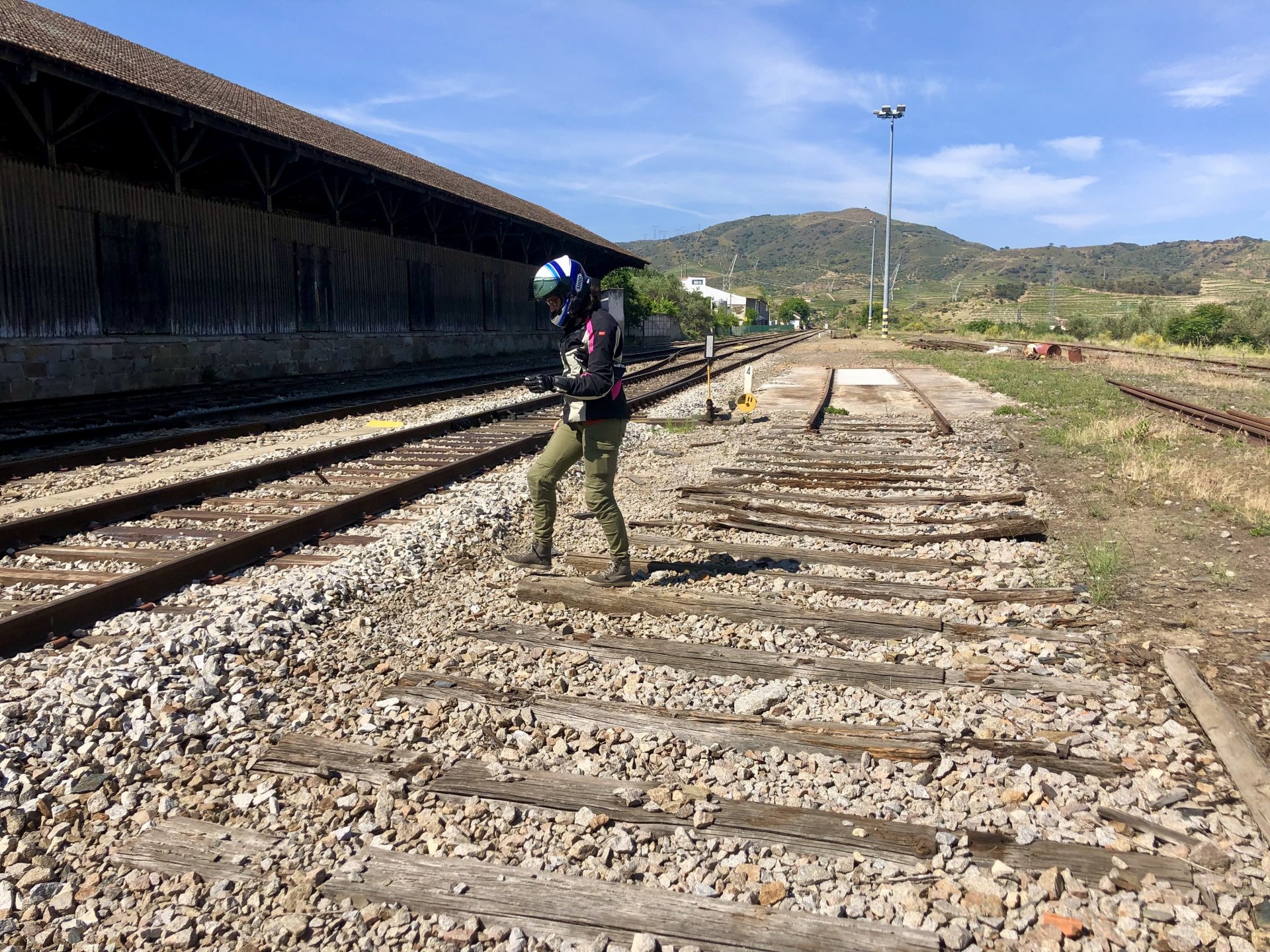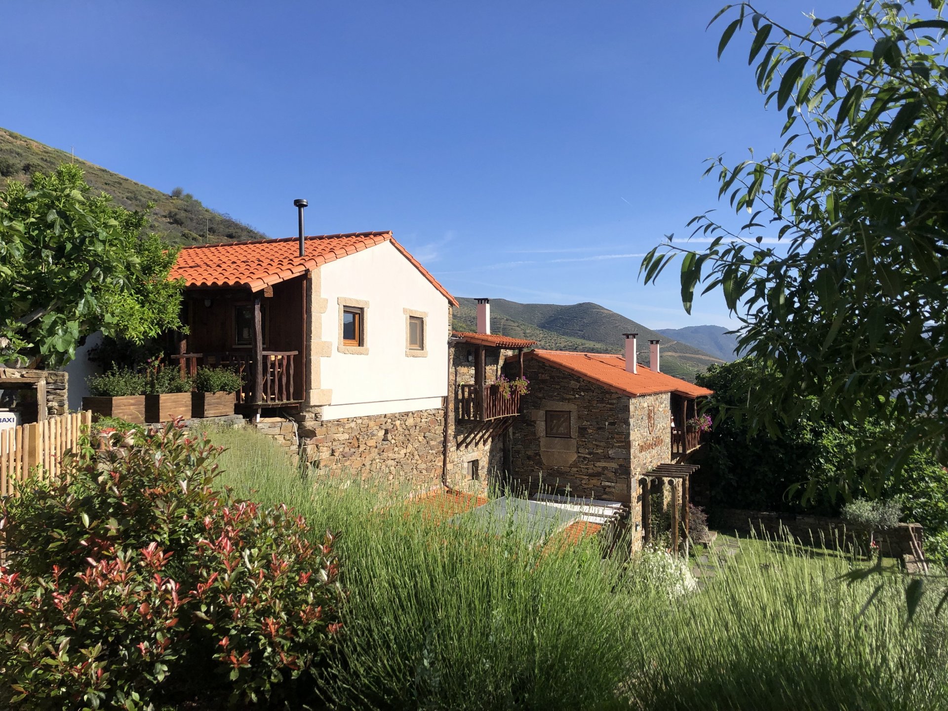 Waking up in Murça felt great, breakfast wasn't until 9AM so had plenty of time to get the stuff packed and cases on the bike like I like to do. Here is a little short clip of our balcony at 09:20, just before setting off, proper countryside soundtrack: Quick set off on the little N324 and we reached Mós quite quick, it's only a handful of kms till we saw the first viewpoint of the day at one of the many Saint Barbara Chapels, it was on top of a dirt road so instead of punishing the Speed Triple Sofia opted to ride on the back of my bike up there. Considering the terrain, it proved to be the right choice, too. The view from the top: A bush or tree growing on a split rock, I love stuff like this. We took our time there, I had an incredibly scenic piss and we carried on, took the M614 and shortly after we reached Pocinho. There was need for an expresso so the plan was to stop, but I got enchanted by the old train station and we took some pictures. The train still works using a more modern small building, but these two big wooden warehouses were from a time long gone when this region used to send most of its produce by train to Porto, mostly grapes and wine. They made for an interesting 20 minutes looking around Lots of flowers everywhere, you got to love the Douro! : So we stopped for a coffee with a view to the train station Half way through my cold water, I heard a diesel engine running on the line and ran over the street for a quick video, just for Pete, the train spotter: After Pocinho, I got on one of my favourite stretches of road, basically you go on a map and find find Poucinho or Vila Nova de Foz Coa, and get on the road following the river inwards into the general direction of Freixo de Espada à Cinta. We rode for a few kms before another stop, Sofia started getting a surge of calls and decided to stop in the shade to answer them. I kept myself occupied with taking a few pictures of a small High Douro village, "Peredo dos Castelhanos": Below, typical village scene, a 50kg Serra da Estrela shepherd dog comes home for lunch after giving me a friendly but still intimidating sideways look: And again we rode on, we didn't stop much for pictures of the road since Sofia was having such fun and I had already documented it in a previous trip, we rode to Freixo de Espada à Cinta, heading straight to Penedo Durão viewpoint for a snack. Penedo Durão is my favourite view in the whole of Portugal except for Sagres, there's a 900 meter drop to the river, with the spanish altiplano on the other side. Spain clearly the least favoured side of the river, as in other things.... We had a nice leftover bbq sandwich while looking at the Vultures and the Griffons and the hawks, I can spend hours there: A black vulture can go almost to 2,5 meters wing span, you can see it in the crappy iPhone picture below, just open it in your browser and zoom a little, it's an awe inspiring sight: As far as picnic locations go, it's hard to beat: I got soft, after a light lunch I started looking at the vultures and other birds, it was a surprise heat wave and approaching 36 or 37º. We stopped at Freixo de Espada à Cinta (Ash with a Sword tied to the Waist, LOL) for Speed Triple fuel, these inferior bikes have to fuel up everyday while mine is like a camel and can hold fuel for over a day's riding, anyways... as Sofia was fueling up her bike I moaned about it being hot and feeling like a stop in our friend Manuela's Inn for a dip in the pool and a nice dinner. It didn't take much convincing and I called in, after 5 minutes we were stopped for the day, bikes parked in the shade and me beelining to the pool: Is this hardcore motorcycling? No! Is this serious motorcycling? No! We did about 65 or 75 km that day, if that! It was properly enjoying the day! Before dinner and after a cold bottle of water and some nice orange juice and a nice soaking in the pool overlooking the Douro, we had a shower and I convinced myself it would be good to go for a walk to build up an apetite. I regretted as it's a hilly area and it was properly hot, regardless, here's a couple of pictures from our walk in Freixo de Espada à Cinta... We came back early, downed a bottle of cold water, and then had a bottle of Manuela's own production white wine, which is amazing, alongwith a nice dinner: It was a very short distance ridden that day, but high enjoyment and content. The next day would see more distance and more "Portugal", will post that tomorrow, maybe...1 point