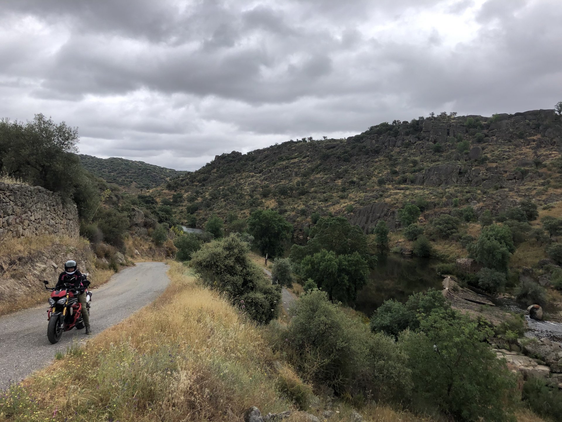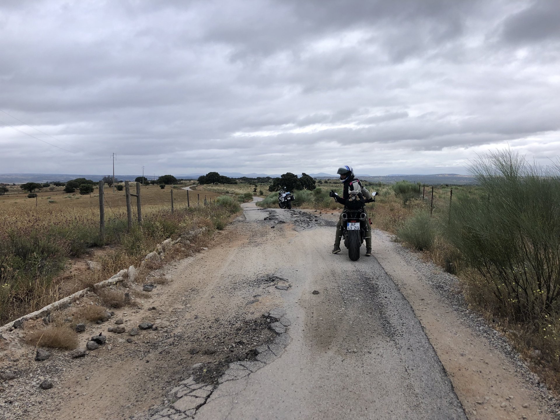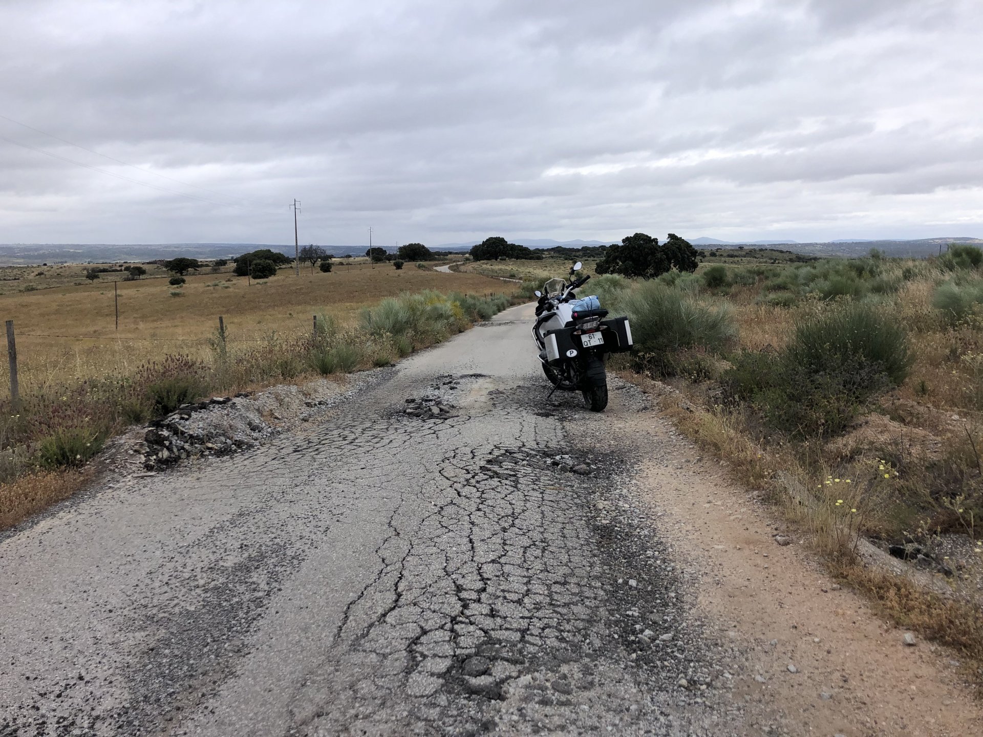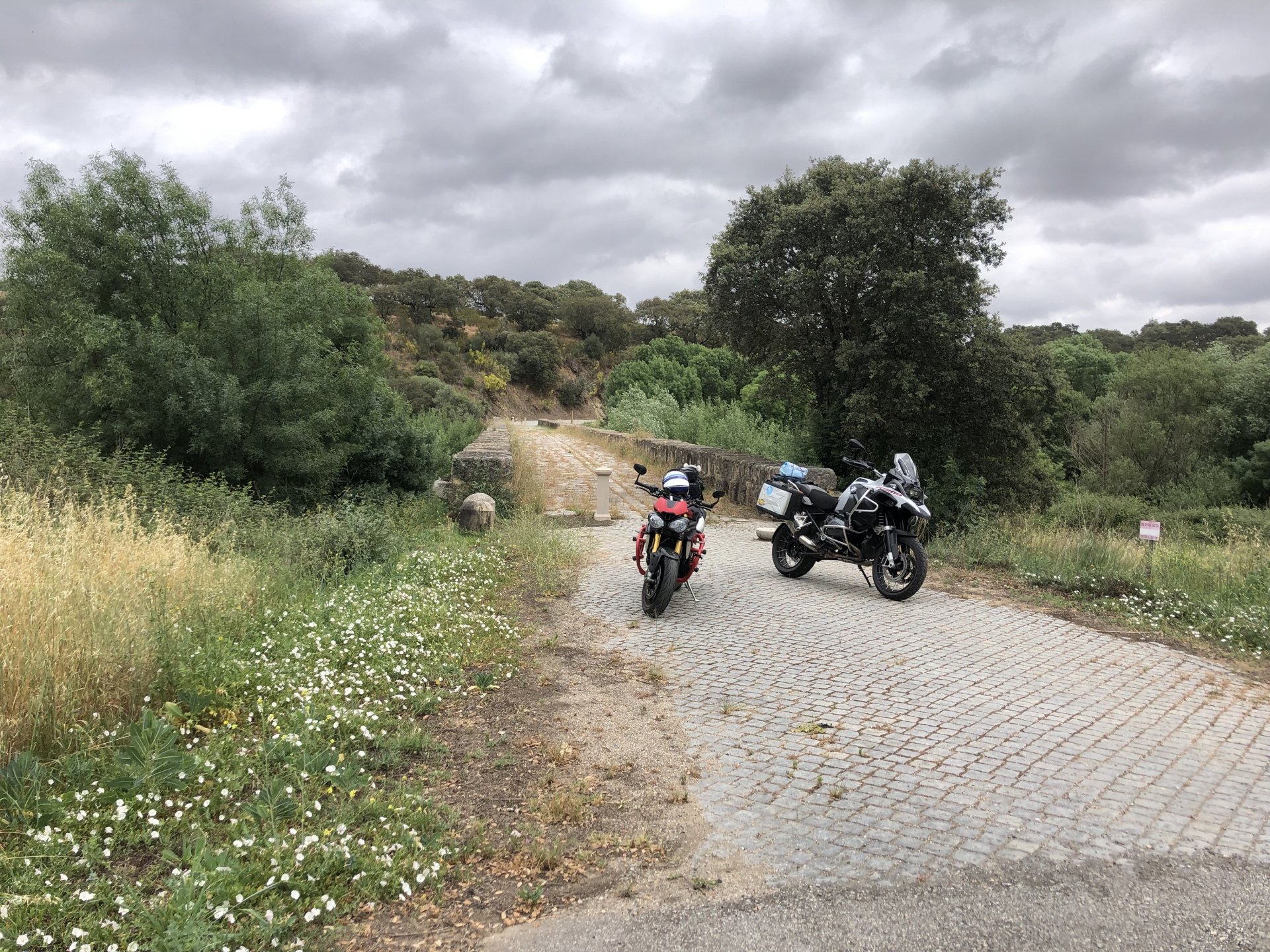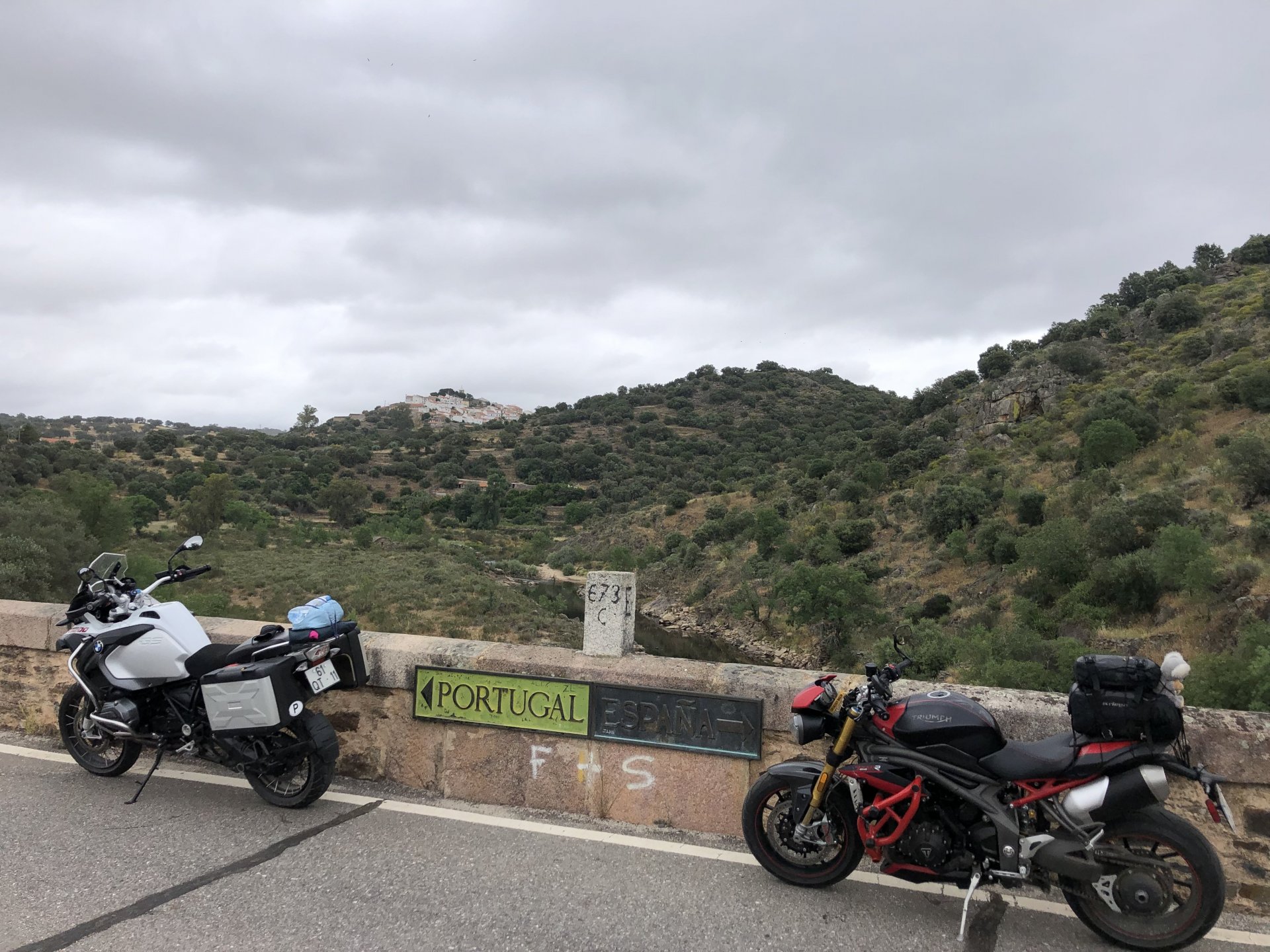 The next day we wake up, put up with an annoying hostess yet a little more and have a pretty mediocre breakfast. The simple but tasty bread rolls from the north replaced with a pretentious person serving tasteless crap. I gave the bikes a wipe to get rid of the most apparent muddy rain drops from the previous afternoon's rain, and we set off, stopping in Rosmaninhal to sort out a navigational miscommunication, and again Sofia finds herself making another friend The tiny municipal road from Rosmaninhal through Tegueiro to Segura is only 25km but it's amazing, and I love it. It's quite narrow so that an average light truck doesn't leave much space for anything else, but it's nice tarmac, often broken in places, with patches of dirt and broken road thrown in. If there was to be a road for trail bikes or supermotos this would be it. I could spend an afternoon riding back and forward there The views couldn't be more different to the previous days' locations up in Trás os Montes and High Douro: Extreme heat and overloaded trucks will do this to tarmac. We got to Segura safe and sound, and went to take a look at the Rio Erges, that's Spain on the other side of the water We started by heading back on the same lovely road we came in before, and I tried to stop for a picture in similar style to the one I took the first time I was there, except the first time I was by myself and at 40º, today with Sofia it was about 18 or 20º and about to rain. I like these worn out by time road marks. Stopped at Nisa for a lunch snack, and Sofia was delighted and envious that the local vet has a parking place reserved for his clients' This Roman bridge has been abandoned from use, but clearly strong enough to handle any load, it's just that the modern two lane road built 50 meters to the side doesn't suit it anymore. It's a shame. The plan was to go home to Ericeira from there, but plans change and instead we made way to Estremoz and then Alter do Chão to sleep in a lovely little hotel built in an old monastery. I ´ve put pictures of all these places before, and sadly took none this time. Dinner in a tiny cafe in Alentejo made up for the previous night's disgrace with a wonderful typical treat, no pictures of that either as the phone was left in the room. Bikes slept soundly inside an old warehouse belonging to the monastery, and after a later than ideal breakfast we were off to go home to the coast. No motorways were meant to be taken, and we did just that. Rode through lovely Alentejo plains and oaks It was starting to warm up when we stopped in Avis for a coffee and a look around: Tiny roads turned to 5 or 6km of dirt road, I had been through there before but I never remember what the surface is like unless it's properly dreadful. Sofia didn't back off and the Speed Triple sailed through smoothly, stopping halfway to look at a stream As we approached Lisbon, we started seeing a lot of bikes, and a lot of foreign ones too. On a short stop we met with some Welsh bikers returning home from watching the Superbikes at the Estoril (Lisbon area). They were riding back to Santander via inner roads, and seemed to be enjoying it immensely, in their late 60s or mid 70s. Someone got really happy from talking to UK people After that, we rode home almost non stop, it was the end of a nice few days mostly filled with wonderful northern Portuguese scenery.2 points