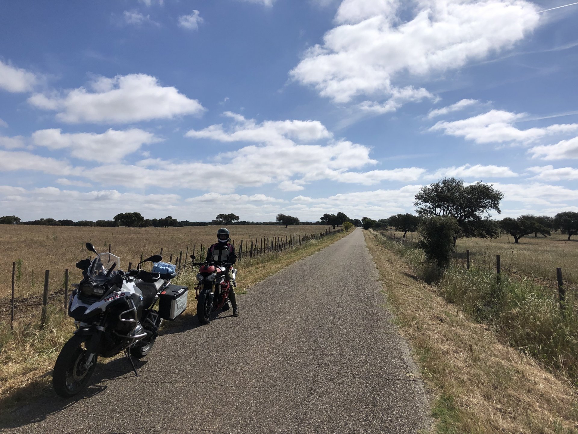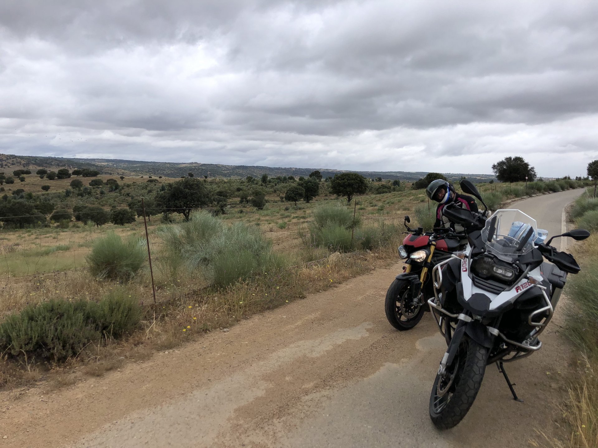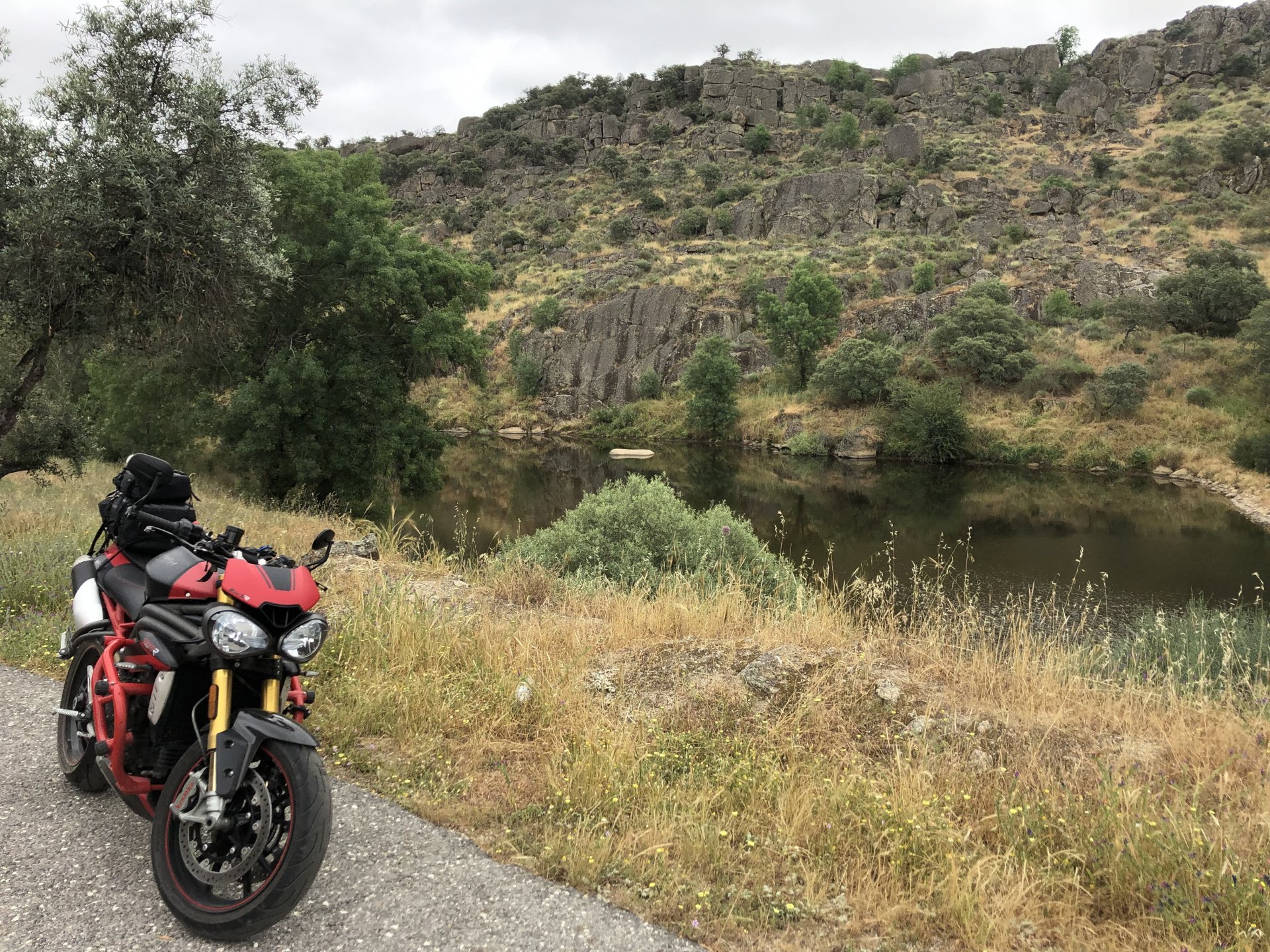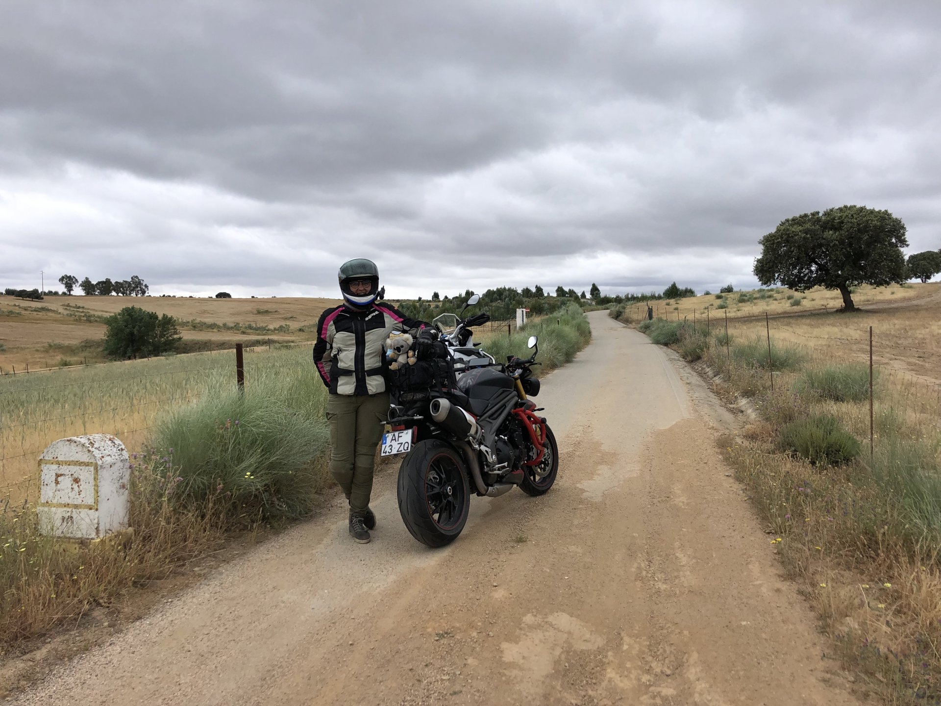 The next day we wake up, put up with an annoying hostess yet a little more and have a pretty mediocre breakfast. The simple but tasty bread rolls from the north replaced with a pretentious person serving tasteless crap. I gave the bikes a wipe to get rid of the most apparent muddy rain drops from the previous afternoon's rain, and we set off, stopping in Rosmaninhal to sort out a navigational miscommunication, and again Sofia finds herself making another friend The tiny municipal road from Rosmaninhal through Tegueiro to Segura is only 25km but it's amazing, and I love it. It's quite narrow so that an average light truck doesn't leave much space for anything else, but it's nice tarmac, often broken in places, with patches of dirt and broken road thrown in. If there was to be a road for trail bikes or supermotos this would be it. I could spend an afternoon riding back and forward there The views couldn't be more different to the previous days' locations up in Trás os Montes and High Douro: Extreme heat and overloaded trucks will do this to tarmac. We got to Segura safe and sound, and went to take a look at the Rio Erges, that's Spain on the other side of the water We started by heading back on the same lovely road we came in before, and I tried to stop for a picture in similar style to the one I took the first time I was there, except the first time I was by myself and at 40º, today with Sofia it was about 18 or 20º and about to rain. I like these worn out by time road marks. Stopped at Nisa for a lunch snack, and Sofia was delighted and envious that the local vet has a parking place reserved for his clients' This Roman bridge has been abandoned from use, but clearly strong enough to handle any load, it's just that the modern two lane road built 50 meters to the side doesn't suit it anymore. It's a shame. The plan was to go home to Ericeira from there, but plans change and instead we made way to Estremoz and then Alter do Chão to sleep in a lovely little hotel built in an old monastery. I ´ve put pictures of all these places before, and sadly took none this time. Dinner in a tiny cafe in Alentejo made up for the previous night's disgrace with a wonderful typical treat, no pictures of that either as the phone was left in the room. Bikes slept soundly inside an old warehouse belonging to the monastery, and after a later than ideal breakfast we were off to go home to the coast. No motorways were meant to be taken, and we did just that. Rode through lovely Alentejo plains and oaks It was starting to warm up when we stopped in Avis for a coffee and a look around: Tiny roads turned to 5 or 6km of dirt road, I had been through there before but I never remember what the surface is like unless it's properly dreadful. Sofia didn't back off and the Speed Triple sailed through smoothly, stopping halfway to look at a stream As we approached Lisbon, we started seeing a lot of bikes, and a lot of foreign ones too. On a short stop we met with some Welsh bikers returning home from watching the Superbikes at the Estoril (Lisbon area). They were riding back to Santander via inner roads, and seemed to be enjoying it immensely, in their late 60s or mid 70s. Someone got really happy from talking to UK people After that, we rode home almost non stop, it was the end of a nice few days mostly filled with wonderful northern Portuguese scenery.2 points