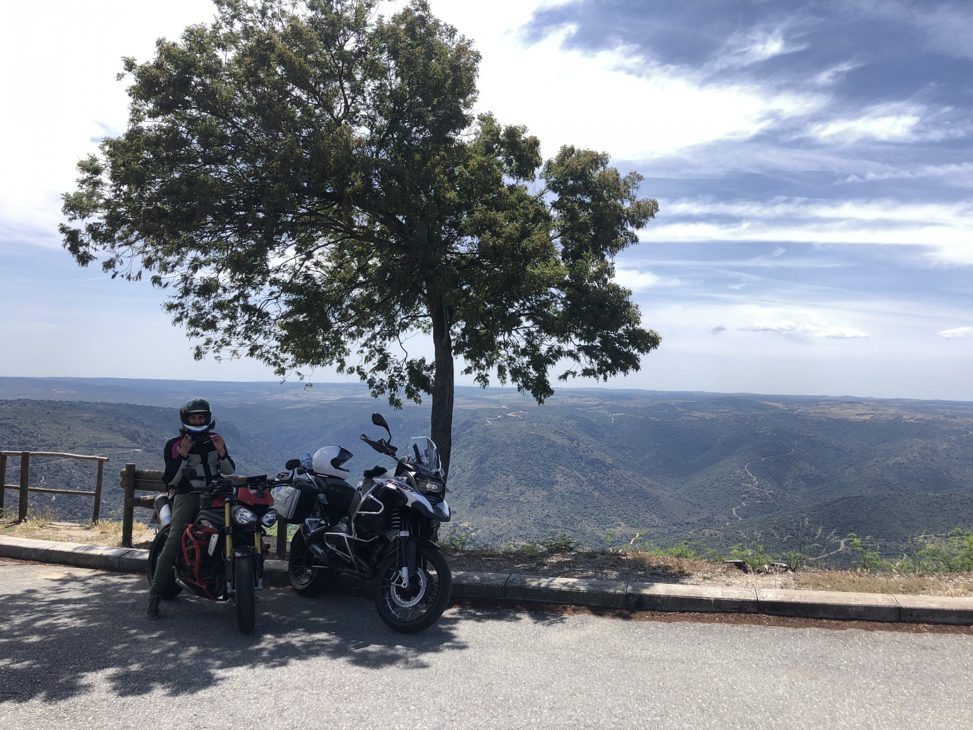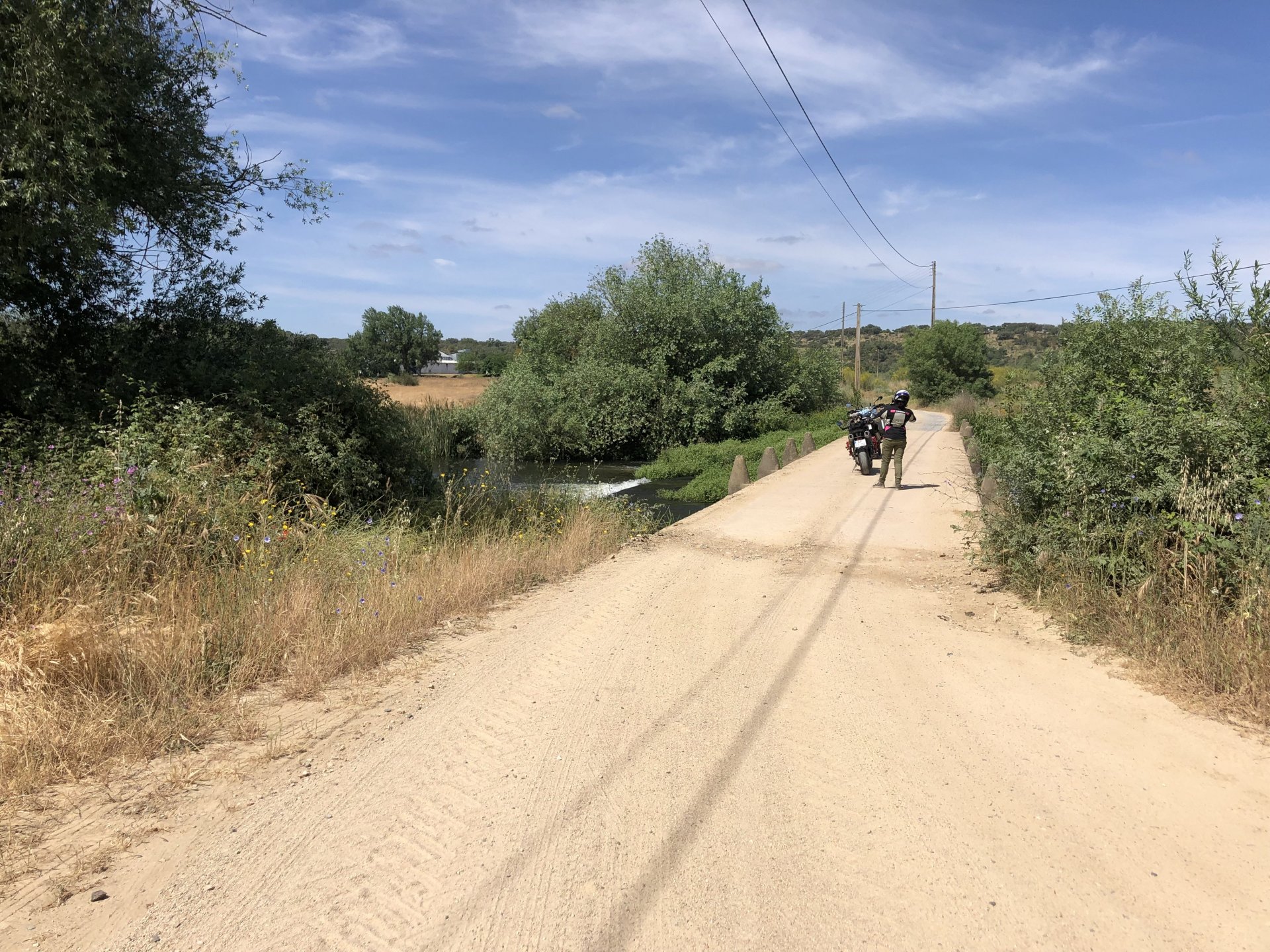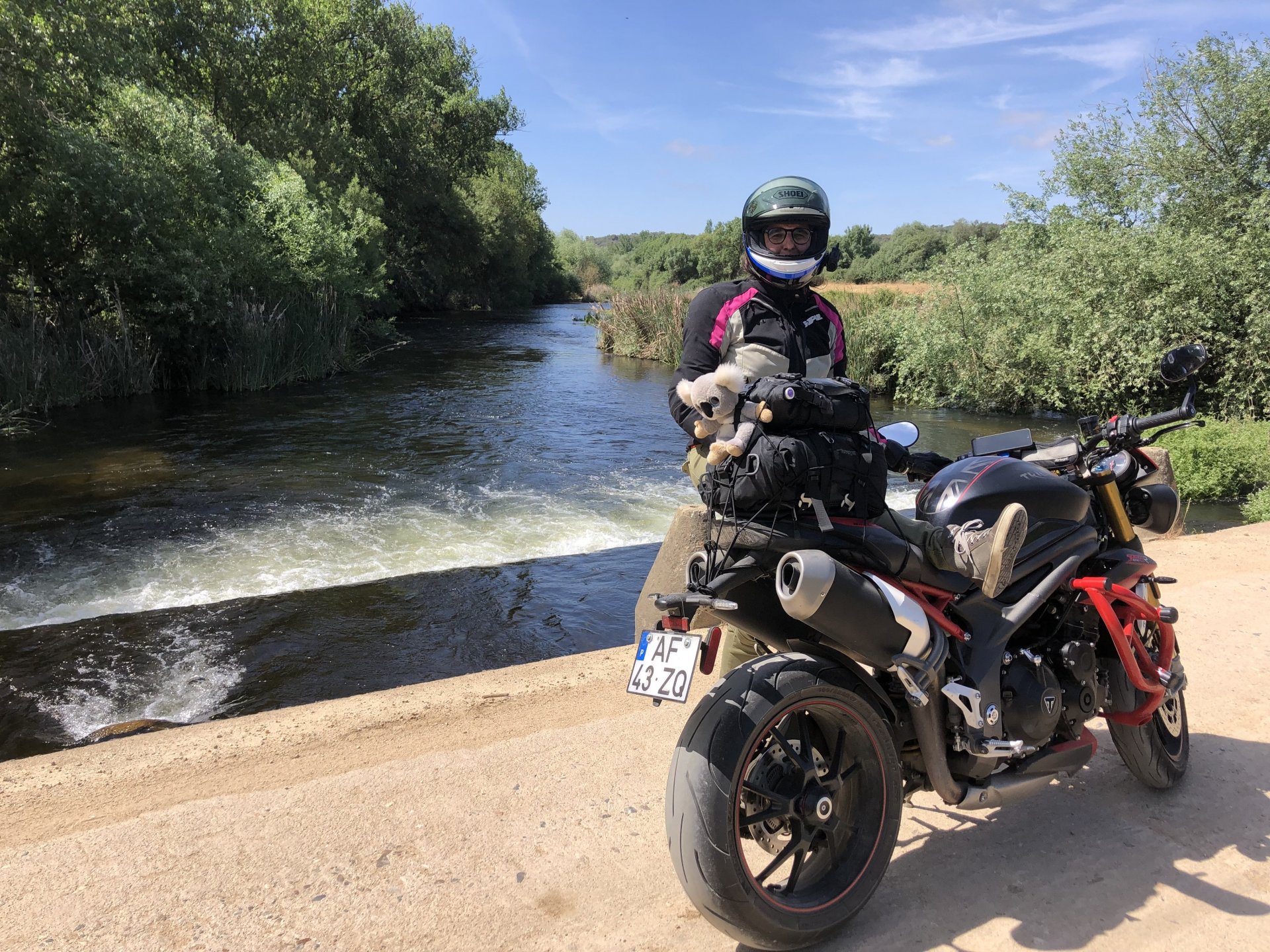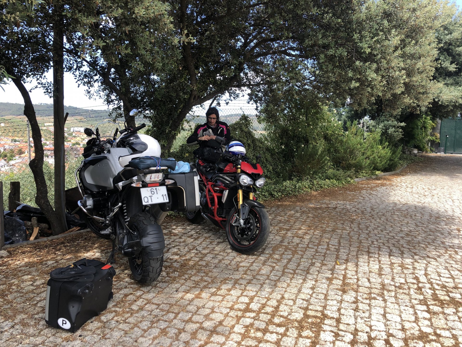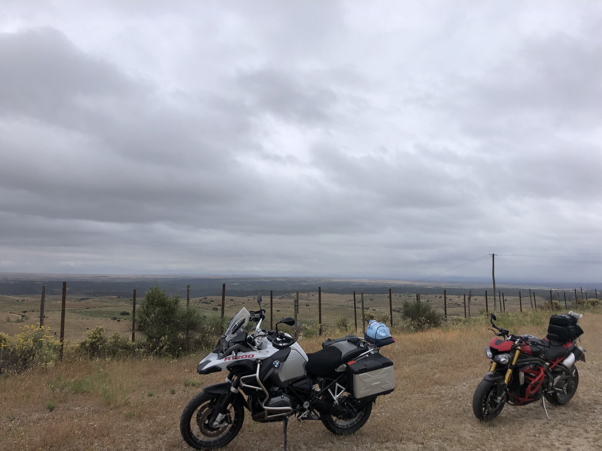 The next day we wake up, put up with an annoying hostess yet a little more and have a pretty mediocre breakfast. The simple but tasty bread rolls from the north replaced with a pretentious person serving tasteless crap. I gave the bikes a wipe to get rid of the most apparent muddy rain drops from the previous afternoon's rain, and we set off, stopping in Rosmaninhal to sort out a navigational miscommunication, and again Sofia finds herself making another friend The tiny municipal road from Rosmaninhal through Tegueiro to Segura is only 25km but it's amazing, and I love it. It's quite narrow so that an average light truck doesn't leave much space for anything else, but it's nice tarmac, often broken in places, with patches of dirt and broken road thrown in. If there was to be a road for trail bikes or supermotos this would be it. I could spend an afternoon riding back and forward there The views couldn't be more different to the previous days' locations up in Trás os Montes and High Douro: Extreme heat and overloaded trucks will do this to tarmac. We got to Segura safe and sound, and went to take a look at the Rio Erges, that's Spain on the other side of the water We started by heading back on the same lovely road we came in before, and I tried to stop for a picture in similar style to the one I took the first time I was there, except the first time I was by myself and at 40º, today with Sofia it was about 18 or 20º and about to rain. I like these worn out by time road marks. Stopped at Nisa for a lunch snack, and Sofia was delighted and envious that the local vet has a parking place reserved for his clients' This Roman bridge has been abandoned from use, but clearly strong enough to handle any load, it's just that the modern two lane road built 50 meters to the side doesn't suit it anymore. It's a shame. The plan was to go home to Ericeira from there, but plans change and instead we made way to Estremoz and then Alter do Chão to sleep in a lovely little hotel built in an old monastery. I ´ve put pictures of all these places before, and sadly took none this time. Dinner in a tiny cafe in Alentejo made up for the previous night's disgrace with a wonderful typical treat, no pictures of that either as the phone was left in the room. Bikes slept soundly inside an old warehouse belonging to the monastery, and after a later than ideal breakfast we were off to go home to the coast. No motorways were meant to be taken, and we did just that. Rode through lovely Alentejo plains and oaks It was starting to warm up when we stopped in Avis for a coffee and a look around: Tiny roads turned to 5 or 6km of dirt road, I had been through there before but I never remember what the surface is like unless it's properly dreadful. Sofia didn't back off and the Speed Triple sailed through smoothly, stopping halfway to look at a stream As we approached Lisbon, we started seeing a lot of bikes, and a lot of foreign ones too. On a short stop we met with some Welsh bikers returning home from watching the Superbikes at the Estoril (Lisbon area). They were riding back to Santander via inner roads, and seemed to be enjoying it immensely, in their late 60s or mid 70s. Someone got really happy from talking to UK people After that, we rode home almost non stop, it was the end of a nice few days mostly filled with wonderful northern Portuguese scenery.2 points