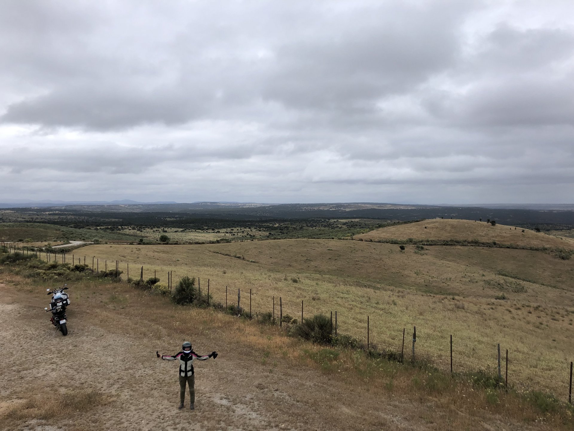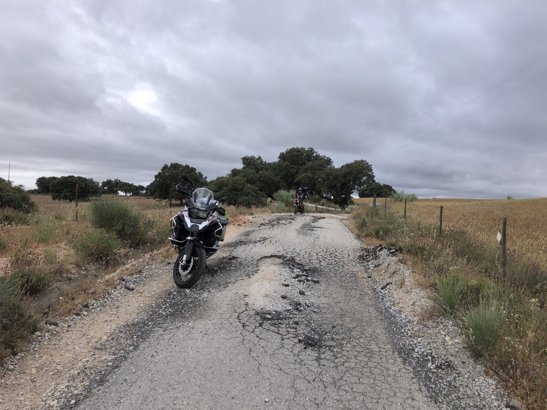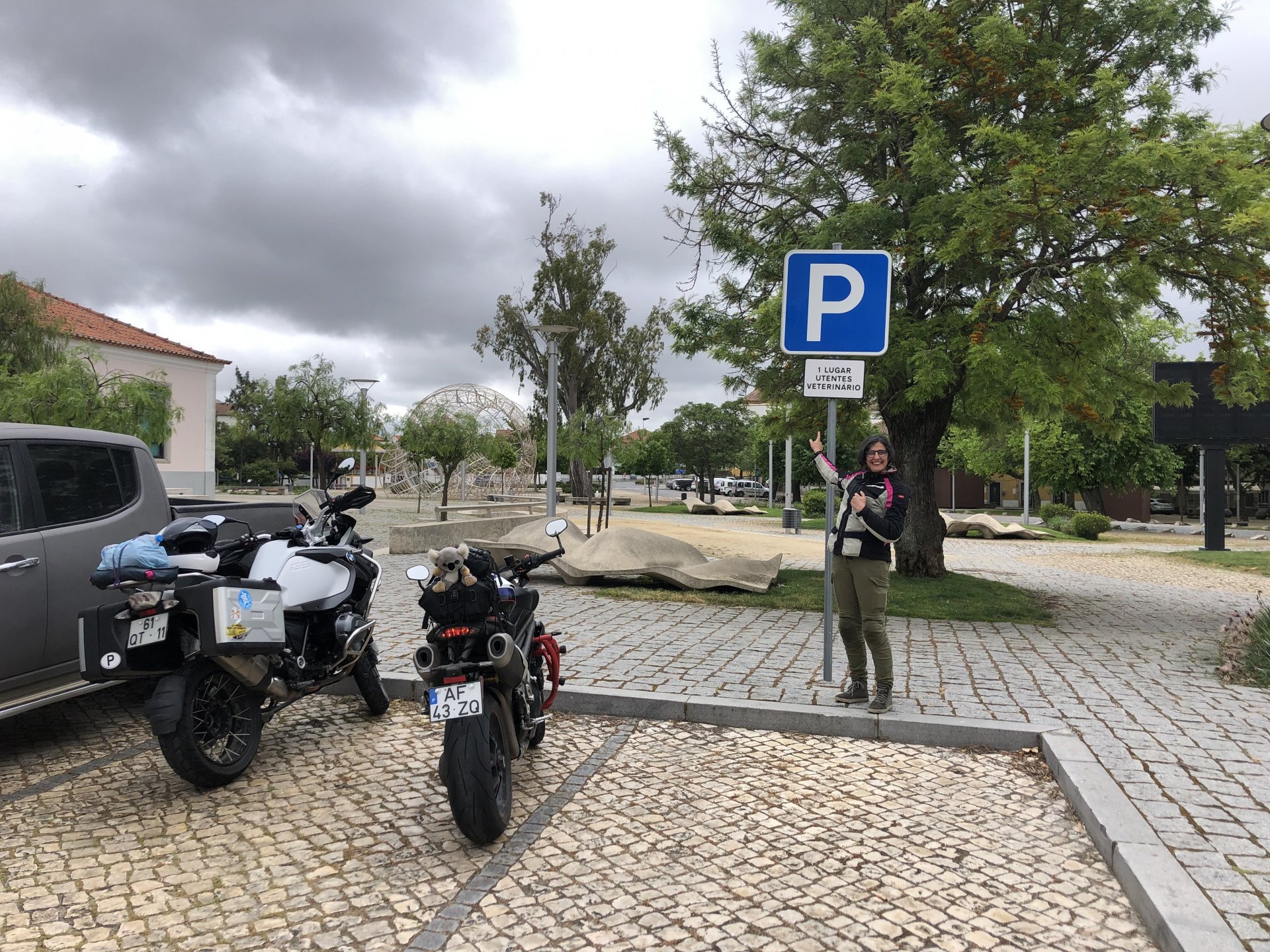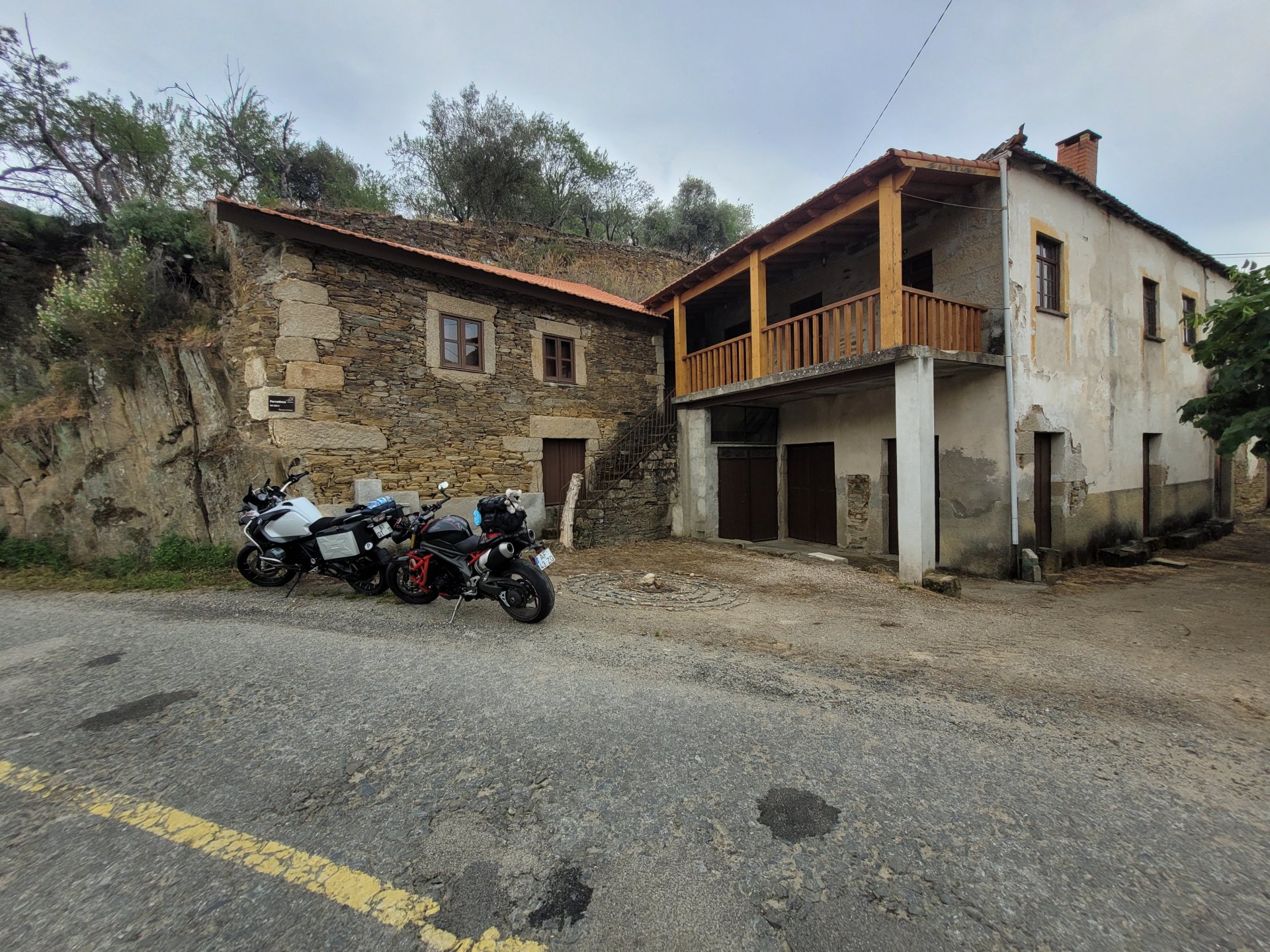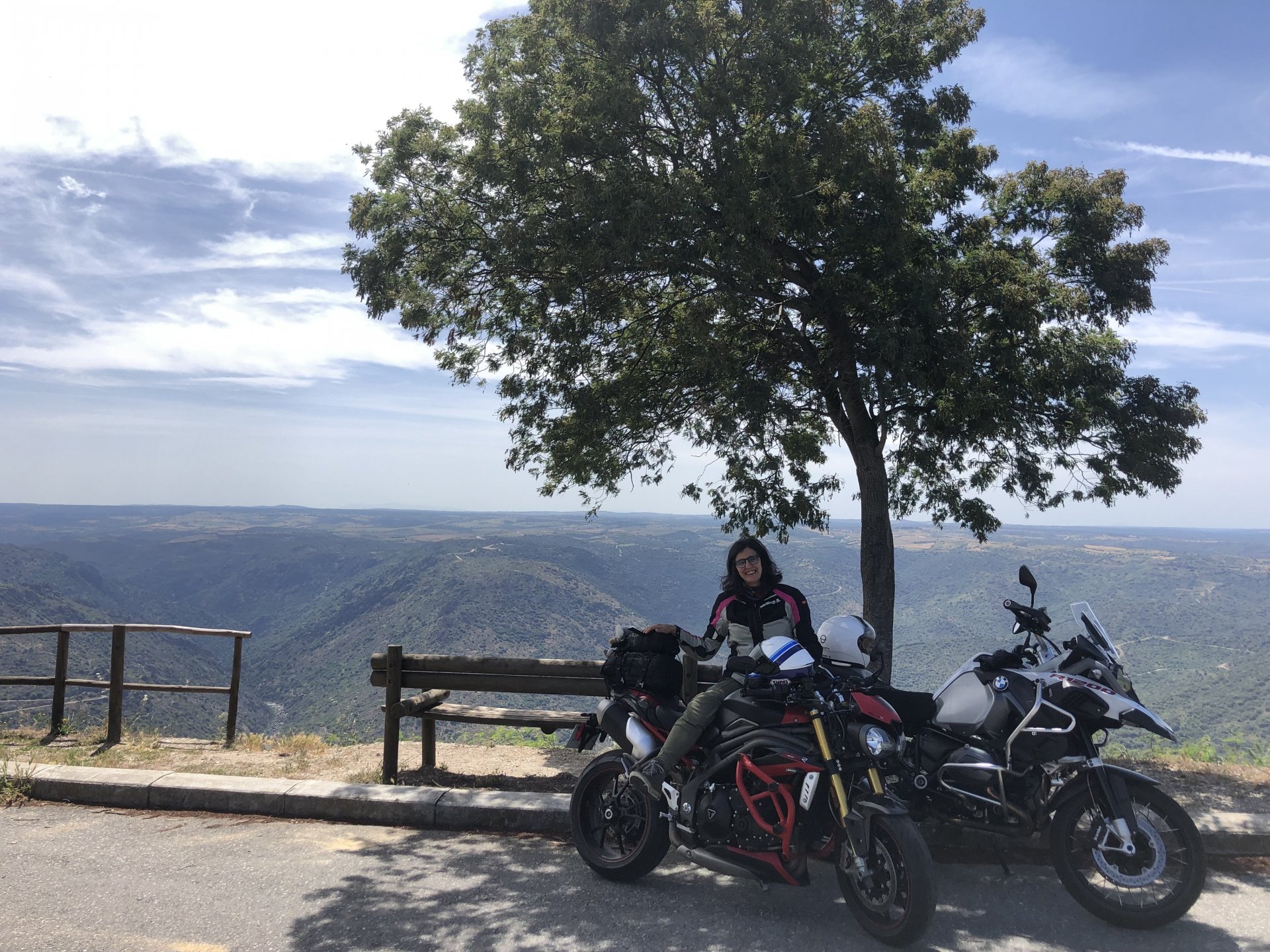 The next day we wake up, put up with an annoying hostess yet a little more and have a pretty mediocre breakfast. The simple but tasty bread rolls from the north replaced with a pretentious person serving tasteless crap. I gave the bikes a wipe to get rid of the most apparent muddy rain drops from the previous afternoon's rain, and we set off, stopping in Rosmaninhal to sort out a navigational miscommunication, and again Sofia finds herself making another friend The tiny municipal road from Rosmaninhal through Tegueiro to Segura is only 25km but it's amazing, and I love it. It's quite narrow so that an average light truck doesn't leave much space for anything else, but it's nice tarmac, often broken in places, with patches of dirt and broken road thrown in. If there was to be a road for trail bikes or supermotos this would be it. I could spend an afternoon riding back and forward there The views couldn't be more different to the previous days' locations up in Trás os Montes and High Douro: Extreme heat and overloaded trucks will do this to tarmac. We got to Segura safe and sound, and went to take a look at the Rio Erges, that's Spain on the other side of the water We started by heading back on the same lovely road we came in before, and I tried to stop for a picture in similar style to the one I took the first time I was there, except the first time I was by myself and at 40º, today with Sofia it was about 18 or 20º and about to rain. I like these worn out by time road marks. Stopped at Nisa for a lunch snack, and Sofia was delighted and envious that the local vet has a parking place reserved for his clients' This Roman bridge has been abandoned from use, but clearly strong enough to handle any load, it's just that the modern two lane road built 50 meters to the side doesn't suit it anymore. It's a shame. The plan was to go home to Ericeira from there, but plans change and instead we made way to Estremoz and then Alter do Chão to sleep in a lovely little hotel built in an old monastery. I ´ve put pictures of all these places before, and sadly took none this time. Dinner in a tiny cafe in Alentejo made up for the previous night's disgrace with a wonderful typical treat, no pictures of that either as the phone was left in the room. Bikes slept soundly inside an old warehouse belonging to the monastery, and after a later than ideal breakfast we were off to go home to the coast. No motorways were meant to be taken, and we did just that. Rode through lovely Alentejo plains and oaks It was starting to warm up when we stopped in Avis for a coffee and a look around: Tiny roads turned to 5 or 6km of dirt road, I had been through there before but I never remember what the surface is like unless it's properly dreadful. Sofia didn't back off and the Speed Triple sailed through smoothly, stopping halfway to look at a stream As we approached Lisbon, we started seeing a lot of bikes, and a lot of foreign ones too. On a short stop we met with some Welsh bikers returning home from watching the Superbikes at the Estoril (Lisbon area). They were riding back to Santander via inner roads, and seemed to be enjoying it immensely, in their late 60s or mid 70s. Someone got really happy from talking to UK people After that, we rode home almost non stop, it was the end of a nice few days mostly filled with wonderful northern Portuguese scenery.2 points