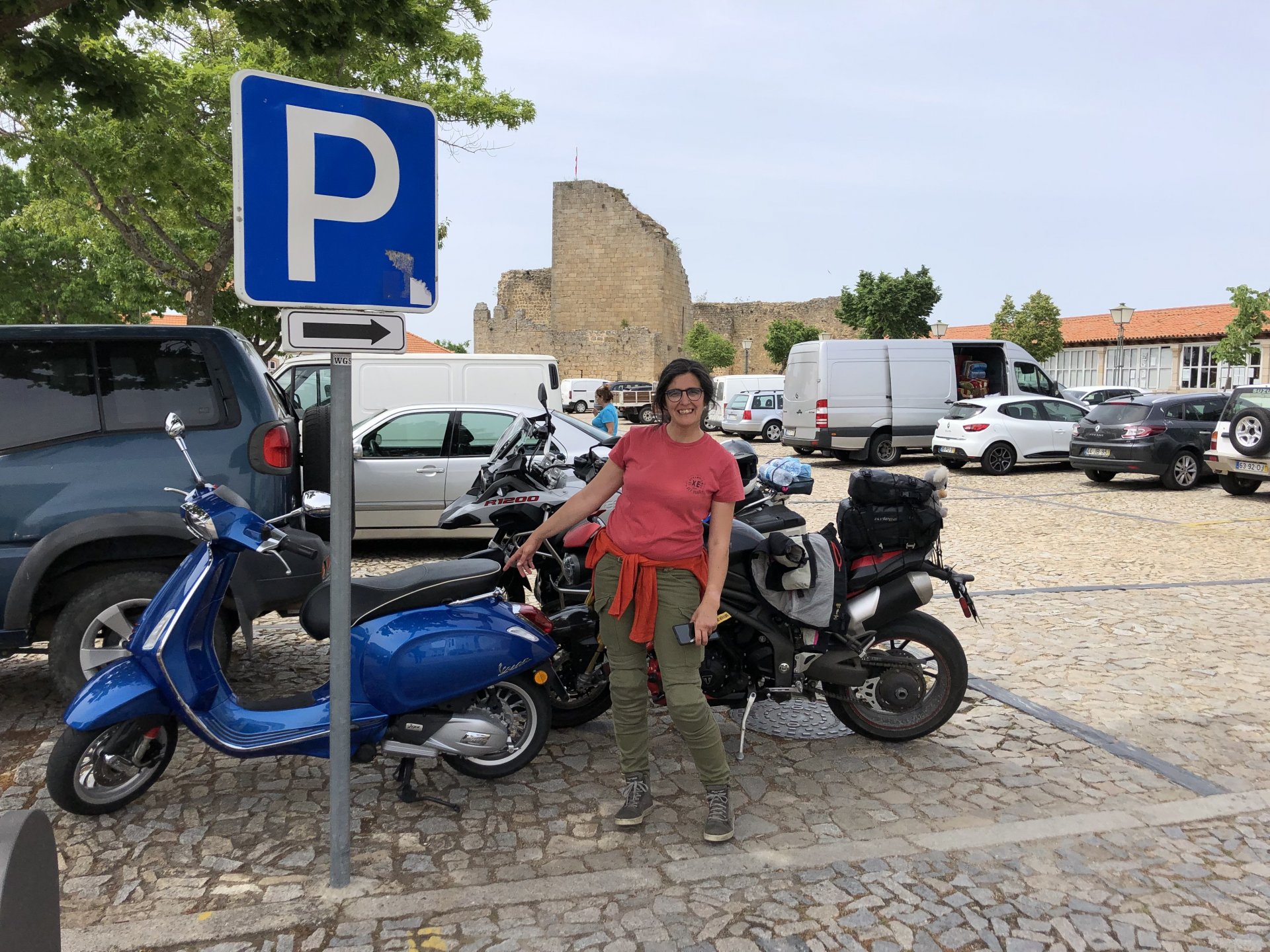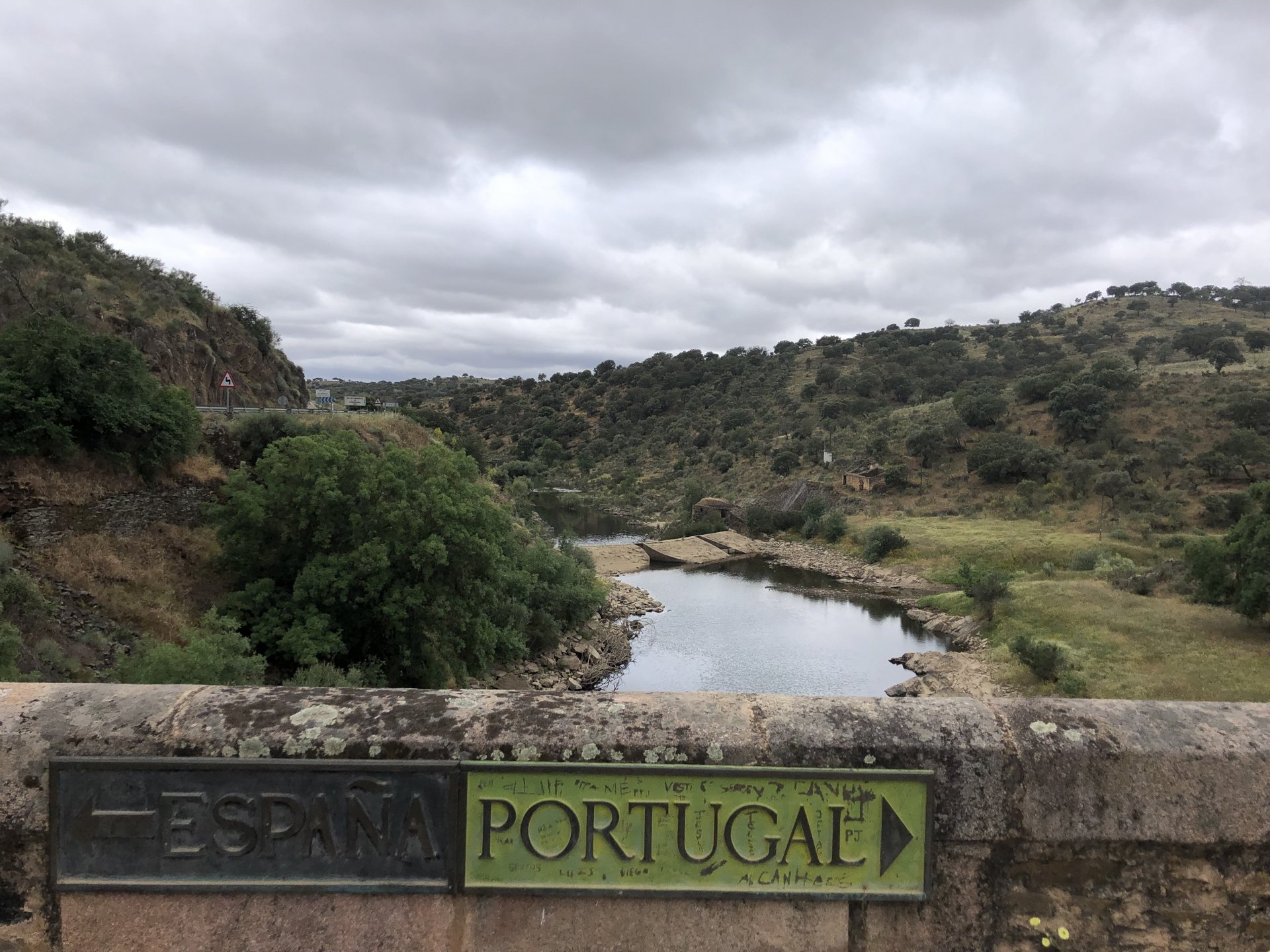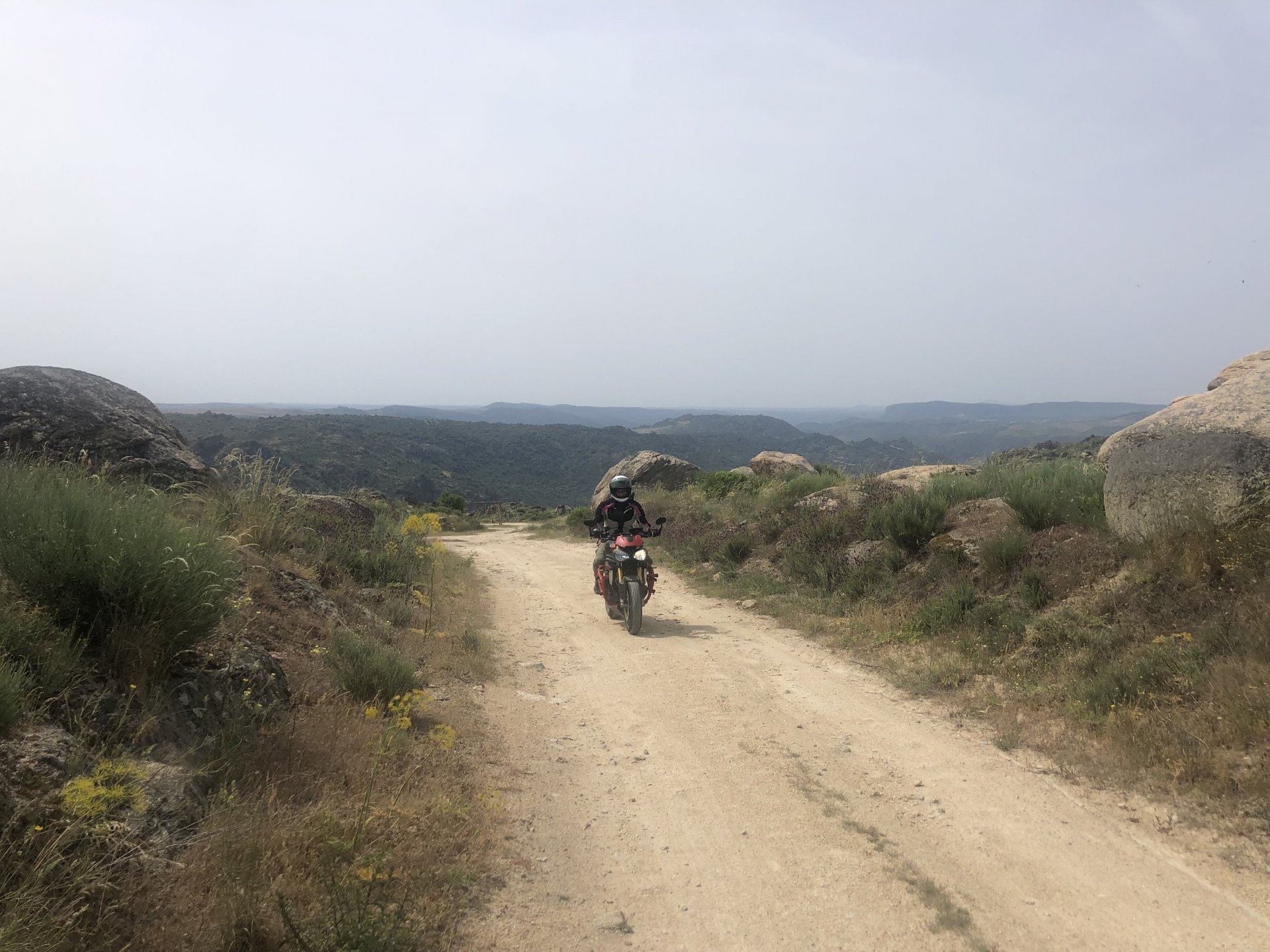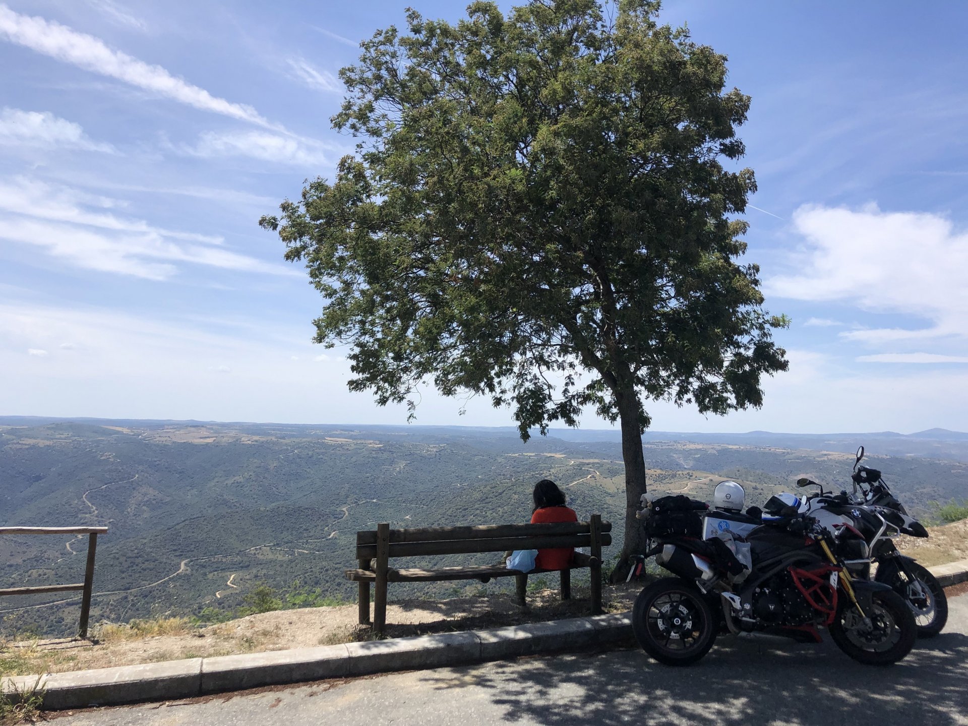 The next day we wake up, put up with an annoying hostess yet a little more and have a pretty mediocre breakfast. The simple but tasty bread rolls from the north replaced with a pretentious person serving tasteless crap. I gave the bikes a wipe to get rid of the most apparent muddy rain drops from the previous afternoon's rain, and we set off, stopping in Rosmaninhal to sort out a navigational miscommunication, and again Sofia finds herself making another friend The tiny municipal road from Rosmaninhal through Tegueiro to Segura is only 25km but it's amazing, and I love it. It's quite narrow so that an average light truck doesn't leave much space for anything else, but it's nice tarmac, often broken in places, with patches of dirt and broken road thrown in. If there was to be a road for trail bikes or supermotos this would be it. I could spend an afternoon riding back and forward there The views couldn't be more different to the previous days' locations up in Trás os Montes and High Douro: Extreme heat and overloaded trucks will do this to tarmac. We got to Segura safe and sound, and went to take a look at the Rio Erges, that's Spain on the other side of the water We started by heading back on the same lovely road we came in before, and I tried to stop for a picture in similar style to the one I took the first time I was there, except the first time I was by myself and at 40º, today with Sofia it was about 18 or 20º and about to rain. I like these worn out by time road marks. Stopped at Nisa for a lunch snack, and Sofia was delighted and envious that the local vet has a parking place reserved for his clients' This Roman bridge has been abandoned from use, but clearly strong enough to handle any load, it's just that the modern two lane road built 50 meters to the side doesn't suit it anymore. It's a shame. The plan was to go home to Ericeira from there, but plans change and instead we made way to Estremoz and then Alter do Chão to sleep in a lovely little hotel built in an old monastery. I ´ve put pictures of all these places before, and sadly took none this time. Dinner in a tiny cafe in Alentejo made up for the previous night's disgrace with a wonderful typical treat, no pictures of that either as the phone was left in the room. Bikes slept soundly inside an old warehouse belonging to the monastery, and after a later than ideal breakfast we were off to go home to the coast. No motorways were meant to be taken, and we did just that. Rode through lovely Alentejo plains and oaks It was starting to warm up when we stopped in Avis for a coffee and a look around: Tiny roads turned to 5 or 6km of dirt road, I had been through there before but I never remember what the surface is like unless it's properly dreadful. Sofia didn't back off and the Speed Triple sailed through smoothly, stopping halfway to look at a stream As we approached Lisbon, we started seeing a lot of bikes, and a lot of foreign ones too. On a short stop we met with some Welsh bikers returning home from watching the Superbikes at the Estoril (Lisbon area). They were riding back to Santander via inner roads, and seemed to be enjoying it immensely, in their late 60s or mid 70s. Someone got really happy from talking to UK people After that, we rode home almost non stop, it was the end of a nice few days mostly filled with wonderful northern Portuguese scenery.2 points