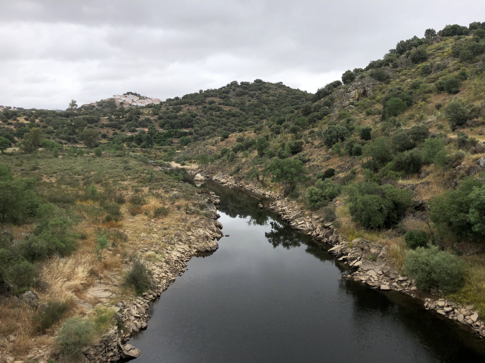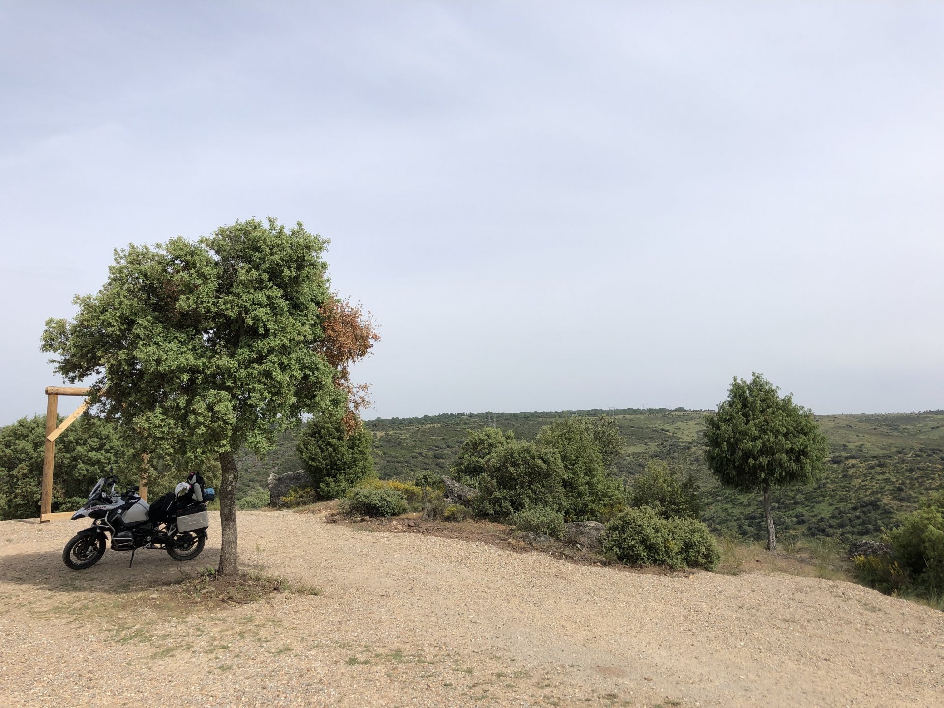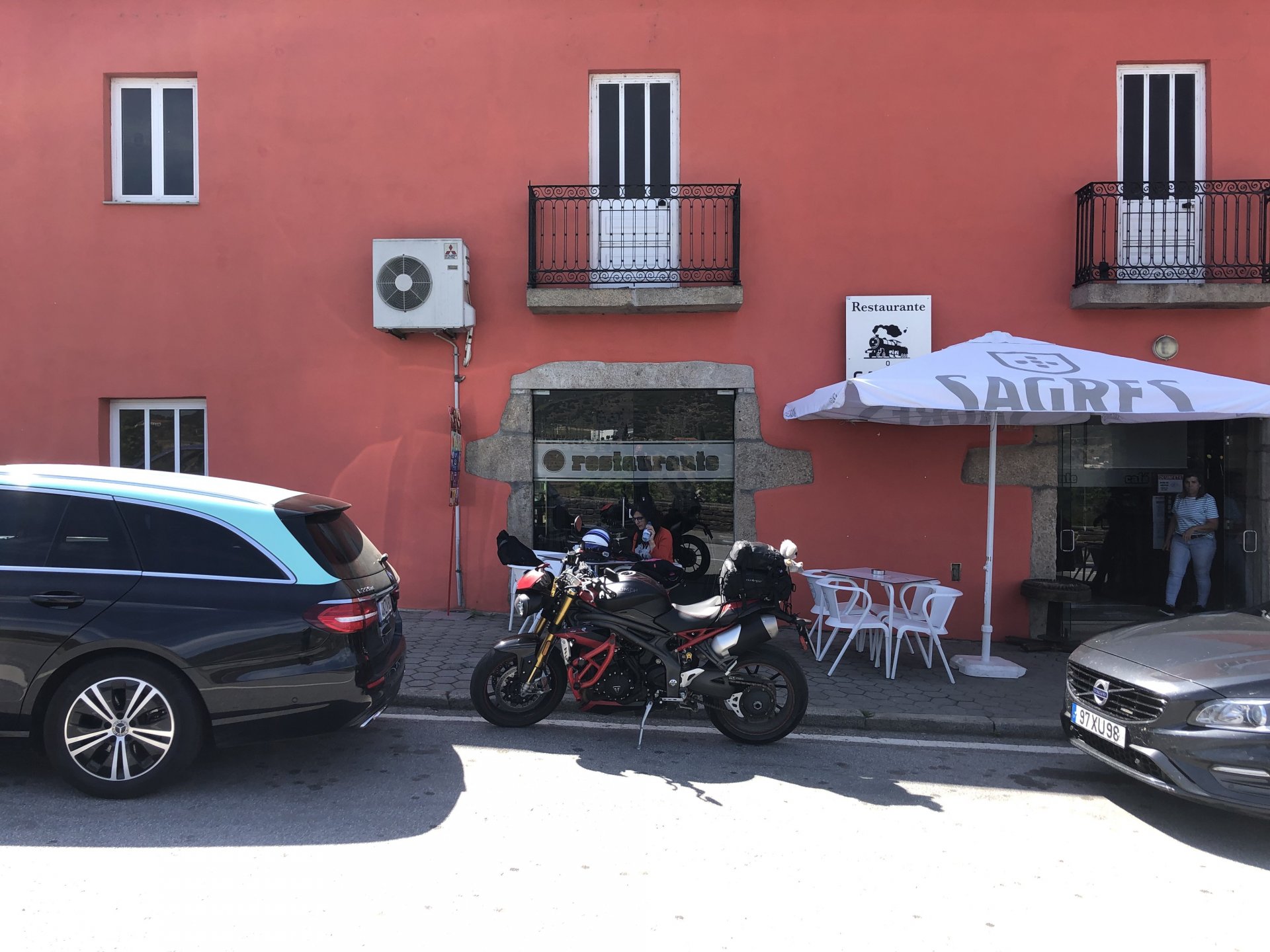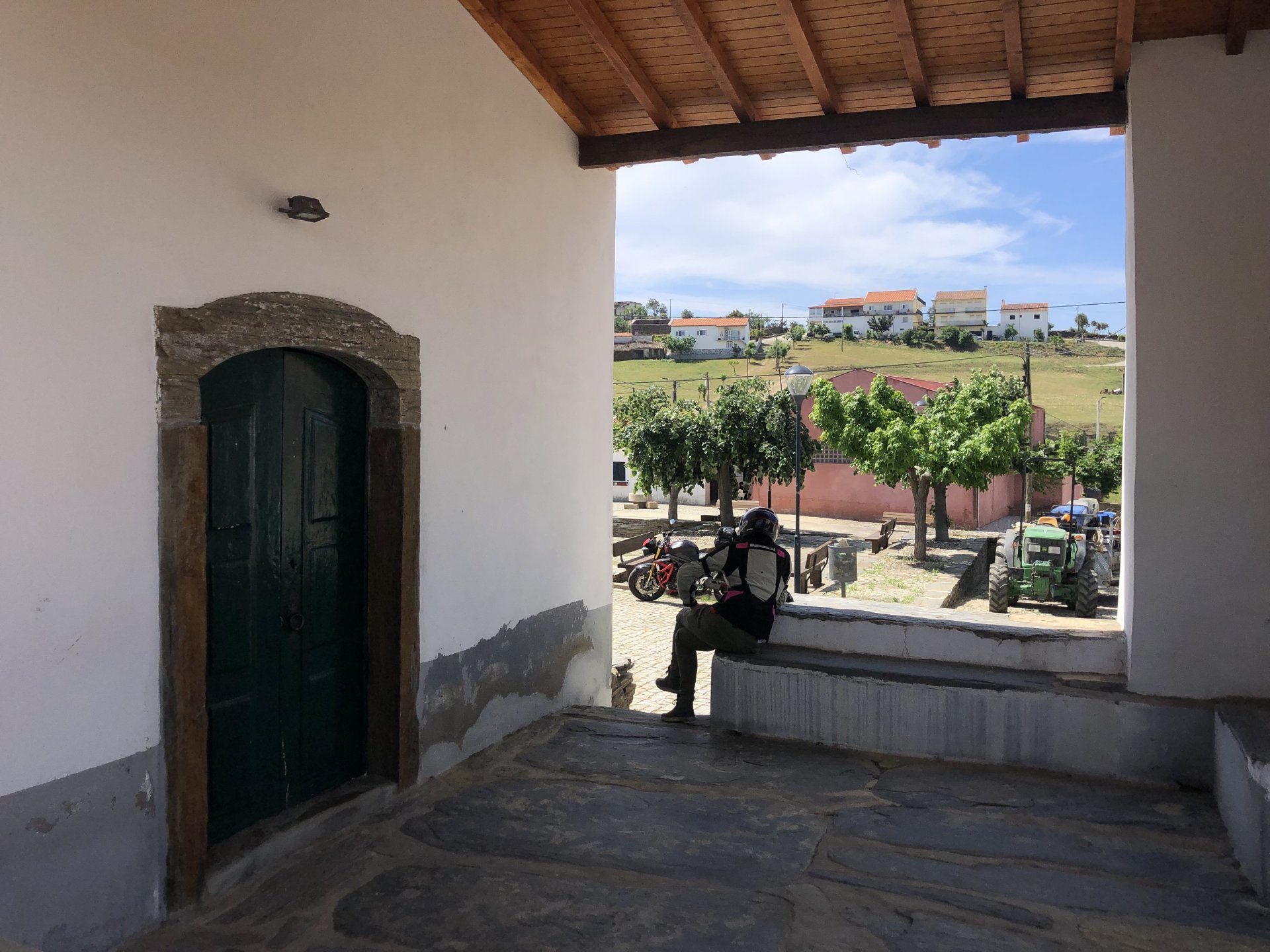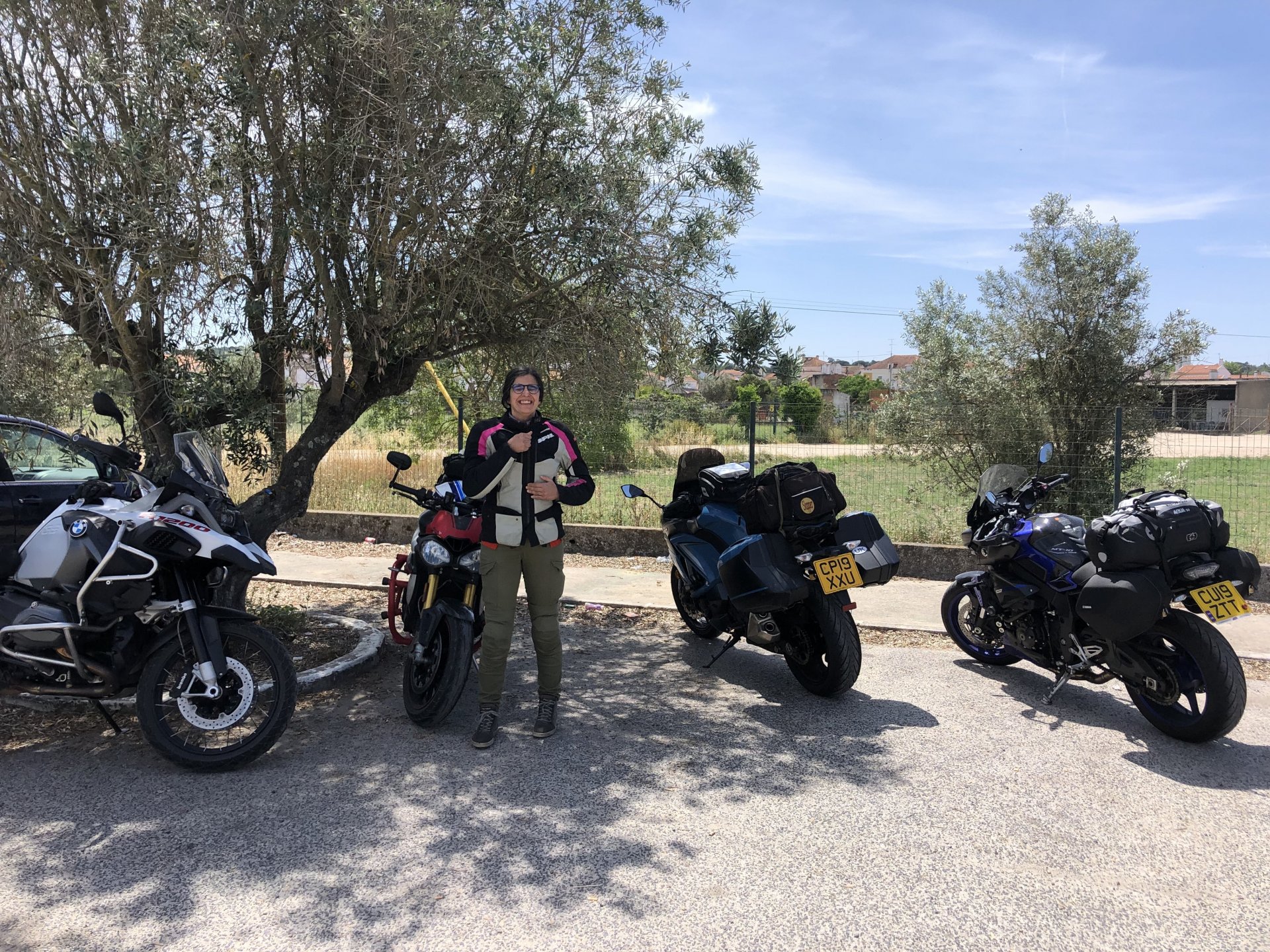 The next day we wake up, put up with an annoying hostess yet a little more and have a pretty mediocre breakfast. The simple but tasty bread rolls from the north replaced with a pretentious person serving tasteless crap. I gave the bikes a wipe to get rid of the most apparent muddy rain drops from the previous afternoon's rain, and we set off, stopping in Rosmaninhal to sort out a navigational miscommunication, and again Sofia finds herself making another friend The tiny municipal road from Rosmaninhal through Tegueiro to Segura is only 25km but it's amazing, and I love it. It's quite narrow so that an average light truck doesn't leave much space for anything else, but it's nice tarmac, often broken in places, with patches of dirt and broken road thrown in. If there was to be a road for trail bikes or supermotos this would be it. I could spend an afternoon riding back and forward there The views couldn't be more different to the previous days' locations up in Trás os Montes and High Douro: Extreme heat and overloaded trucks will do this to tarmac. We got to Segura safe and sound, and went to take a look at the Rio Erges, that's Spain on the other side of the water We started by heading back on the same lovely road we came in before, and I tried to stop for a picture in similar style to the one I took the first time I was there, except the first time I was by myself and at 40º, today with Sofia it was about 18 or 20º and about to rain. I like these worn out by time road marks. Stopped at Nisa for a lunch snack, and Sofia was delighted and envious that the local vet has a parking place reserved for his clients' This Roman bridge has been abandoned from use, but clearly strong enough to handle any load, it's just that the modern two lane road built 50 meters to the side doesn't suit it anymore. It's a shame. The plan was to go home to Ericeira from there, but plans change and instead we made way to Estremoz and then Alter do Chão to sleep in a lovely little hotel built in an old monastery. I ´ve put pictures of all these places before, and sadly took none this time. Dinner in a tiny cafe in Alentejo made up for the previous night's disgrace with a wonderful typical treat, no pictures of that either as the phone was left in the room. Bikes slept soundly inside an old warehouse belonging to the monastery, and after a later than ideal breakfast we were off to go home to the coast. No motorways were meant to be taken, and we did just that. Rode through lovely Alentejo plains and oaks It was starting to warm up when we stopped in Avis for a coffee and a look around: Tiny roads turned to 5 or 6km of dirt road, I had been through there before but I never remember what the surface is like unless it's properly dreadful. Sofia didn't back off and the Speed Triple sailed through smoothly, stopping halfway to look at a stream As we approached Lisbon, we started seeing a lot of bikes, and a lot of foreign ones too. On a short stop we met with some Welsh bikers returning home from watching the Superbikes at the Estoril (Lisbon area). They were riding back to Santander via inner roads, and seemed to be enjoying it immensely, in their late 60s or mid 70s. Someone got really happy from talking to UK people After that, we rode home almost non stop, it was the end of a nice few days mostly filled with wonderful northern Portuguese scenery.2 points