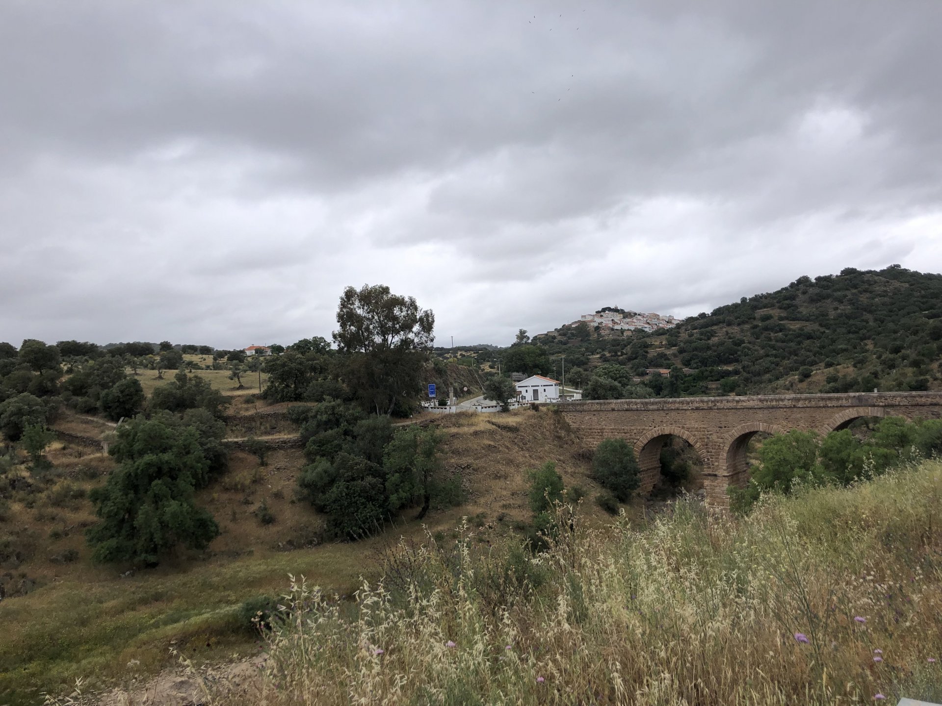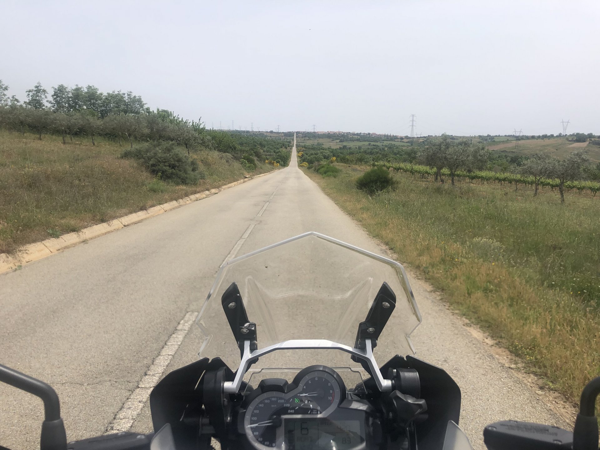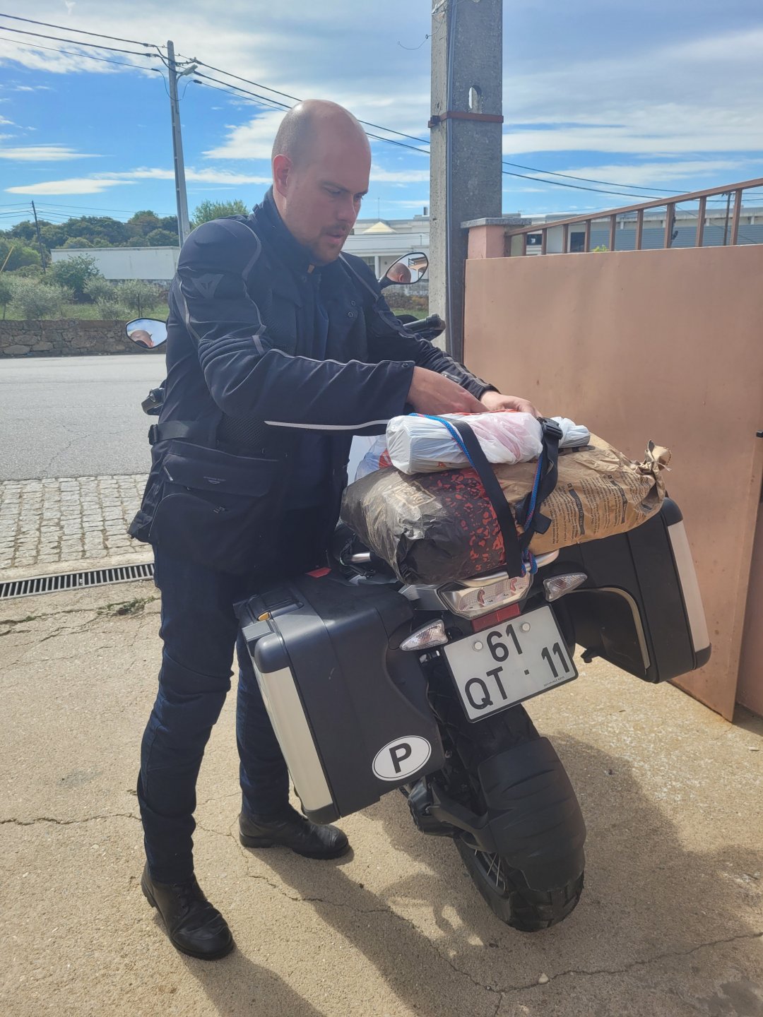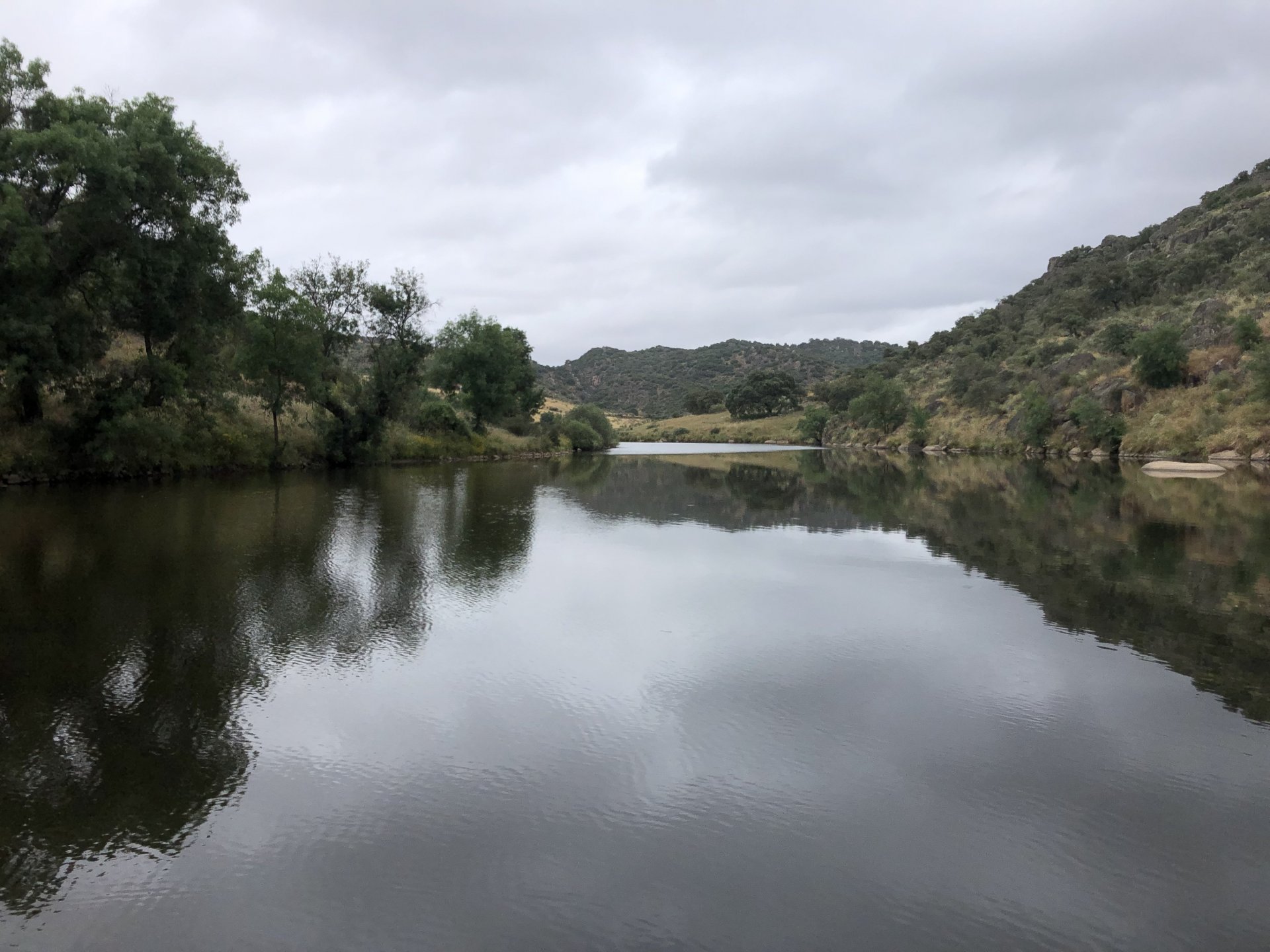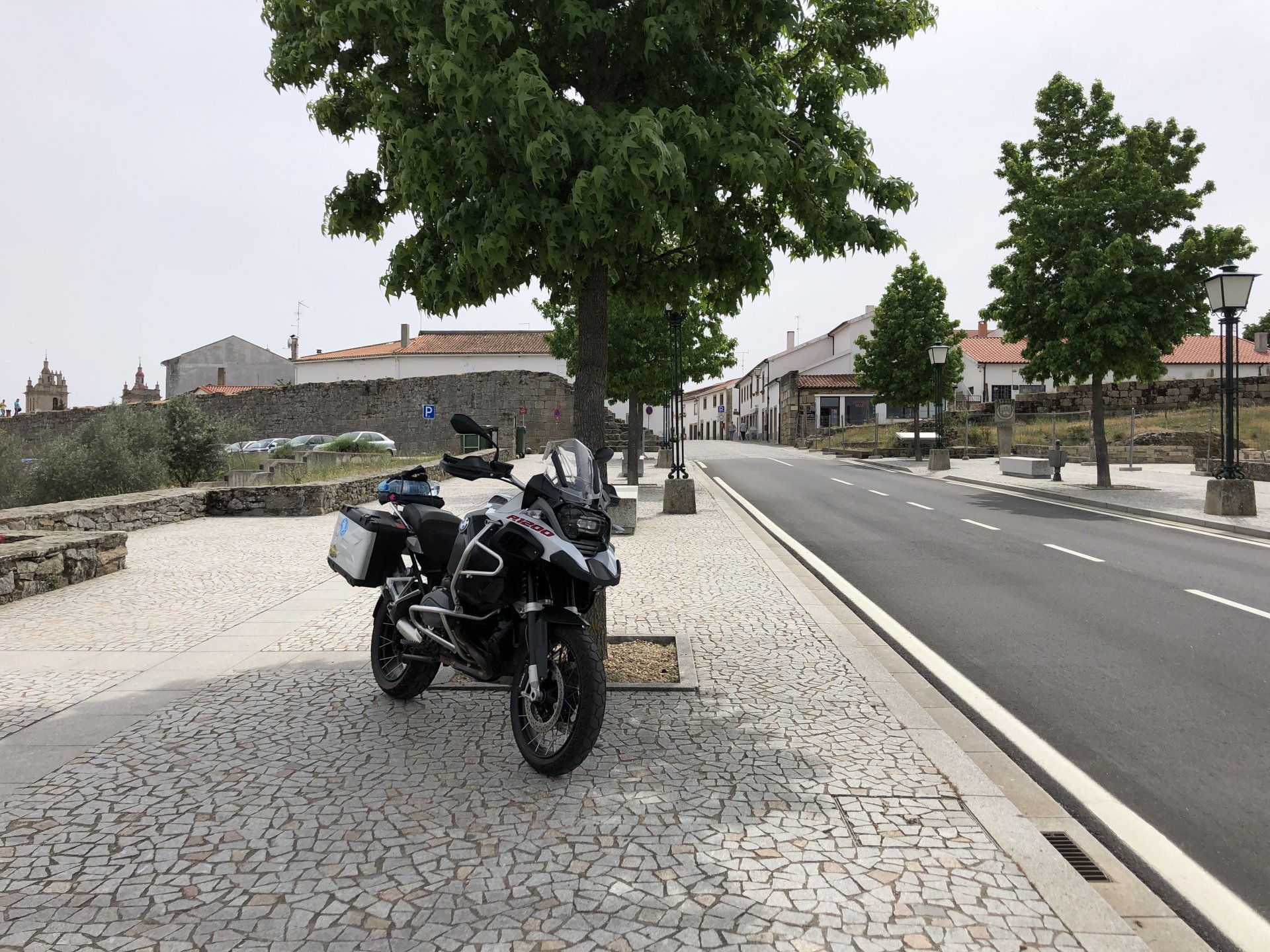 The next day we wake up, put up with an annoying hostess yet a little more and have a pretty mediocre breakfast. The simple but tasty bread rolls from the north replaced with a pretentious person serving tasteless crap. I gave the bikes a wipe to get rid of the most apparent muddy rain drops from the previous afternoon's rain, and we set off, stopping in Rosmaninhal to sort out a navigational miscommunication, and again Sofia finds herself making another friend The tiny municipal road from Rosmaninhal through Tegueiro to Segura is only 25km but it's amazing, and I love it. It's quite narrow so that an average light truck doesn't leave much space for anything else, but it's nice tarmac, often broken in places, with patches of dirt and broken road thrown in. If there was to be a road for trail bikes or supermotos this would be it. I could spend an afternoon riding back and forward there The views couldn't be more different to the previous days' locations up in Trás os Montes and High Douro: Extreme heat and overloaded trucks will do this to tarmac. We got to Segura safe and sound, and went to take a look at the Rio Erges, that's Spain on the other side of the water We started by heading back on the same lovely road we came in before, and I tried to stop for a picture in similar style to the one I took the first time I was there, except the first time I was by myself and at 40º, today with Sofia it was about 18 or 20º and about to rain. I like these worn out by time road marks. Stopped at Nisa for a lunch snack, and Sofia was delighted and envious that the local vet has a parking place reserved for his clients' This Roman bridge has been abandoned from use, but clearly strong enough to handle any load, it's just that the modern two lane road built 50 meters to the side doesn't suit it anymore. It's a shame. The plan was to go home to Ericeira from there, but plans change and instead we made way to Estremoz and then Alter do Chão to sleep in a lovely little hotel built in an old monastery. I ´ve put pictures of all these places before, and sadly took none this time. Dinner in a tiny cafe in Alentejo made up for the previous night's disgrace with a wonderful typical treat, no pictures of that either as the phone was left in the room. Bikes slept soundly inside an old warehouse belonging to the monastery, and after a later than ideal breakfast we were off to go home to the coast. No motorways were meant to be taken, and we did just that. Rode through lovely Alentejo plains and oaks It was starting to warm up when we stopped in Avis for a coffee and a look around: Tiny roads turned to 5 or 6km of dirt road, I had been through there before but I never remember what the surface is like unless it's properly dreadful. Sofia didn't back off and the Speed Triple sailed through smoothly, stopping halfway to look at a stream As we approached Lisbon, we started seeing a lot of bikes, and a lot of foreign ones too. On a short stop we met with some Welsh bikers returning home from watching the Superbikes at the Estoril (Lisbon area). They were riding back to Santander via inner roads, and seemed to be enjoying it immensely, in their late 60s or mid 70s. Someone got really happy from talking to UK people After that, we rode home almost non stop, it was the end of a nice few days mostly filled with wonderful northern Portuguese scenery.2 points
