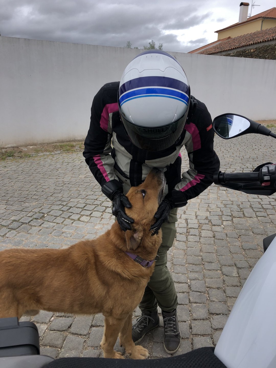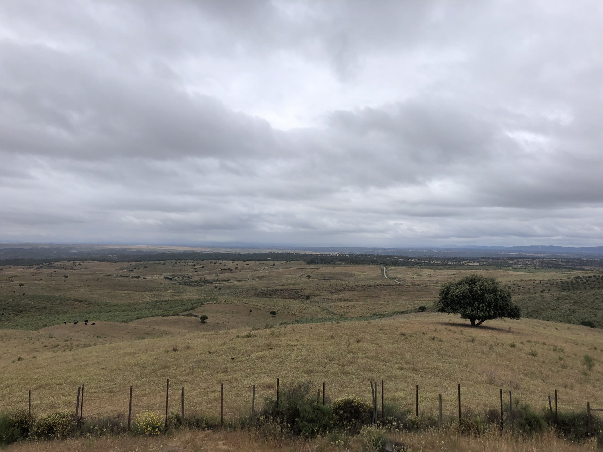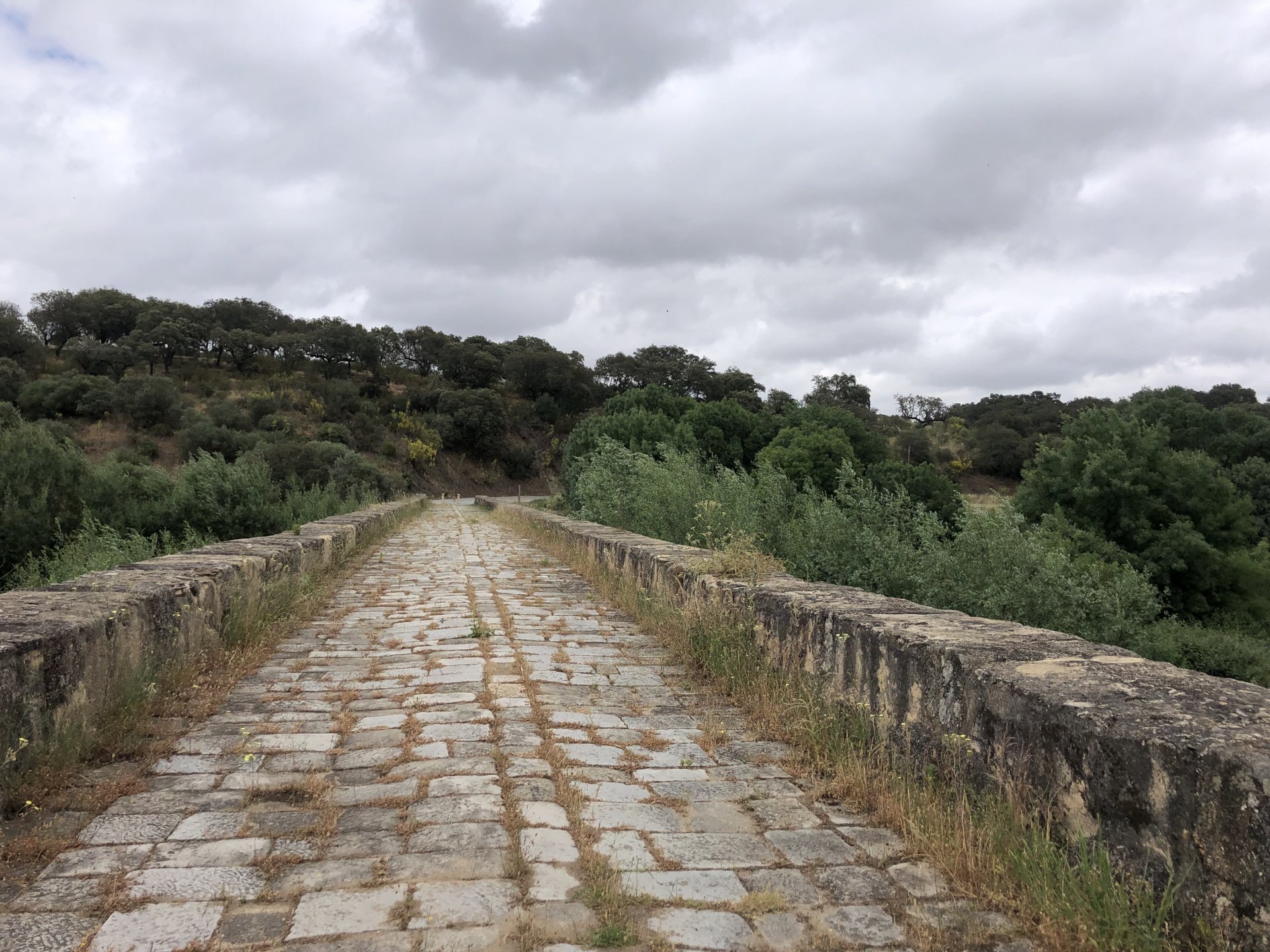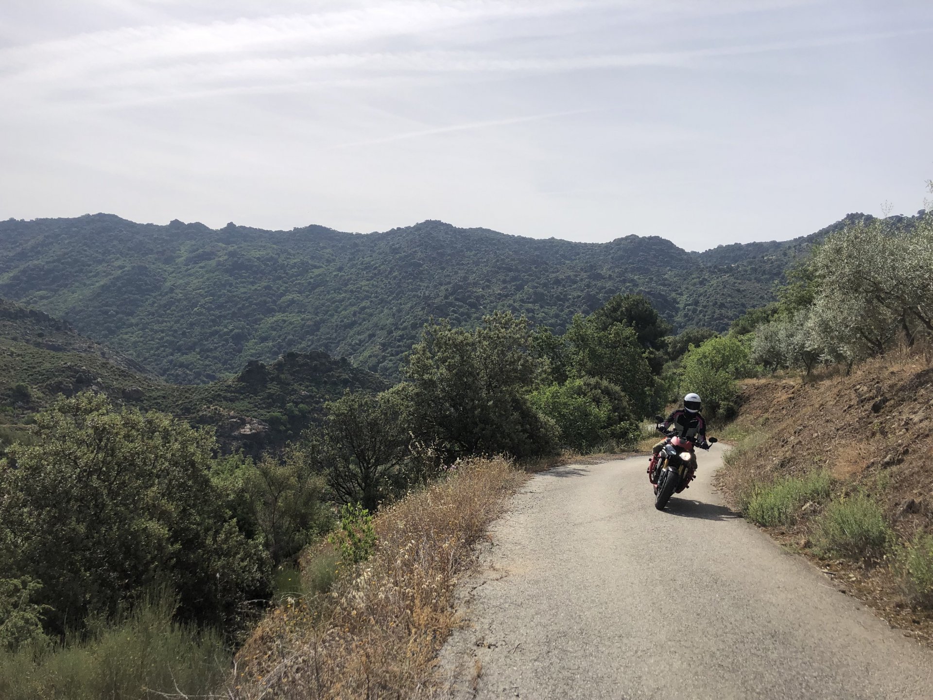 The next day we wake up, put up with an annoying hostess yet a little more and have a pretty mediocre breakfast. The simple but tasty bread rolls from the north replaced with a pretentious person serving tasteless crap. I gave the bikes a wipe to get rid of the most apparent muddy rain drops from the previous afternoon's rain, and we set off, stopping in Rosmaninhal to sort out a navigational miscommunication, and again Sofia finds herself making another friend The tiny municipal road from Rosmaninhal through Tegueiro to Segura is only 25km but it's amazing, and I love it. It's quite narrow so that an average light truck doesn't leave much space for anything else, but it's nice tarmac, often broken in places, with patches of dirt and broken road thrown in. If there was to be a road for trail bikes or supermotos this would be it. I could spend an afternoon riding back and forward there The views couldn't be more different to the previous days' locations up in Trás os Montes and High Douro: Extreme heat and overloaded trucks will do this to tarmac. We got to Segura safe and sound, and went to take a look at the Rio Erges, that's Spain on the other side of the water We started by heading back on the same lovely road we came in before, and I tried to stop for a picture in similar style to the one I took the first time I was there, except the first time I was by myself and at 40º, today with Sofia it was about 18 or 20º and about to rain. I like these worn out by time road marks. Stopped at Nisa for a lunch snack, and Sofia was delighted and envious that the local vet has a parking place reserved for his clients' This Roman bridge has been abandoned from use, but clearly strong enough to handle any load, it's just that the modern two lane road built 50 meters to the side doesn't suit it anymore. It's a shame. The plan was to go home to Ericeira from there, but plans change and instead we made way to Estremoz and then Alter do Chão to sleep in a lovely little hotel built in an old monastery. I ´ve put pictures of all these places before, and sadly took none this time. Dinner in a tiny cafe in Alentejo made up for the previous night's disgrace with a wonderful typical treat, no pictures of that either as the phone was left in the room. Bikes slept soundly inside an old warehouse belonging to the monastery, and after a later than ideal breakfast we were off to go home to the coast. No motorways were meant to be taken, and we did just that. Rode through lovely Alentejo plains and oaks It was starting to warm up when we stopped in Avis for a coffee and a look around: Tiny roads turned to 5 or 6km of dirt road, I had been through there before but I never remember what the surface is like unless it's properly dreadful. Sofia didn't back off and the Speed Triple sailed through smoothly, stopping halfway to look at a stream As we approached Lisbon, we started seeing a lot of bikes, and a lot of foreign ones too. On a short stop we met with some Welsh bikers returning home from watching the Superbikes at the Estoril (Lisbon area). They were riding back to Santander via inner roads, and seemed to be enjoying it immensely, in their late 60s or mid 70s. Someone got really happy from talking to UK people After that, we rode home almost non stop, it was the end of a nice few days mostly filled with wonderful northern Portuguese scenery.2 points