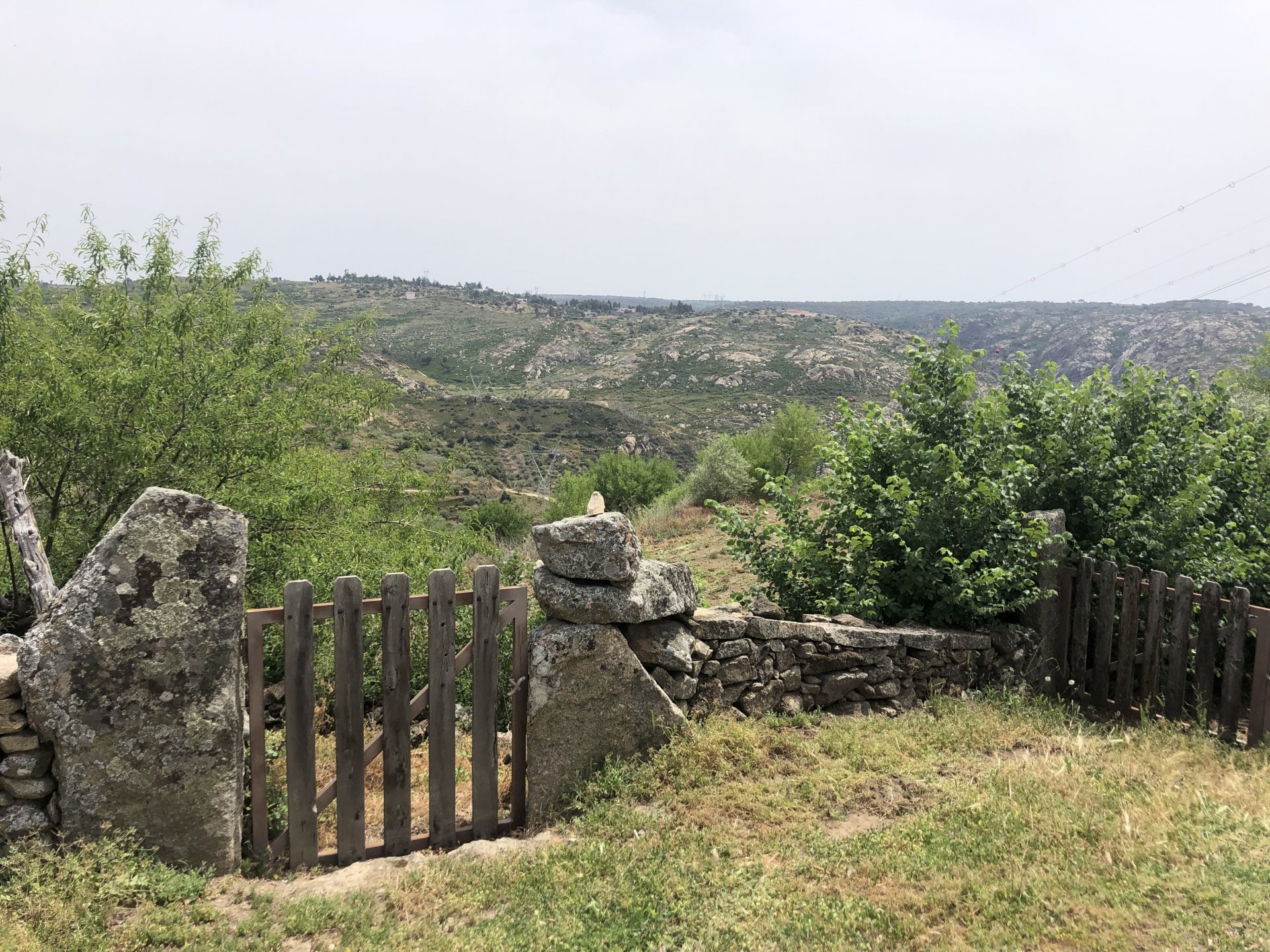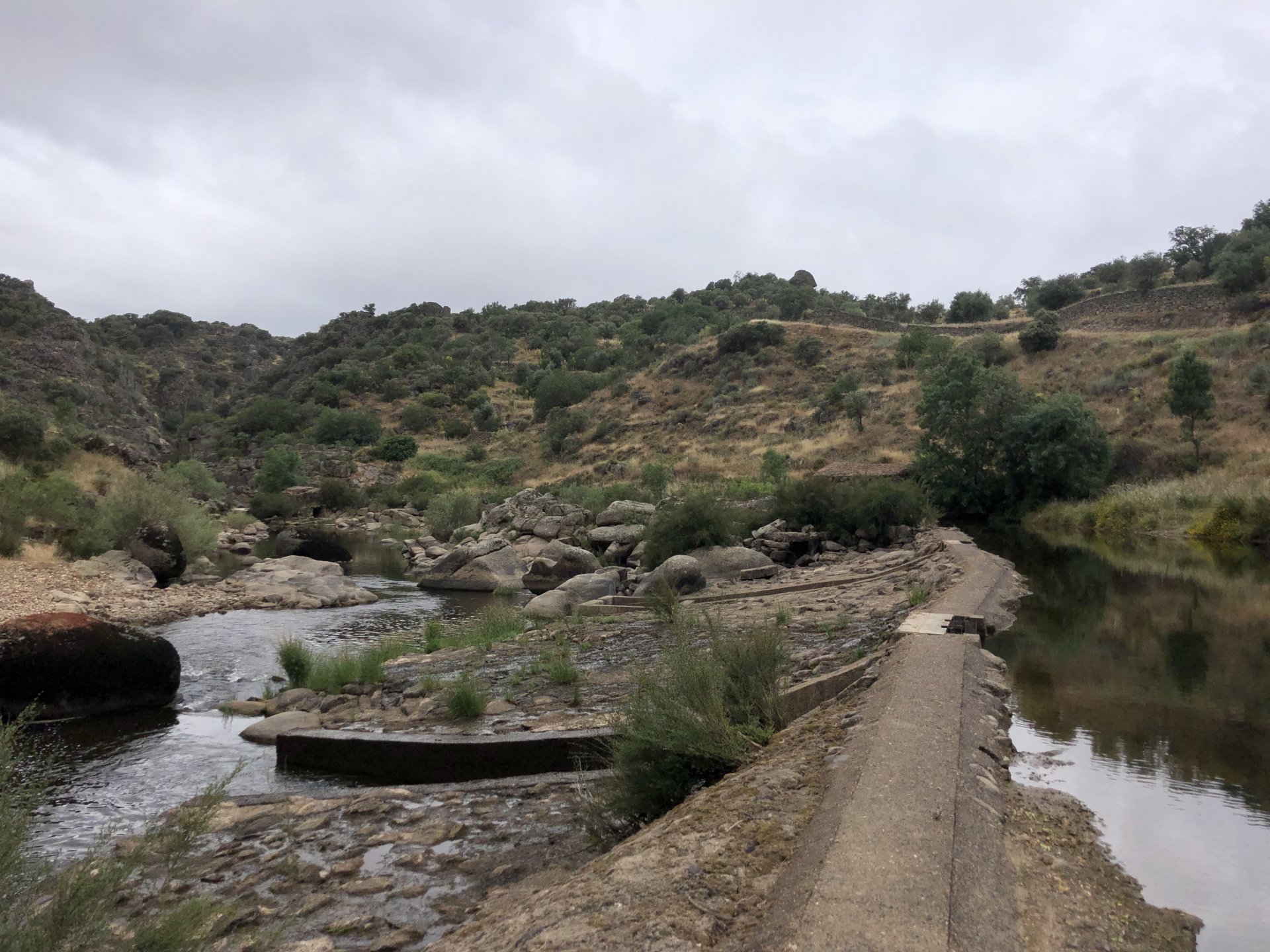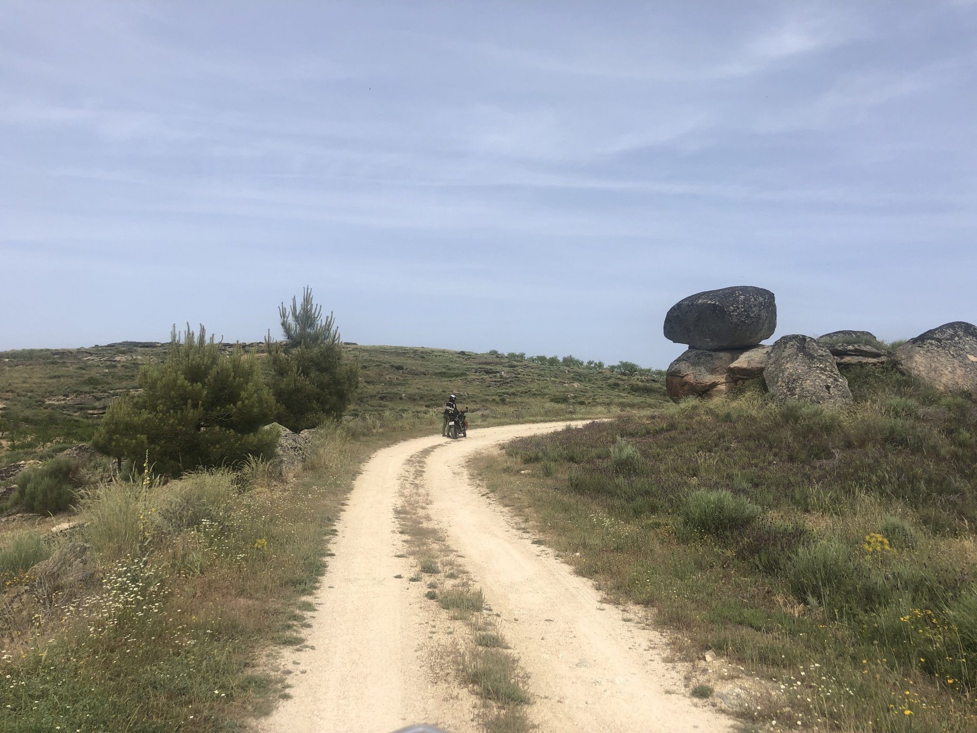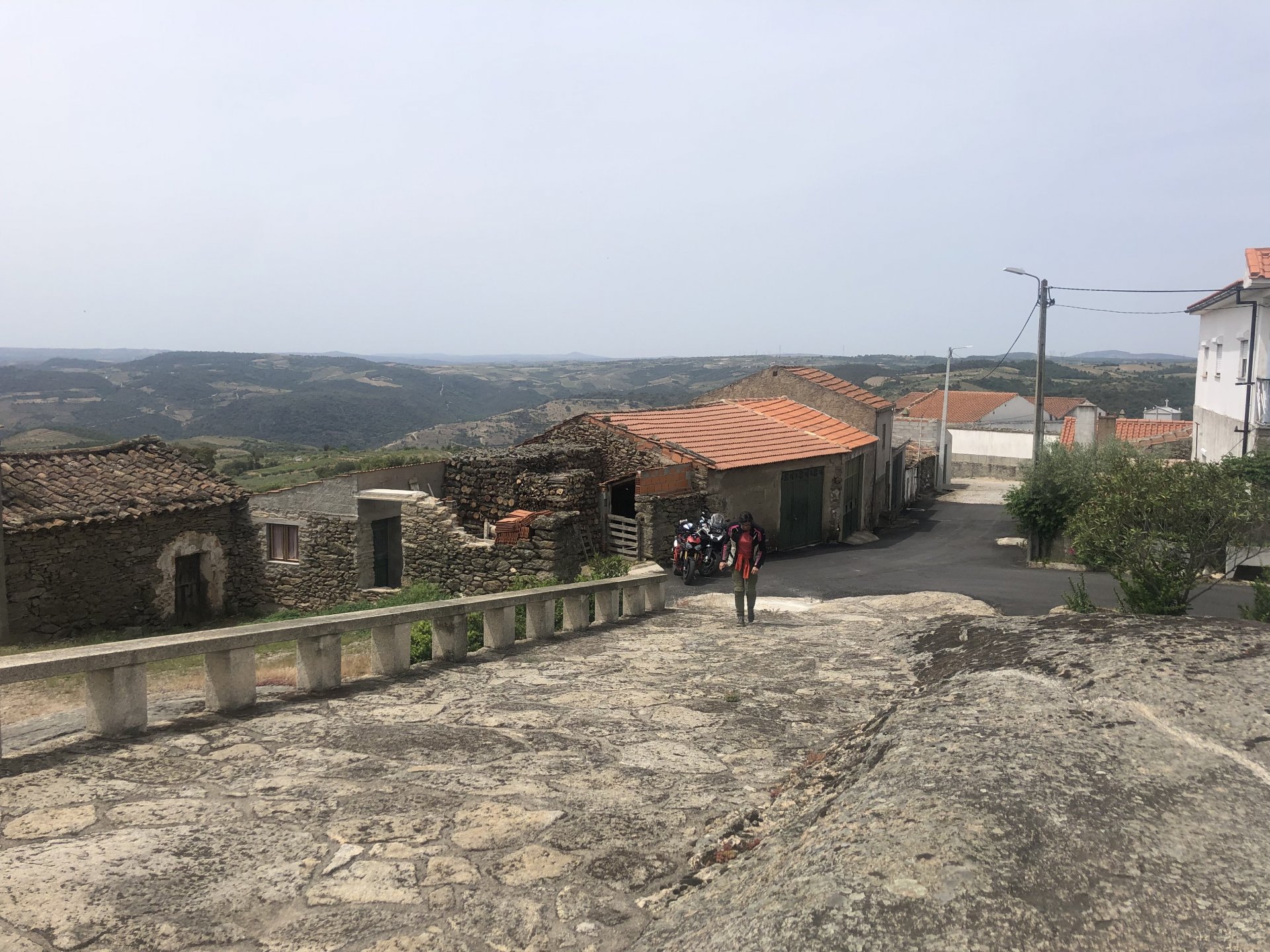 Continuing, we woke up to a warm morning in Freixo de Espada à Cinta, stopped by the local pharmacy for some chapstick, I wanted to get some more potent anti histaminic nasal spray but there's nothing stronger than what I got. One thing that bothered me a bit over the previous days were my polen allergies, whenever we went near blooming olive trees or some kinds of fields it hits hard. 20 or 30 minutes North of where we started, along the N221, we take a detour to Mazouco, and ride down to the riverside to check something quite special. After a short walk down a narrow path leading right next to the water, we find the Cavalo de Mazouco. The engraving of this horse, or probably mare, is probably Europe's oldest open air art work. It's over 10.000 years old and only really noticed by the general public in the 70s. Back then the water level was lower, too. Quite the view, at the little horse's place After a few minutes taking in the sights, with the grey overcast skies kind of ruining the pictures, we made way north, again another 20 or 30 minutes to another view point via back roads: After a km or so of nice smooth dirt road, we reach one of the highlights of the trip, the Carrascalinhos Viewpoint at Fornos. It was impressive both for it's views over the river, but more so because of the number of Vultures and Griffons we saw, never had I seen so many in one place. At over 2 meters wingspan they are impressive when they fly near you. The shadow they cast is like one of a small airplane, we stayed for a while. My phone doesn't make them justice, but here it goes anyway. Being sat on a rock for a while, bugs almost instantly started crawling over me, like this weirdly colored beetle and a tiny caterpillar that was put back onto some vegetation. Next to Penedo Durão, the viewpoint of Carrascalinho is the other obligatory stop if you're passing by this area. The N221 from Miranda do Douro all the way to Barca de Alva a must, with all it's little detours. We headed north yet again, getting out of the more hilly Douro and towards a more typical Trás os Montes landscape, a hilly Altiplano with huge rocks thrown all over the place. Another stop at Bemposta, this time for lunch. We had a little look over the viewpoint, surrounded by houses appearing to be older than time, and stopped at a local café. I wanted Sofia to be amongst the locals so we went somewhere with a few construction trucks parked in front, the accent they speak with here is incredibly different to what Sofia is used to in the Lisbon area it's funny. In fact, Miranda do Douro has it's own language, called Mirandês, with it 's own vocabulary and taught as a second language in the area. In some villages, it is still a first language amongst older people. Hearty portions in this part of the country, I went inside to order and the girl was a little shocked that both of us would share a portion. I have no pictures of said food, but we left with a full stomach. Had a few laughs with the guys there, and were ready for a full afternoon. Half an hour of riding, and another stop, this time at the preserved village of Picote. The place has been meticulously restored and was a pleasure to walk through, even the fields' entries were nice, this didn't really feel like Portugal as it's usually a bit rougher. A great place to see and maybe next time a sleepover location. It was getting proper hot though, at maybe 33 or 35º. Quite fun to see all the signs in Mirandês instead of Portuguese. Eventually, we rode off and arrived at Miranda do Douro, parked in the old town next to a shiny scooter and went to buy some souvenirs. Miranda do Douro is a lovely place, I shall stay longer next time. From Miranda do Douro we went to Paradela, just a 15 or 20 minute ride but it's the place where the river enters Portugal, we went and visited the northernmost place in this trip. Getting there it was proper hot, so stopped for an icecream, some water and a coffee at a local country style café. Sofia made a sensation with the café owner and her mother. They have family everywhere, near where I'm from, where Sofia lives, all over Portugal, and took great pride in showing off her husband's ZZR1100 on top of which they went to France and toured around a few years ago. Northern hospitality: We left the Speed Triple behind and rode the 4 or 5km dirt road to the last Douro lookout on the GS. It was quite hot and dusty, the loose gravel wouldn't have been much fun on the Triumph. A nice place to visit. The dam in the picture above is still in the spanish side, flowing over a trickle of water it might or might not be one of the reasons much of the north is in a draught currently. We said goodbye to the border and rode heading to Alfandega da Fé. The weather was quite hot but threatening to rain, progress now was faster and the roads allowed a constant speed over 100kmh to be easily done. Quick stop to take a picture of an ancient harvester, just casually parked in the middle of a field: A quick stop in Vimioso to figure out where to sleep, and realize the landscape had changed dramatically in only a few kms We rode into Morais at around 19:00 I think, after a long day of short rides and amazing scenery. The surprise heat wave made it a little harder than it had to be, but all was cool. Morais is a tiny town and we were to sleep in a small place, the owner showed up to get paid for the room and left us to ourselves, being the only guests and breakfast available on the café across the street we should just close the door behind us in the morning. The bikes splept outside and the big GS made sure the Triumph couldn't be messed with. A little walk around before dinner looking for an ATM, revealed Sr. Morais' old house, the town founder long gone and his place is left there waiting for someone to do something with it. We had dinner in a small bbq place, inside as the mosquitoes were relentless outside. We stayed in and drank cold wine and chatted almost till they we