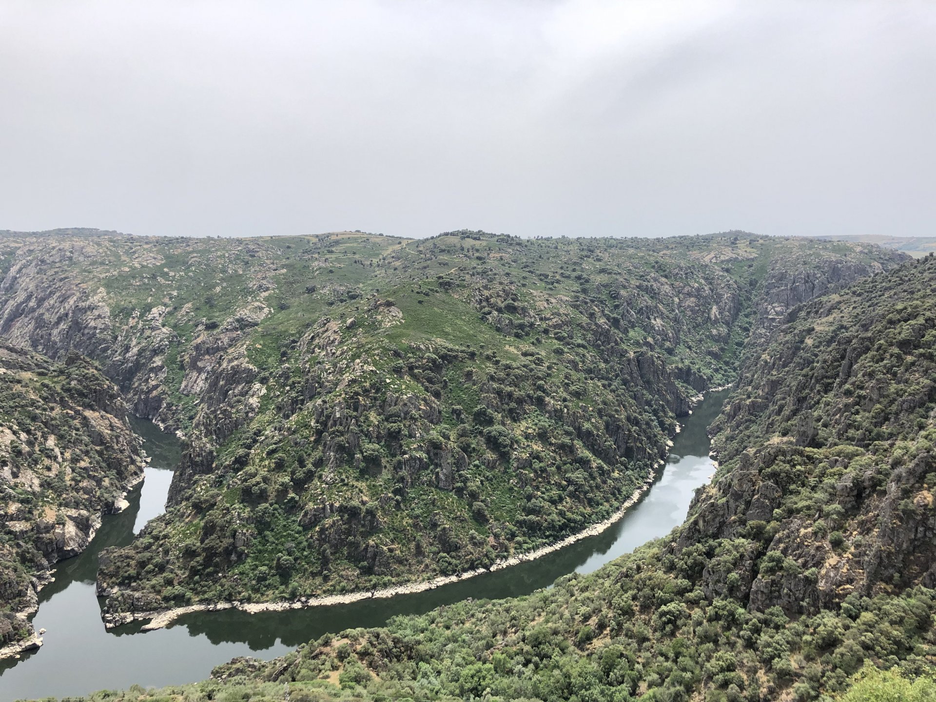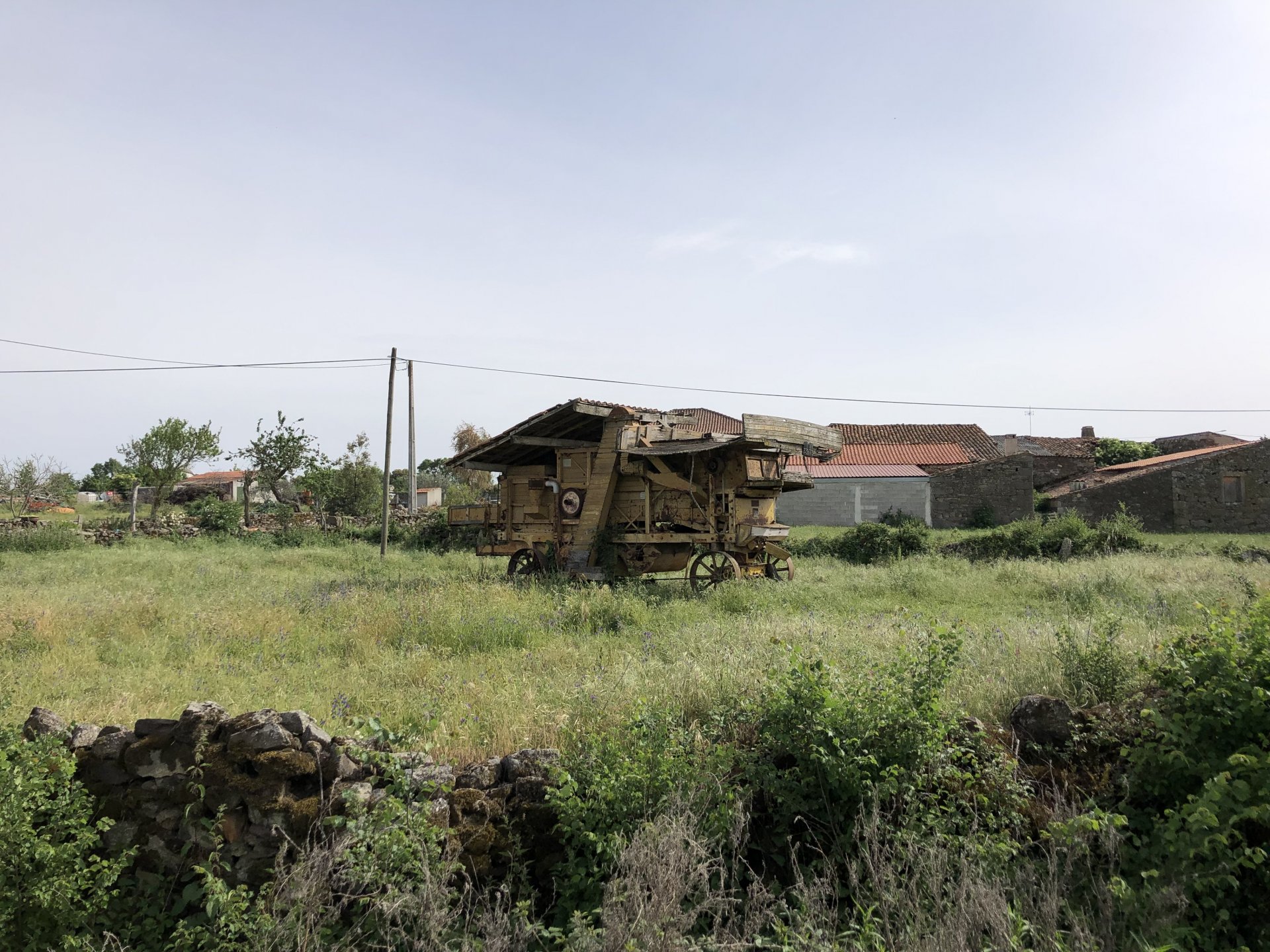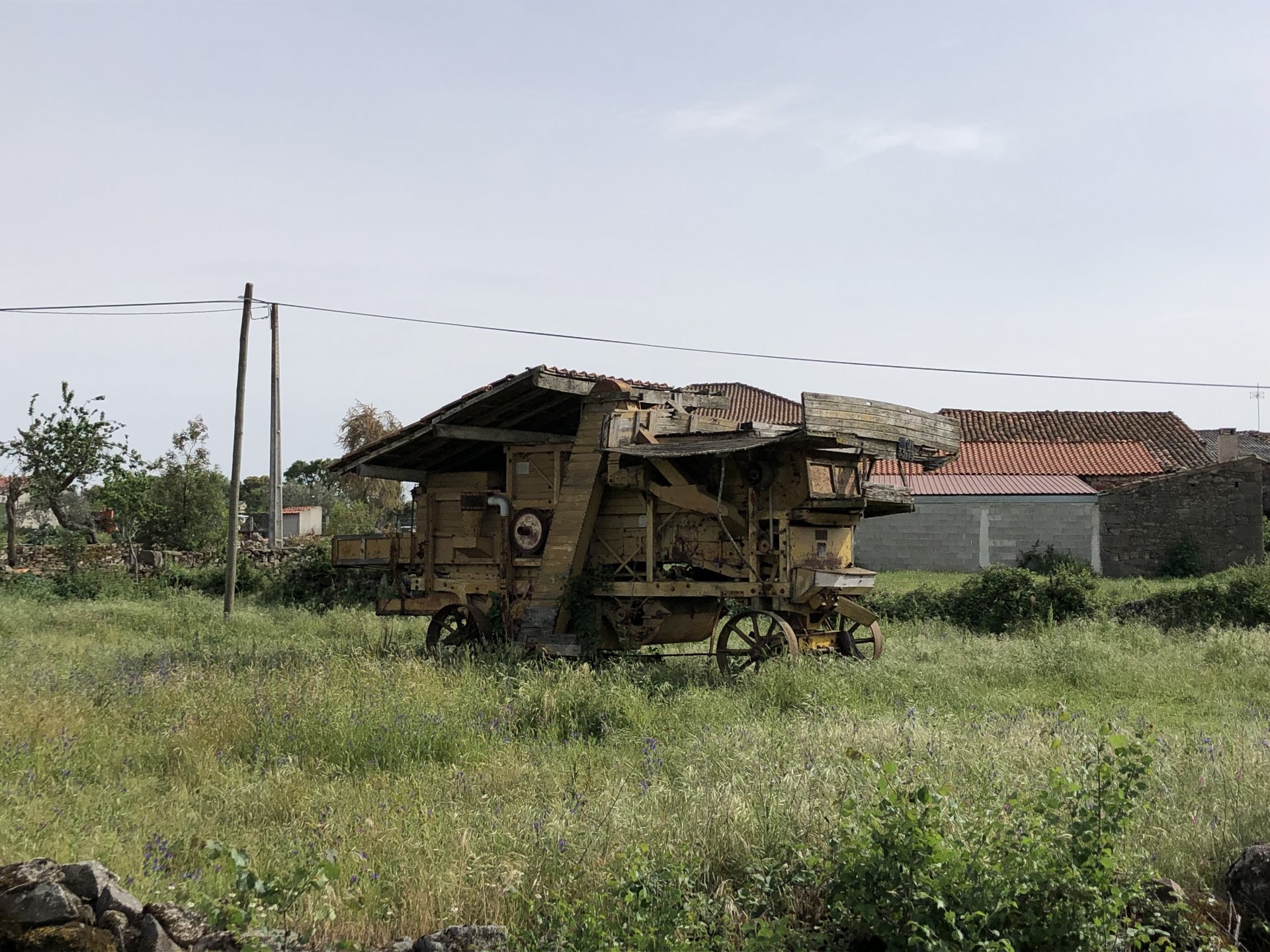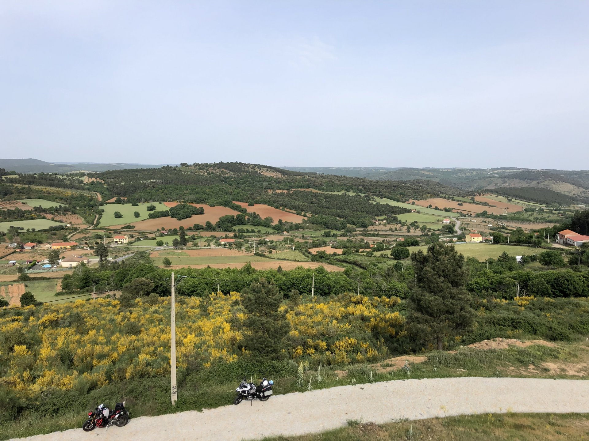 Continuing, we woke up to a warm morning in Freixo de Espada à Cinta, stopped by the local pharmacy for some chapstick, I wanted to get some more potent anti histaminic nasal spray but there's nothing stronger than what I got. One thing that bothered me a bit over the previous days were my polen allergies, whenever we went near blooming olive trees or some kinds of fields it hits hard. 20 or 30 minutes North of where we started, along the N221, we take a detour to Mazouco, and ride down to the riverside to check something quite special. After a short walk down a narrow path leading right next to the water, we find the Cavalo de Mazouco. The engraving of this horse, or probably mare, is probably Europe's oldest open air art work. It's over 10.000 years old and only really noticed by the general public in the 70s. Back then the water level was lower, too. Quite the view, at the little horse's place After a few minutes taking in the sights, with the grey overcast skies kind of ruining the pictures, we made way north, again another 20 or 30 minutes to another view point via back roads: After a km or so of nice smooth dirt road, we reach one of the highlights of the trip, the Carrascalinhos Viewpoint at Fornos. It was impressive both for it's views over the river, but more so because of the number of Vultures and Griffons we saw, never had I seen so many in one place. At over 2 meters wingspan they are impressive when they fly near you. The shadow they cast is like one of a small airplane, we stayed for a while. My phone doesn't make them justice, but here it goes anyway. Being sat on a rock for a while, bugs almost instantly started crawling over me, like this weirdly colored beetle and a tiny caterpillar that was put back onto some vegetation. Next to Penedo Durão, the viewpoint of Carrascalinho is the other obligatory stop if you're passing by this area. The N221 from Miranda do Douro all the way to Barca de Alva a must, with all it's little detours. We headed north yet again, getting out of the more hilly Douro and towards a more typical Trás os Montes landscape, a hilly Altiplano with huge rocks thrown all over the place. Another stop at Bemposta, this time for lunch. We had a little look over the viewpoint, surrounded by houses appearing to be older than time, and stopped at a local café. I wanted Sofia to be amongst the locals so we went somewhere with a few construction trucks parked in front, the accent they speak with here is incredibly different to what Sofia is used to in the Lisbon area it's funny. In fact, Miranda do Douro has it's own language, called Mirandês, with it 's own vocabulary and taught as a second language in the area. In some villages, it is still a first language amongst older people. Hearty portions in this part of the country, I went inside to order and the girl was a little shocked that both of us would share a portion. I have no pictures of said food, but we left with a full stomach. Had a few laughs with the guys there, and were ready for a full afternoon. Half an hour of riding, and another stop, this time at the preserved village of Picote. The place has been meticulously restored and was a pleasure to walk through, even the fields' entries were nice, this didn't really feel like Portugal as it's usually a bit rougher. A great place to see and maybe next time a sleepover location. It was getting proper hot though, at maybe 33 or 35º. Quite fun to see all the signs in Mirandês instead of Portuguese. Eventually, we rode off and arrived at Miranda do Douro, parked in the old town next to a shiny scooter and went to buy some souvenirs. Miranda do Douro is a lovely place, I shall stay longer next time. From Miranda do Douro we went to Paradela, just a 15 or 20 minute ride but it's the place where the river enters Portugal, we went and visited the northernmost place in this trip. Getting there it was proper hot, so stopped for an icecream, some water and a coffee at a local country style café. Sofia made a sensation with the café owner and her mother. They have family everywhere, near where I'm from, where Sofia lives, all over Portugal, and took great pride in showing off her husband's ZZR1100 on top of which they went to France and toured around a few years ago. Northern hospitality: We left the Speed Triple behind and rode the 4 or 5km dirt road to the last Douro lookout on the GS. It was quite hot and dusty, the loose gravel wouldn't have been much fun on the Triumph. A nice place to visit. The dam in the picture above is still in the spanish side, flowing over a trickle of water it might or might not be one of the reasons much of the north is in a draught currently. We said goodbye to the border and rode heading to Alfandega da Fé. The weather was quite hot but threatening to rain, progress now was faster and the roads allowed a constant speed over 100kmh to be easily done. Quick stop to take a picture of an ancient harvester, just casually parked in the middle of a field: A quick stop in Vimioso to figure out where to sleep, and realize the landscape had changed dramatically in only a few kms We rode into Morais at around 19:00 I think, after a long day of short rides and amazing scenery. The surprise heat wave made it a little harder than it had to be, but all was cool. Morais is a tiny town and we were to sleep in a small place, the owner showed up to get paid for the room and left us to ourselves, being the only guests and breakfast available on the café across the street we should just close the door behind us in the morning. The bikes splept outside and the big GS made sure the Triumph couldn't be messed with. A little walk around before dinner looking for an ATM, revealed Sr. Morais' old house, the town founder long gone and his place is left there waiting for someone to do something with it. We had dinner in a small bbq place, inside as the mosquitoes were relentless outside. We stayed in and drank cold wine and chatted almost till they we