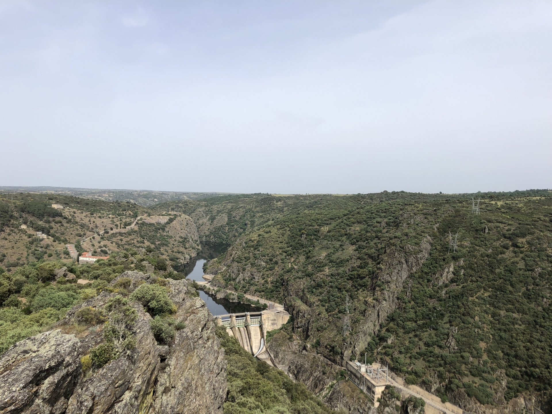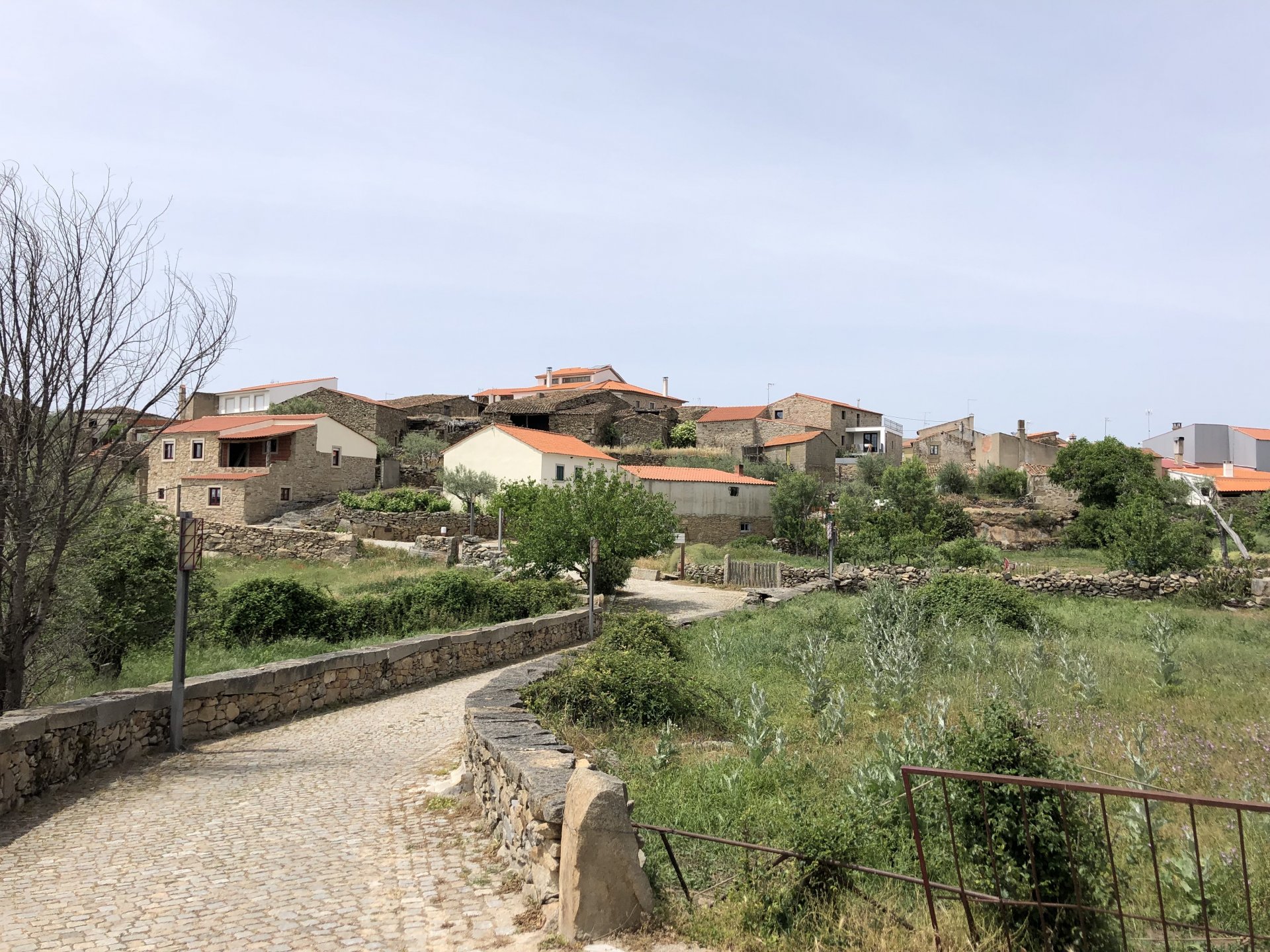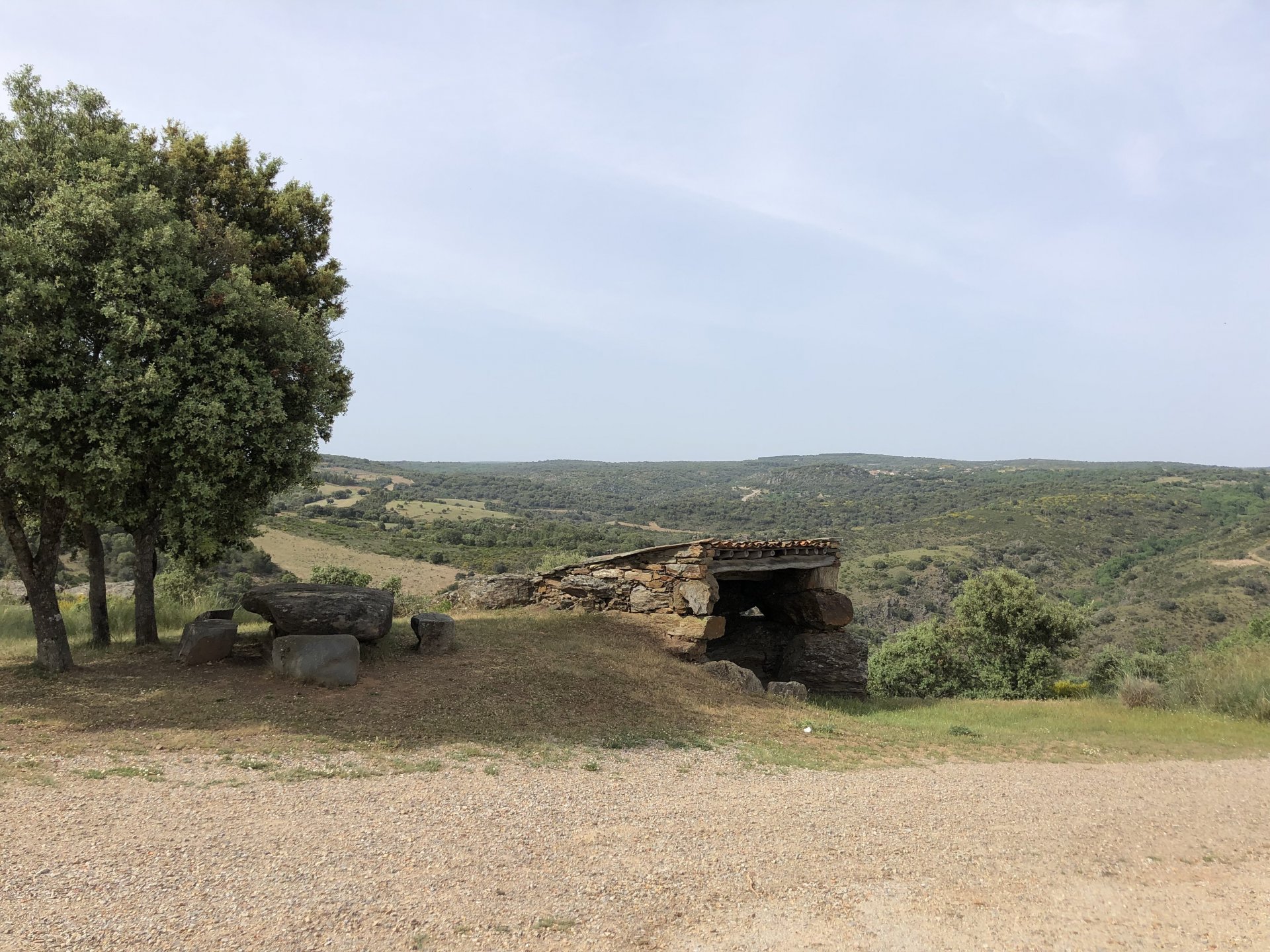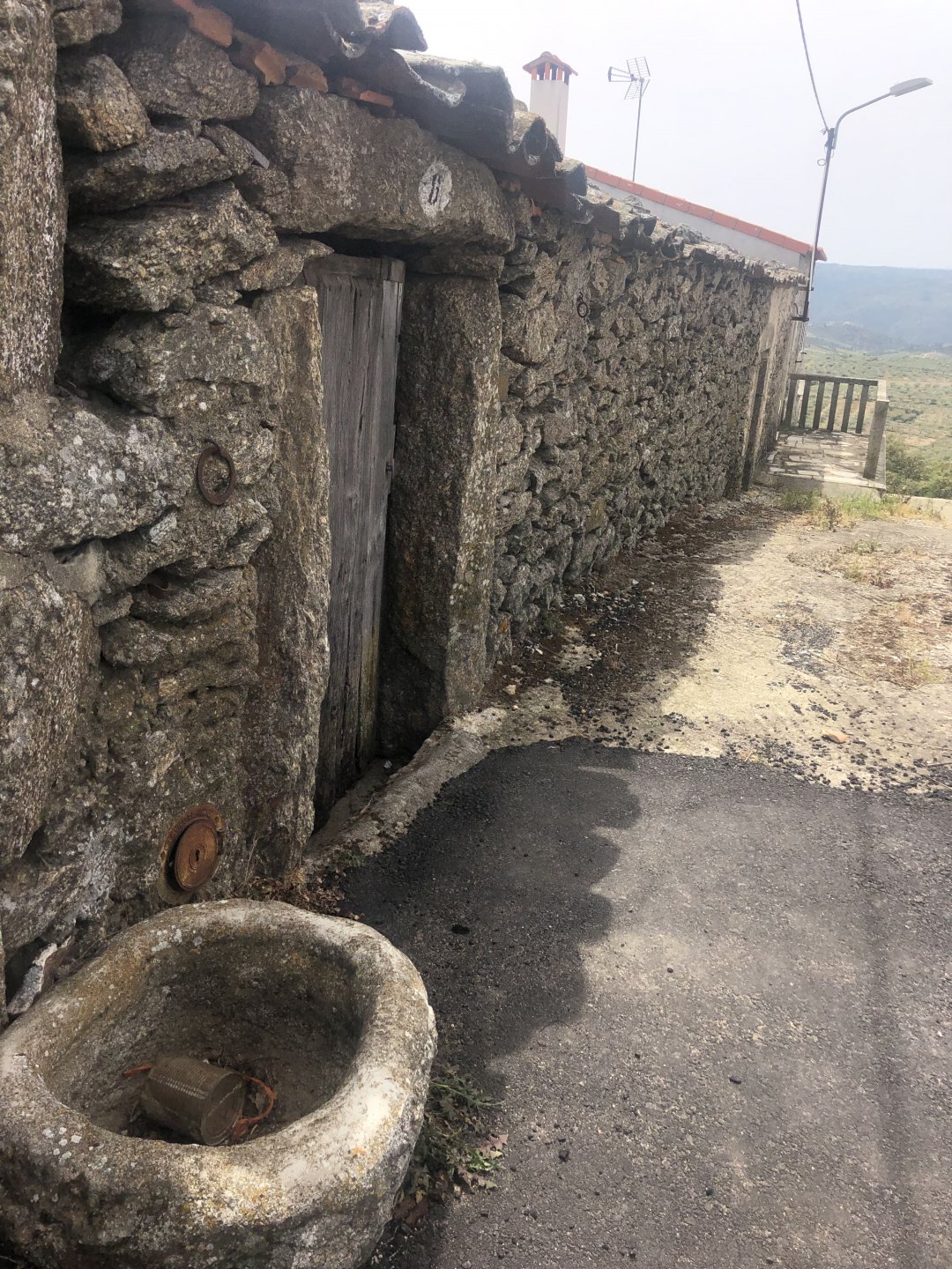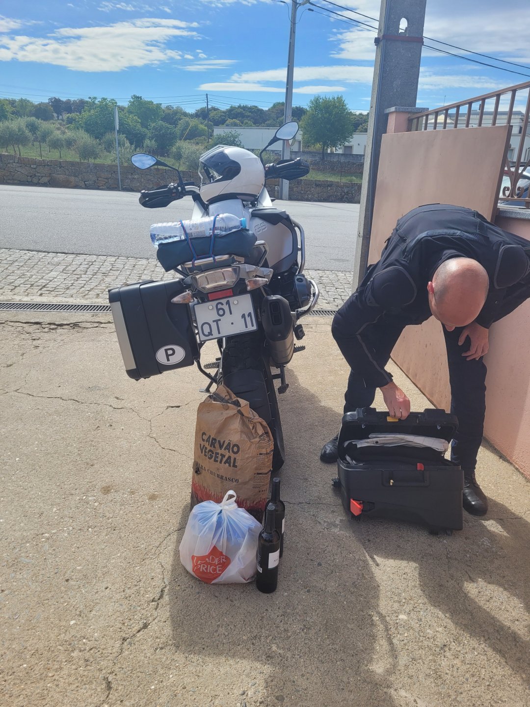 Continuing, we woke up to a warm morning in Freixo de Espada à Cinta, stopped by the local pharmacy for some chapstick, I wanted to get some more potent anti histaminic nasal spray but there's nothing stronger than what I got. One thing that bothered me a bit over the previous days were my polen allergies, whenever we went near blooming olive trees or some kinds of fields it hits hard. 20 or 30 minutes North of where we started, along the N221, we take a detour to Mazouco, and ride down to the riverside to check something quite special. After a short walk down a narrow path leading right next to the water, we find the Cavalo de Mazouco. The engraving of this horse, or probably mare, is probably Europe's oldest open air art work. It's over 10.000 years old and only really noticed by the general public in the 70s. Back then the water level was lower, too. Quite the view, at the little horse's place After a few minutes taking in the sights, with the grey overcast skies kind of ruining the pictures, we made way north, again another 20 or 30 minutes to another view point via back roads: After a km or so of nice smooth dirt road, we reach one of the highlights of the trip, the Carrascalinhos Viewpoint at Fornos. It was impressive both for it's views over the river, but more so because of the number of Vultures and Griffons we saw, never had I seen so many in one place. At over 2 meters wingspan they are impressive when they fly near you. The shadow they cast is like one of a small airplane, we stayed for a while. My phone doesn't make them justice, but here it goes anyway. Being sat on a rock for a while, bugs almost instantly started crawling over me, like this weirdly colored beetle and a tiny caterpillar that was put back onto some vegetation. Next to Penedo Durão, the viewpoint of Carrascalinho is the other obligatory stop if you're passing by this area. The N221 from Miranda do Douro all the way to Barca de Alva a must, with all it's little detours. We headed north yet again, getting out of the more hilly Douro and towards a more typical Trás os Montes landscape, a hilly Altiplano with huge rocks thrown all over the place. Another stop at Bemposta, this time for lunch. We had a little look over the viewpoint, surrounded by houses appearing to be older than time, and stopped at a local café. I wanted Sofia to be amongst the locals so we went somewhere with a few construction trucks parked in front, the accent they speak with here is incredibly different to what Sofia is used to in the Lisbon area it's funny. In fact, Miranda do Douro has it's own language, called Mirandês, with it 's own vocabulary and taught as a second language in the area. In some villages, it is still a first language amongst older people. Hearty portions in this part of the country, I went inside to order and the girl was a little shocked that both of us would share a portion. I have no pictures of said food, but we left with a full stomach. Had a few laughs with the guys there, and were ready for a full afternoon. Half an hour of riding, and another stop, this time at the preserved village of Picote. The place has been meticulously restored and was a pleasure to walk through, even the fields' entries were nice, this didn't really feel like Portugal as it's usually a bit rougher. A great place to see and maybe next time a sleepover location. It was getting proper hot though, at maybe 33 or 35º. Quite fun to see all the signs in Mirandês instead of Portuguese. Eventually, we rode off and arrived at Miranda do Douro, parked in the old town next to a shiny scooter and went to buy some souvenirs. Miranda do Douro is a lovely place, I shall stay longer next time. From Miranda do Douro we went to Paradela, just a 15 or 20 minute ride but it's the place where the river enters Portugal, we went and visited the northernmost place in this trip. Getting there it was proper hot, so stopped for an icecream, some water and a coffee at a local country style café. Sofia made a sensation with the café owner and her mother. They have family everywhere, near where I'm from, where Sofia lives, all over Portugal, and took great pride in showing off her husband's ZZR1100 on top of which they went to France and toured around a few years ago. Northern hospitality: We left the Speed Triple behind and rode the 4 or 5km dirt road to the last Douro lookout on the GS. It was quite hot and dusty, the loose gravel wouldn't have been much fun on the Triumph. A nice place to visit. The dam in the picture above is still in the spanish side, flowing over a trickle of water it might or might not be one of the reasons much of the north is in a draught currently. We said goodbye to the border and rode heading to Alfandega da Fé. The weather was quite hot but threatening to rain, progress now was faster and the roads allowed a constant speed over 100kmh to be easily done. Quick stop to take a picture of an ancient harvester, just casually parked in the middle of a field: A quick stop in Vimioso to figure out where to sleep, and realize the landscape had changed dramatically in only a few kms We rode into Morais at around 19:00 I think, after a long day of short rides and amazing scenery. The surprise heat wave made it a little harder than it had to be, but all was cool. Morais is a tiny town and we were to sleep in a small place, the owner showed up to get paid for the room and left us to ourselves, being the only guests and breakfast available on the café across the street we should just close the door behind us in the morning. The bikes splept outside and the big GS made sure the Triumph couldn't be messed with. A little walk around before dinner looking for an ATM, revealed Sr. Morais' old house, the town founder long gone and his place is left there waiting for someone to do something with it. We had dinner in a small bbq place, inside as the mosquitoes were relentless outside. We stayed in and drank cold wine and chatted almost till they we