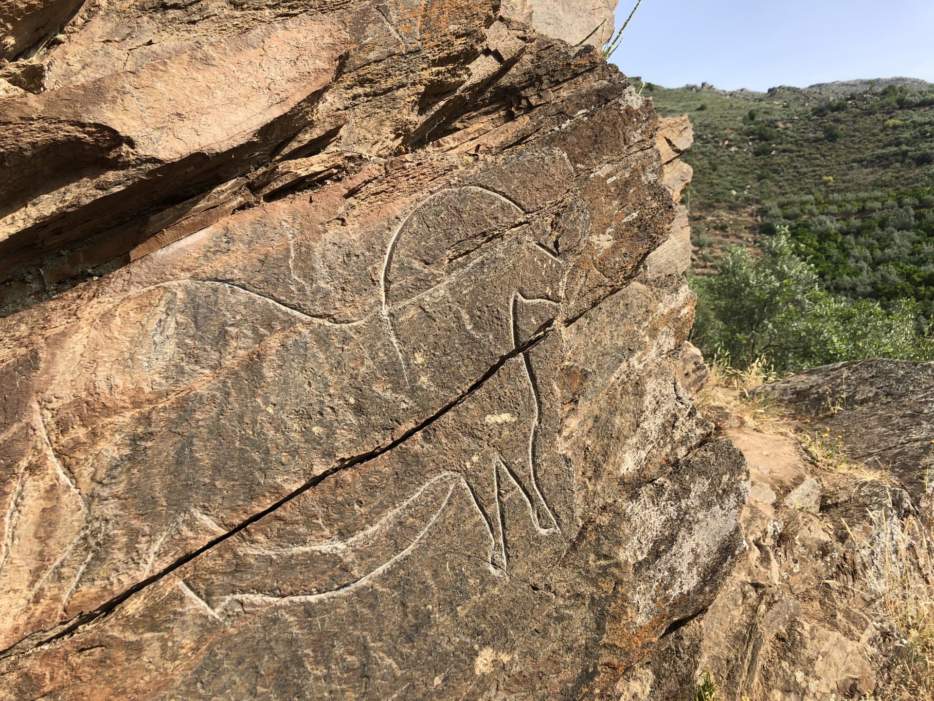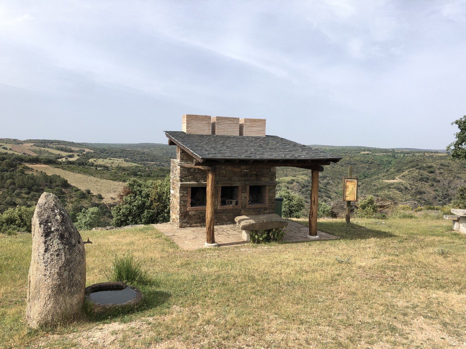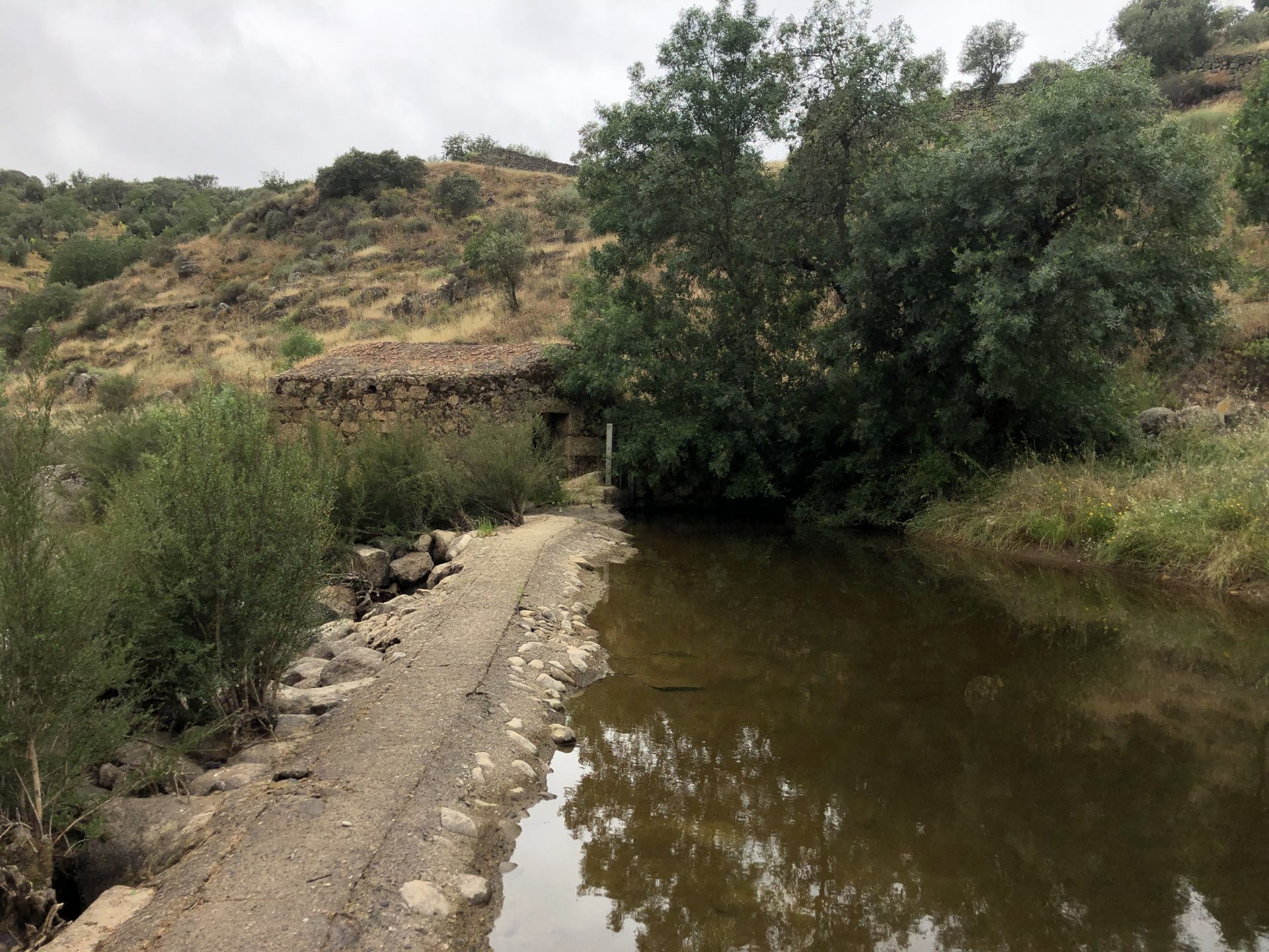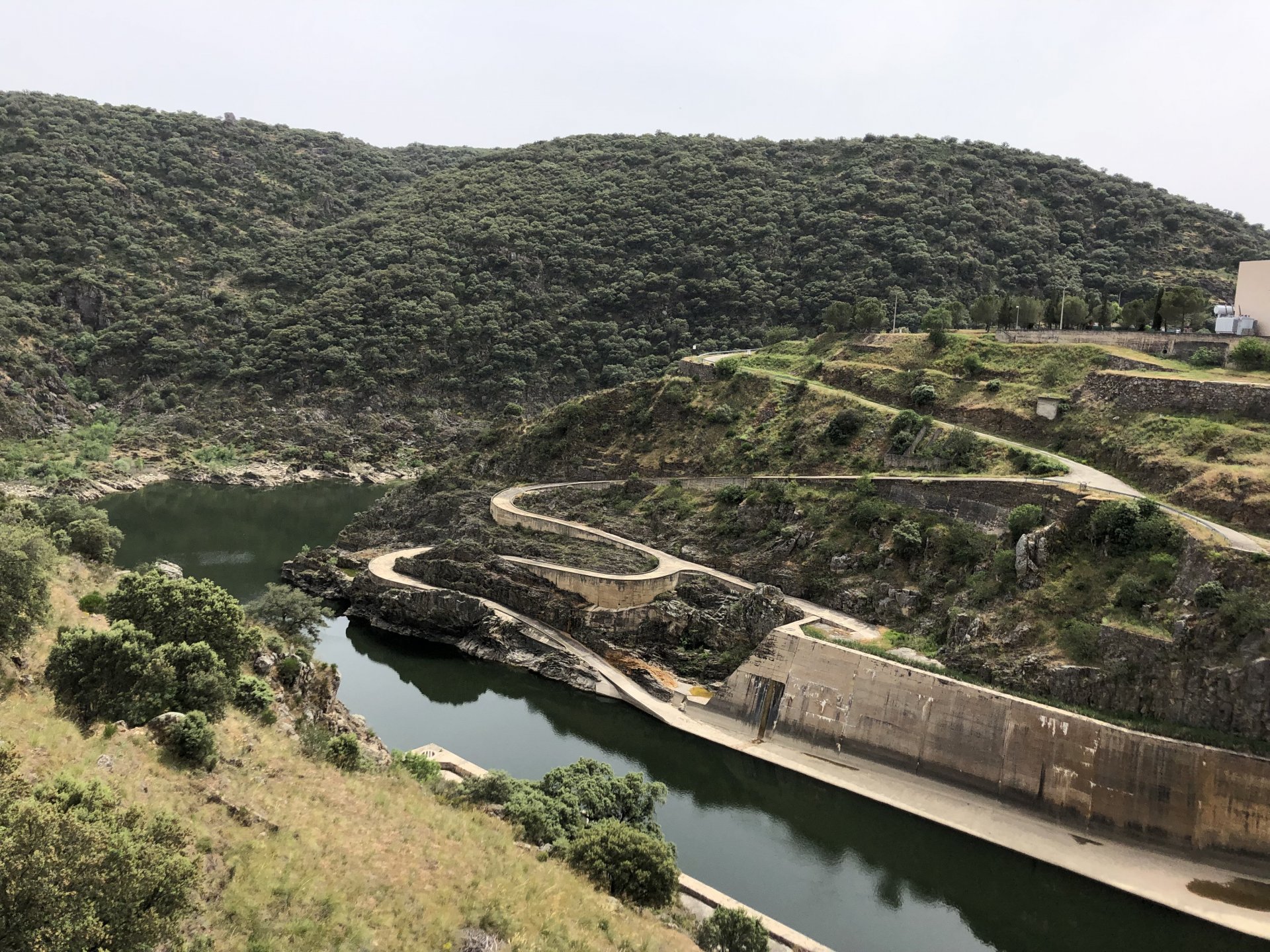 Continuing, we woke up to a warm morning in Freixo de Espada à Cinta, stopped by the local pharmacy for some chapstick, I wanted to get some more potent anti histaminic nasal spray but there's nothing stronger than what I got. One thing that bothered me a bit over the previous days were my polen allergies, whenever we went near blooming olive trees or some kinds of fields it hits hard. 20 or 30 minutes North of where we started, along the N221, we take a detour to Mazouco, and ride down to the riverside to check something quite special. After a short walk down a narrow path leading right next to the water, we find the Cavalo de Mazouco. The engraving of this horse, or probably mare, is probably Europe's oldest open air art work. It's over 10.000 years old and only really noticed by the general public in the 70s. Back then the water level was lower, too. Quite the view, at the little horse's place After a few minutes taking in the sights, with the grey overcast skies kind of ruining the pictures, we made way north, again another 20 or 30 minutes to another view point via back roads: After a km or so of nice smooth dirt road, we reach one of the highlights of the trip, the Carrascalinhos Viewpoint at Fornos. It was impressive both for it's views over the river, but more so because of the number of Vultures and Griffons we saw, never had I seen so many in one place. At over 2 meters wingspan they are impressive when they fly near you. The shadow they cast is like one of a small airplane, we stayed for a while. My phone doesn't make them justice, but here it goes anyway. Being sat on a rock for a while, bugs almost instantly started crawling over me, like this weirdly colored beetle and a tiny caterpillar that was put back onto some vegetation. Next to Penedo Durão, the viewpoint of Carrascalinho is the other obligatory stop if you're passing by this area. The N221 from Miranda do Douro all the way to Barca de Alva a must, with all it's little detours. We headed north yet again, getting out of the more hilly Douro and towards a more typical Trás os Montes landscape, a hilly Altiplano with huge rocks thrown all over the place. Another stop at Bemposta, this time for lunch. We had a little look over the viewpoint, surrounded by houses appearing to be older than time, and stopped at a local café. I wanted Sofia to be amongst the locals so we went somewhere with a few construction trucks parked in front, the accent they speak with here is incredibly different to what Sofia is used to in the Lisbon area it's funny. In fact, Miranda do Douro has it's own language, called Mirandês, with it 's own vocabulary and taught as a second language in the area. In some villages, it is still a first language amongst older people. Hearty portions in this part of the country, I went inside to order and the girl was a little shocked that both of us would share a portion. I have no pictures of said food, but we left with a full stomach. Had a few laughs with the guys there, and were ready for a full afternoon. Half an hour of riding, and another stop, this time at the preserved village of Picote. The place has been meticulously restored and was a pleasure to walk through, even the fields' entries were nice, this didn't really feel like Portugal as it's usually a bit rougher. A great place to see and maybe next time a sleepover location. It was getting proper hot though, at maybe 33 or 35º. Quite fun to see all the signs in Mirandês instead of Portuguese. Eventually, we rode off and arrived at Miranda do Douro, parked in the old town next to a shiny scooter and went to buy some souvenirs. Miranda do Douro is a lovely place, I shall stay longer next time. From Miranda do Douro we went to Paradela, just a 15 or 20 minute ride but it's the place where the river enters Portugal, we went and visited the northernmost place in this trip. Getting there it was proper hot, so stopped for an icecream, some water and a coffee at a local country style café. Sofia made a sensation with the café owner and her mother. They have family everywhere, near where I'm from, where Sofia lives, all over Portugal, and took great pride in showing off her husband's ZZR1100 on top of which they went to France and toured around a few years ago. Northern hospitality: We left the Speed Triple behind and rode the 4 or 5km dirt road to the last Douro lookout on the GS. It was quite hot and dusty, the loose gravel wouldn't have been much fun on the Triumph. A nice place to visit. The dam in the picture above is still in the spanish side, flowing over a trickle of water it might or might not be one of the reasons much of the north is in a draught currently. We said goodbye to the border and rode heading to Alfandega da Fé. The weather was quite hot but threatening to rain, progress now was faster and the roads allowed a constant speed over 100kmh to be easily done. Quick stop to take a picture of an ancient harvester, just casually parked in the middle of a field: A quick stop in Vimioso to figure out where to sleep, and realize the landscape had changed dramatically in only a few kms We rode into Morais at around 19:00 I think, after a long day of short rides and amazing scenery. The surprise heat wave made it a little harder than it had to be, but all was cool. Morais is a tiny town and we were to sleep in a small place, the owner showed up to get paid for the room and left us to ourselves, being the only guests and breakfast available on the café across the street we should just close the door behind us in the morning. The bikes splept outside and the big GS made sure the Triumph couldn't be messed with. A little walk around before dinner looking for an ATM, revealed Sr. Morais' old house, the town founder long gone and his place is left there waiting for someone to do something with it. We had dinner in a small bbq place, inside as the mosquitoes were relentless outside. We stayed in and drank cold wine and chatted almost till they we