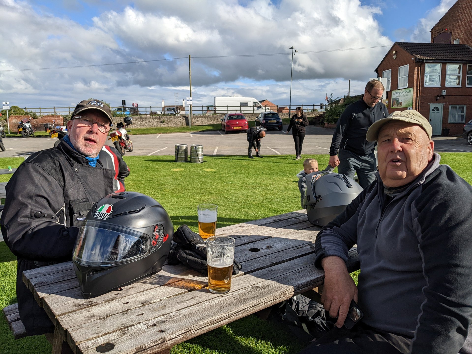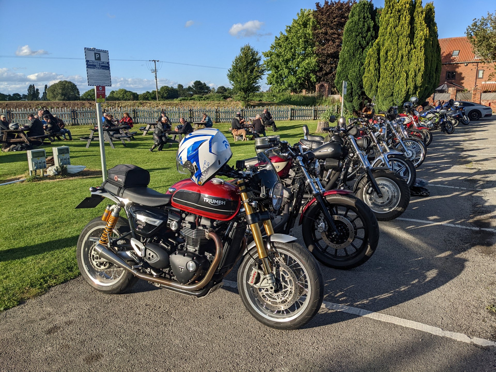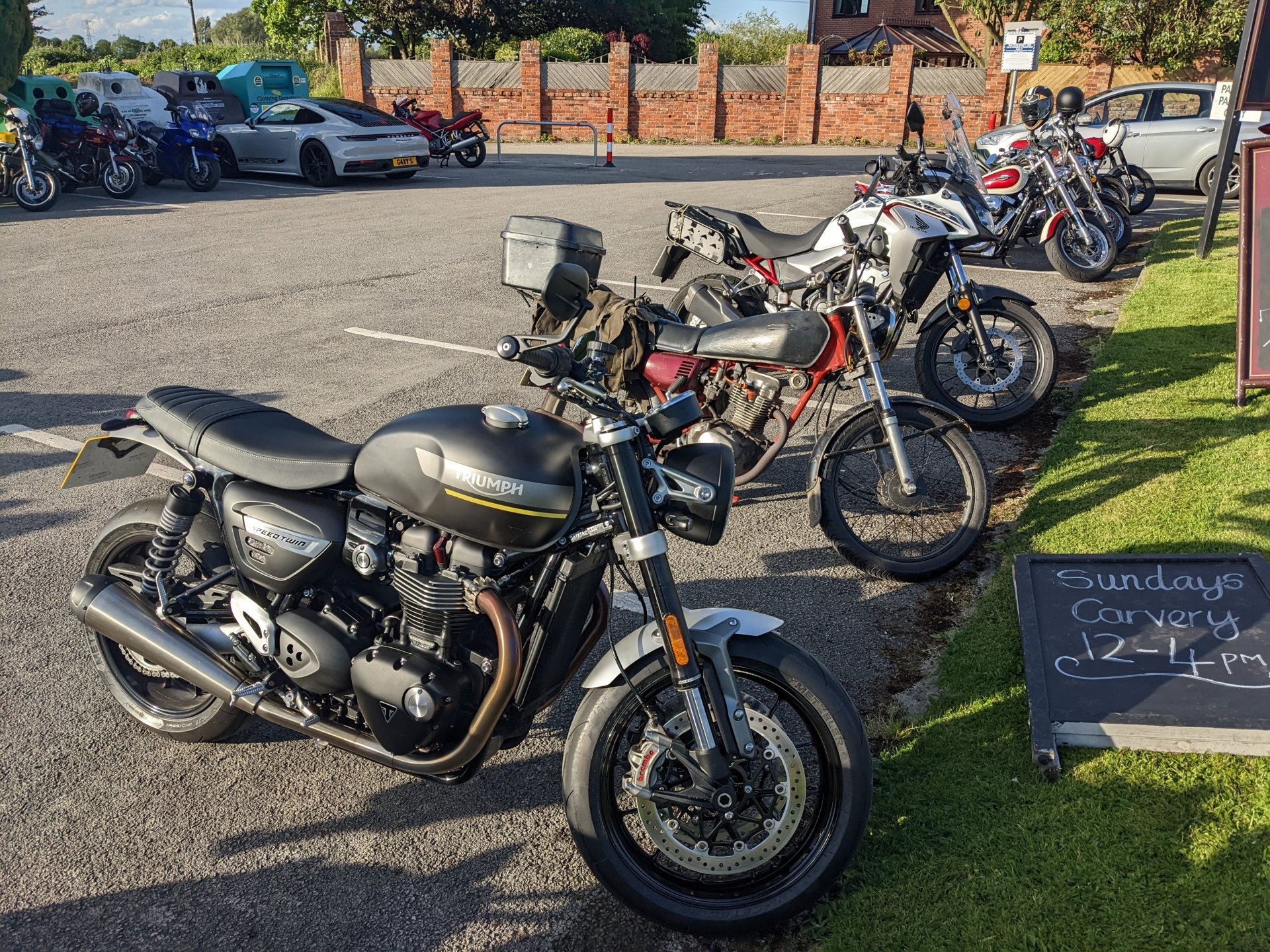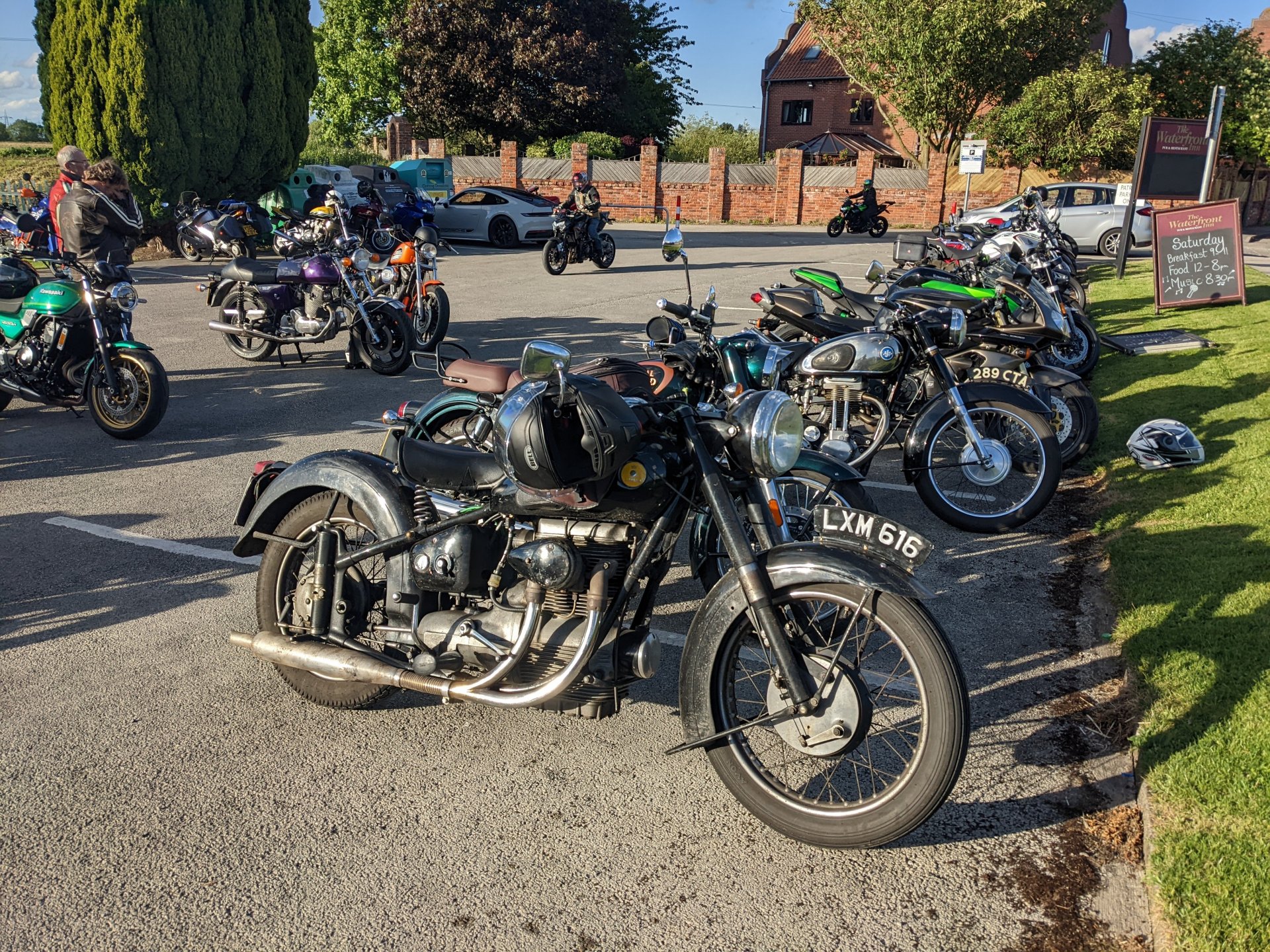 Some umming and arring looking at the dark clouds and spots of rain. My good mate from work bailed, "a bit cold". But me old man and his pal Donkey Dave turned up at 5 and I was almost ready for once, it took a bit of effort to get the bike out the shed (it was rammed in, covered in crap). Off to West Stockwith for pie and paaaes (mushies). And look at the sunshine. The triumph is my Dad's, CG with useful topbox mine, CB500X Donkey Dave's. Nice bit of rotax. My Dad was very envious of the front and rear gold suspension pieces. I don't think it will be long until he splashes some cash. An old one. Some more old ones . Cheeky or what. No pictures of the pie or peas because I was hungry but the chips were good and the pie full of meaty bits. £6.50 Donkey Dave, after sending umpteen videos to his mate showing the sky getting bluer and bluerer, took us a different way back home on daft roads I've never noticed, into the sunset. Good night out. And cheers to me Dad who got the beer and food in, he's a good un.6 points
