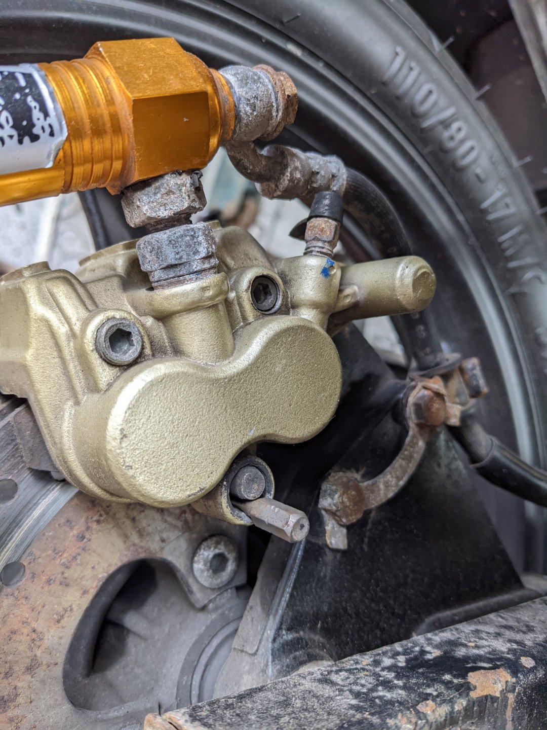 Correct bike now has all the relevant stamps, signatures, and approvals. I don't know the kid behind it, but his lexmoto was up next. Bonus picture of the fix his mechanic mate had done him on the rear caliper. Sliding caliper missing a rubber boot so it's got an Allen bit whacked in to take the slack, jobs a good un ey.2 points